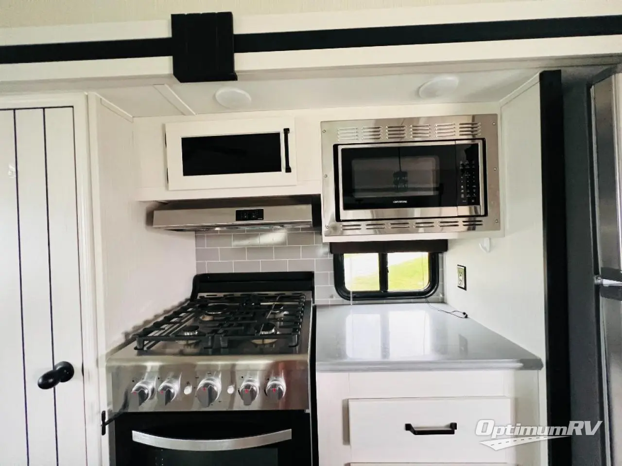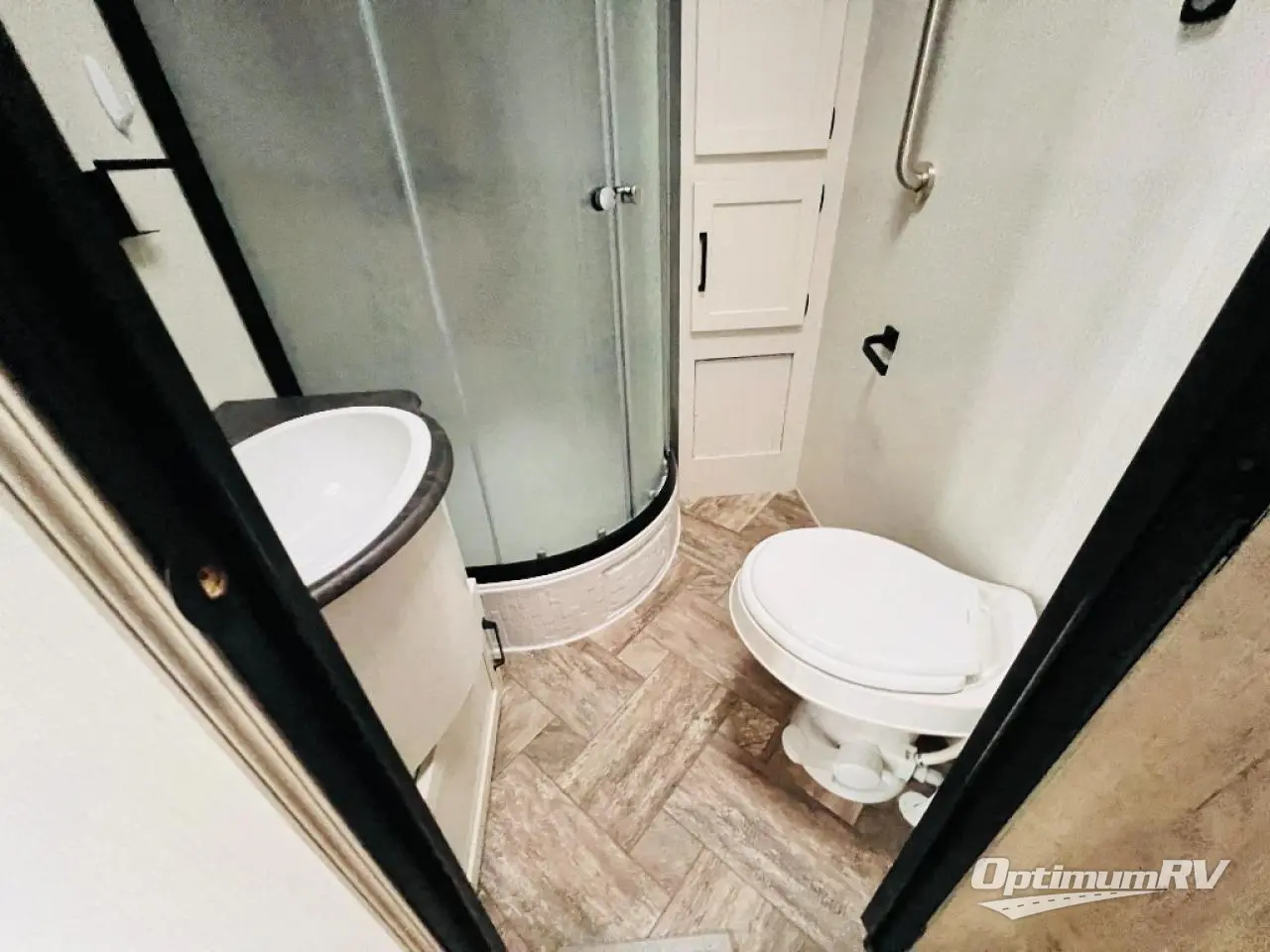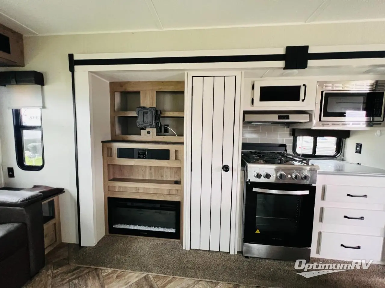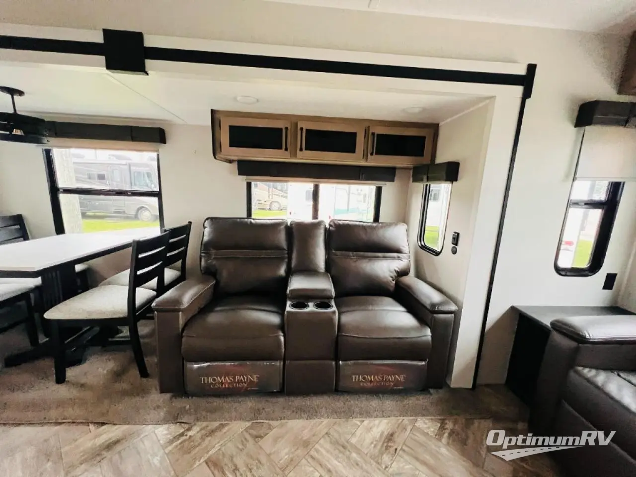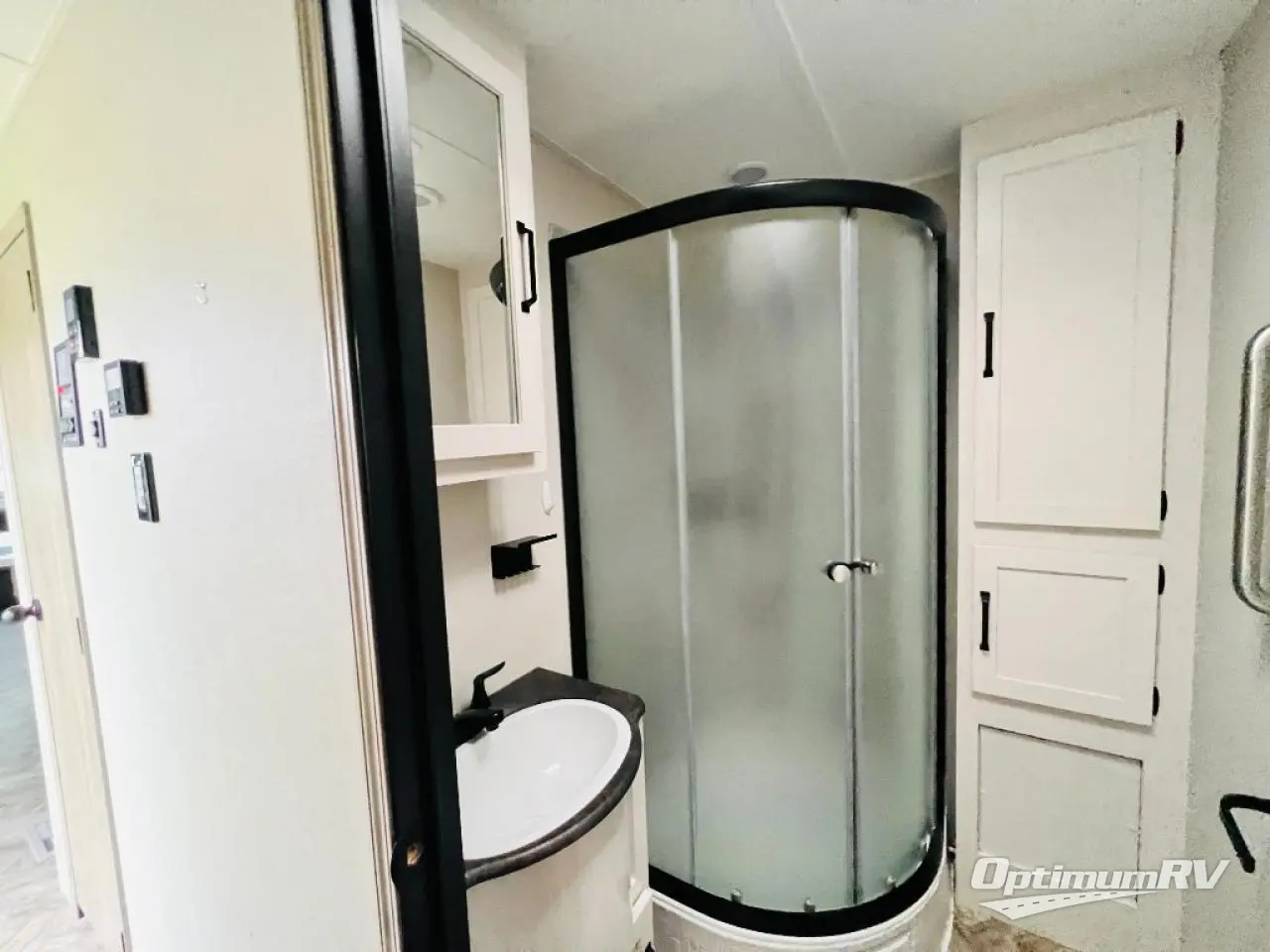 Everyone will want to join you when you head back out to the lake to stay in this trailer! With the middle bunkhouse that includes a bunk above a jiffy sofa and a closet, this can be your kids room or guests headquarters. You will have your own privacy when needed in the front bedroom which includes a queen bed slide and two closets. There is also a dresser and a space within a closet for a washer/dryer option. The full bathroom is conveniently located between the two rooms, and the rear of the destination trailer offers a combined living and kitchen area. The dual slides give you lots of floor space around the kitchen island to relax on the booth dinette or sofa, and the cook will have full kitchen amenities including a residential style refrigerator.