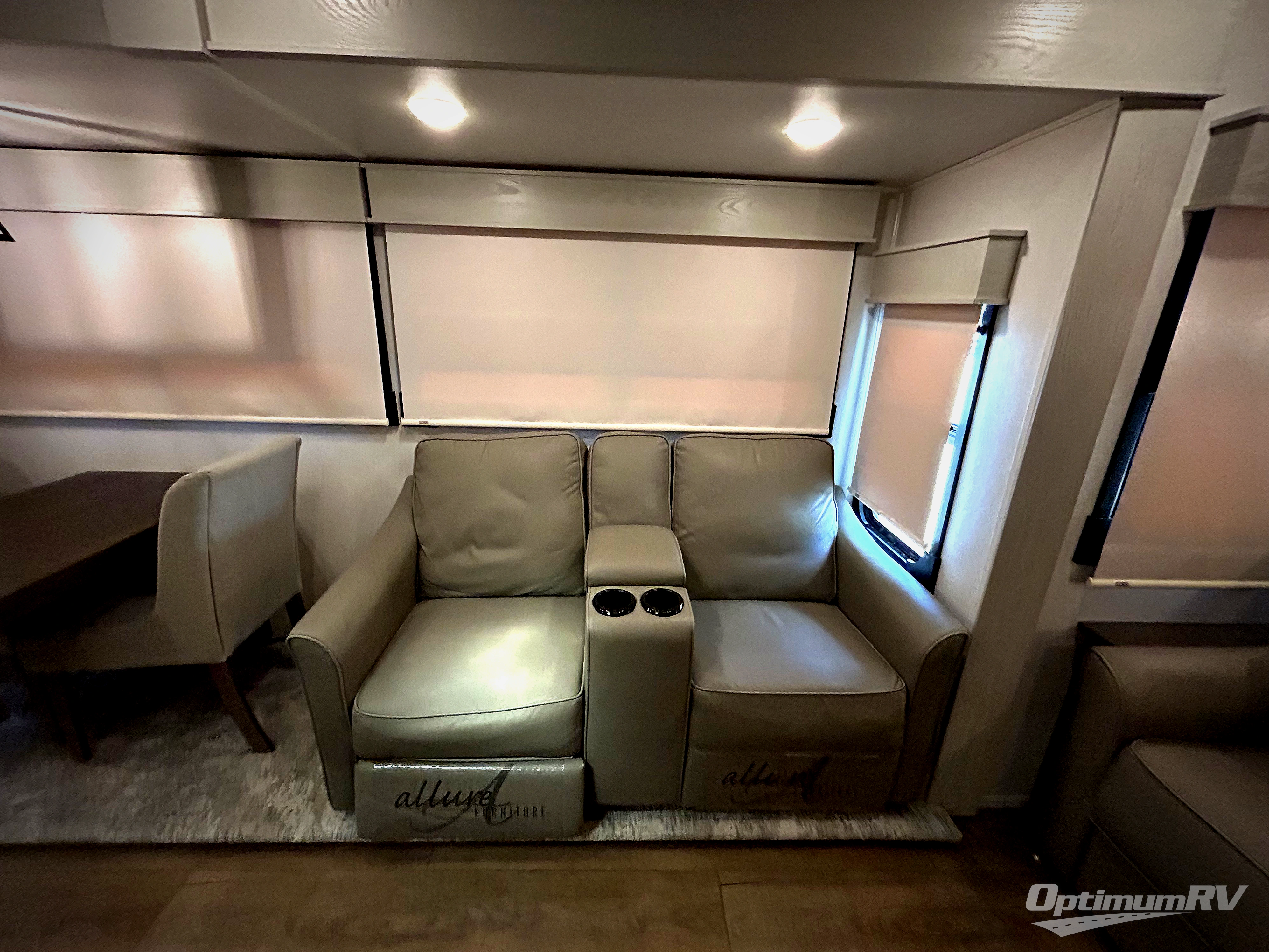 This is the biggest fifth wheel in the River Ranch lineup with four slide outs and an 42' 7" exterior length. Your crew can relax in the rear living area on the 88" split tri-fold sofa or 65" theater seat across from the fireplace and 50" TV. There is also a free-standing table with chairs where you can dine at, plus a kitchen island for more counter space in the kitchen. There is a spacious full bath where you can freshen up each day, and the front private bedroom will provide you with your own space in the evenings. Here, you'll find a king bed and wardrobe slide, a full-length closet, and washer/dryer prep with a removable shelf for more storage space. There is even a 32" pop-up TV in the bedroom for late night movies in bed!