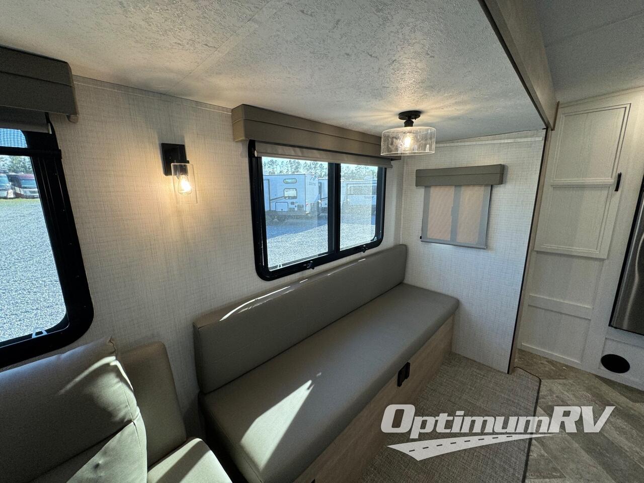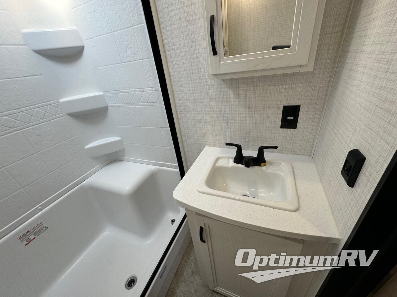 One look at this spacious travel trailer and you'll be sold! The rear kitchen features a U-shaped counter, an 11 cu. ft. refrigerator, plus a pantry for dry goods and snacks. There is a 1/2 dinette with bench seating on one side and two chairs on the other, plus two sofa sleepers and theater seating. Everyone can take turns cleaning up in the full bath that includes a shower with a seat, then head outdoors to relax under the patio awning with LED lights. When it's time for bed, your guests can take the sofa sleepers, while you enjoy the king bed slide out in the front bedroom. You'll also find a dresser and a wardrobe here, plus a second wardrobe with an optional washer and dryer for full-time RV living!
