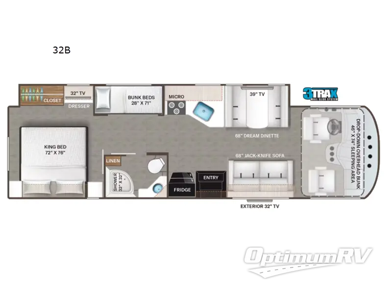 Are you looking for a motorhome with more space and comfort? Your search is over with this family-friendly coach that can sleep eight people each night. The kids will love the bunk beds and the drop-down overhead bunk up front, while you enjoy the king bed in the rear bedroom. There is also a Dream Dinette and a jack-knife sofa across from the 39" TV for easy viewing. Home-cooked meals can be prepared on the three burner gas cooktop or in the microwave oven, and leftovers can go in the double door refrigerator. This model also includes a spacious full bath with a linen closet, a shower skylight, and a sleek glass shower door!