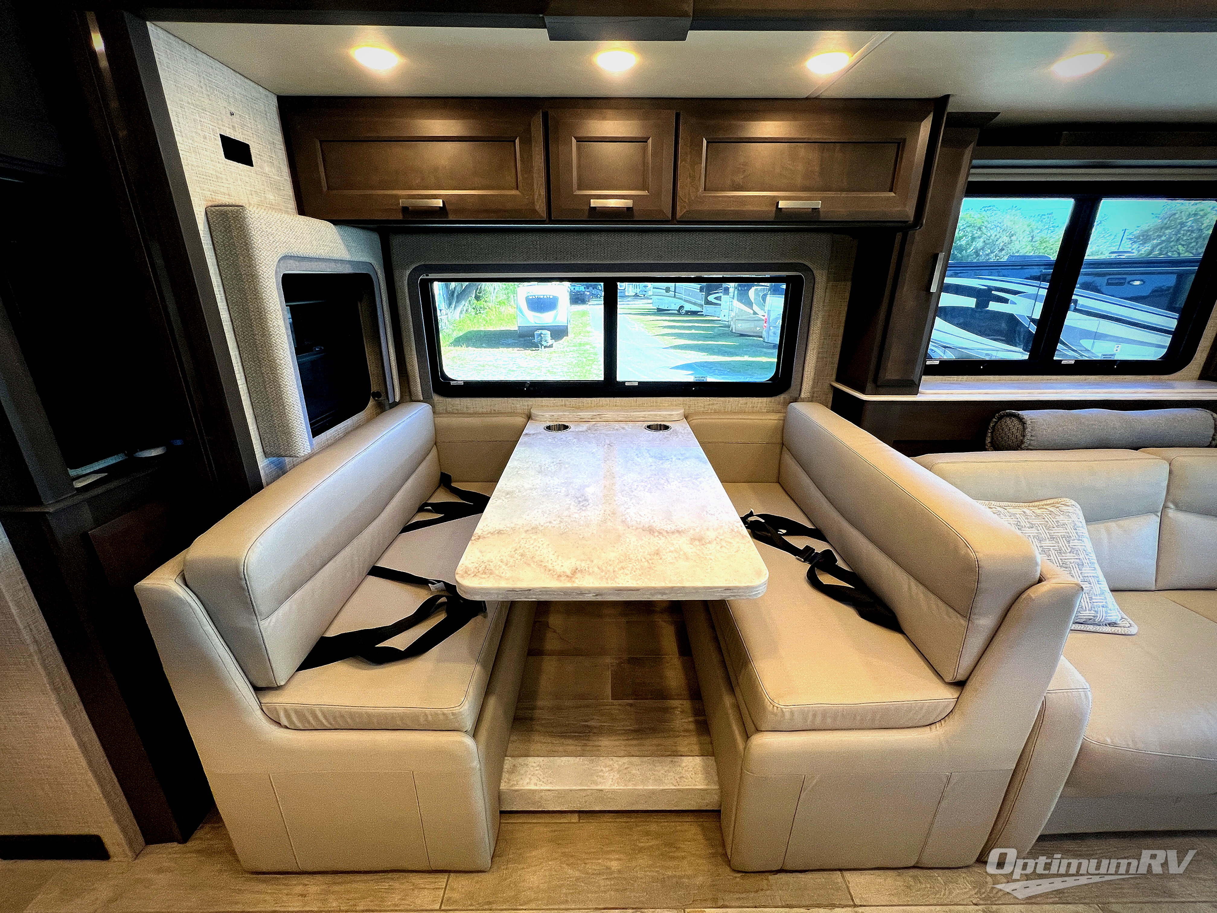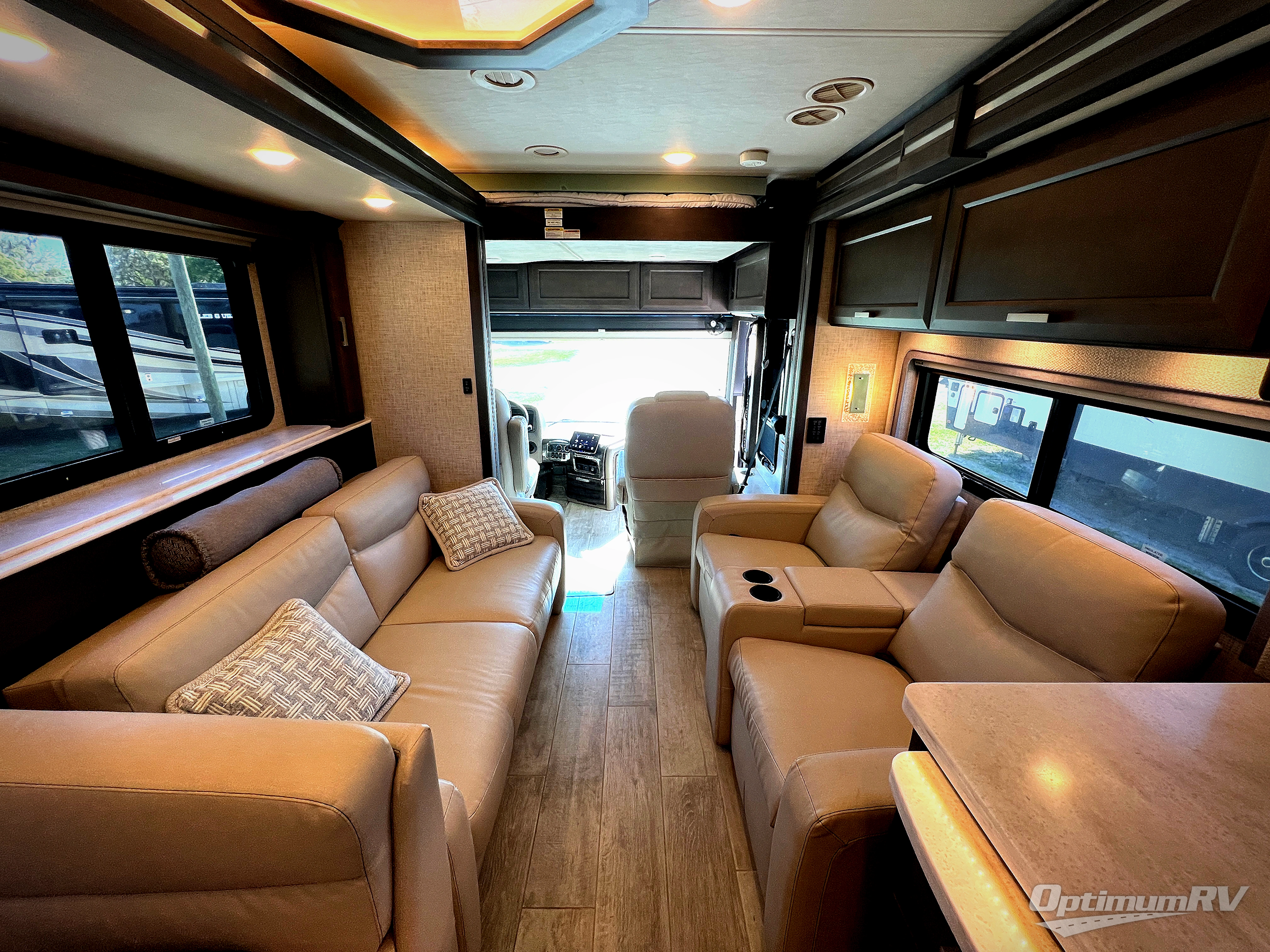 With any Aria Class A diesel motorhome by Thor Motor Coach, experience RV living with all the luxurious amenities you are accustom to, command the roadways with improved handling from the l-beam front axle with a 55-degree wheel cut, and enjoy a smooth ride thanks to the Air-Ride suspension and Sachs shock absorbers. The driver will also appreciate the 10.1" touchscreen dash radio with Bluetooth, navigation, and Sirius/XM prep when navigating the roads, and the comfort of the leatherette reclining/swivel adjustable captain's chairs. The bathroom provides an oversized full height shower with a glass door and a designer backsplash, while the kitchen provides solid surface countertops and a dinette. You'll also enjoy designer tile backsplash, a large double bowl stainless steel sink with a single handle faucet, a pull-down sprayer, plus full kitchen amenities. More standout features include the Studio Collection cabinetry with rake style doors and matte finish, living room pin-up lights, and polished porcelain tile flooring, plus much much more depending on the Aria you take on the road!