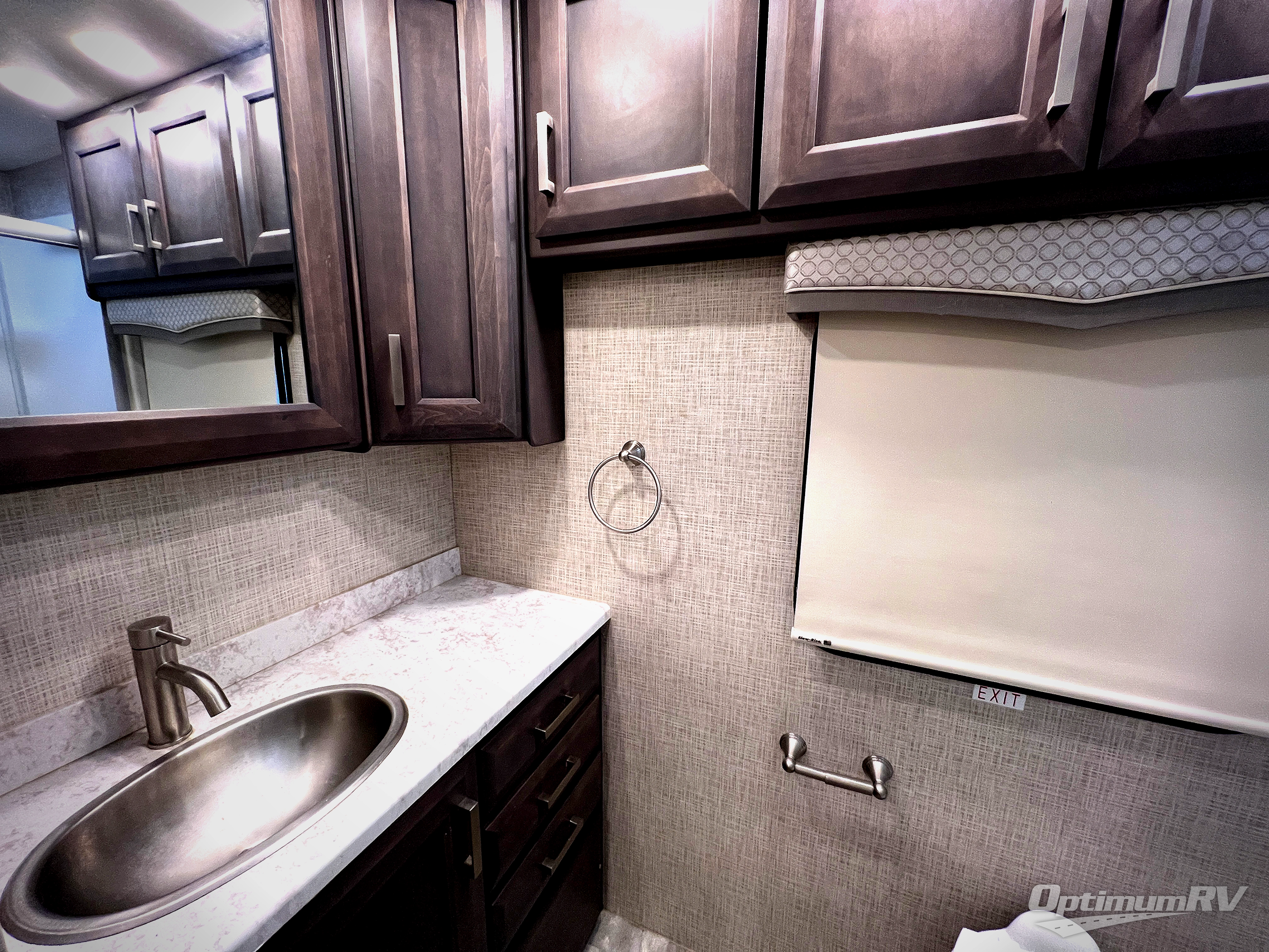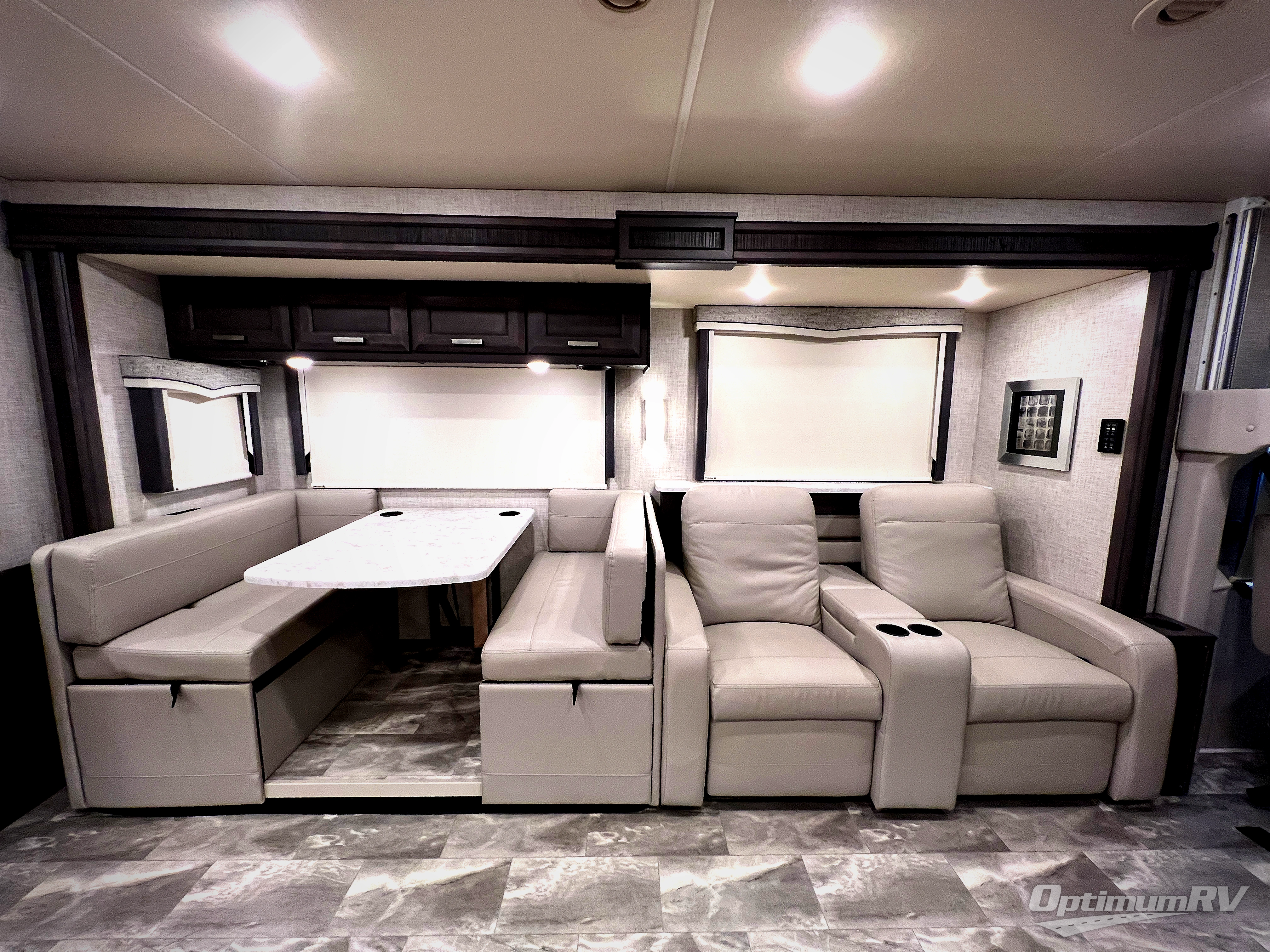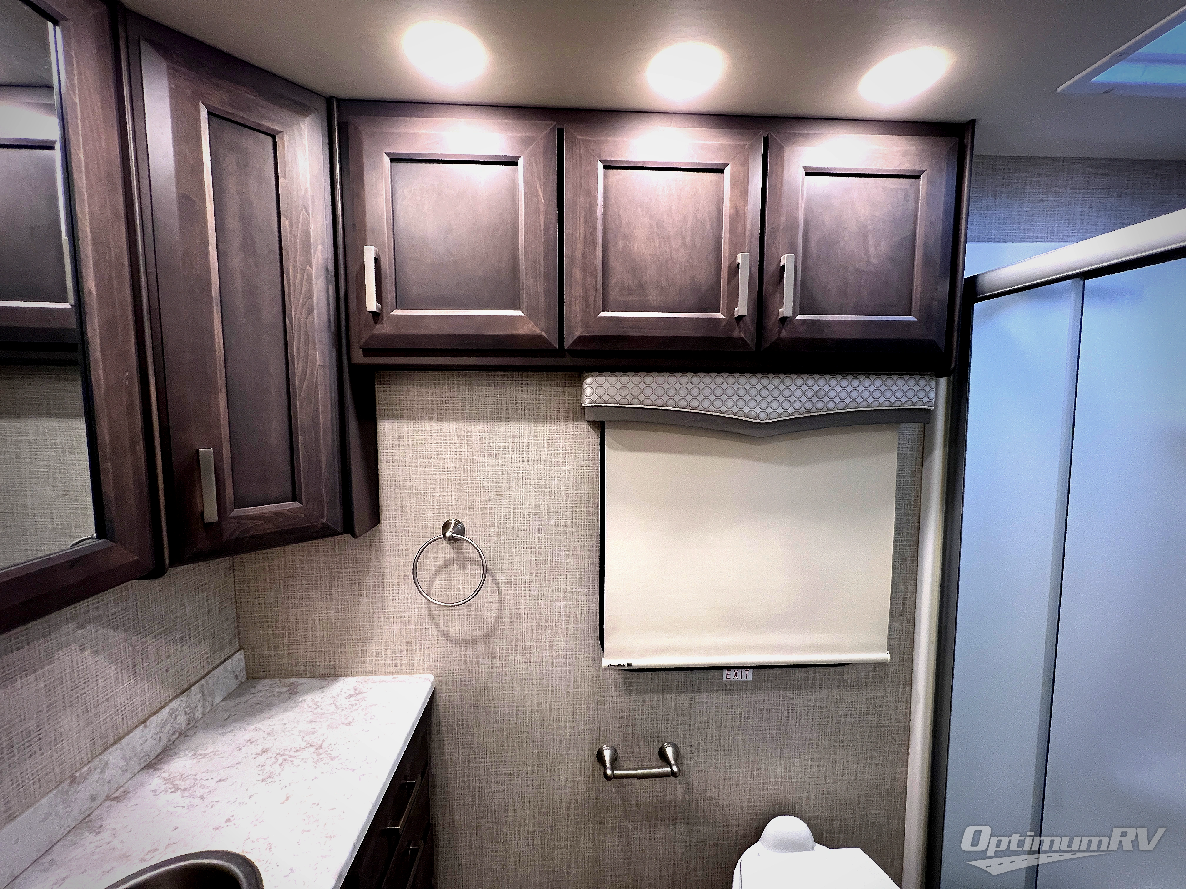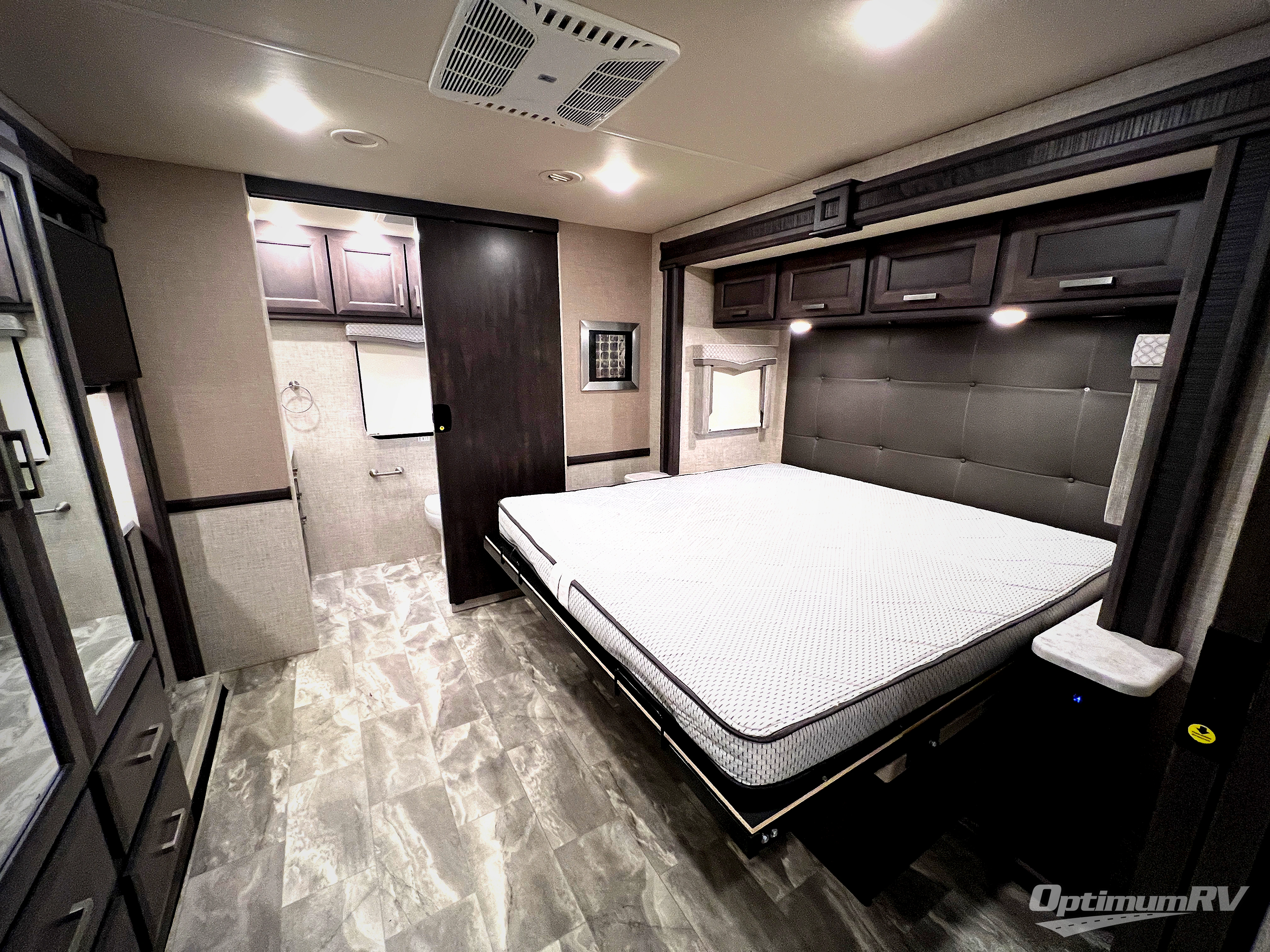 This motorhome features a full-wall slide, plus two additional slides for maximum space and comfort. You can sleep seven people thanks to the drop-down overhead bunk, the king bed slide out, and the furniture in the main living area. The fireplace and retractable 50" TV will make it feel a little more like home, and the residential kitchen is any chef's dream. Since this model includes a bath and a half, your guests won't have to wait in line, and you'll find plenty of storage space throughout for everyone's belongings.