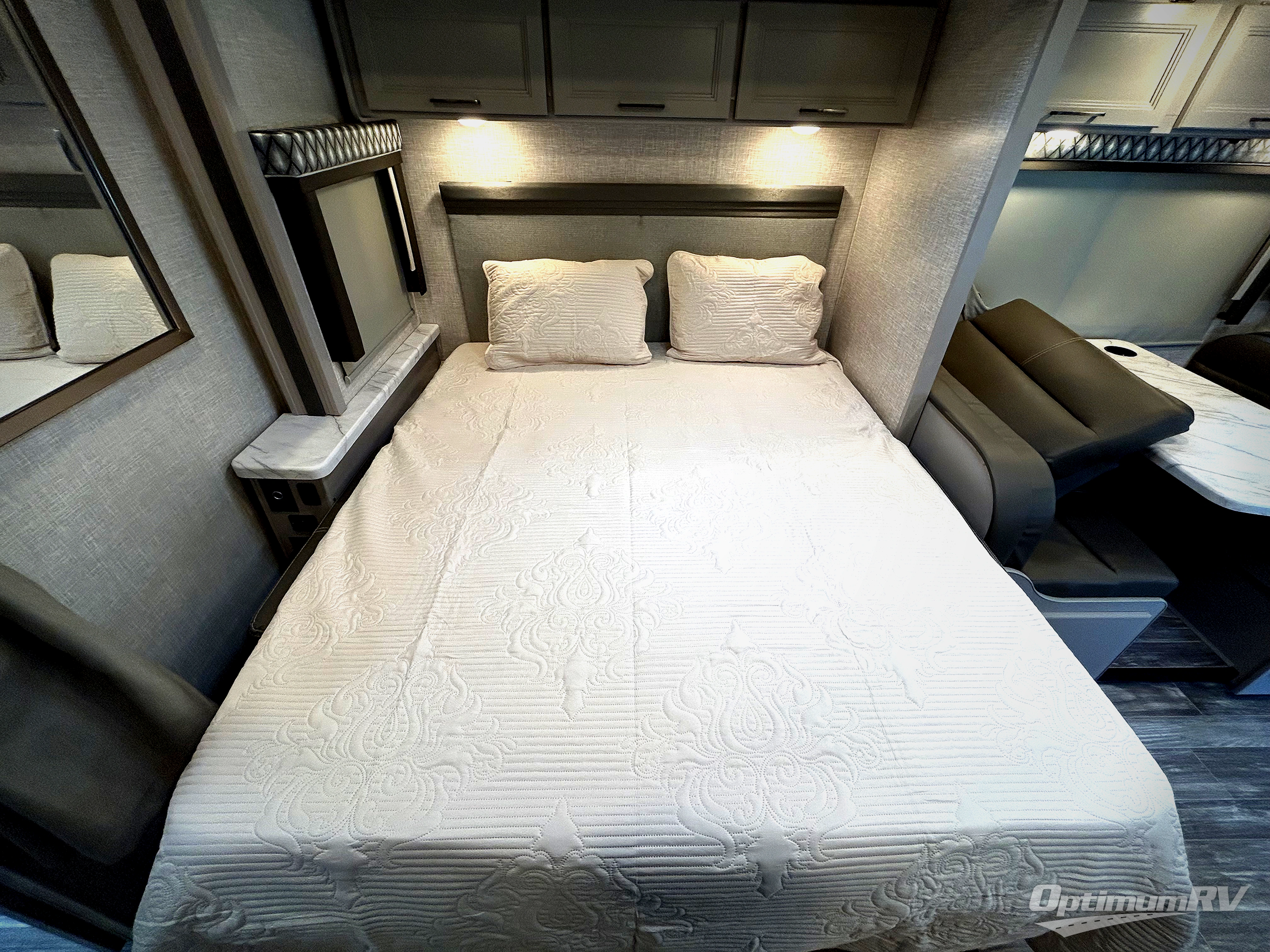With any Geneva Class C gas motorhome by Thor Motor Coach, the interior offers coastline gray flat panel cabinet doors with glacier decor and decorative glass inserts in the kitchen overhead cabinet doors for style, pressed laminated countertops for durability and easy care, and leatherette furniture for comfort, plus conveniences such as a waste basket in the kitchen, a wall cubby with net and USB charging port, and a Showermiser hot water recycling system. The fiberglass front cap with skylight and power shade is a popular feature since it provides natural lighting and beautiful views out of the front, the lighted rotocast storage compartments have a single on/off interior switch allowing you to store items safely during the day or night, the Pet-Link multi-purpose tie down is an added safety feature, plus there are many more standout features. And depending on the coach you choose, there is solar prep or a solar charging system.