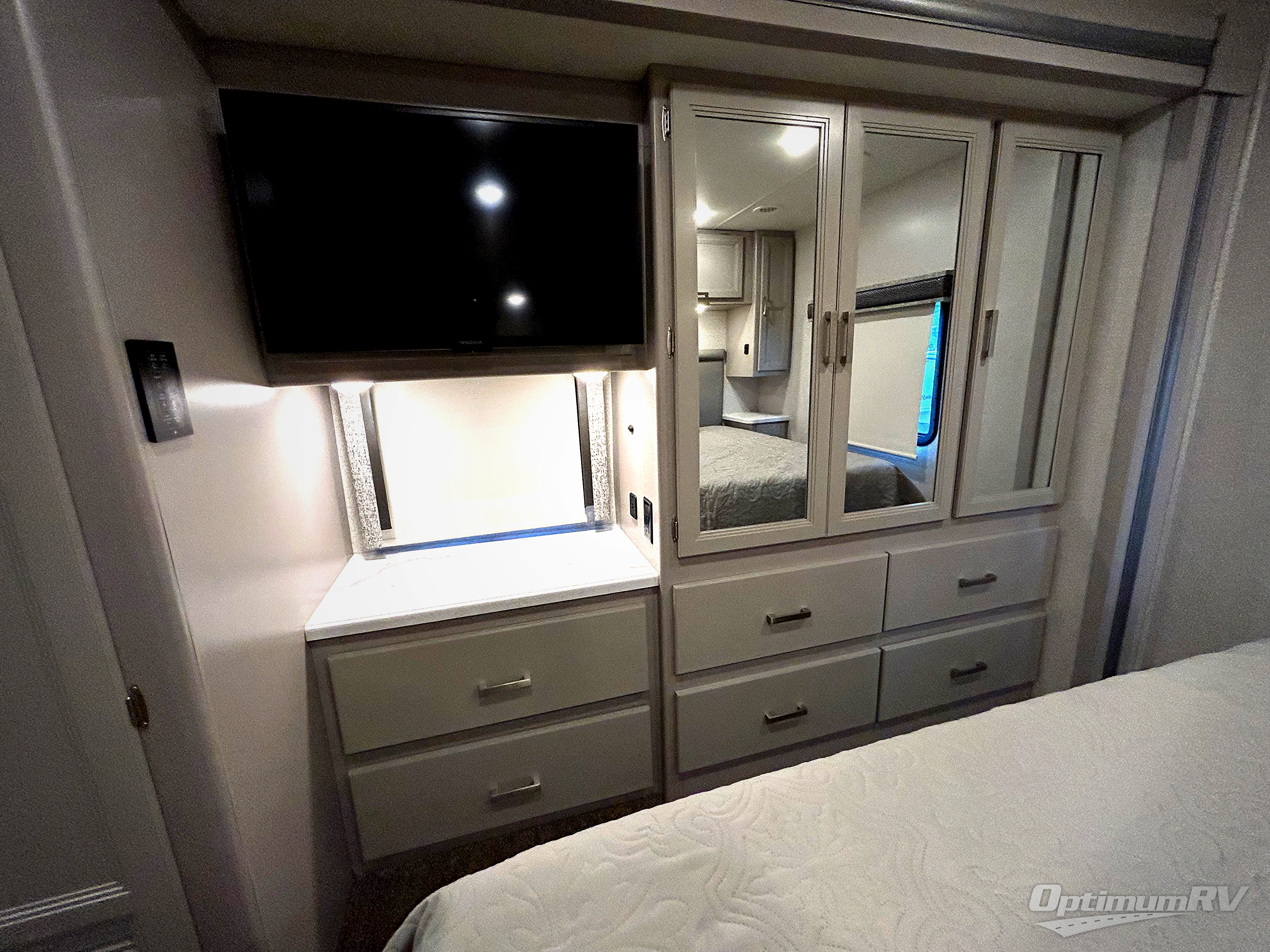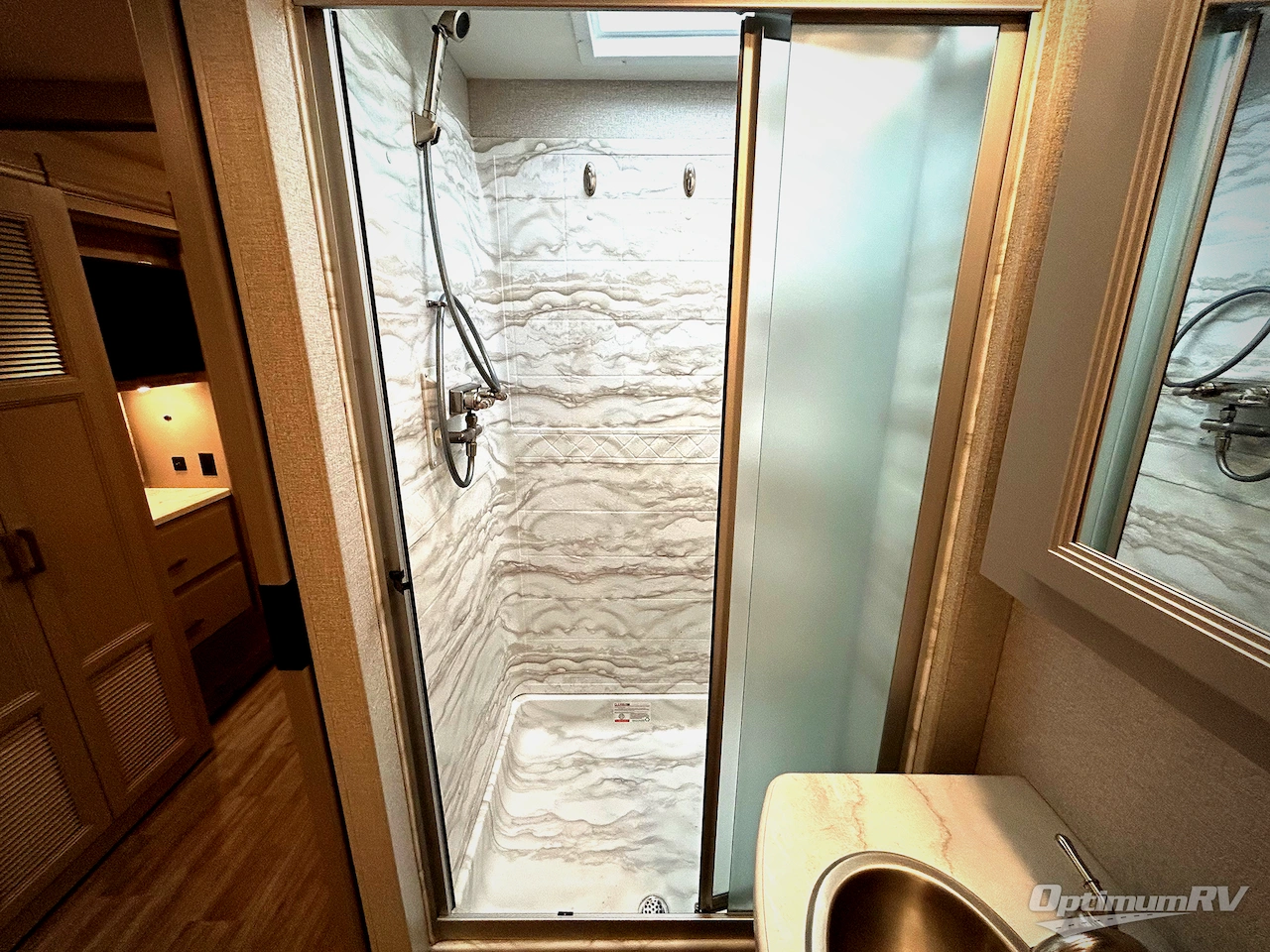 This spacious Class A motorhome has room to sleep eight! Enjoy the privacy of the rear king bedroom which has a spacious closet and a 32" LED TV. Extra guests can utilize the dream dinette, the sofa bed, or the drop-down overhead bunk which has a Cotton Cloud mattress for comfort. As if that's not enough, there's a pair of leatherette theater seats with footrests so you can kick back and watch either of the two living room TVs. You'll also find another TV outside. A full bath with 30" x 36" shower is conveniently located in the center so everyone has access, and the glass shower door and skylight make it feel roomy. The kitchen features a three-burner gas cooktop and oven, refrigerator, stainless steel convection microwave, and pantry.