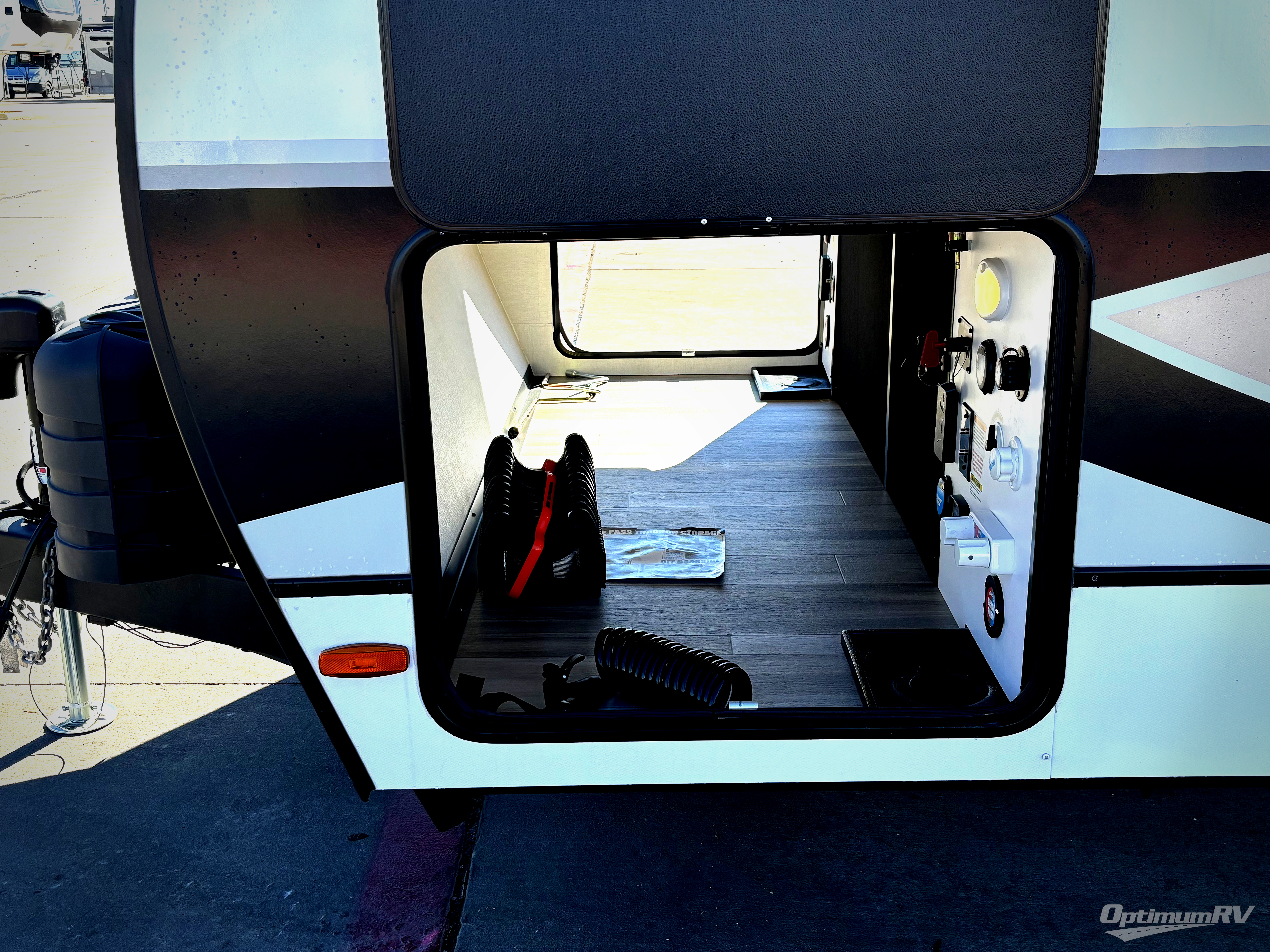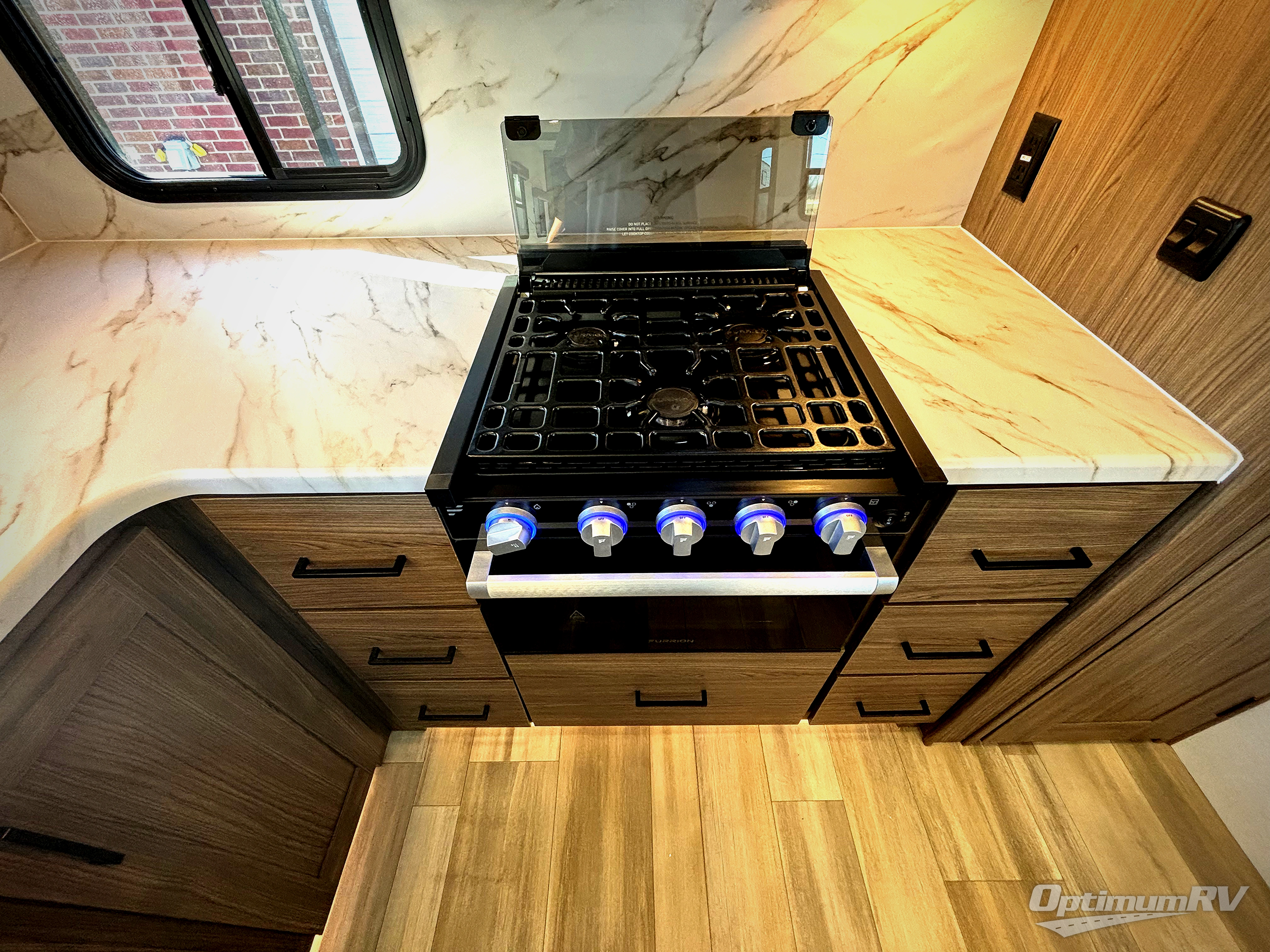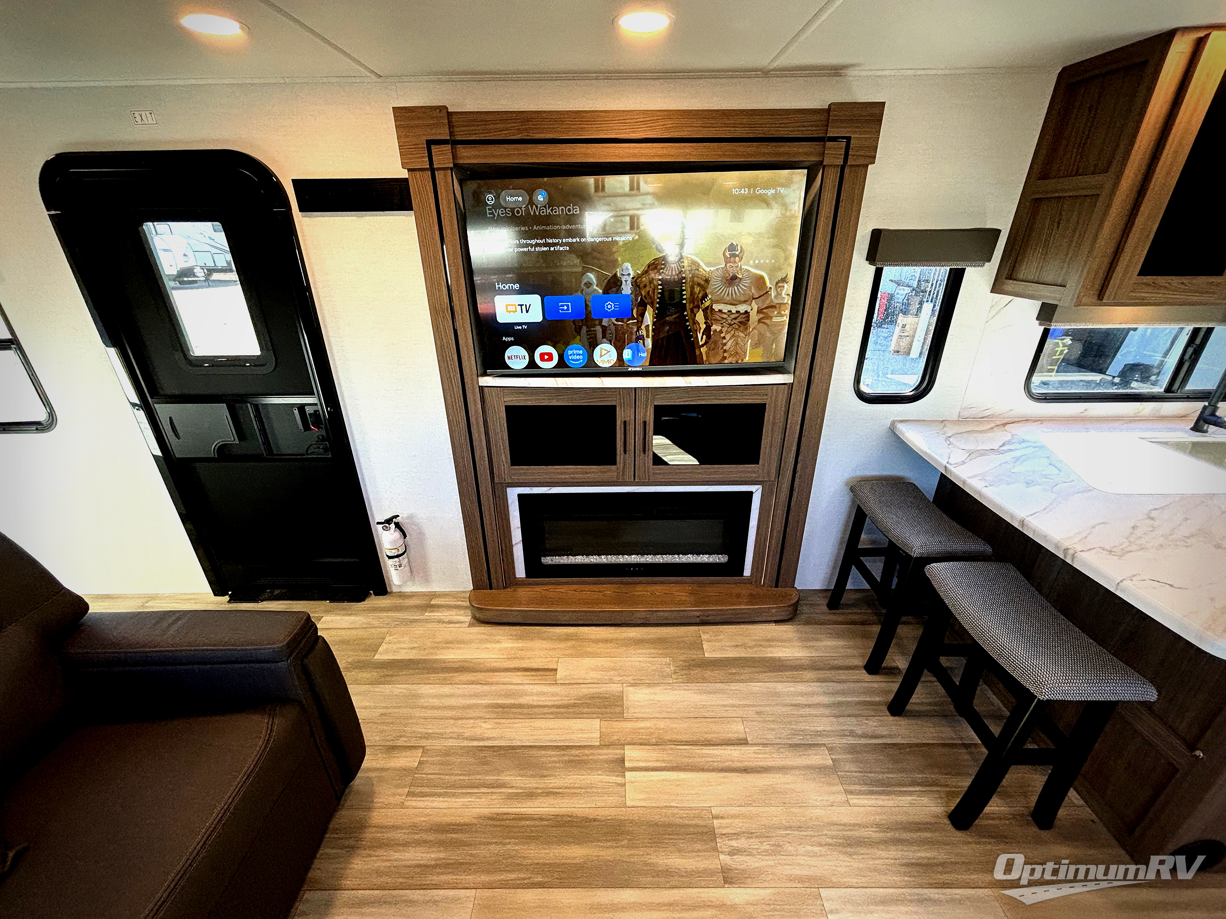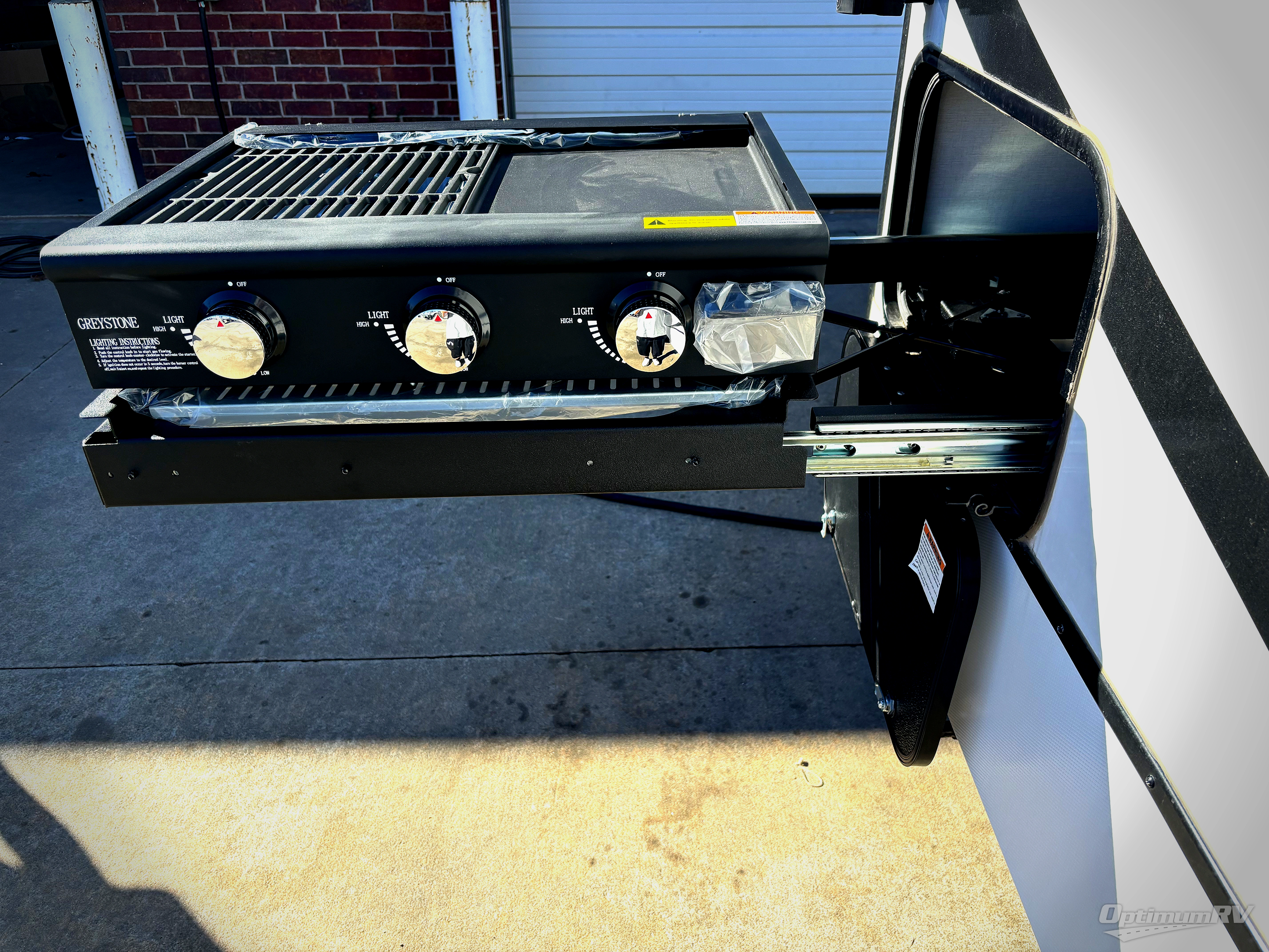 Start camping in luxury with this travel trailer! Prepare your best home cooked meals in the rear kitchen with the three burner cooktop, 10 cu. ft. 12V refrigerator, tip-out trash can, and even two bar stools to enjoy your morning coffee while reading the newspaper. Freshen up in the full bathroom with the 30" x 36" shower or head outside to relax under one of the two awnings. There is even an outdoor griddle/grill underneath one of the awnings to protect you while you grill up some juicy burgers, plus an outside 32" TV. The front private bedroom has a queen bed for you to lay your head on at night and has wardrobe nightstands for your items. Relax in true comfort each night on one of the two furniture spots in front of the entertainment center with a 50" class HDTV with a fireplace below it!