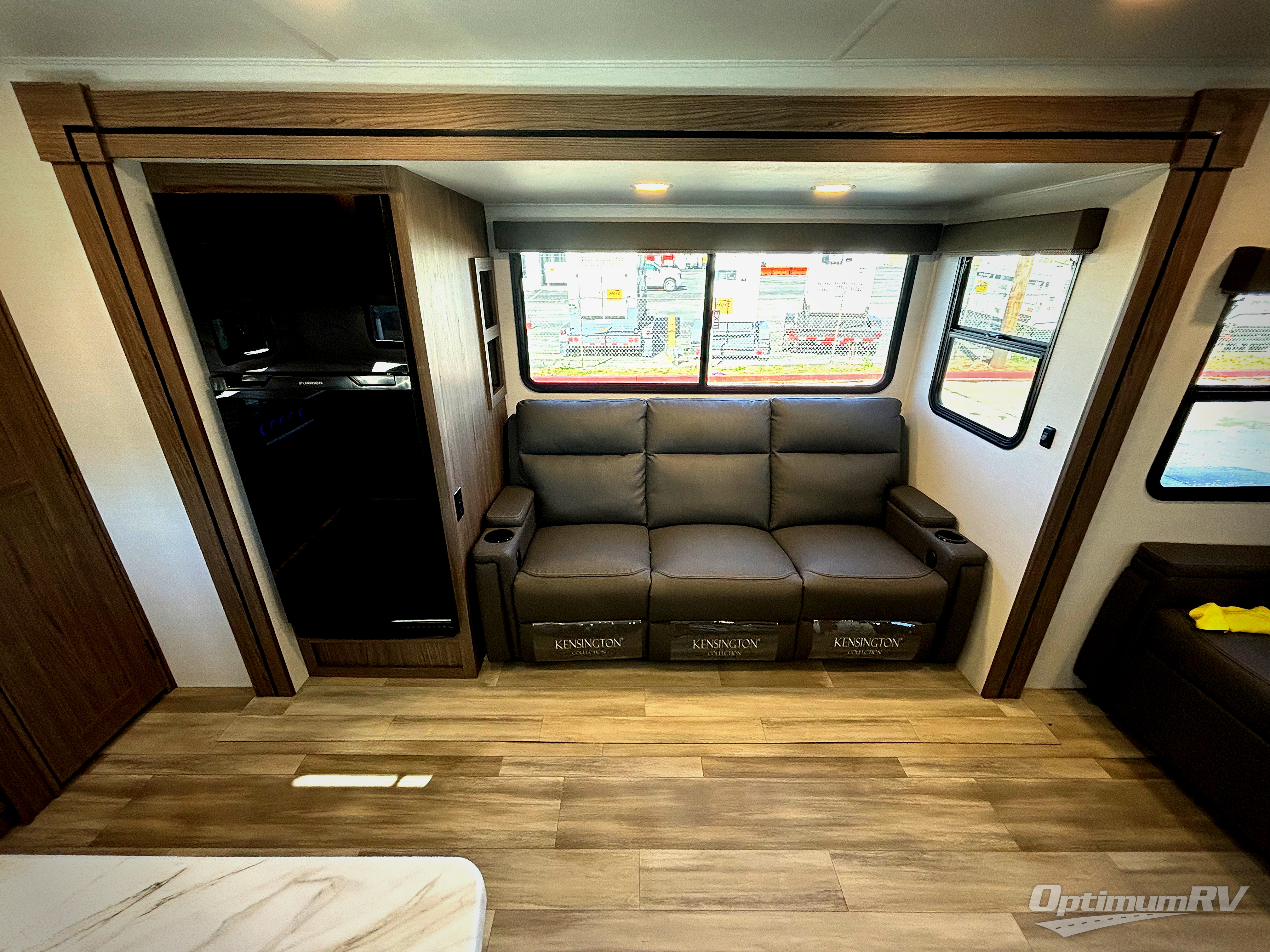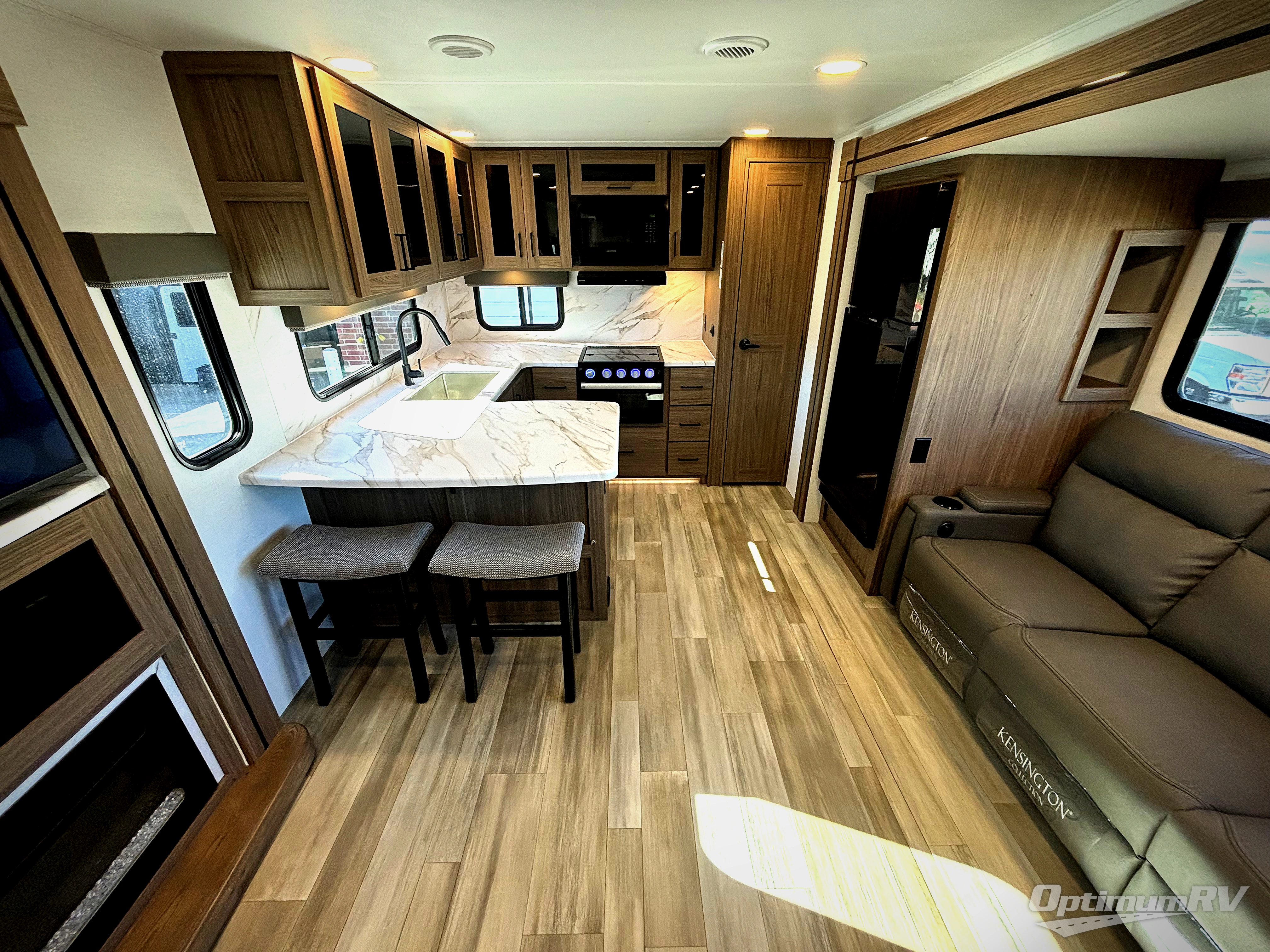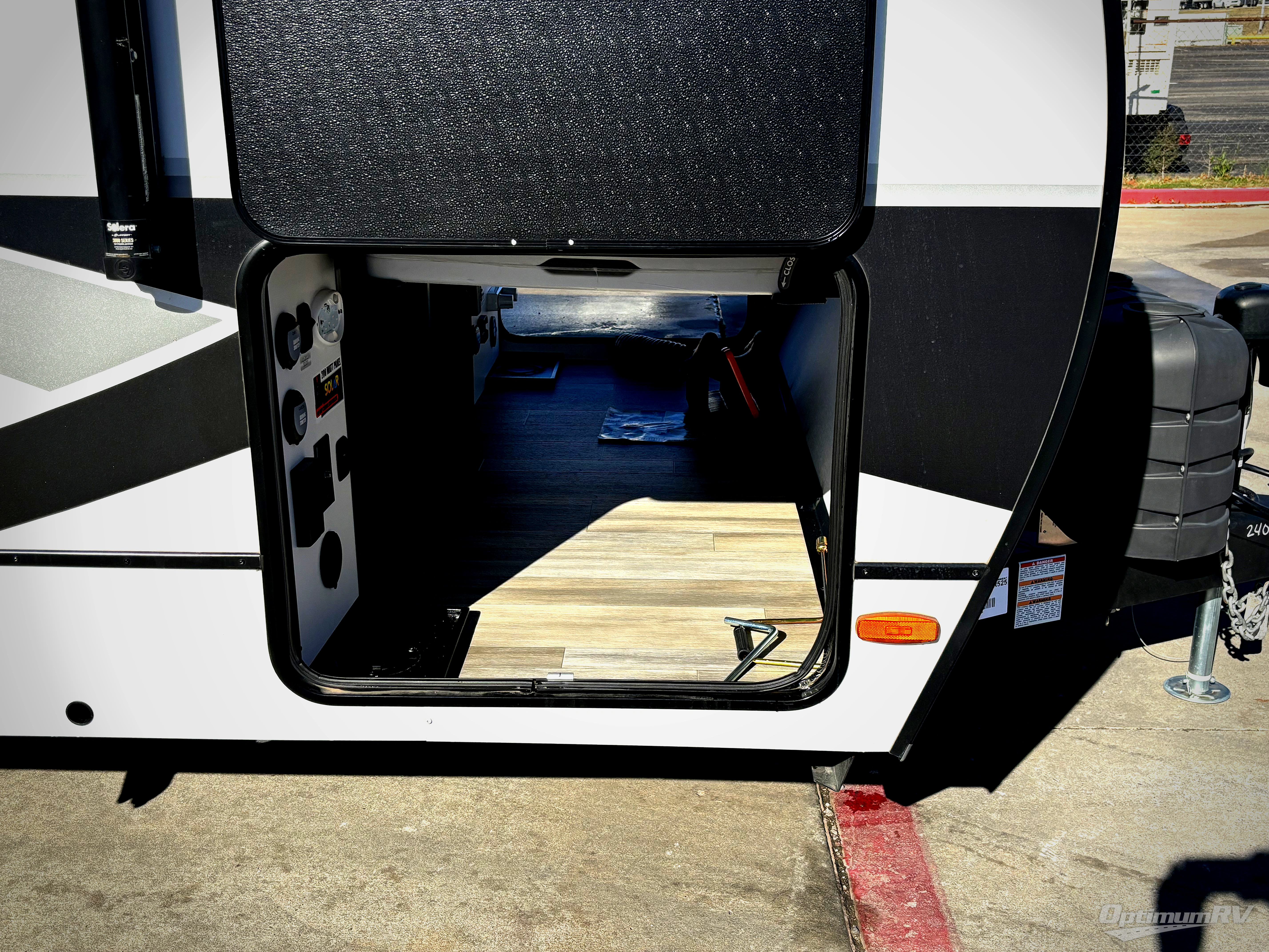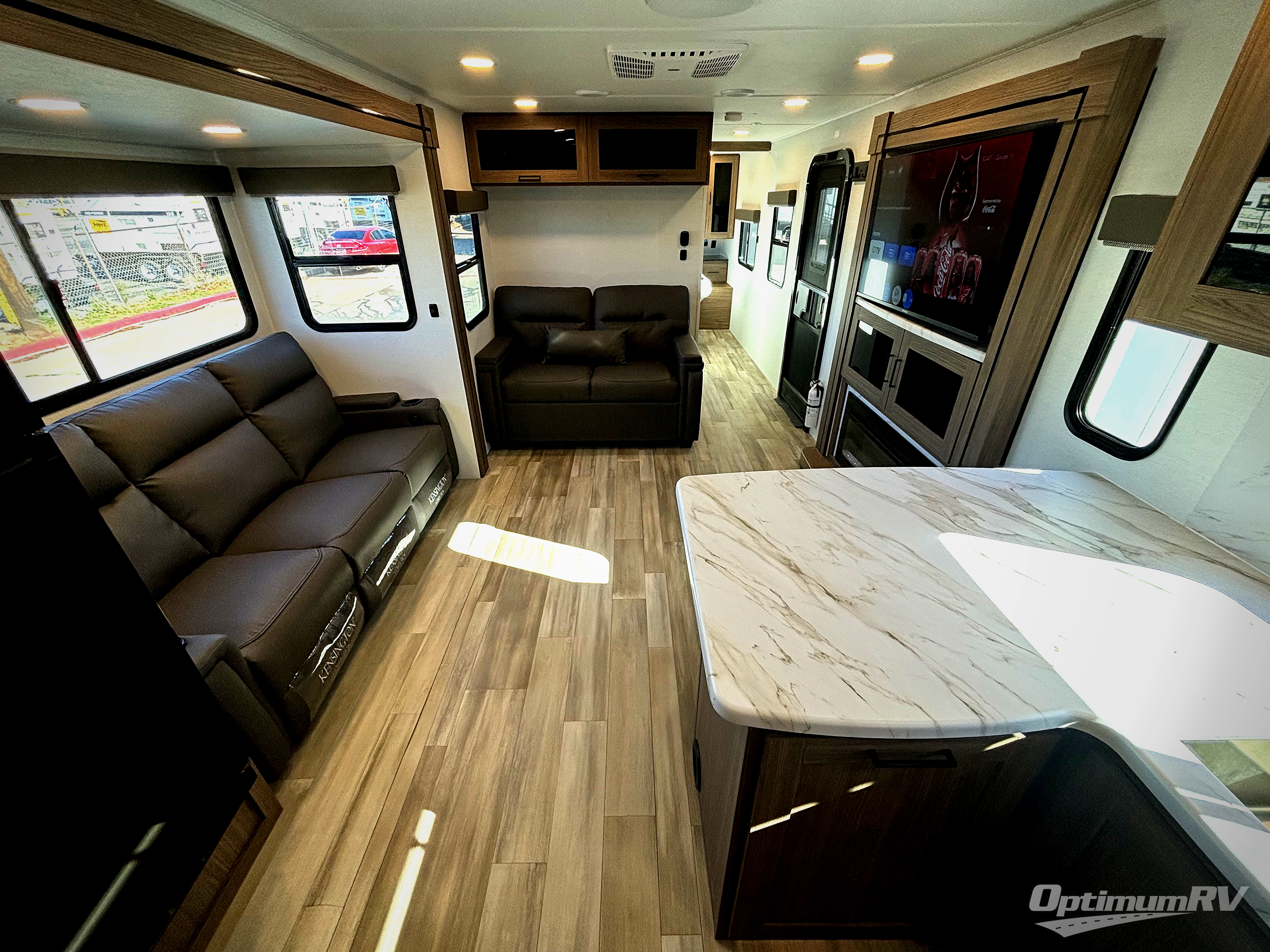 Start camping in luxury with this travel trailer! Prepare your best home cooked meals in the rear kitchen with the three burner cooktop, 10 cu. ft. 12V refrigerator, tip-out trash can, and even two bar stools to enjoy your morning coffee while reading the newspaper. Freshen up in the full bathroom with the 30" x 36" shower or head outside to relax under one of the two awnings. There is even an outdoor griddle/grill underneath one of the awnings to protect you while you grill up some juicy burgers, plus an outside 32" TV. The front private bedroom has a queen bed for you to lay your head on at night and has wardrobe nightstands for your items. Relax in true comfort each night on one of the two furniture spots in front of the entertainment center with a 50" class HDTV with a fireplace below it!