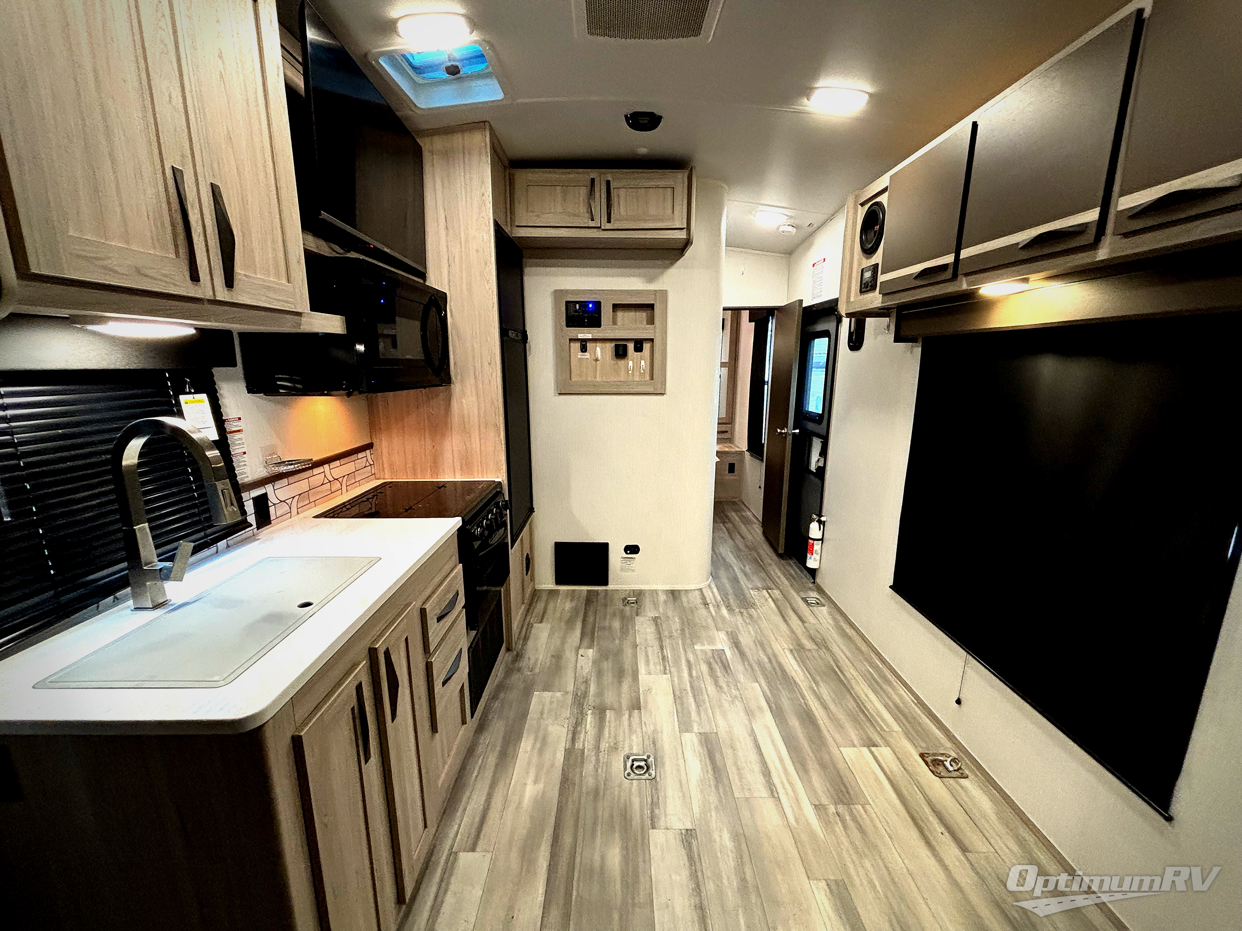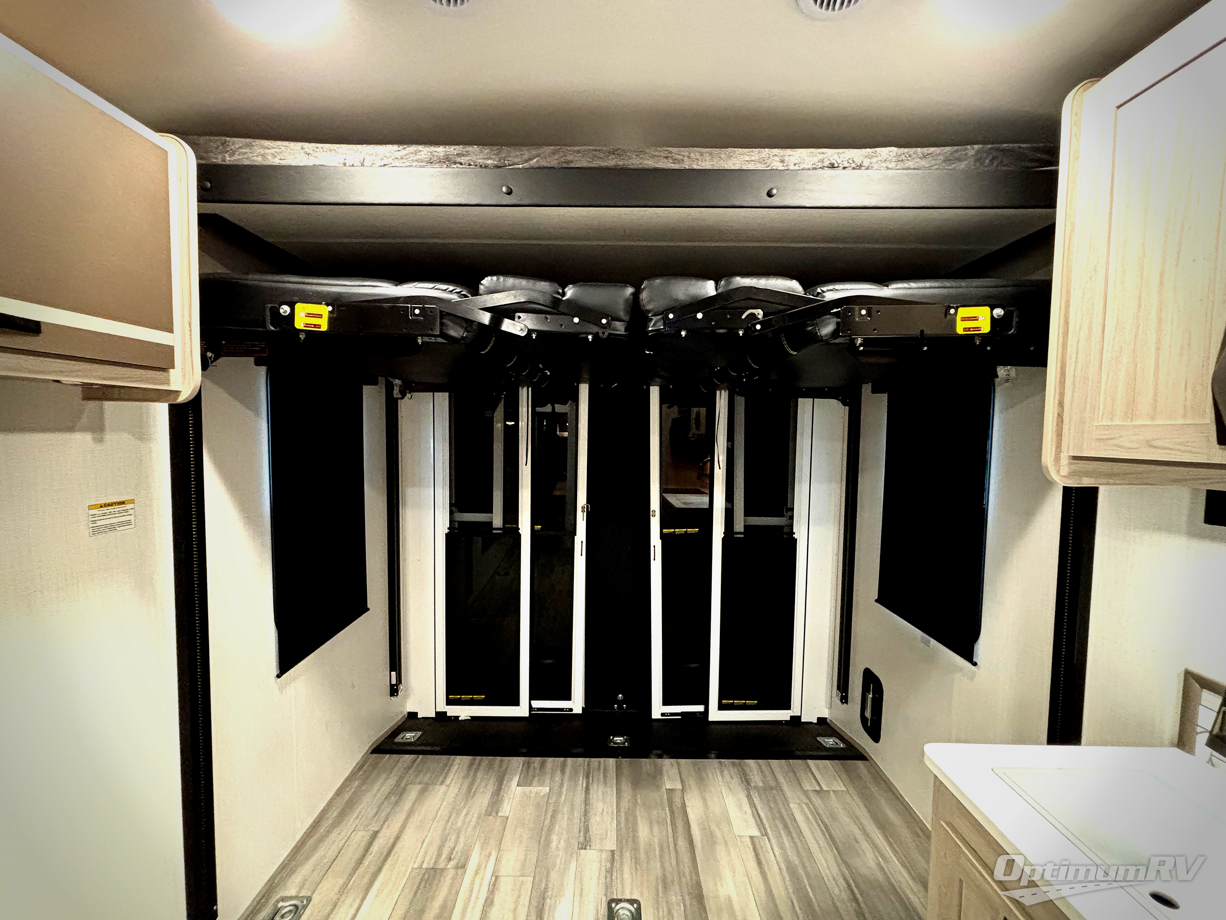 Never leave your dirt bikes behind with this toy hauler in tow! You can easily unload them through the 8' 6" door opening while using the easy-load 8' ramp door. Once the toys are out, you can relax on the opposing sofas with a dinette, and this area can become your guests' bedroom at night since there is a power queen bed above the sofas. And you might want to add the optional three seasons glass door for great outdoor views as you dine or play cards in the evening. The full kitchen includes a three burner range with an oven and a large residential microwave to cook meals each day, along with a refrigerator for food storage. This model also includes dual lounge chairs in the kitchen area to provide even more seating space. When you're ready to turn in for the night, freshen up in the dual entry bath that includes a spacious shower with a skylight, a seamless edge countertop, and even a bonus shelf with towel hangers so everything has a place. Your king bed will be waiting for you in the front master bedroom, and you can keep all your clothes tidy in the dual wardrobes!