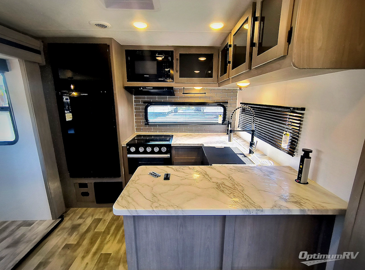 You will love weekends at the lake in this rear kitchen travel trailer that can sleep four to five. There is plenty of counter space in the kitchen, along with a 10 cu. ft. 12V refrigerator, a microwave oven for quick meals, and a booth dinette that can be switched out for an optional standing dinette. Your crew can get cozy on the theater seating with a foot rest directly across from the fireplace and hinged TV with shelving. There is also a jack knife sofa here for more seating and sleeping space for guests. The full bath includes a shower with a skylight and an LED backlit medicine cabinet to keep this space tidy. And you're going to love the front private bedroom with its king bed slide out, front bench seat with dual closets on either side, and bedroom fireplace!