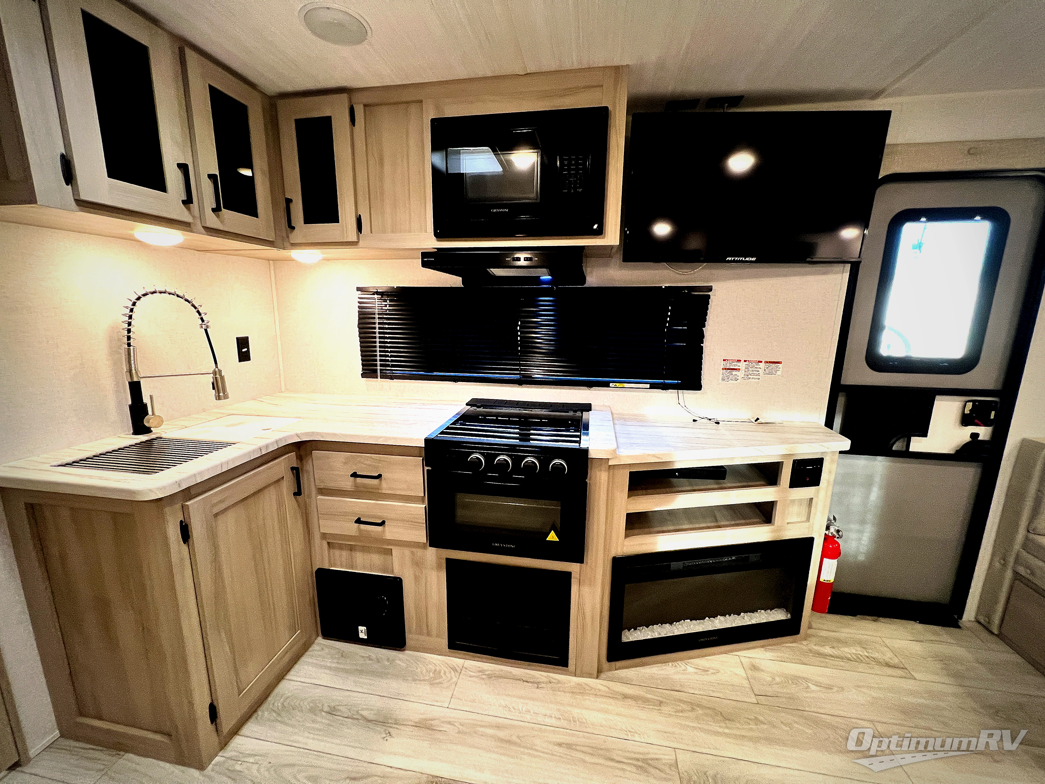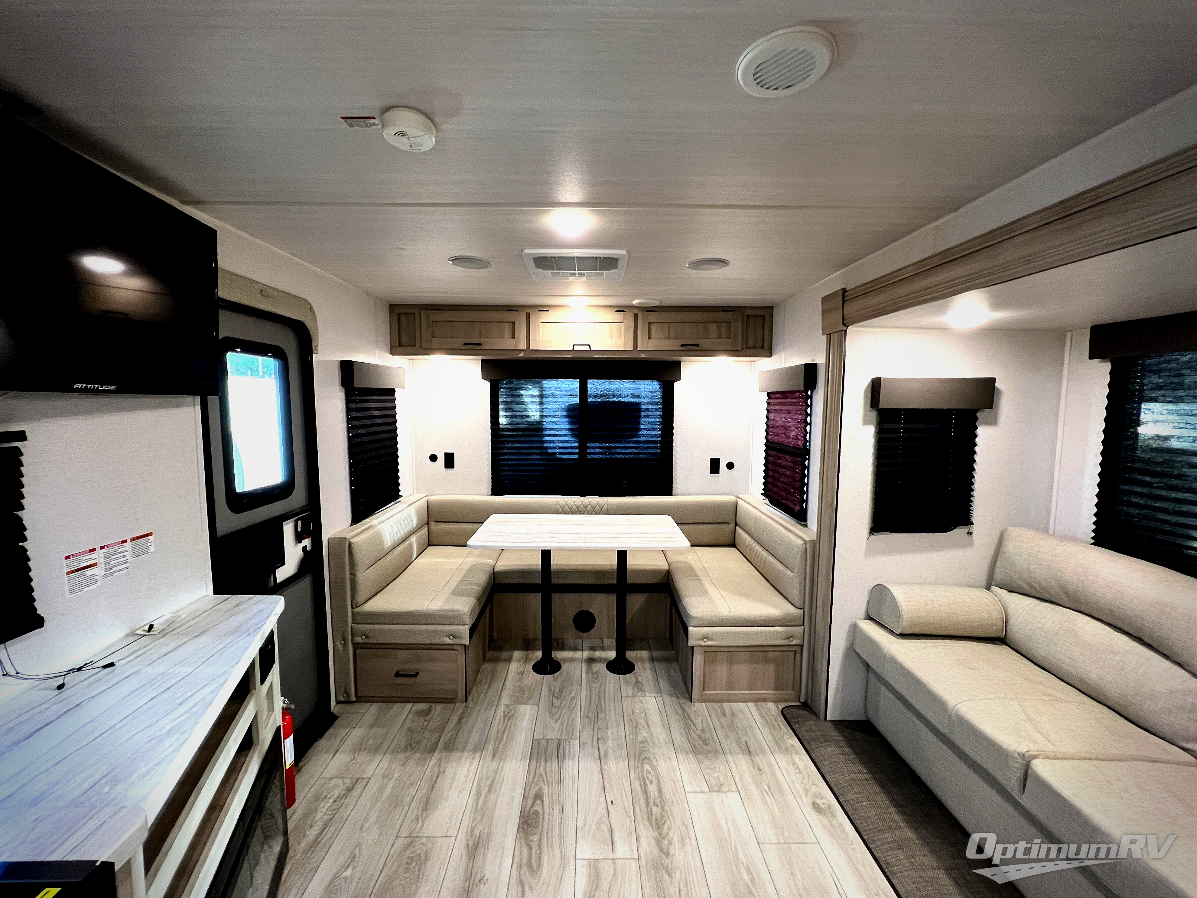 When you are wanting a little more interior space in your next travel trailer, take a look inside! This large slide out widens the main living space so you can easily make meals using full amenities without having to move for someone walking from the front bedroom and walk-through bath to the u-shaped dinette in the back. For sleeping, there is a king-size bed with storage on both sides at the very front of this unit giving you privacy from the rest, and even a private second entry/exit door from within the bedroom. You will find storage beneath the bed for larger items or extra blankets, plus a space saving sliding door. The U-shaped dinette and jack knife sofa offer comfortable seating as well as extra sleeping space for overnight guests, and the fireplace is just a nice feature to enjoy. On the outside, an 18' awning provides a large outdoor living area protected from the elements, and the oversized pass-through will house all of your exterior gear like lawn chairs, outdoor games and rugs, plus so much more!