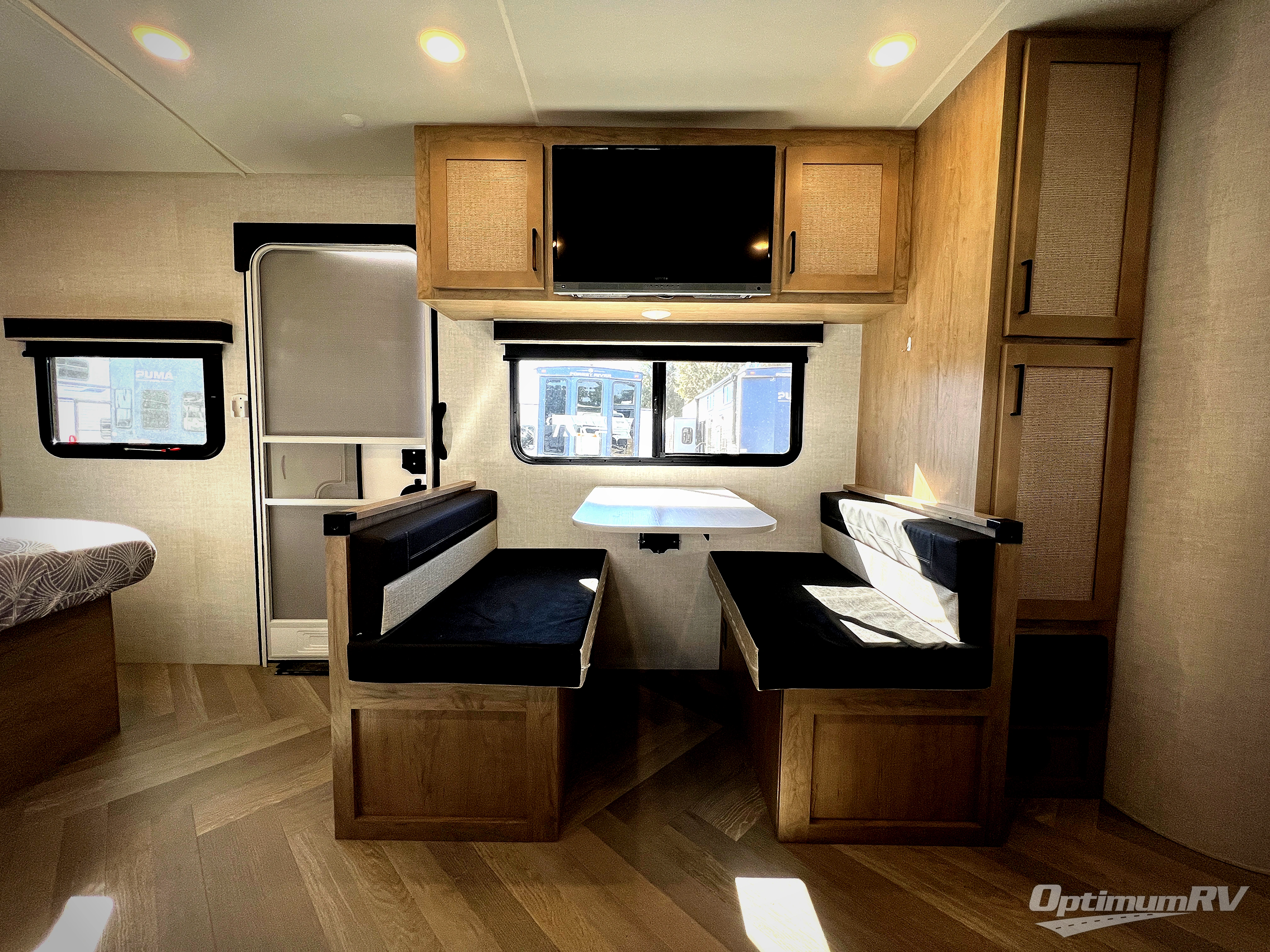 Camping trips just got a whole lot better in this tandem axle, single slide travel trailer! Once you arrive at the campground, you can put out the 18' power awning, grab your camp chairs from the pass-through storage, and relax! When you're getting hungry, head to the rear corner kitchen that includes ample counter space, a two burner cooktop, plus a 10 cu. ft. 12V refrigerator. There is also a pantry to store snacks and paper goods! You can get cozy after dinner on the theater seating that sits directly across from the HDTV for easy viewing, and there is a legless dinette if game night is in order. When you're ready for bed, the queen bed up front will provide a great night's rest, and there is a privacy curtain if you have a guest staying over on the dinette. And don't worry about storage space; this model has you covered with dual bedroom wardrobes, overhead cabinets, and convenient shoe storage!