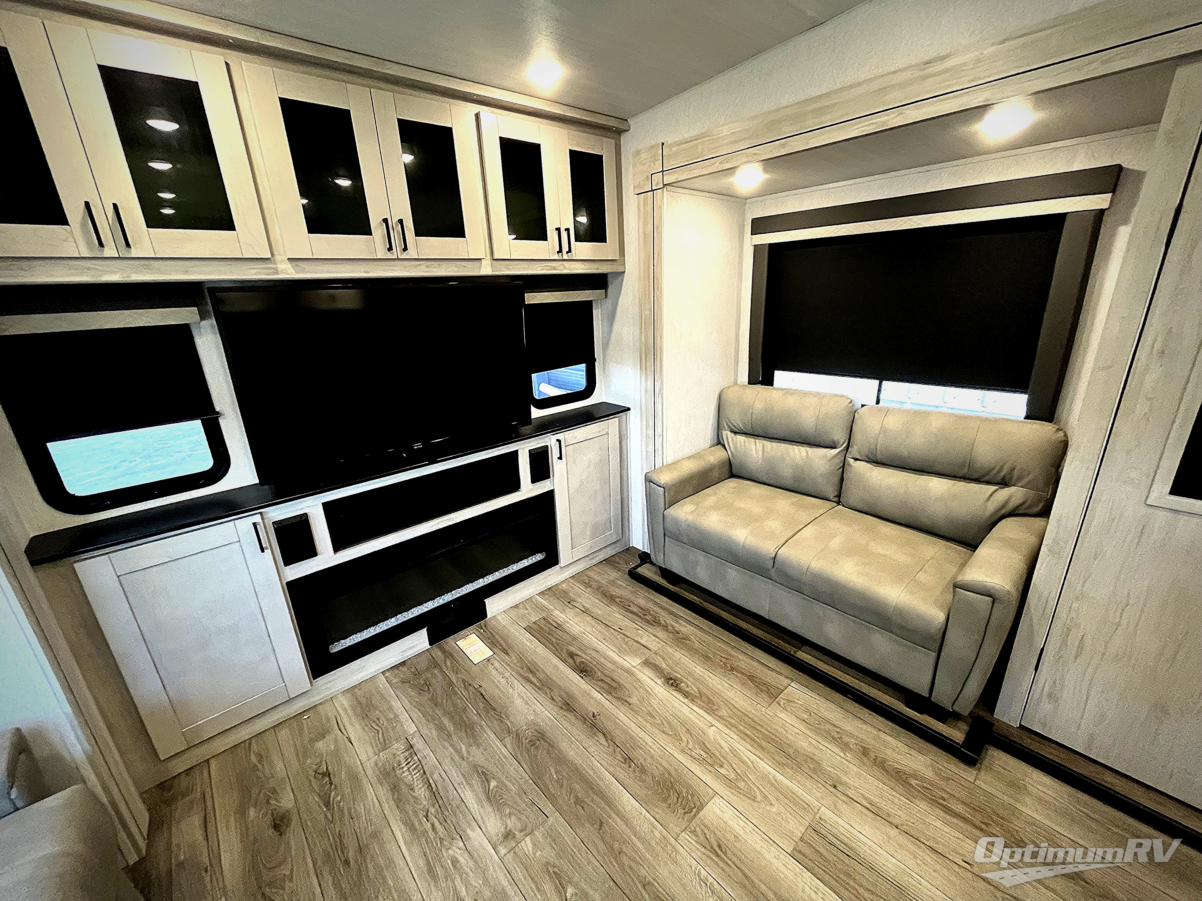Roughing it in the woods will hardly feel like roughing it in this cozy fifth wheel for six! You'll have a full kitchen to cook in each day that includes a four burner range with a 30" over-the-range microwave, ample counter space to prep meals, and a 16 cu. ft. 12V refrigerator that will hold food for the whole week. There is also a free-standing adjustable dinette here with a storage ottoman and a counter that overlooks the rear living area. Here, you'll enjoy two hide-a-bed sofas and theater seating across from the fireplace and 50" TV. And this room can double as your guests' bedroom at night! You'll be able to claim the front private bedroom with a king bed slide out, a full-length wardrobe with washer and dryer prep, plus a dresser with TV prep if you want to add a TV.