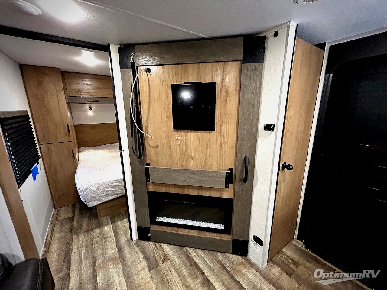 Camping with friends and family just got easier in this travel trailer that can sleep nine each night! The kids or your guest will love the double-size bunks with extra deep storage for their things, while you take the front private bedroom with a camp king bed. There is also a booth dinette and an extra thick cascade edge sofa for more sleeping and seating space. Panoramic windows give you wonderful views of your surroundings, and the fireplace inside will make your space feel more like home. There is an entertainment center with hidden shelves to store movies or books, plus a pantry for snacks galore. This model also includes a full bath with one of the dual entry doors for added convenience!