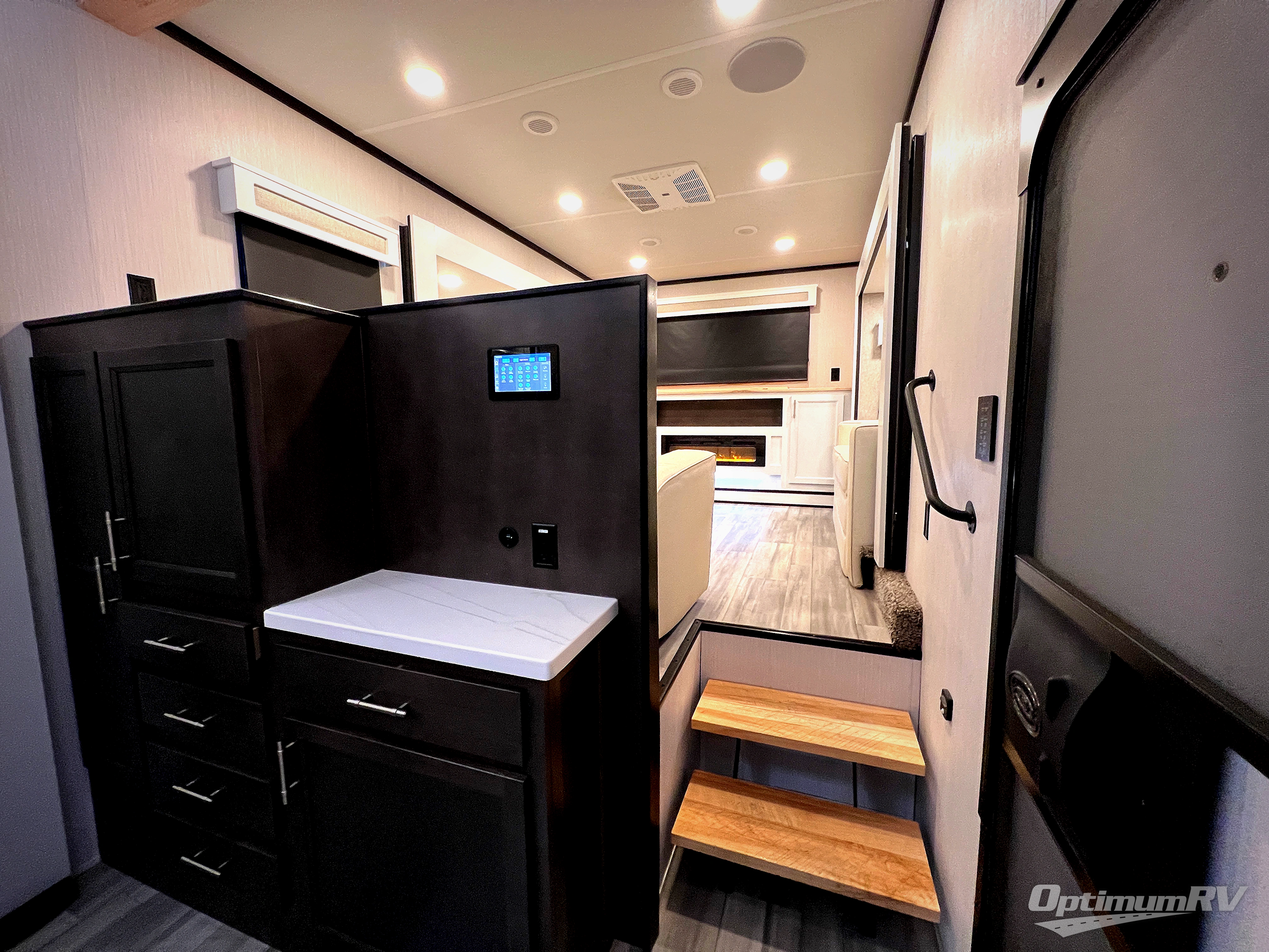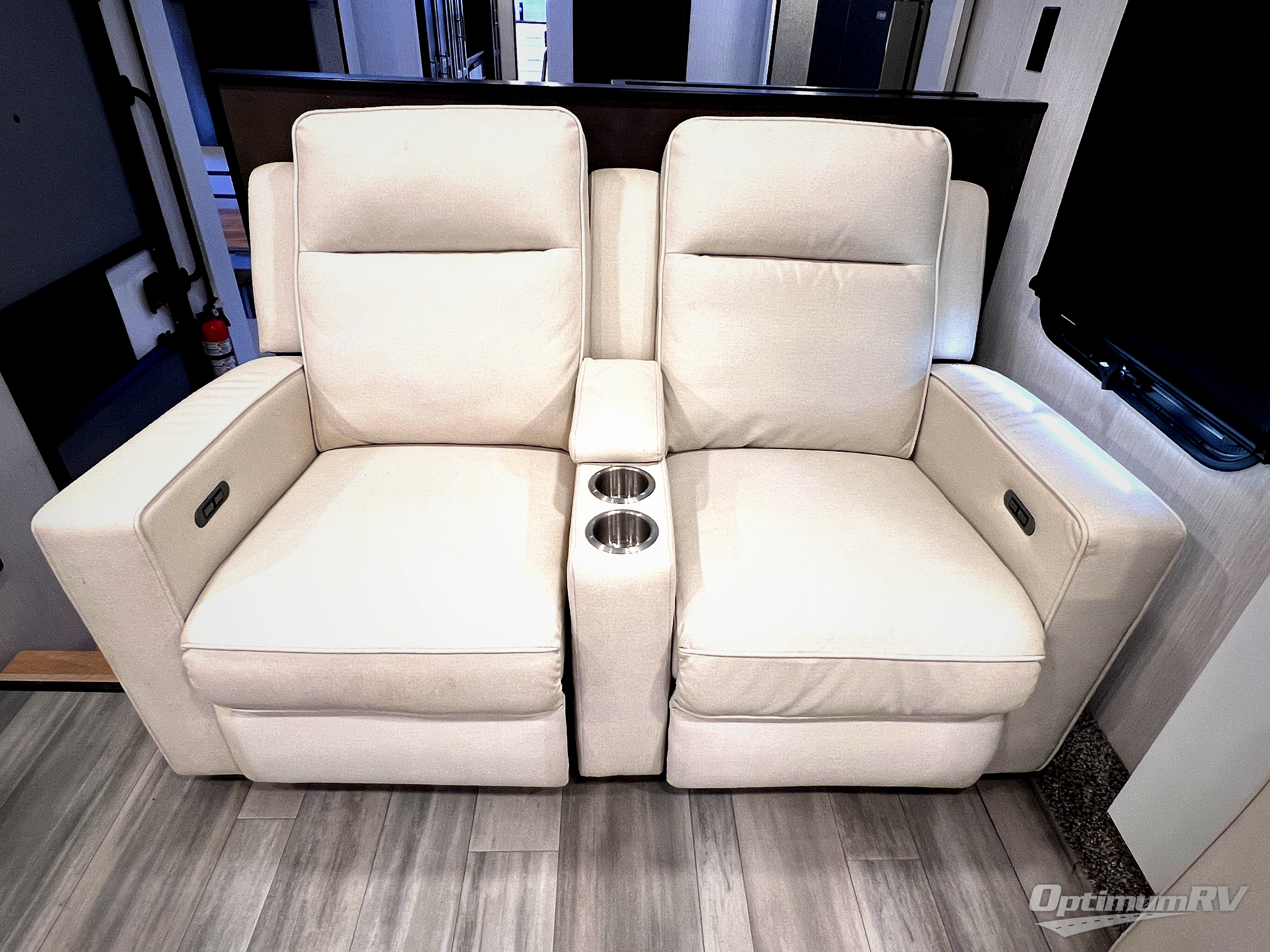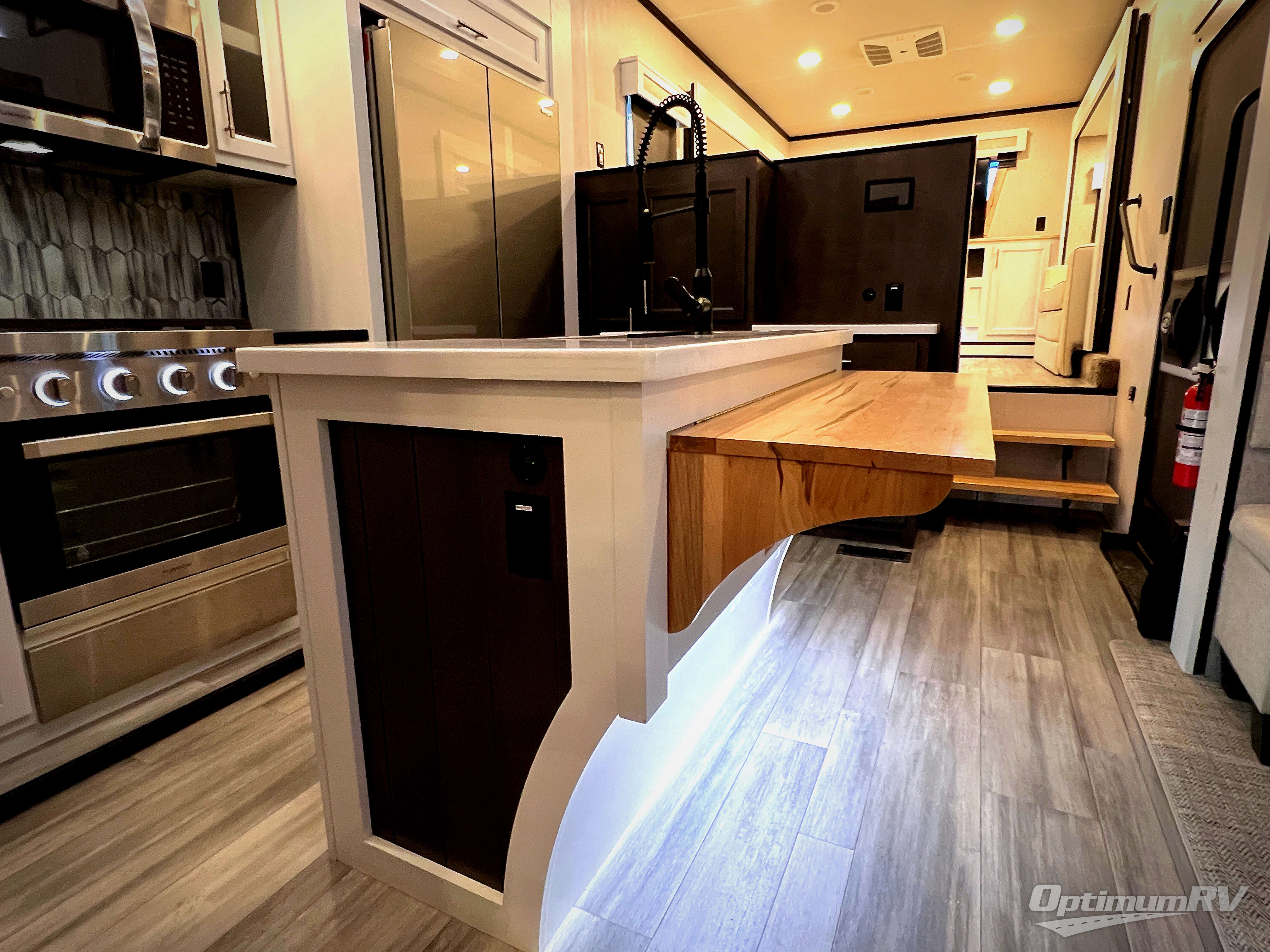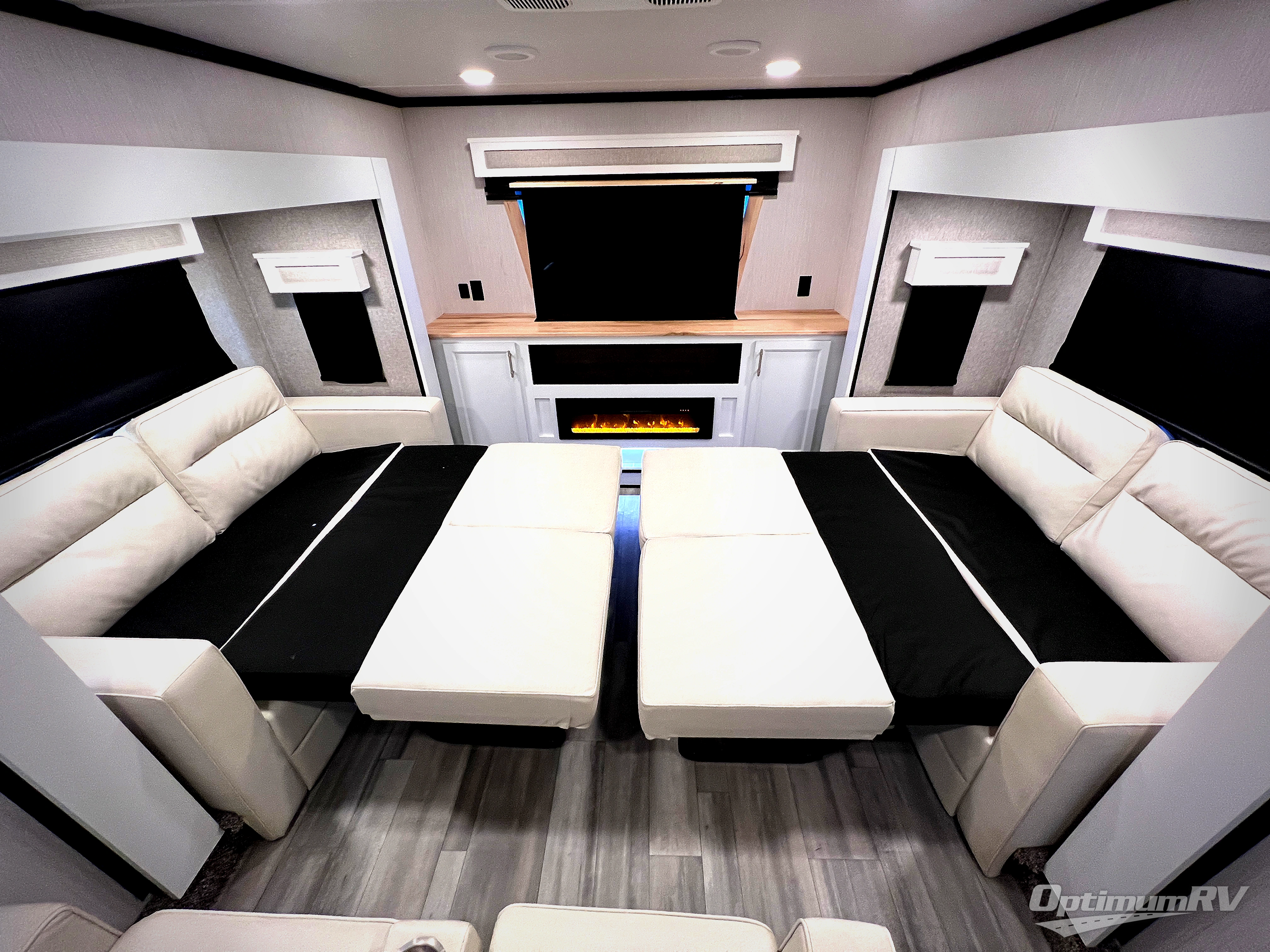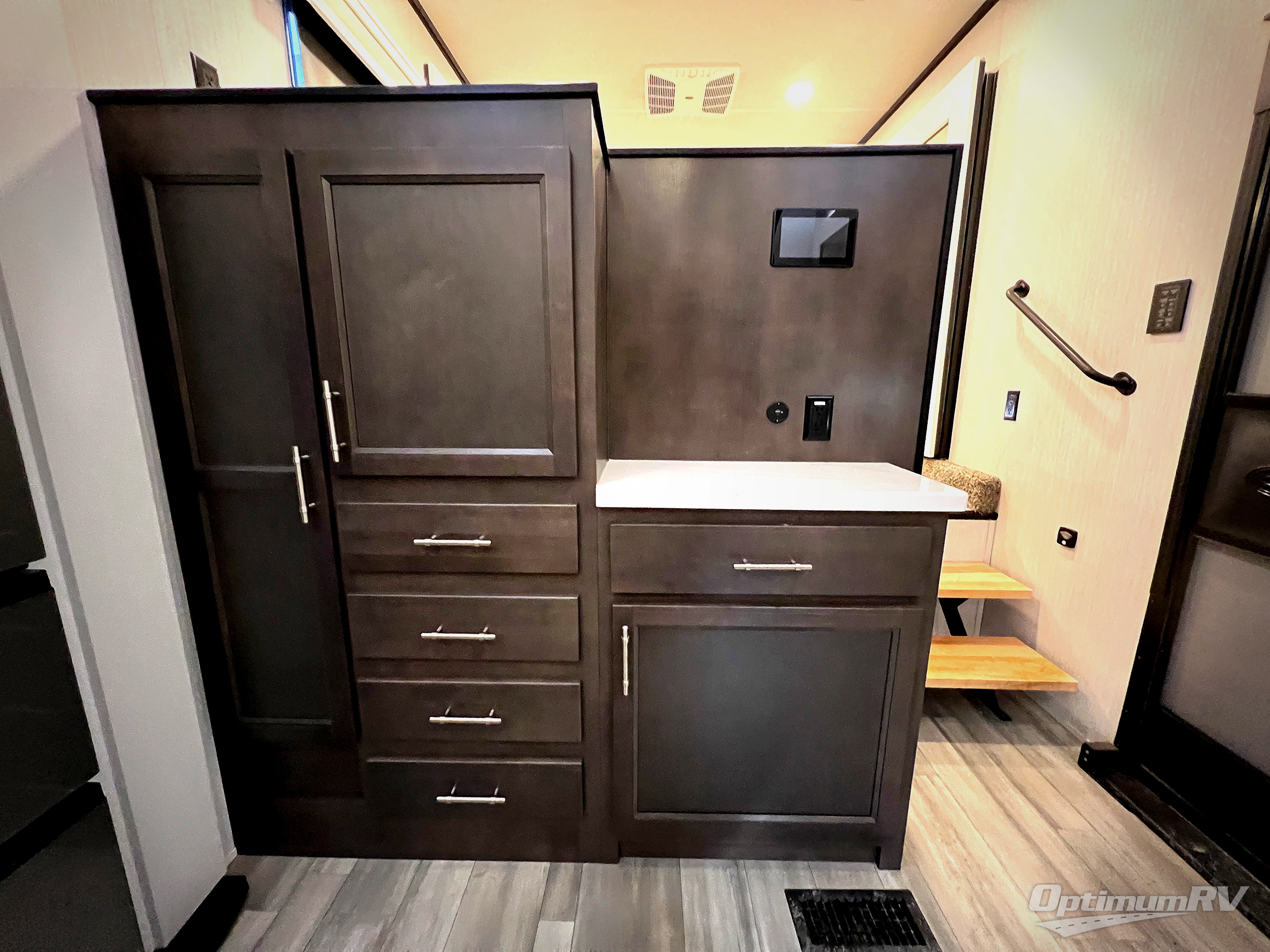 This fifth wheel has everything and then some! The front living area has opposing tri-fold sofas and power theater seating across from the front entertainment center with a fireplace and hidden telescoping TV. The chef can prepare their best meals with the kitchen island with a fold-down breakfast counter, and there is a 20 cu. ft. 12V refrigerator for food storage. Enjoy your meals and the extra space provided with the wall mounted dining table with an extension and an ottoman. The master suite has a king bed slide to lay your head at night and access to the full rear bathroom which has a shower with a seat, a linen closet, washer/dryer prep, and a dual sink vanity. You'll also find drop-down storage underneath the bath/bedroom so nothing gets left behind. And the convenient half bath can be traded out for an optional bonus pantry if you don't need the half bath!