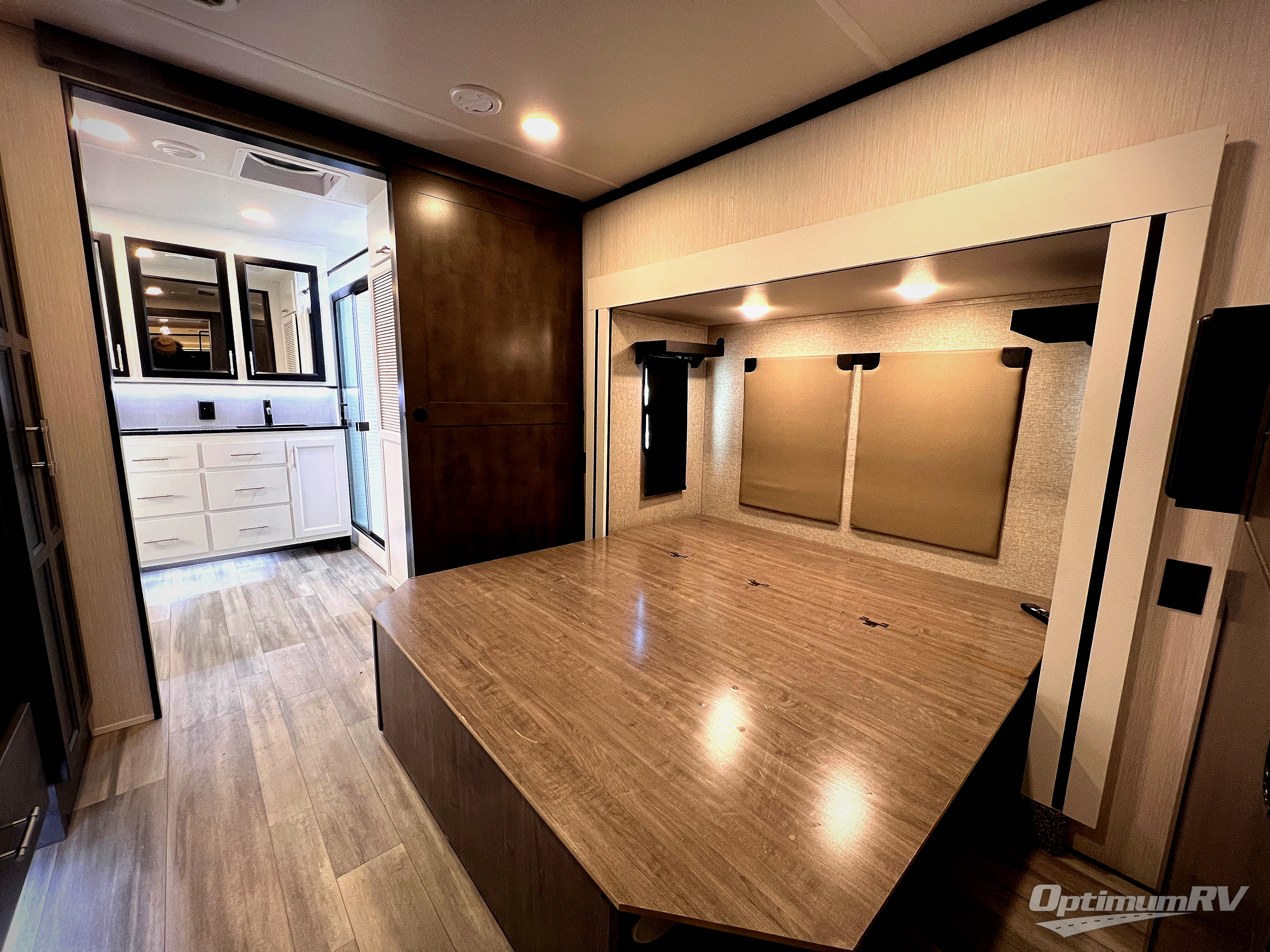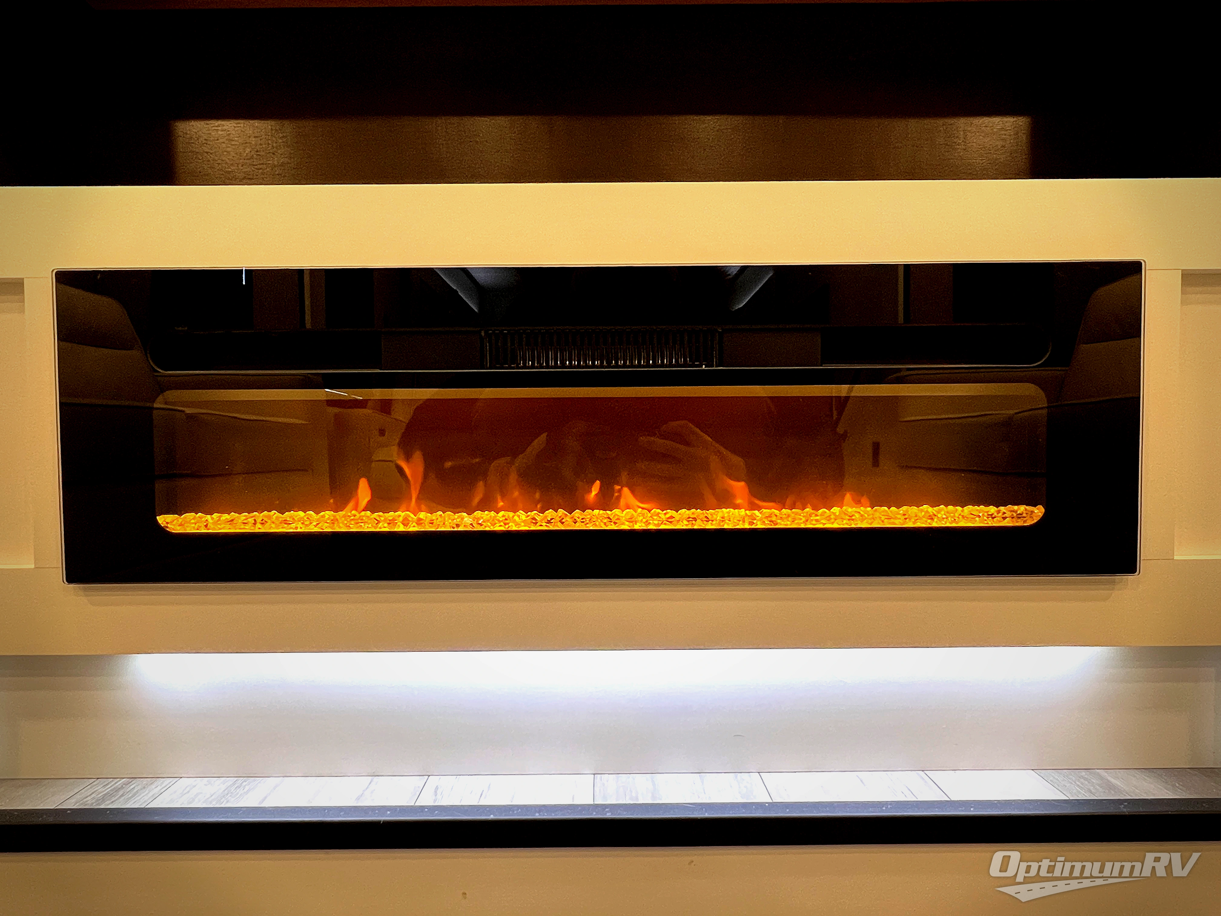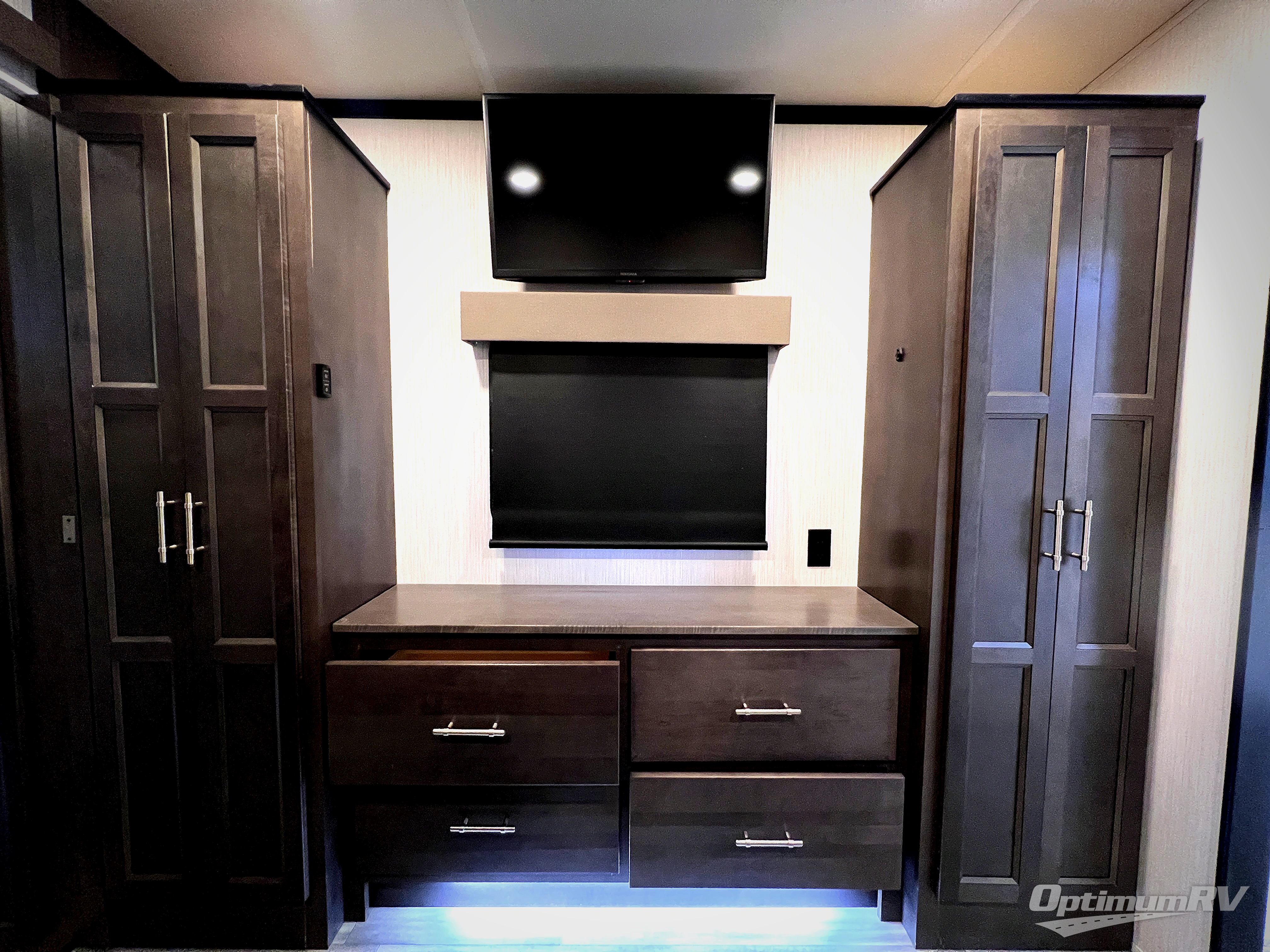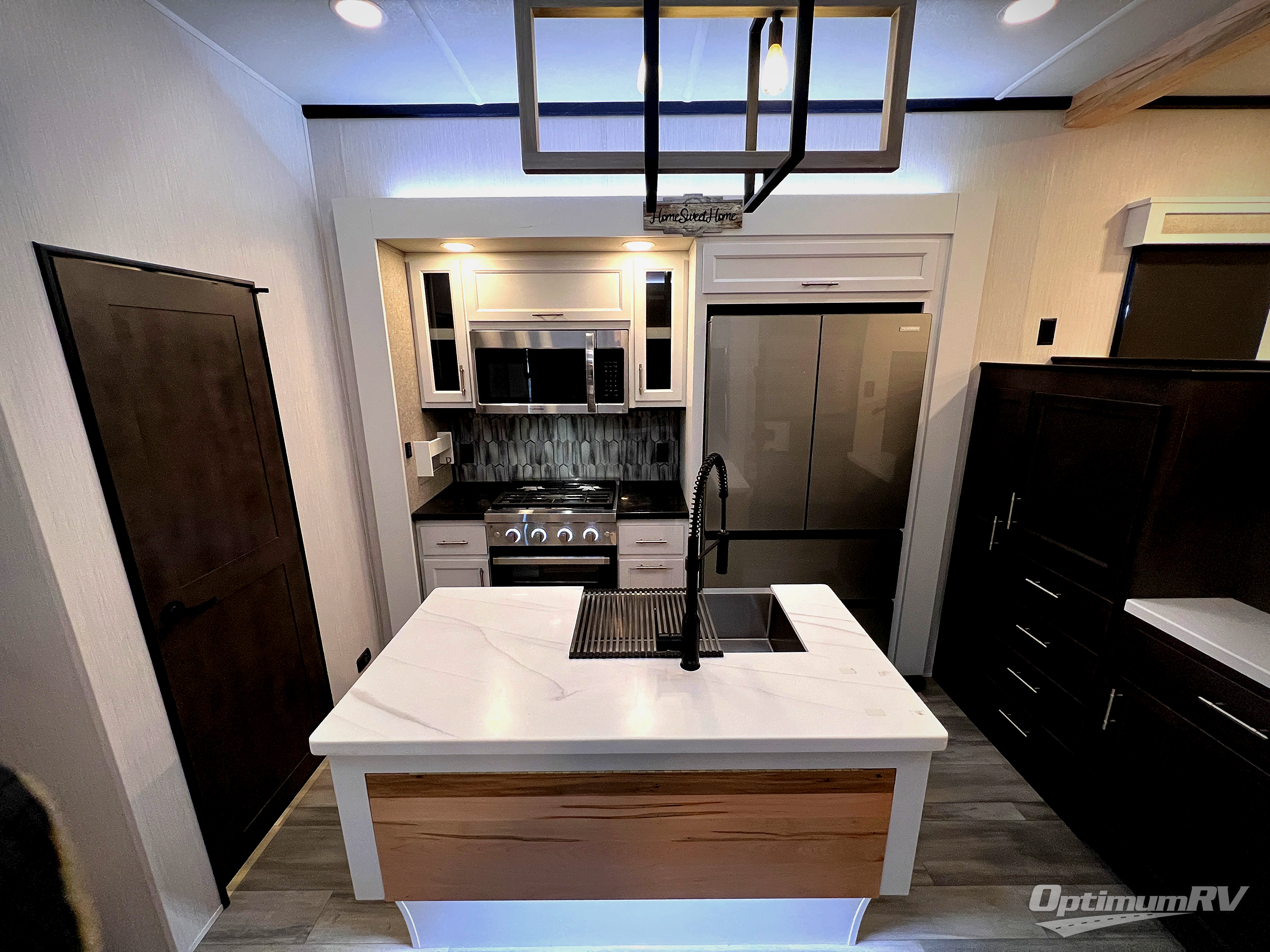 This fifth wheel has everything and then some! The front living area has opposing tri-fold sofas and power theater seating across from the front entertainment center with a fireplace and hidden telescoping TV. The chef can prepare their best meals with the kitchen island with a fold-down breakfast counter, and there is a 20 cu. ft. 12V refrigerator for food storage. Enjoy your meals and the extra space provided with the wall mounted dining table with an extension and an ottoman. The master suite has a king bed slide to lay your head at night and access to the full rear bathroom which has a shower with a seat, a linen closet, washer/dryer prep, and a dual sink vanity. You'll also find drop-down storage underneath the bath/bedroom so nothing gets left behind. And the convenient half bath can be traded out for an optional bonus pantry if you don't need the half bath!