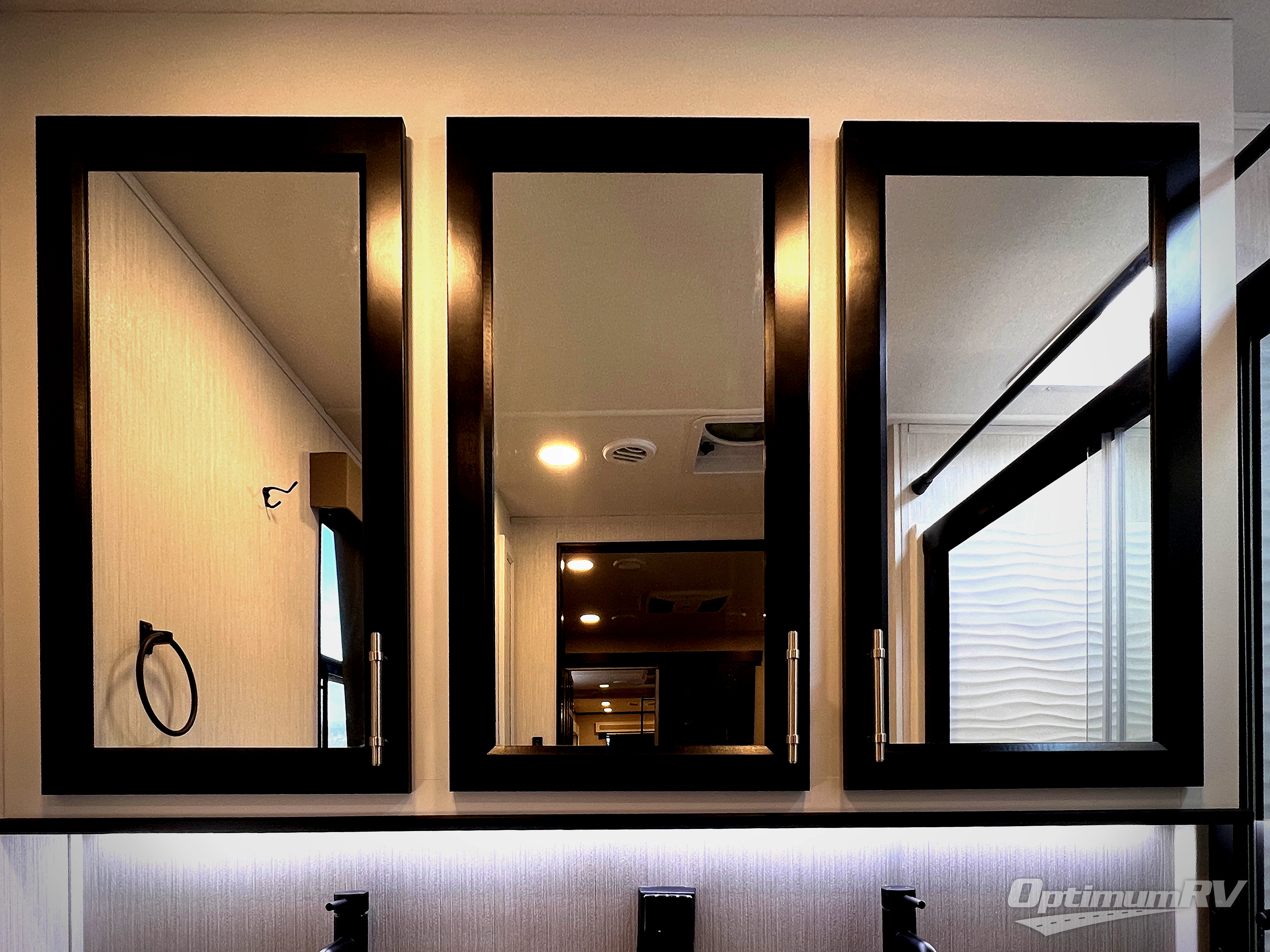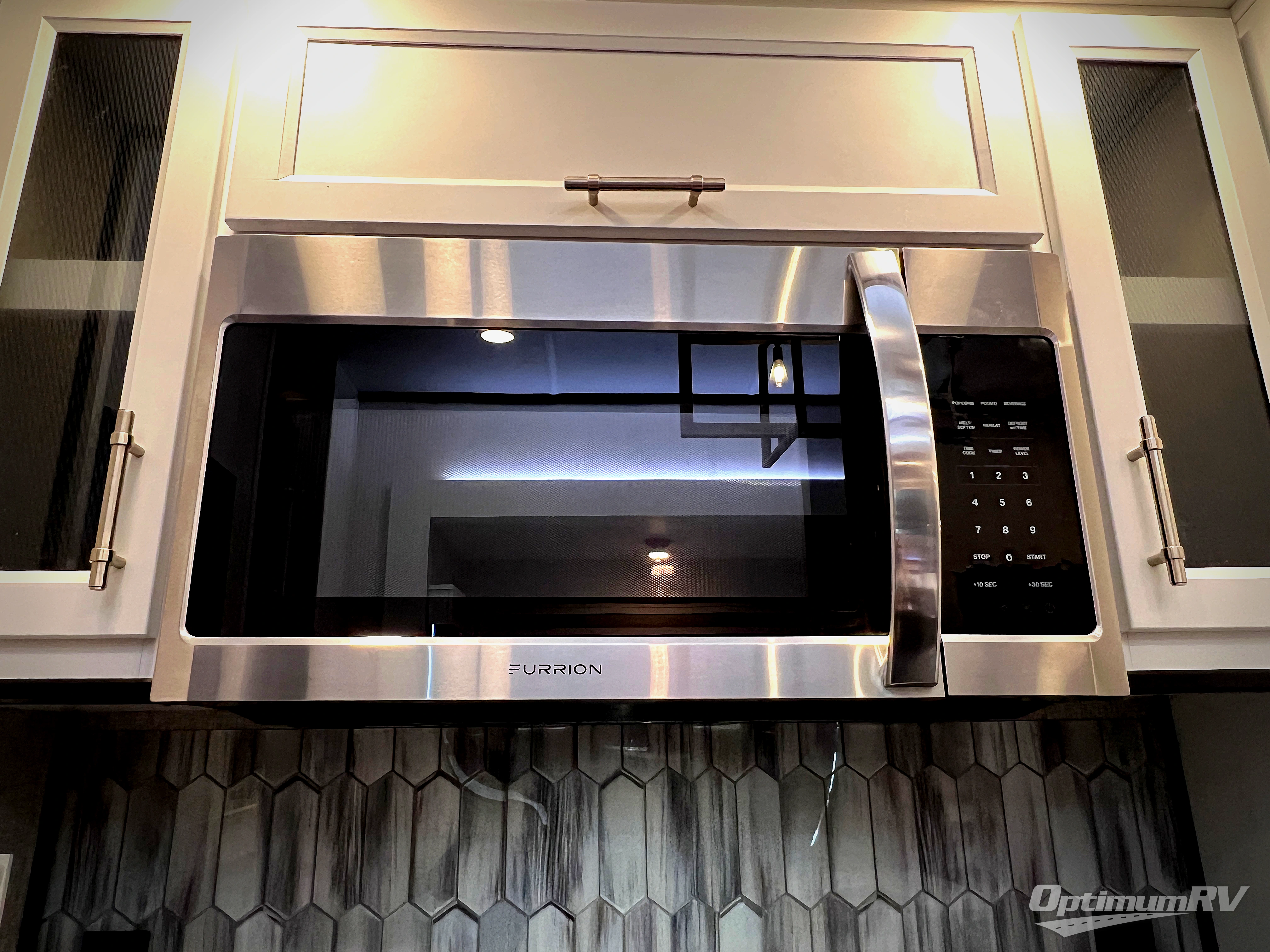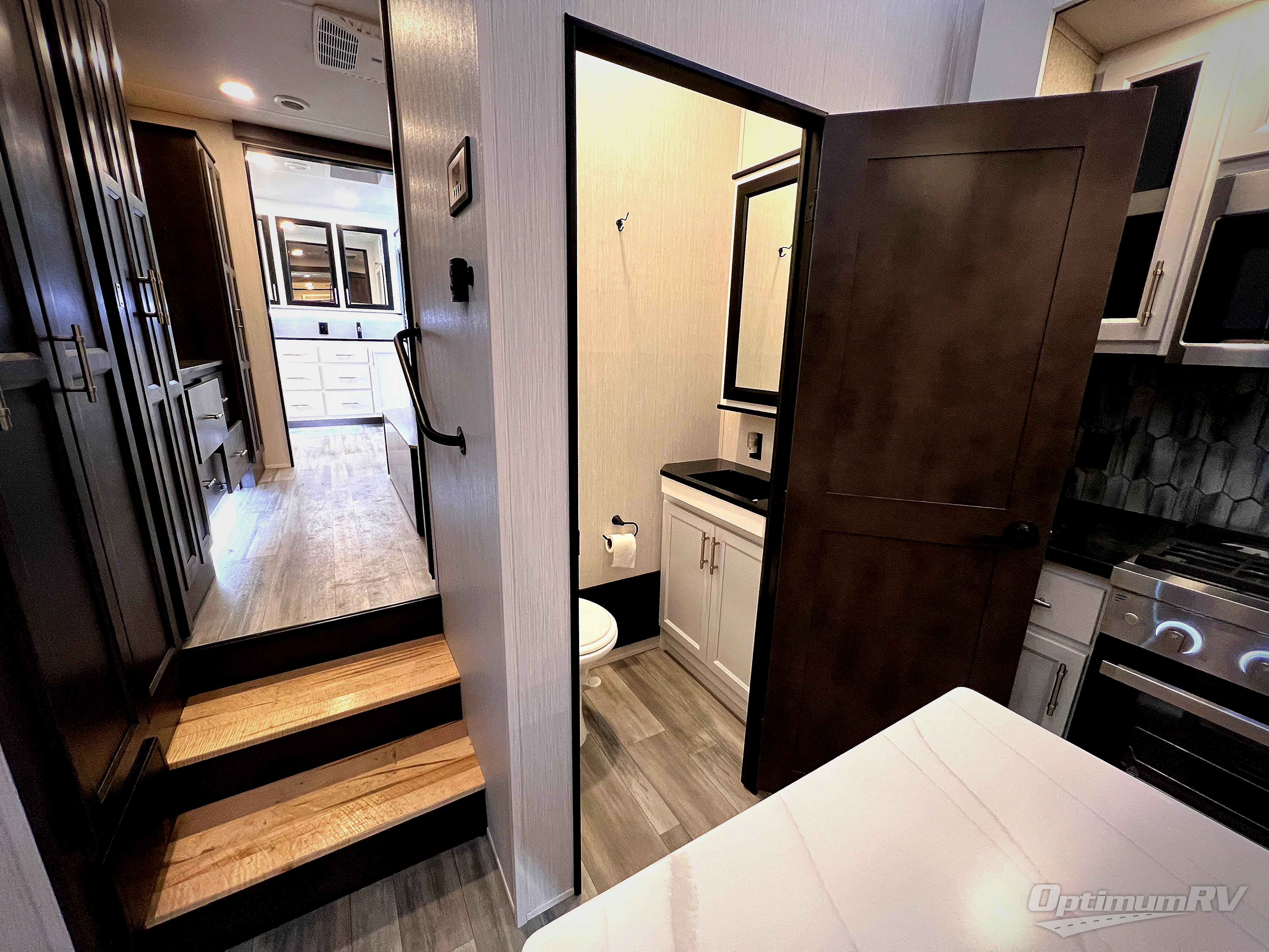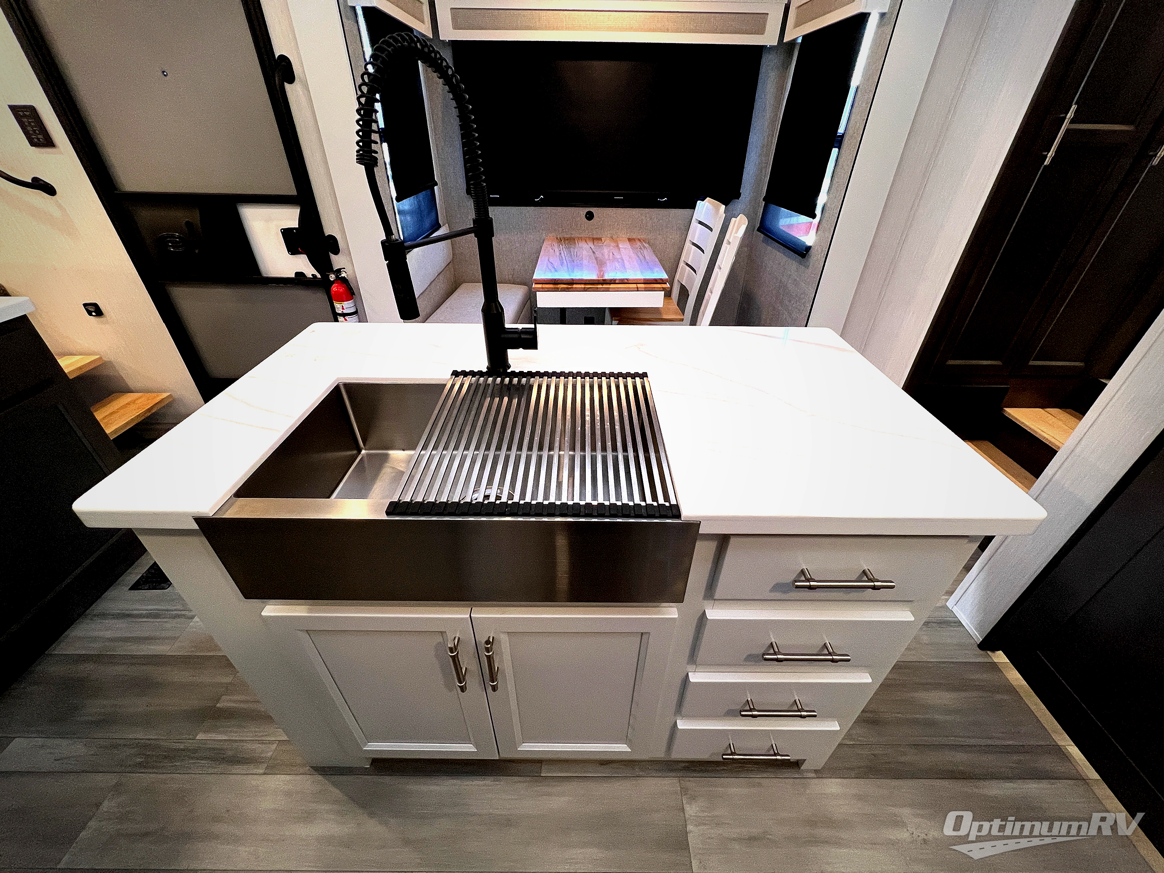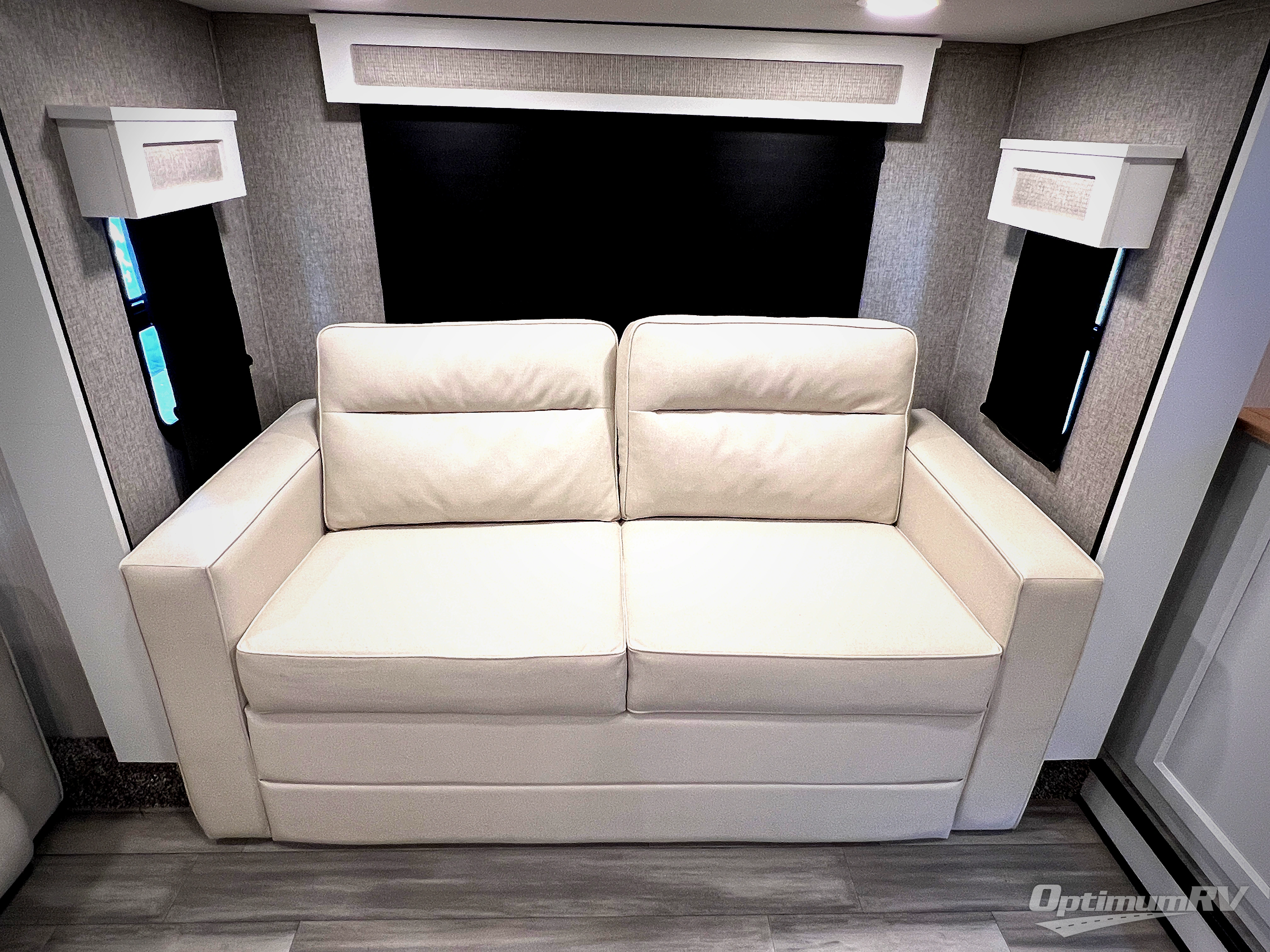 This fifth wheel has everything and then some! The front living area has opposing tri-fold sofas and power theater seating across from the front entertainment center with a fireplace and hidden telescoping TV. The chef can prepare their best meals with the kitchen island with a fold-down breakfast counter, and there is a 20 cu. ft. 12V refrigerator for food storage. Enjoy your meals and the extra space provided with the wall mounted dining table with an extension and an ottoman. The master suite has a king bed slide to lay your head at night and access to the full rear bathroom which has a shower with a seat, a linen closet, washer/dryer prep, and a dual sink vanity. You'll also find drop-down storage underneath the bath/bedroom so nothing gets left behind. And the convenient half bath can be traded out for an optional bonus pantry if you don't need the half bath!