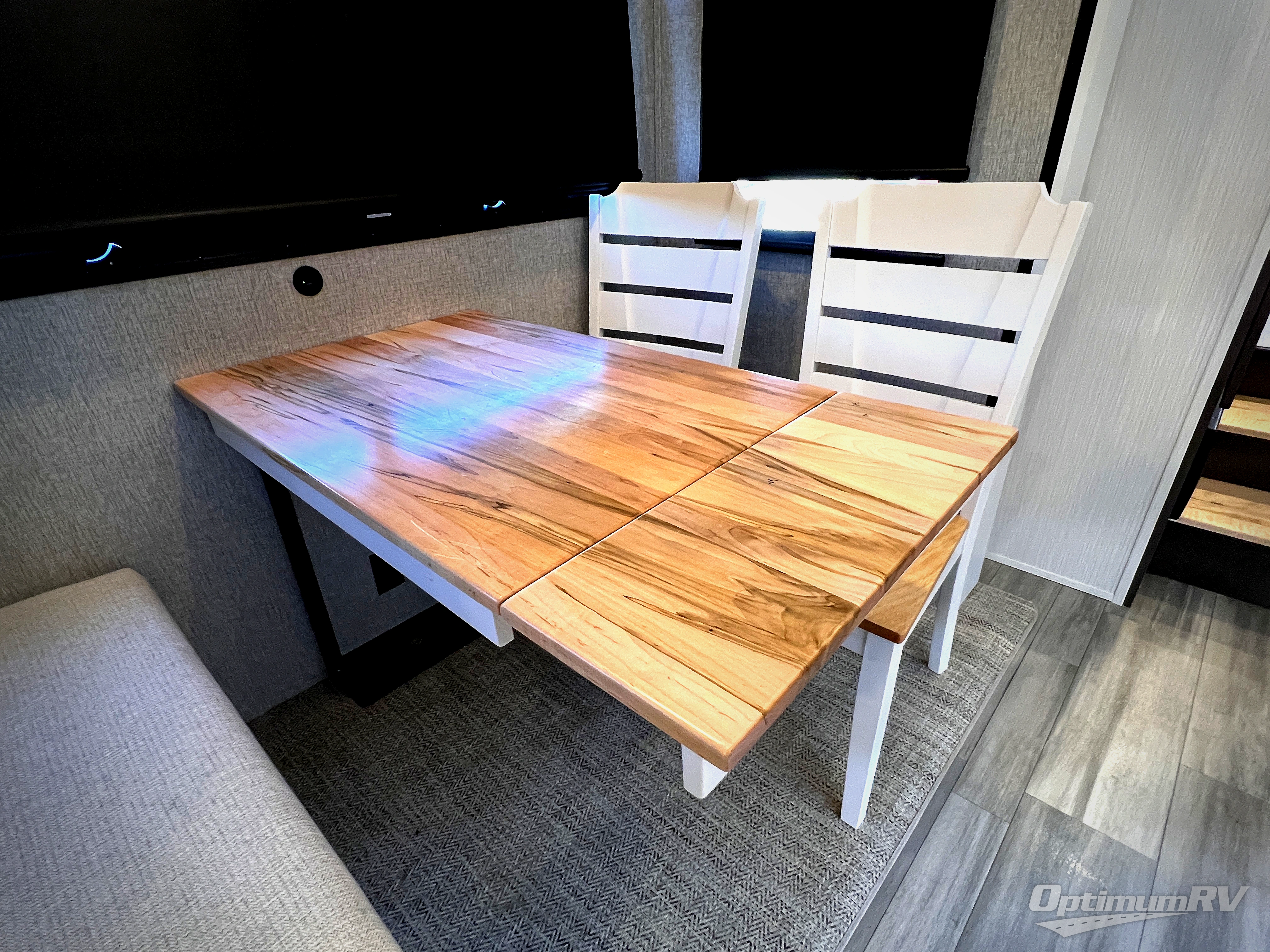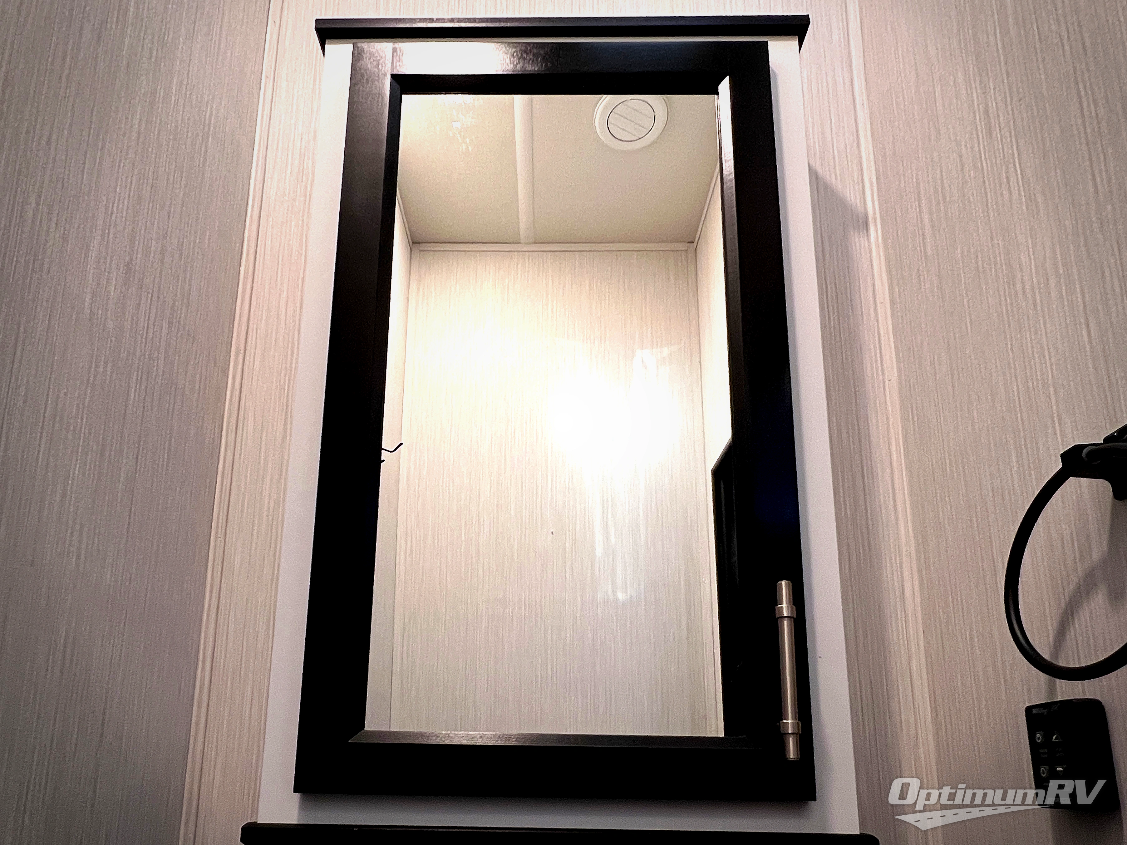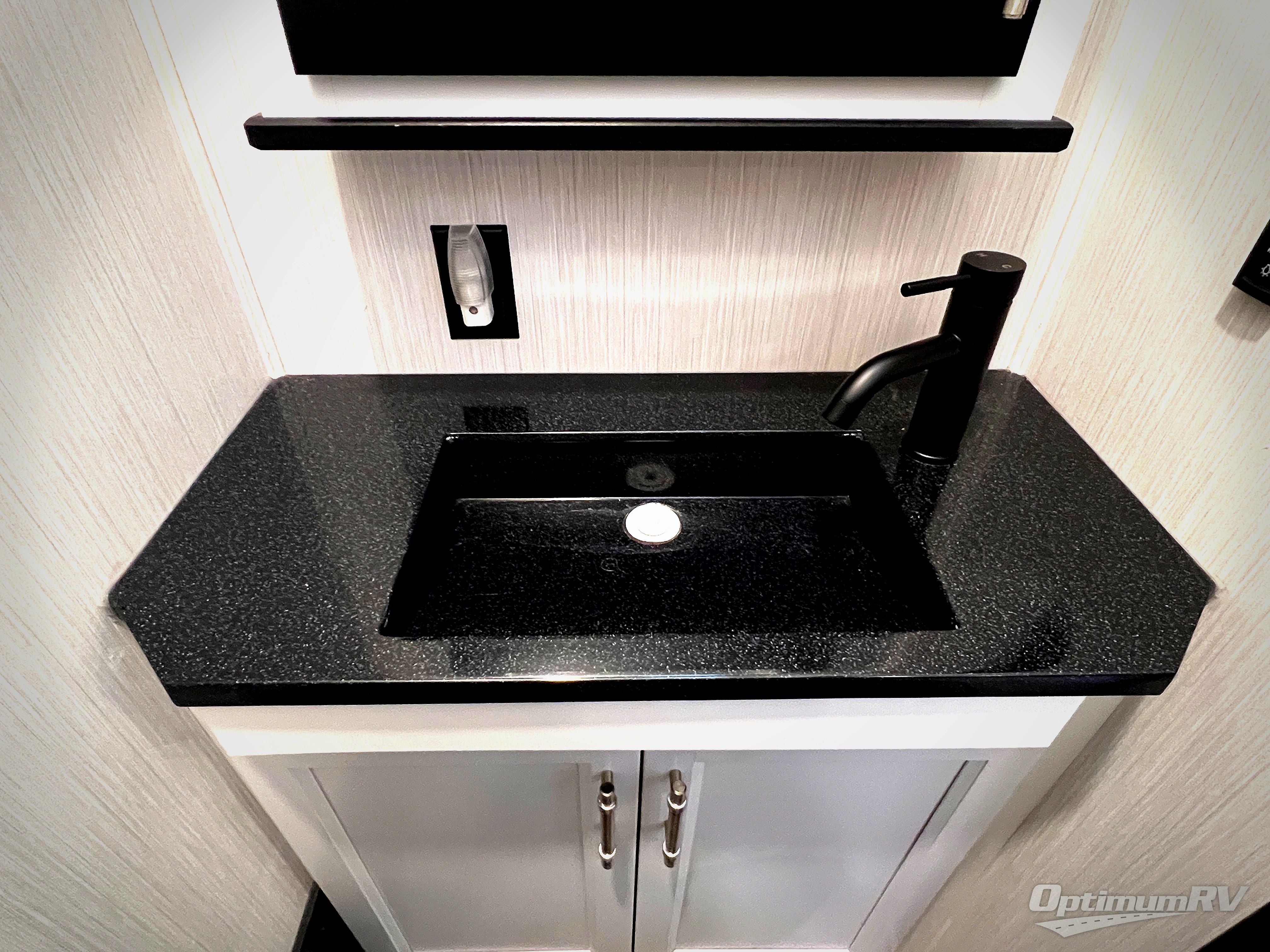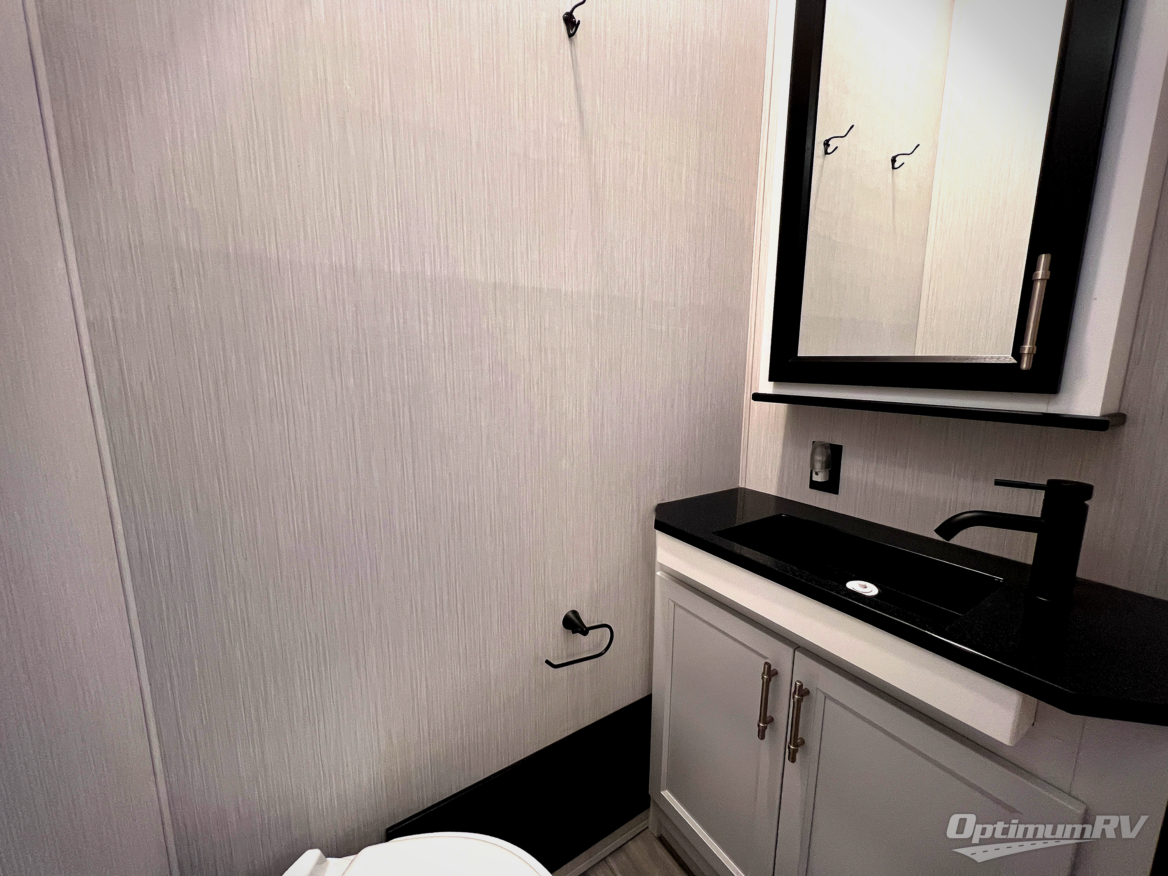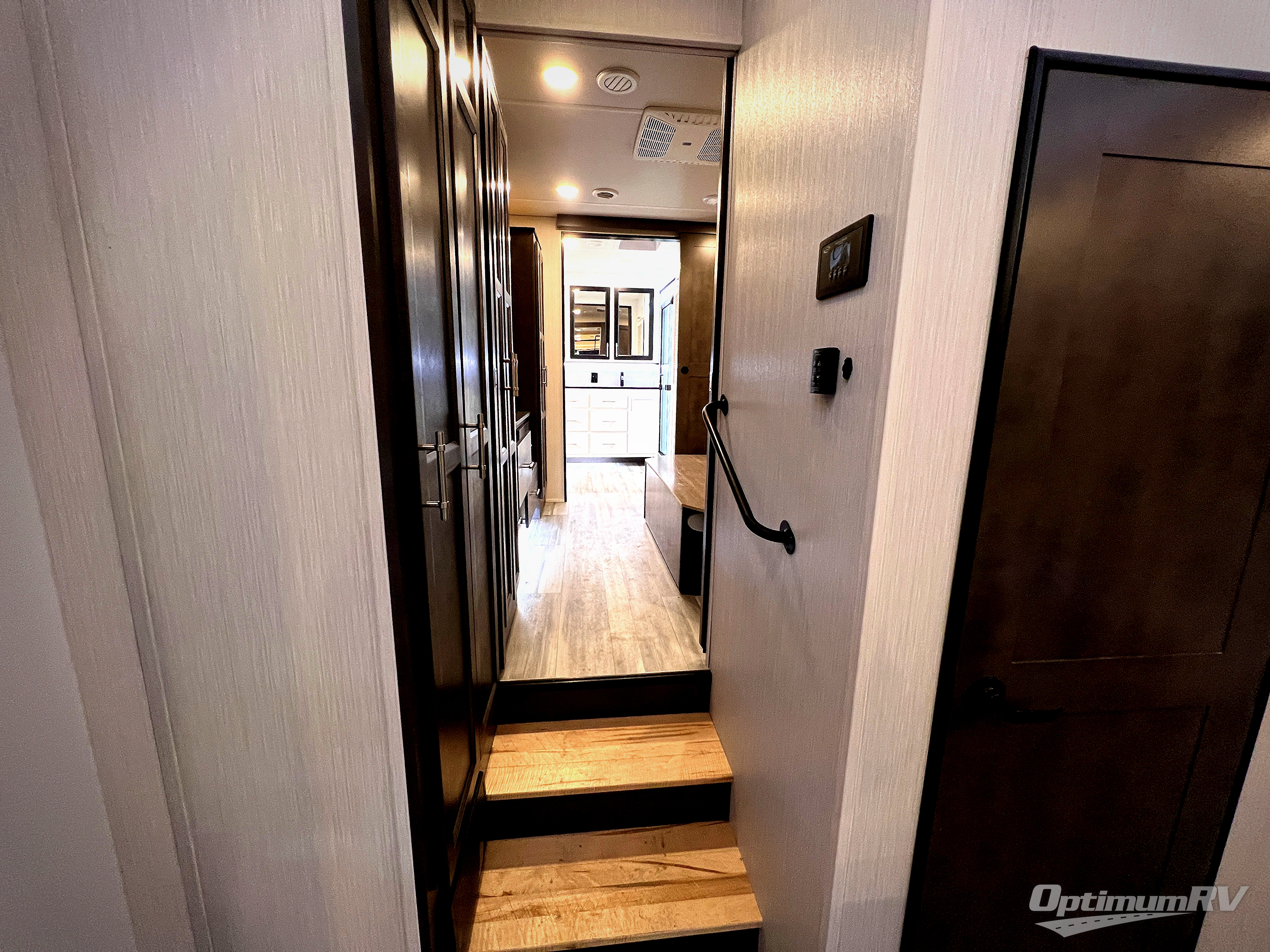 This fifth wheel has everything and then some! The front living area has opposing tri-fold sofas and power theater seating across from the front entertainment center with a fireplace and hidden telescoping TV. The chef can prepare their best meals with the kitchen island with a fold-down breakfast counter, and there is a 20 cu. ft. 12V refrigerator for food storage. Enjoy your meals and the extra space provided with the wall mounted dining table with an extension and an ottoman. The master suite has a king bed slide to lay your head at night and access to the full rear bathroom which has a shower with a seat, a linen closet, washer/dryer prep, and a dual sink vanity. You'll also find drop-down storage underneath the bath/bedroom so nothing gets left behind. And the convenient half bath can be traded out for an optional bonus pantry if you don't need the half bath!