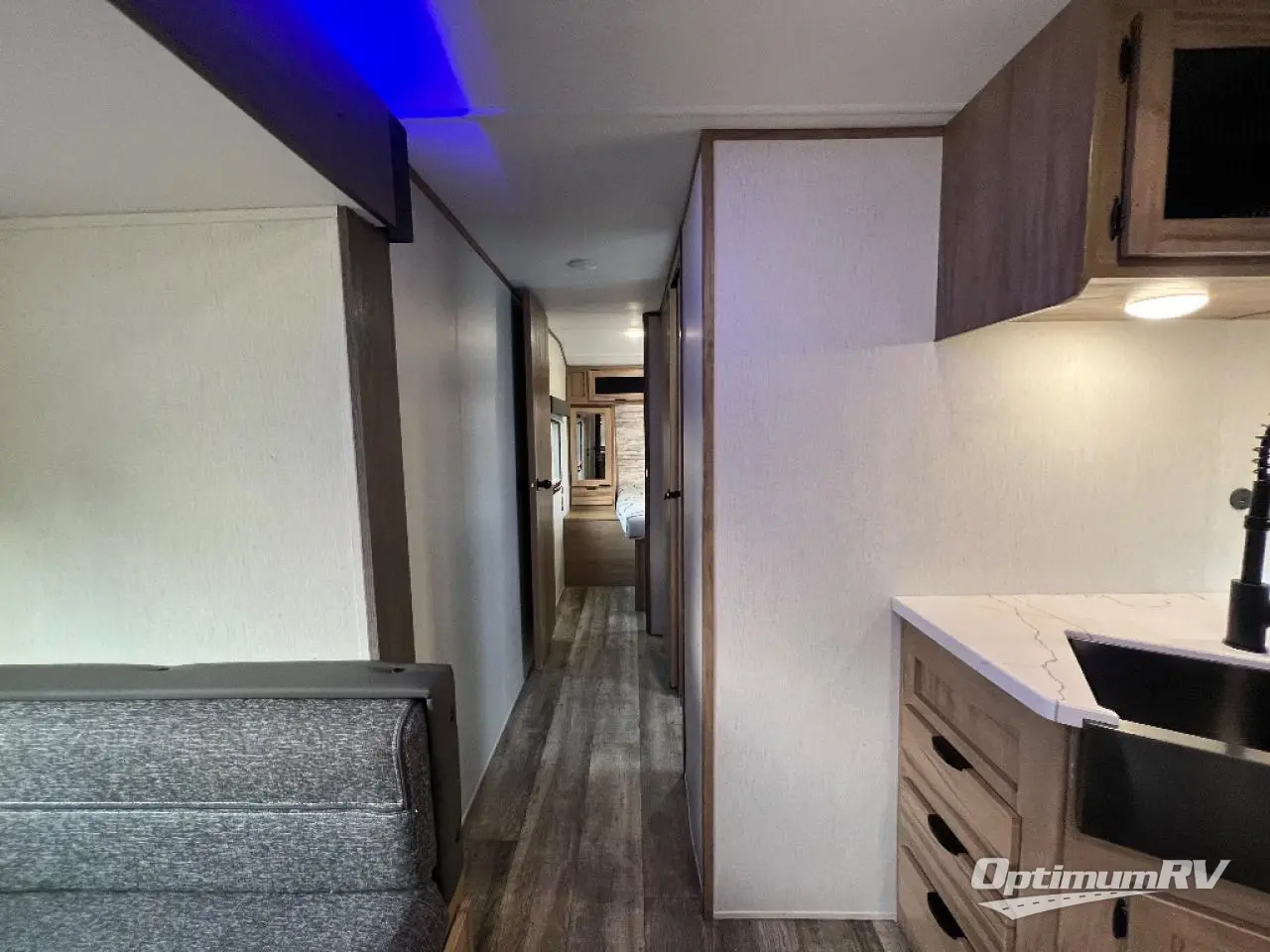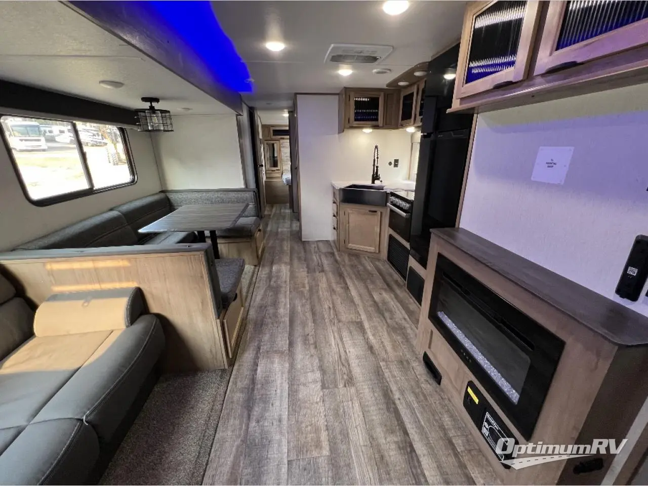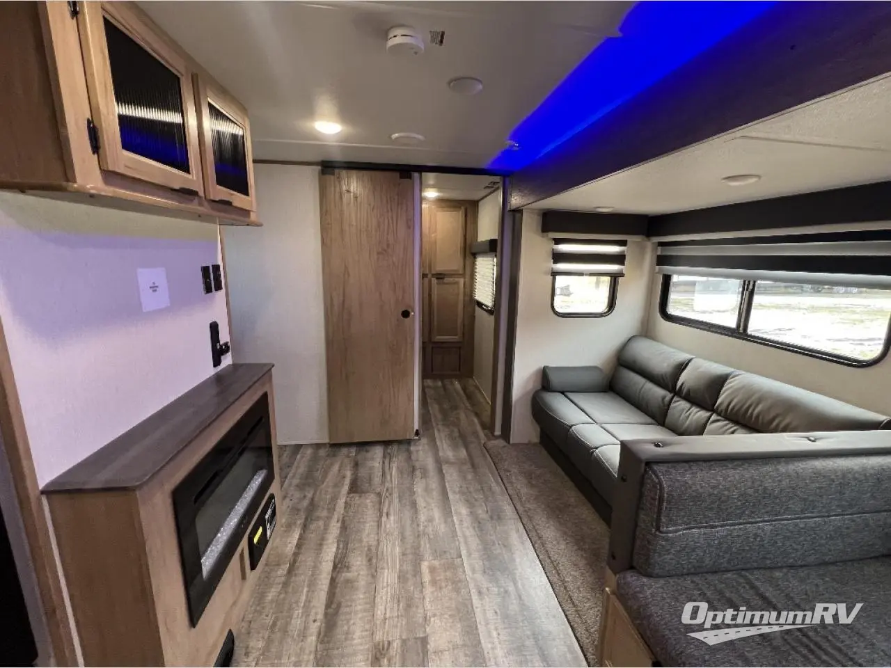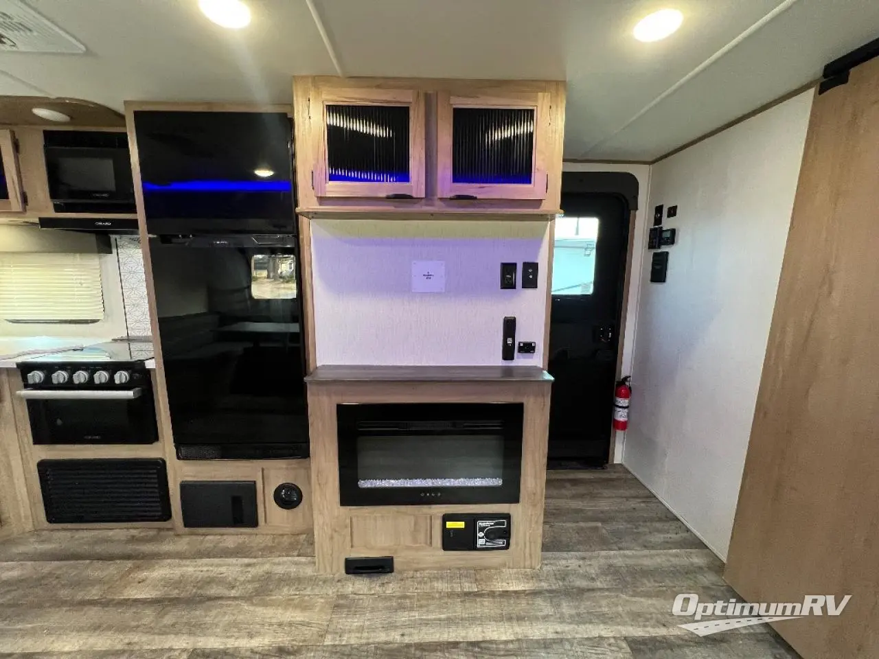 Privacy, convenience, comfort and a lot of space can be found in this travel trailer! The rear bunkhouse includes a barn-style door for easy entry, double-sized bunks with a ladder to sleep four, and a wardrobe for your clothes. You will have your own privacy in the front bedroom with a walk-around queen bed, dual shirt closets and nightstands, plus easy access to the dual-entry bath. The main living and kitchen area has an L-shaped kitchen area with everything nearby including a farm-style sink, a 12V residential refrigerator, and a walk-in pantry. You can relax at the jack knife sofa and U-shaped dinette within the slide out and enjoy the fireplace or the window views in the slide.
