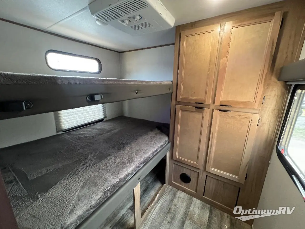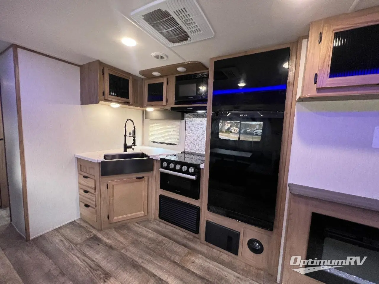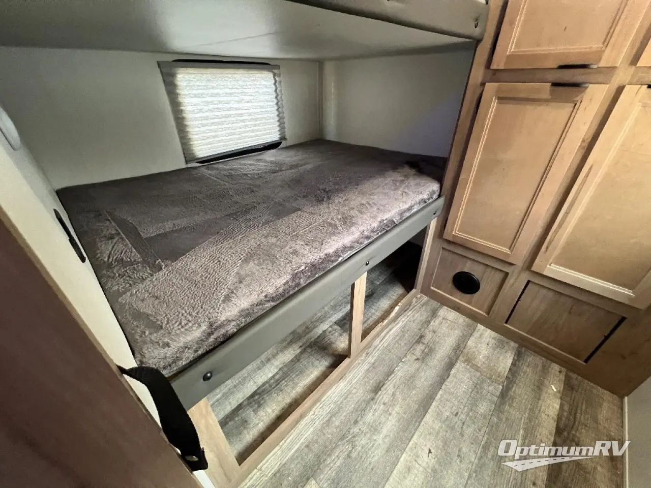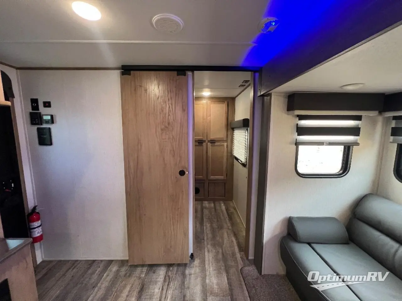Privacy, convenience, comfort and a lot of space can be found in this travel trailer! The rear bunkhouse includes a barn-style door for easy entry, double-sized bunks with a ladder to sleep four, and a wardrobe for your clothes. You will have your own privacy in the front bedroom with a walk-around queen bed, dual shirt closets and nightstands, plus easy access to the dual-entry bath. The main living and kitchen area has an L-shaped kitchen area with everything nearby including a farm-style sink, a 12V residential refrigerator, and a walk-in pantry. You can relax at the jack knife sofa and U-shaped dinette within the slide out and enjoy the fireplace or the window views in the slide.