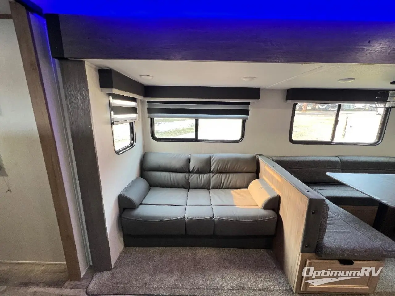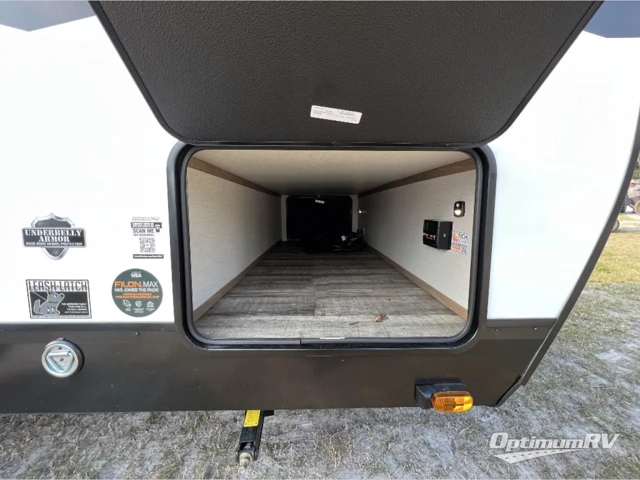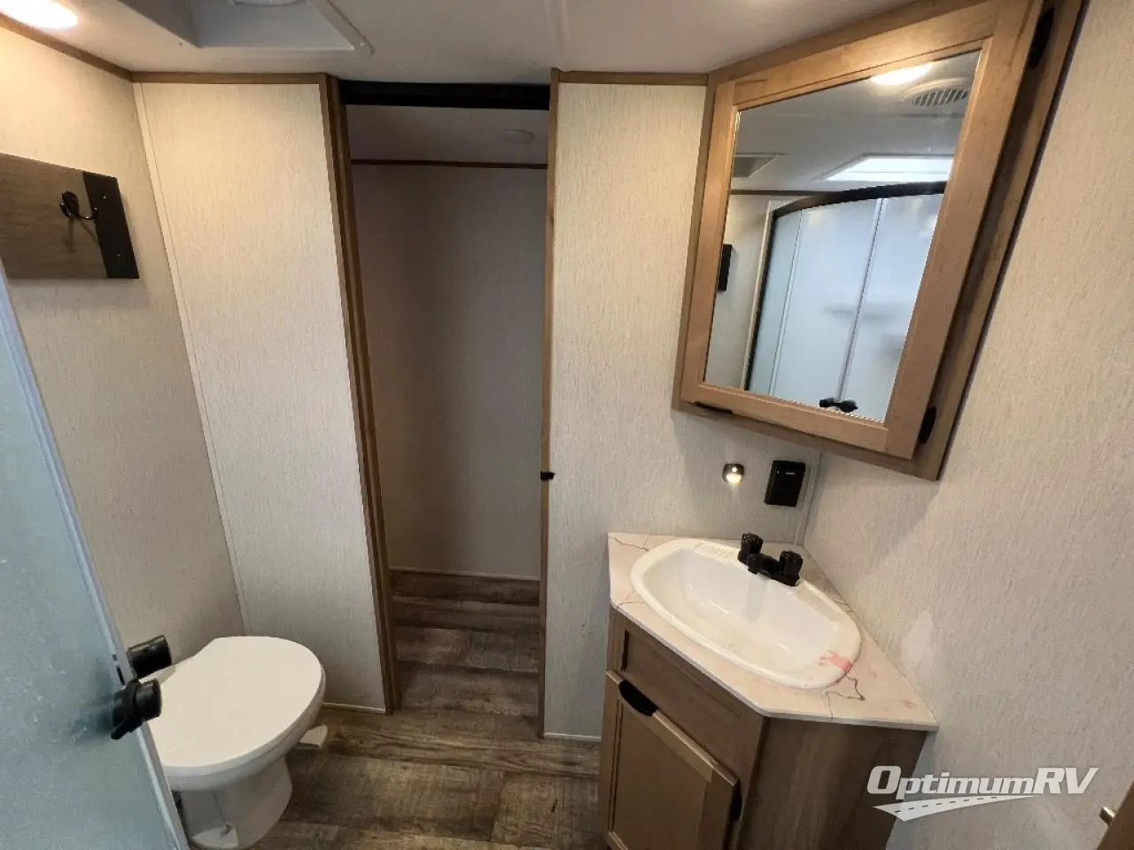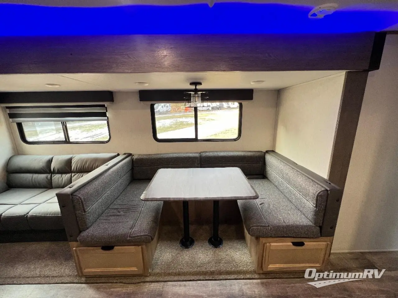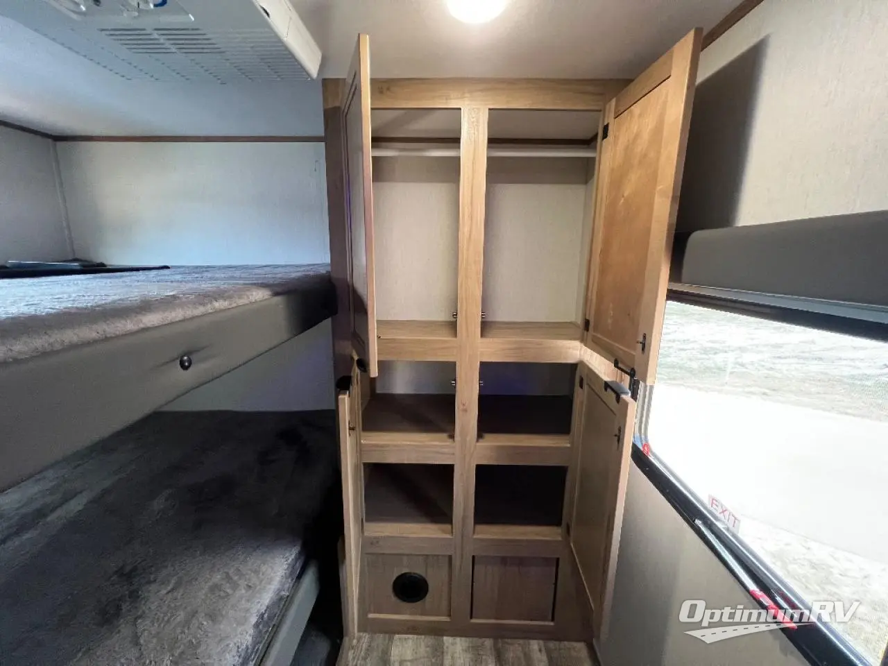 Privacy, convenience, comfort and a lot of space can be found in this travel trailer! The rear bunkhouse includes a barn-style door for easy entry, double-sized bunks with a ladder to sleep four, and a wardrobe for your clothes. You will have your own privacy in the front bedroom with a walk-around queen bed, dual shirt closets and nightstands, plus easy access to the dual-entry bath. The main living and kitchen area has an L-shaped kitchen area with everything nearby including a farm-style sink, a 12V residential refrigerator, and a walk-in pantry. You can relax at the jack knife sofa and U-shaped dinette within the slide out and enjoy the fireplace or the window views in the slide.