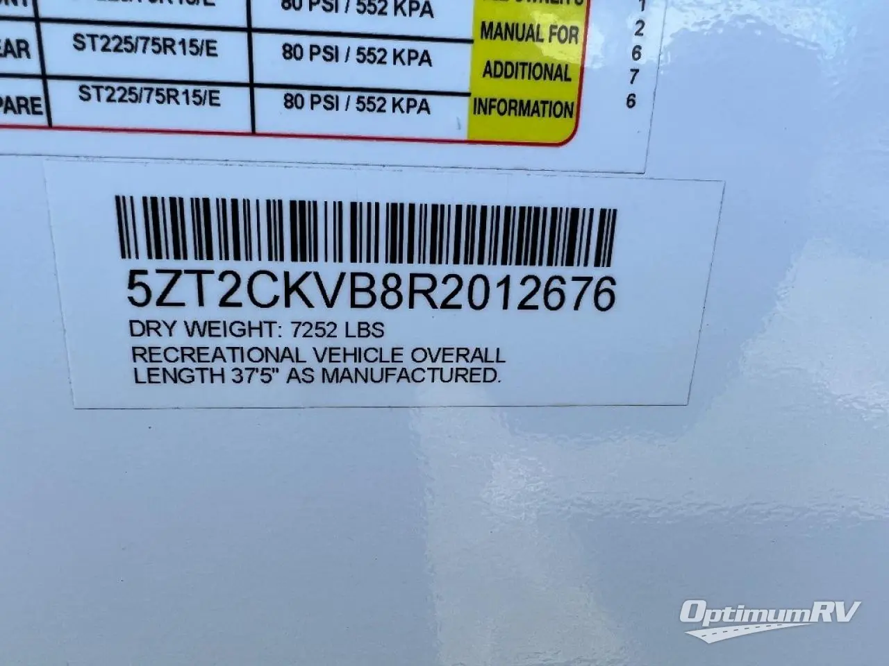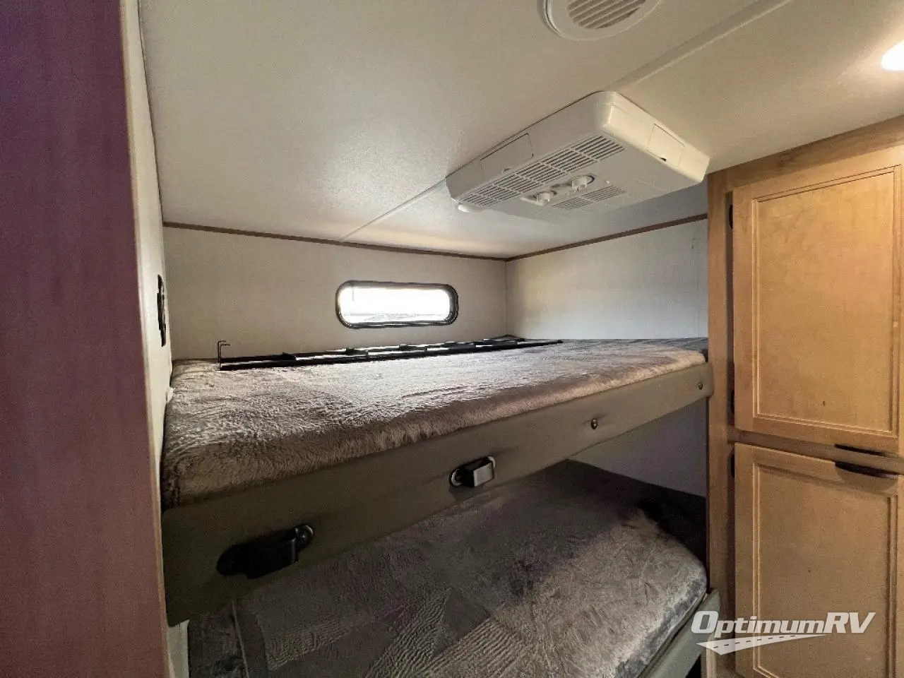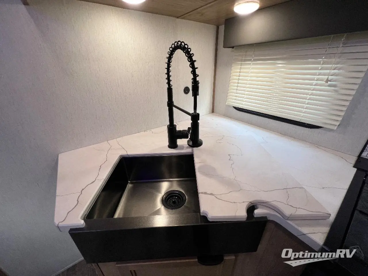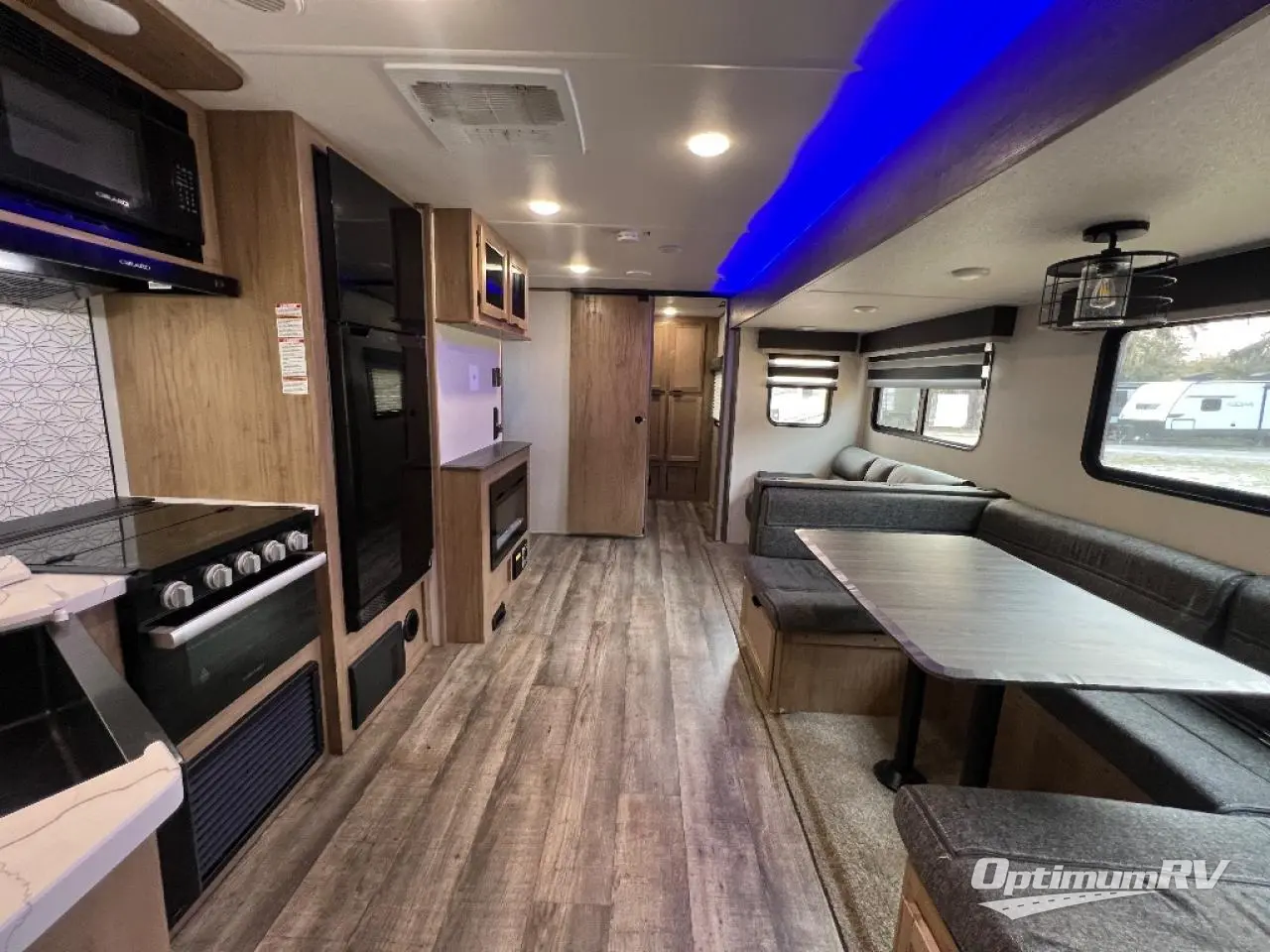 Privacy, convenience, comfort and a lot of space can be found in this travel trailer! The rear bunkhouse includes a barn-style door for easy entry, double-sized bunks with a ladder to sleep four, and a wardrobe for your clothes. You will have your own privacy in the front bedroom with a walk-around queen bed, dual shirt closets and nightstands, plus easy access to the dual-entry bath. The main living and kitchen area has an L-shaped kitchen area with everything nearby including a farm-style sink, a 12V residential refrigerator, and a walk-in pantry. You can relax at the jack knife sofa and U-shaped dinette within the slide out and enjoy the fireplace or the window views in the slide.