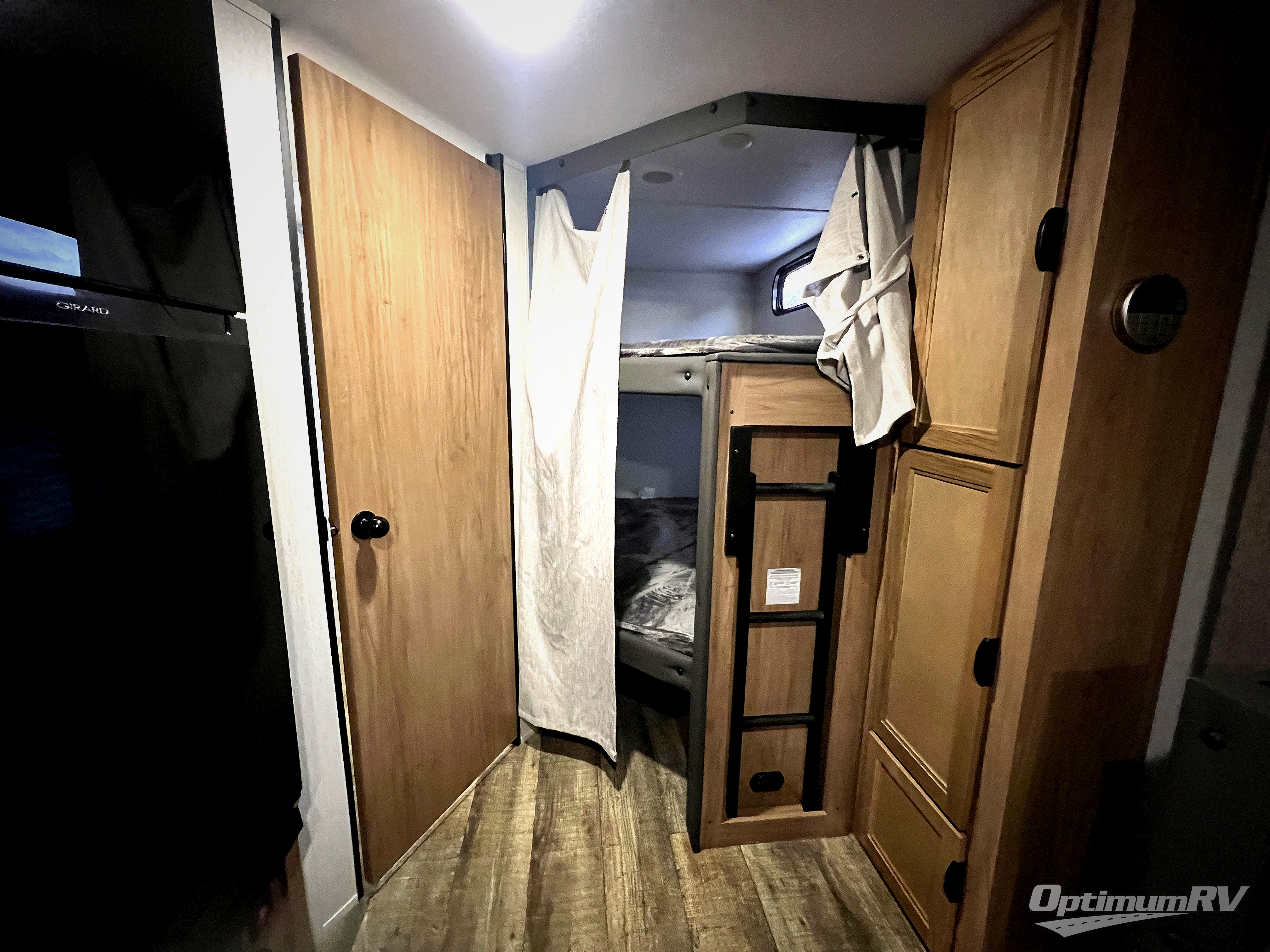 You will love the space provided in this dual entry Cherokee Grey Wolf travel trailer that has double-size bunks! The rear entry door leads right into the full bath allowing easy access from outside when you need to use the bathroom while you're enjoying the great outdoors. The large U-shaped dinette slide will not only seat everyone comfortably for a meal or a game, but since it also slides out, it opens up the interior even more to give you plenty of space for foot traffic. For all of your outdoor gear, you will find the outside storage compartments handy for stowing away your things when not in use. While the kids enjoy their bunk beds, you will enjoy a good night's rest in your queen bed with wardrobes on either side up in the front private bedroom!