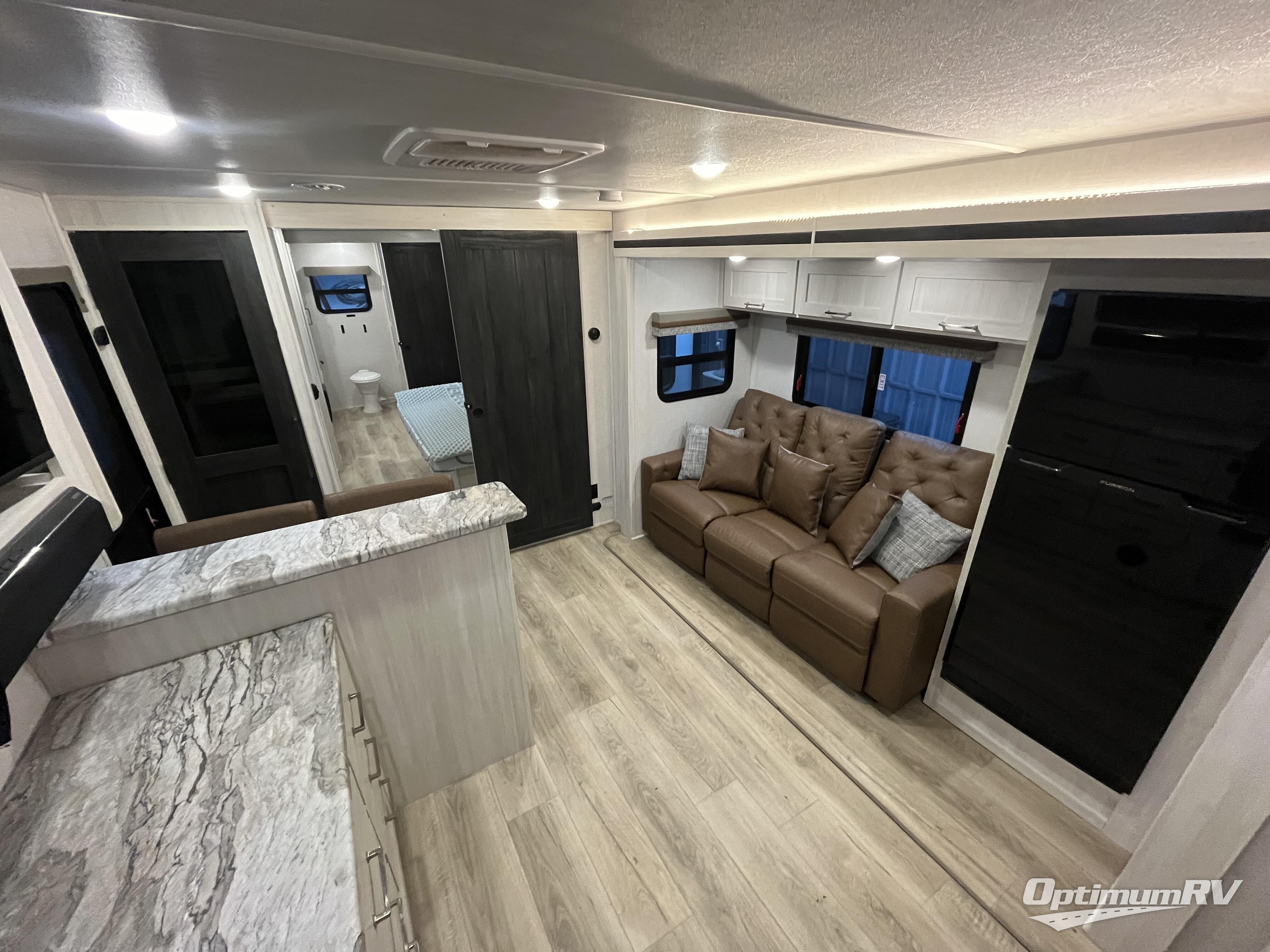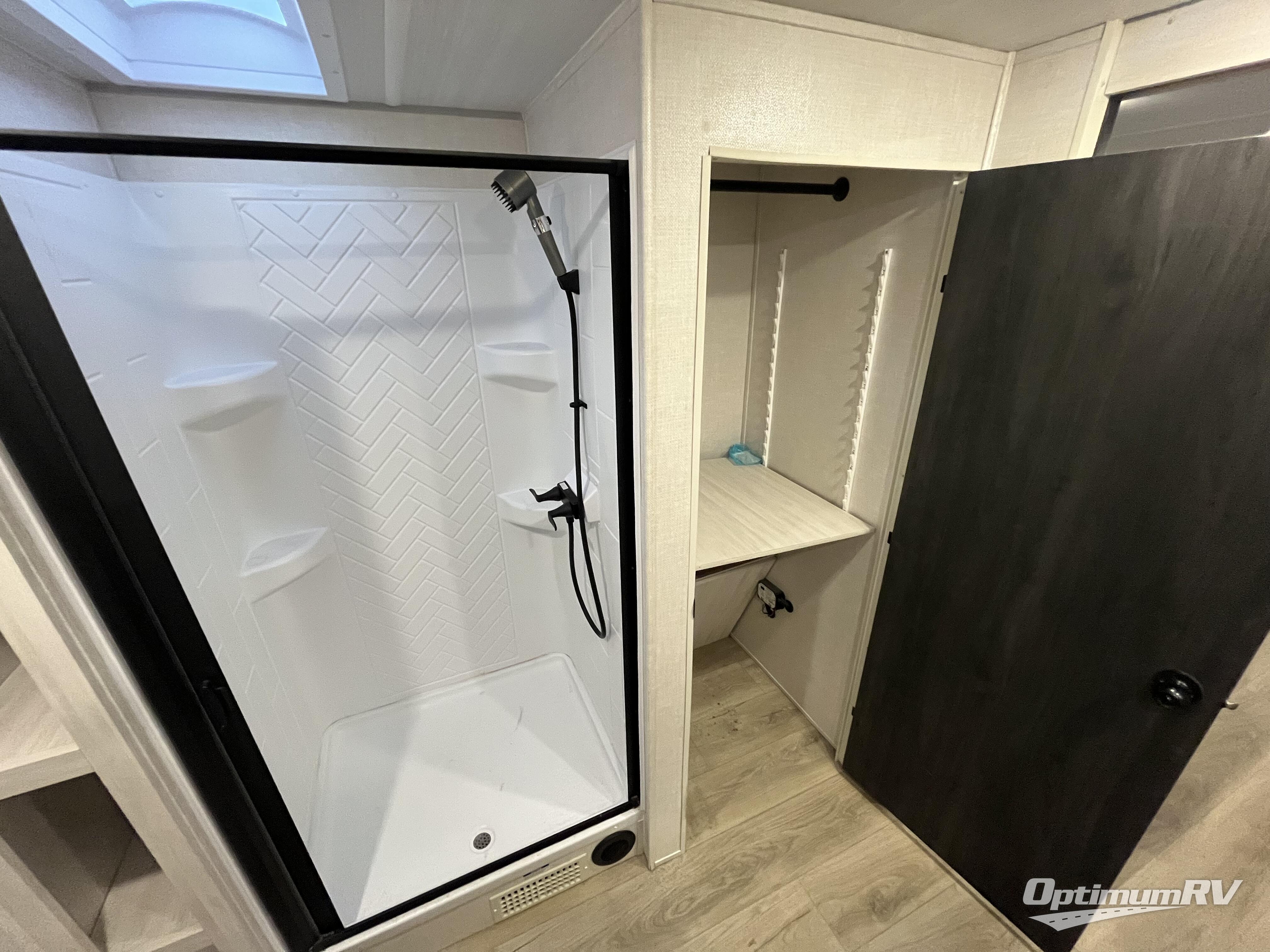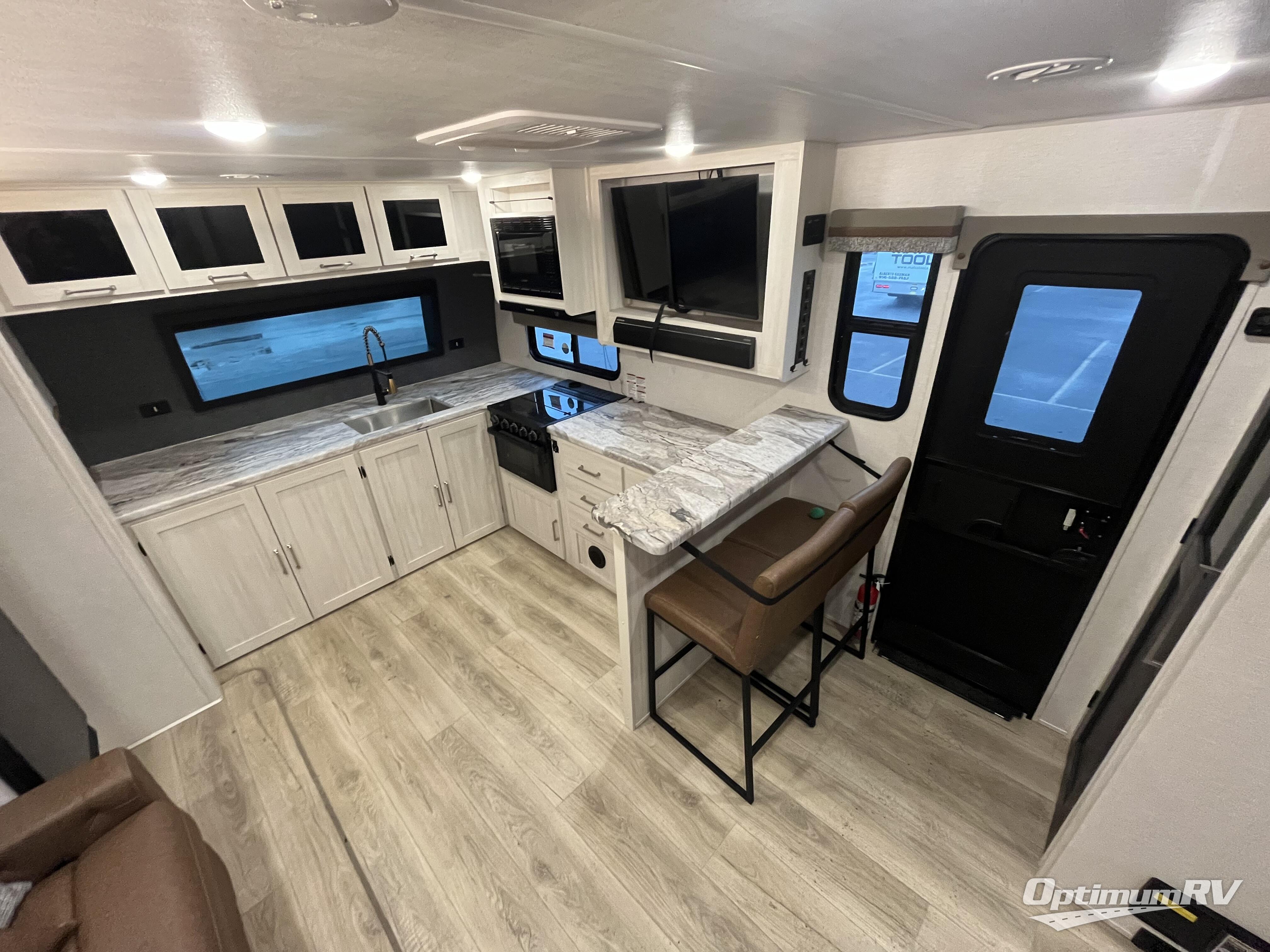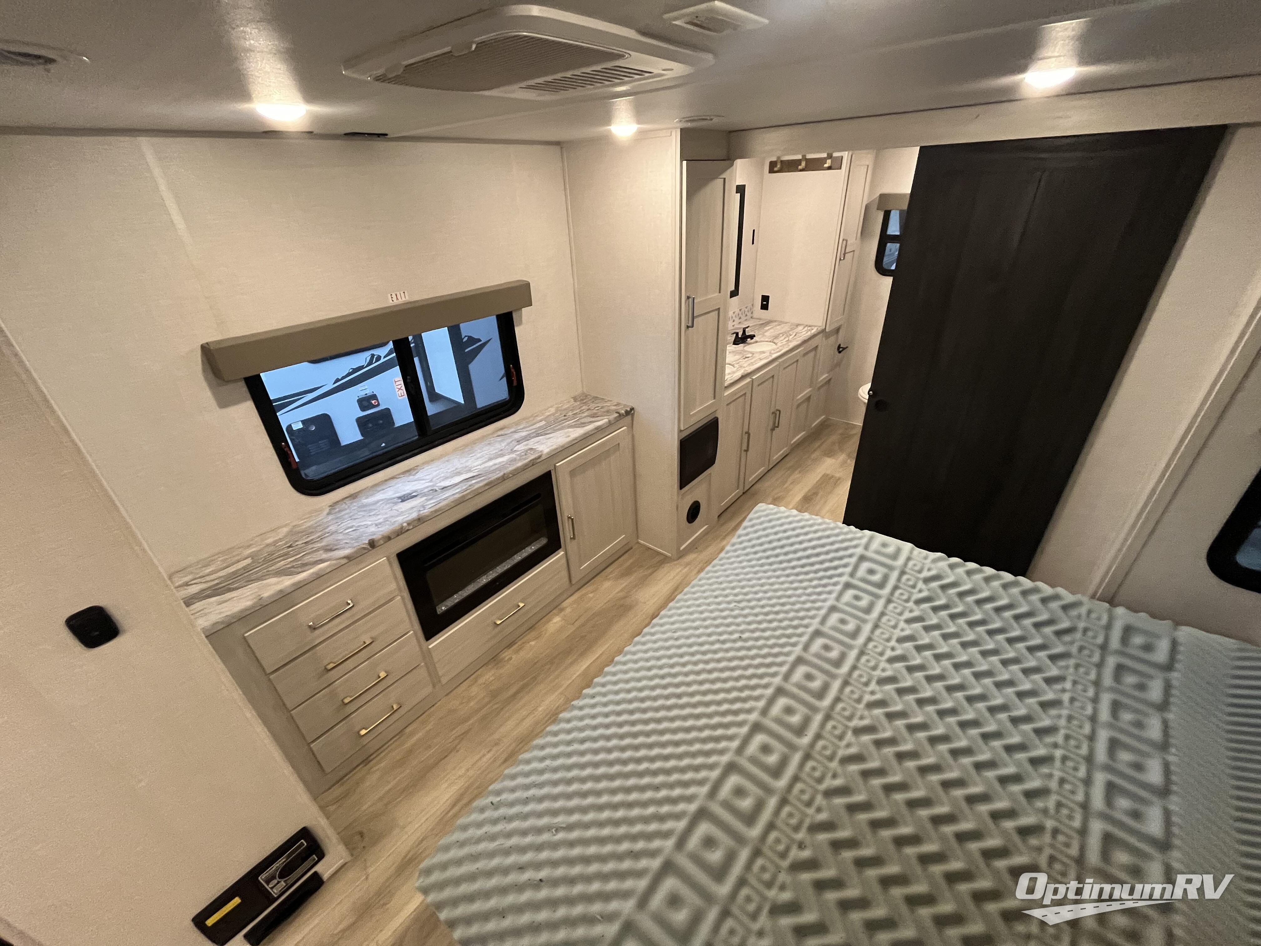 This couple's trailer will be giving you all the glamping vibes! There is a front kitchen with ample counter space, along with a counter with two bar stools, a central vacuum to easily clean up, and a slide out for more space! The second slide out is found in the middle master bedroom where you'll also enjoy a custom king bed across from a bedroom fireplace, a wardrobe, and a dresser with TV prep. Head towards the back and you'll be wowed by the full bath with dual bath sinks, an upgraded slow-close shower door, and a closet with washer and dryer prep. The exterior is just as impressive as the interior with its outside kitchen, 20' power awning with LED lights, pass-through storage, TV coax, and so much more!