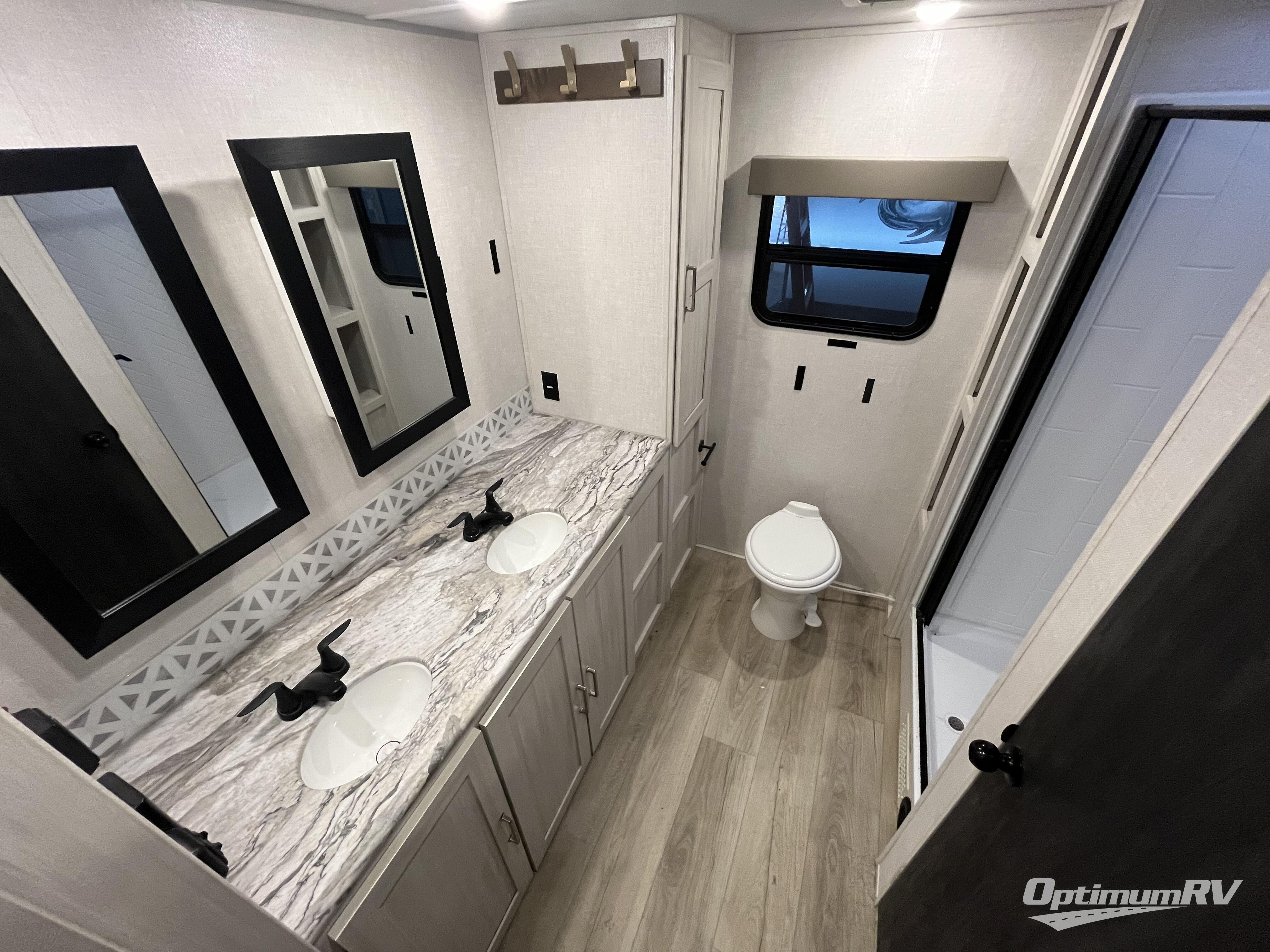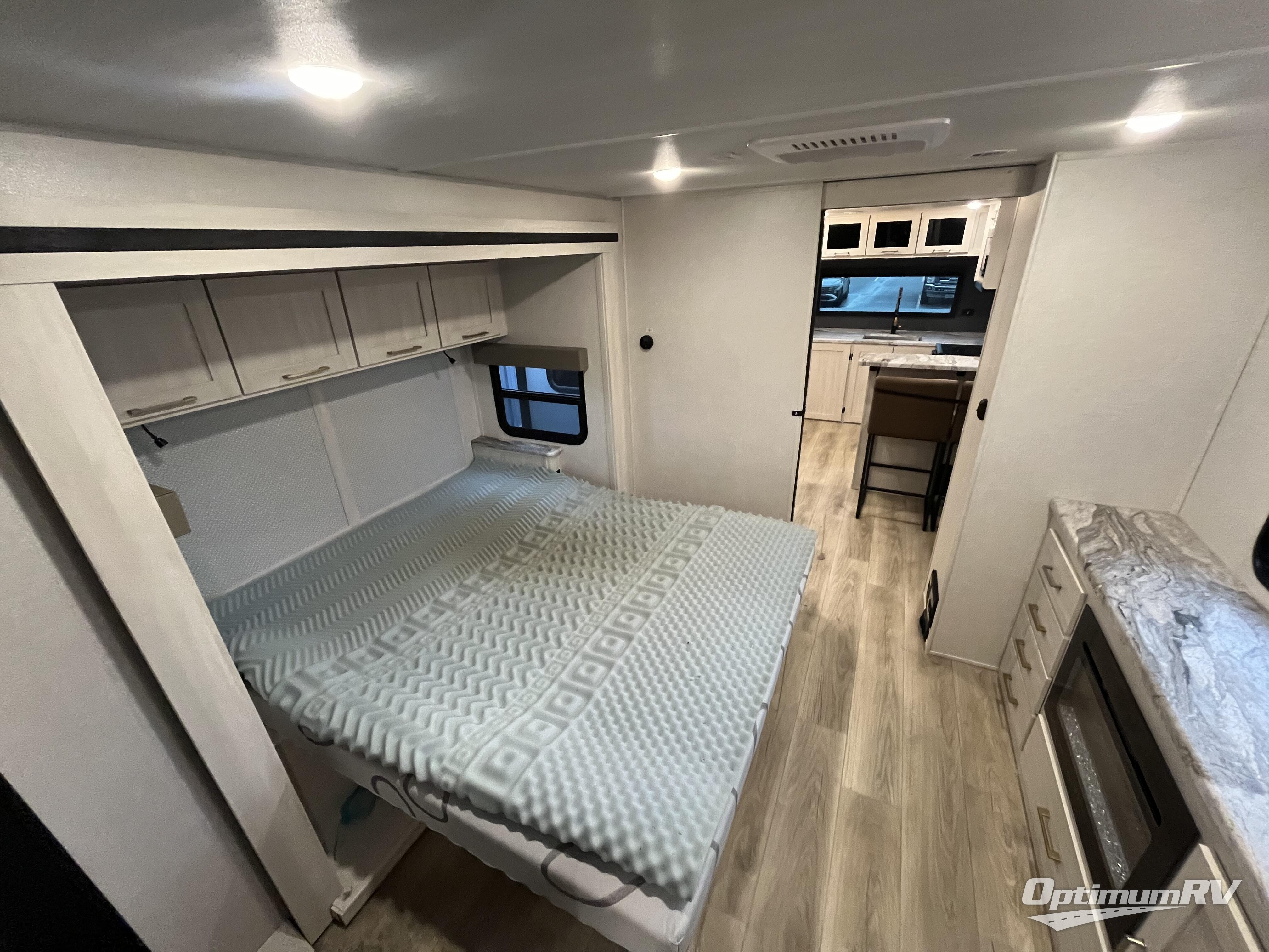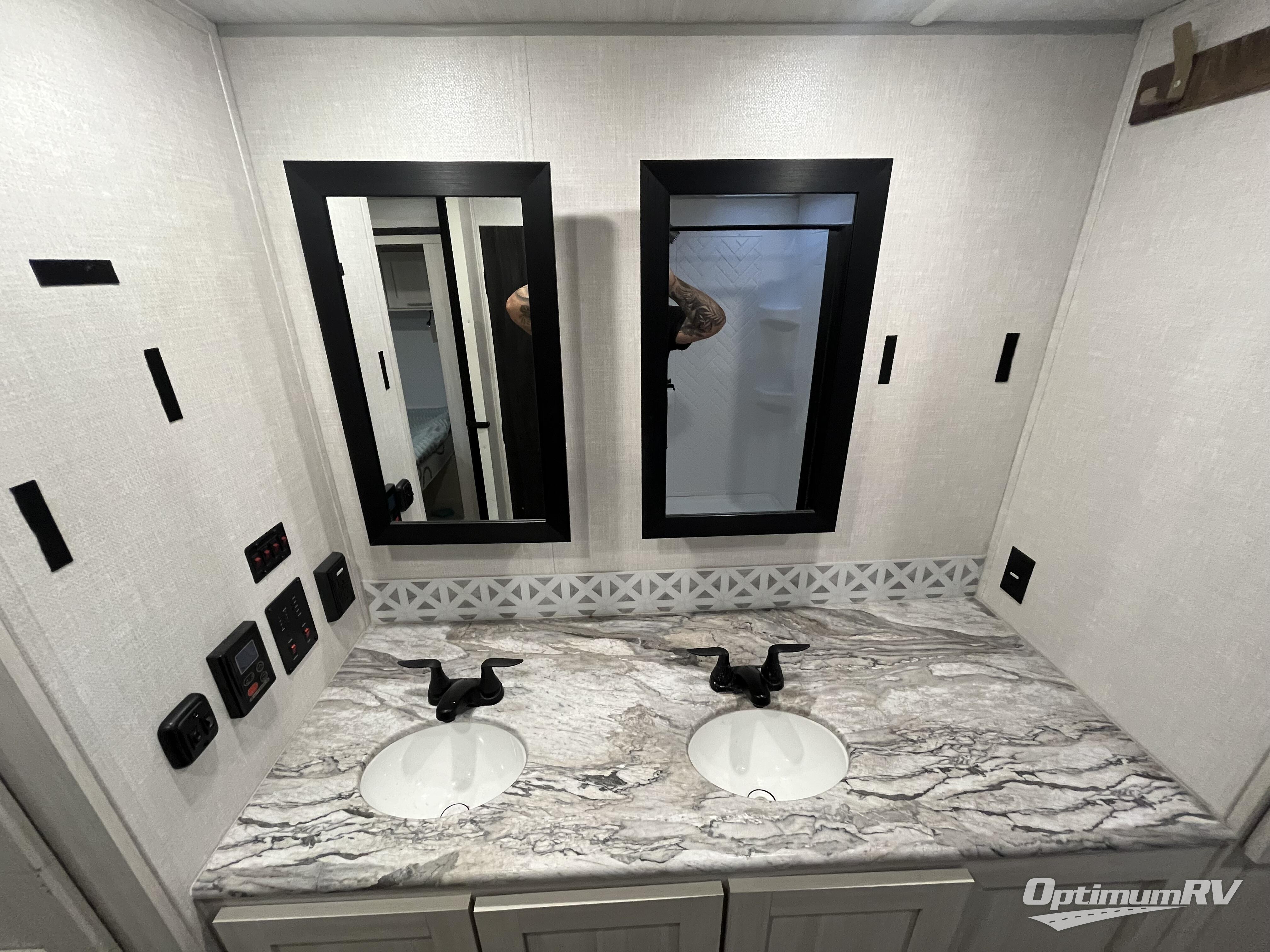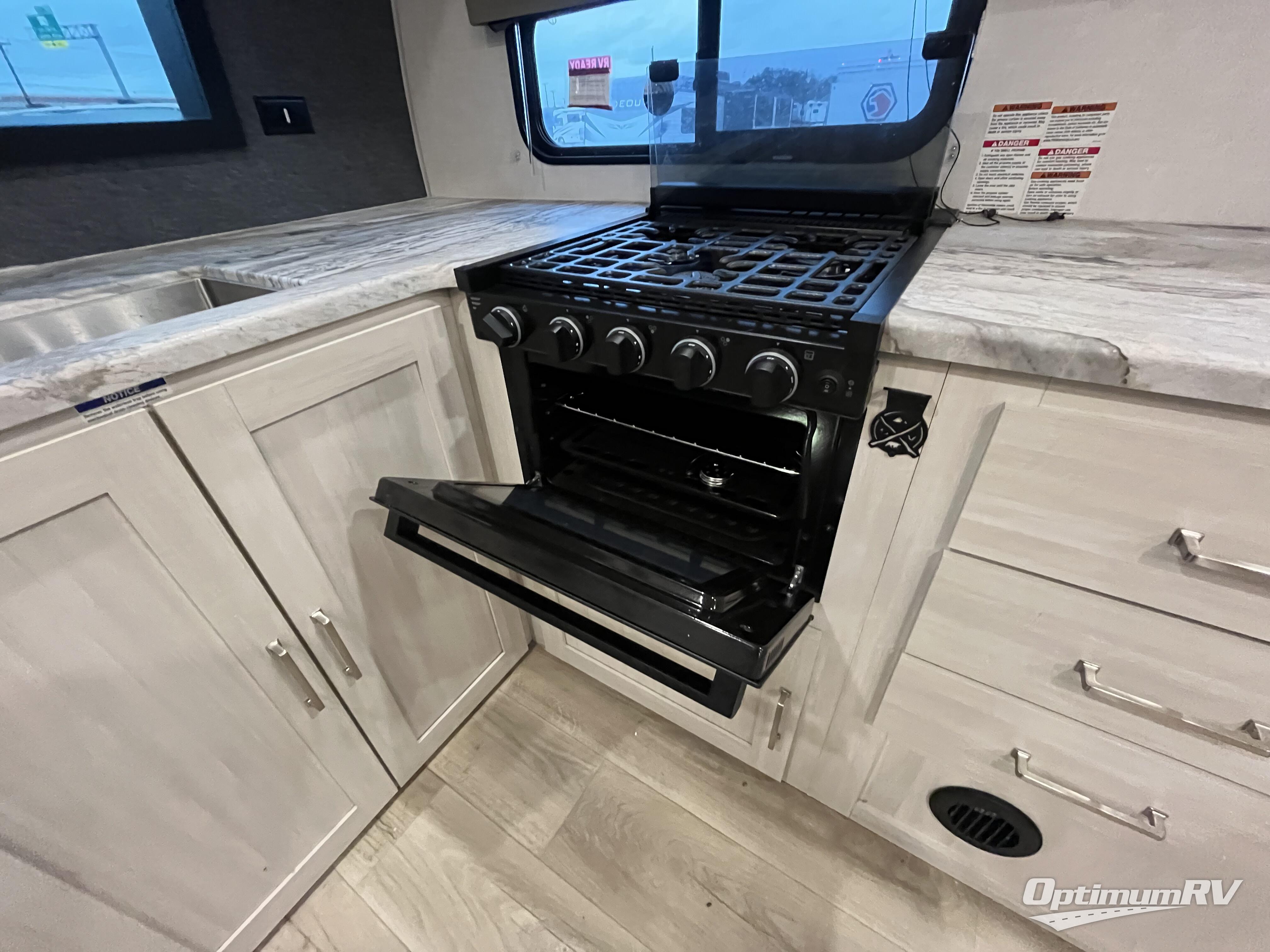 This couple's trailer will be giving you all the glamping vibes! There is a front kitchen with ample counter space, along with a counter with two bar stools, a central vacuum to easily clean up, and a slide out for more space! The second slide out is found in the middle master bedroom where you'll also enjoy a custom king bed across from a bedroom fireplace, a wardrobe, and a dresser with TV prep. Head towards the back and you'll be wowed by the full bath with dual bath sinks, an upgraded slow-close shower door, and a closet with washer and dryer prep. The exterior is just as impressive as the interior with its outside kitchen, 20' power awning with LED lights, pass-through storage, TV coax, and so much more!