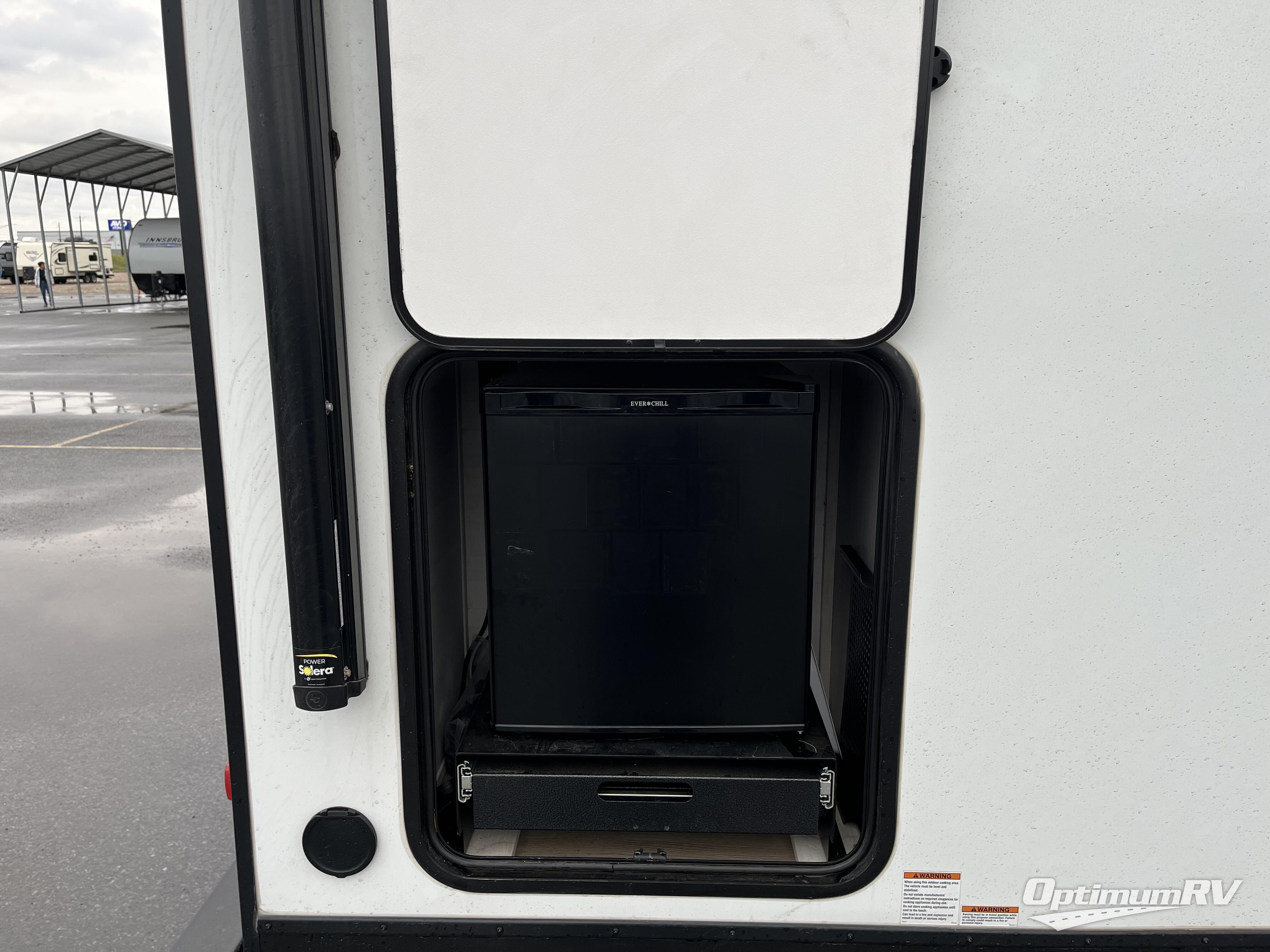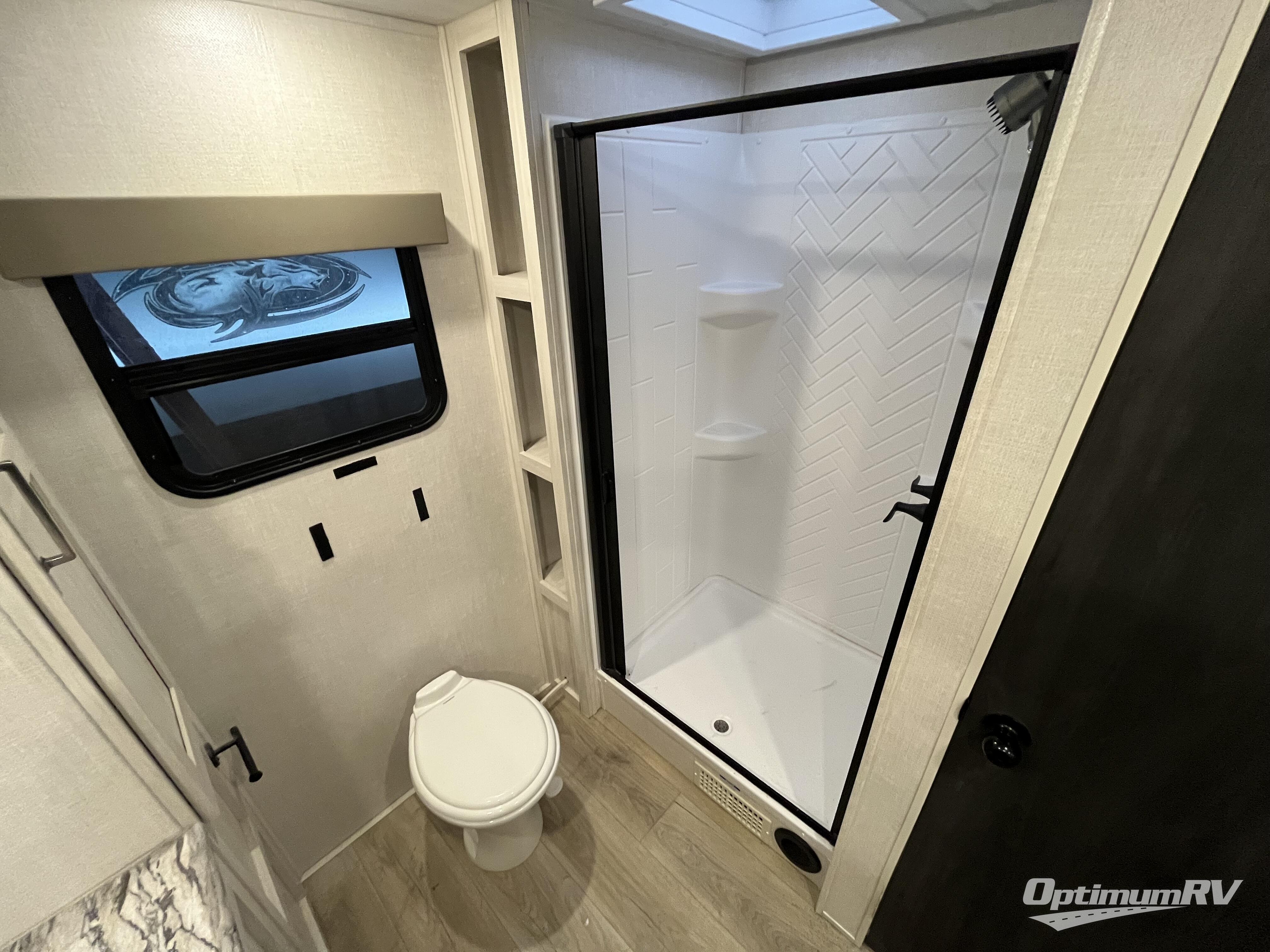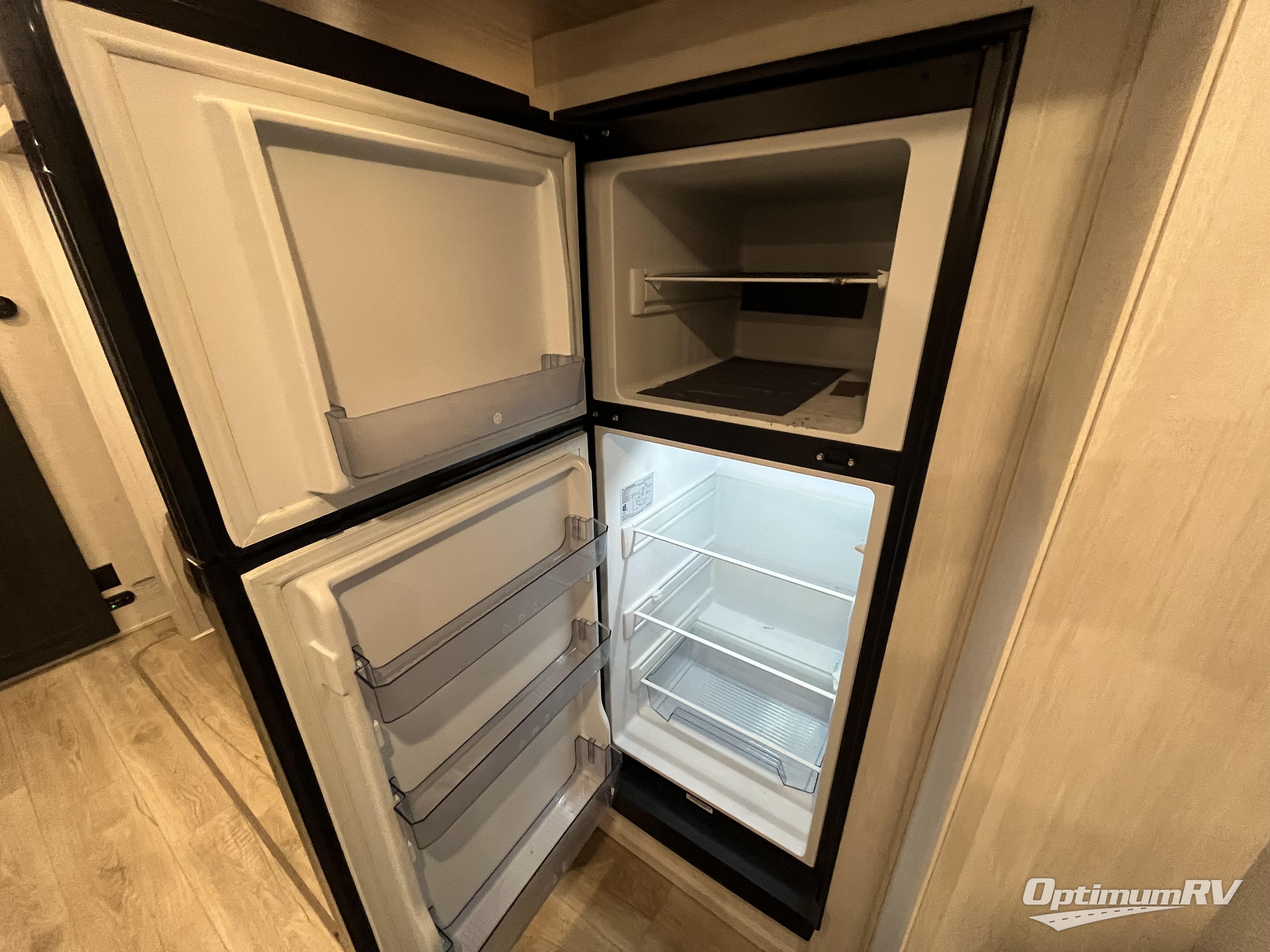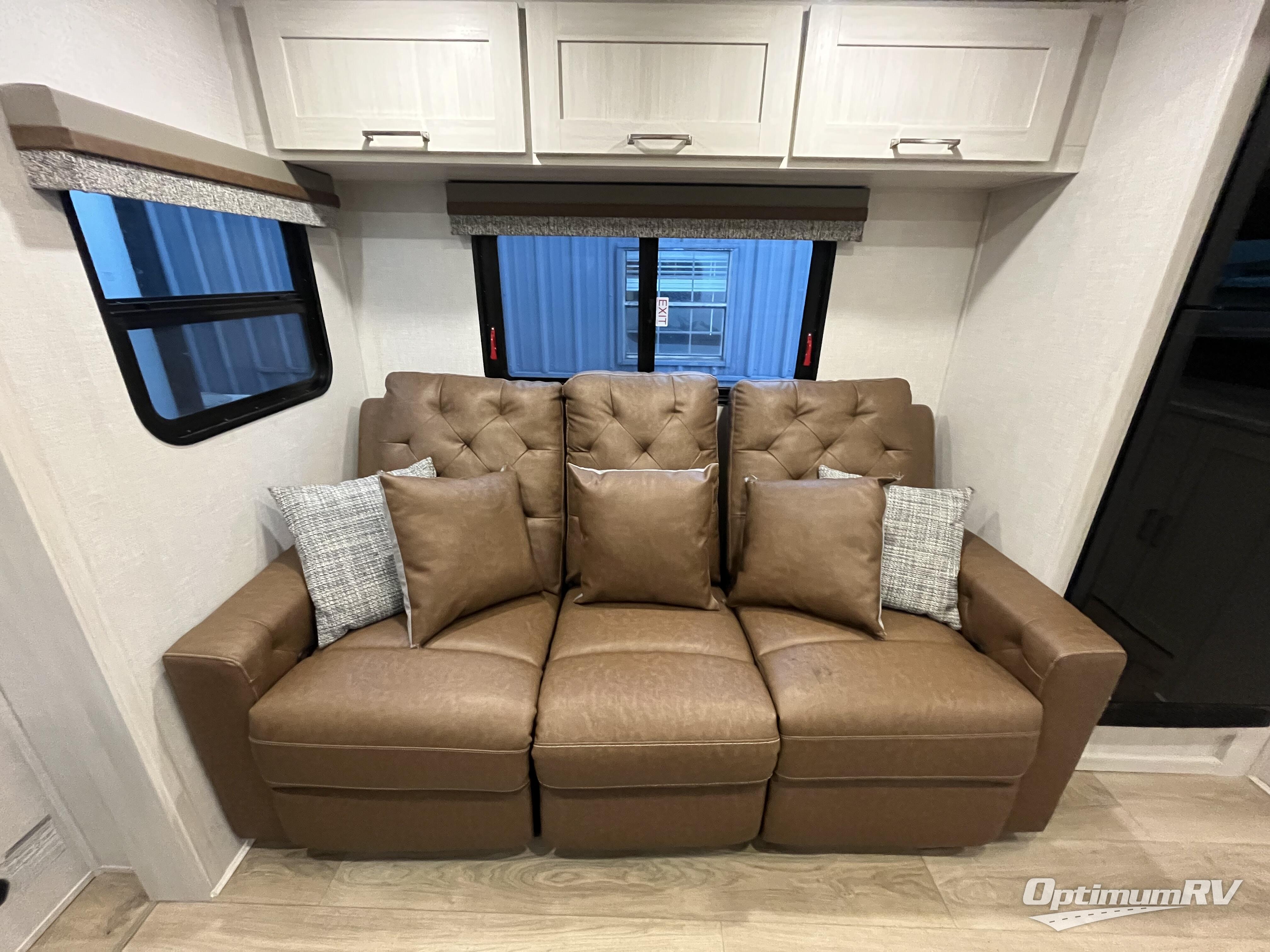 This couple's trailer will be giving you all the glamping vibes! There is a front kitchen with ample counter space, along with a counter with two bar stools, a central vacuum to easily clean up, and a slide out for more space! The second slide out is found in the middle master bedroom where you'll also enjoy a custom king bed across from a bedroom fireplace, a wardrobe, and a dresser with TV prep. Head towards the back and you'll be wowed by the full bath with dual bath sinks, an upgraded slow-close shower door, and a closet with washer and dryer prep. The exterior is just as impressive as the interior with its outside kitchen, 20' power awning with LED lights, pass-through storage, TV coax, and so much more!