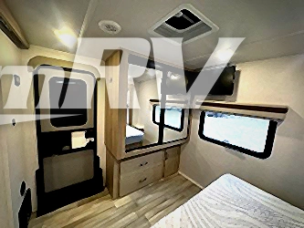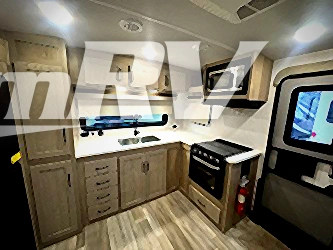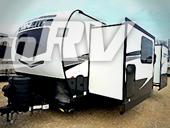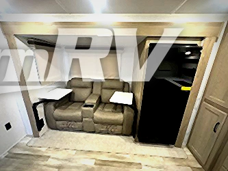 Escape the city life for weekend trips in this cozy couple's trailer. The dual entry doors will allow you to enter in through the rear private bedroom, or the front kitchen/main living area for convenience. You will enjoy relaxing on the theater seating across from the LED TV and fireplace in the evenings, or you can visit outdoors under the 19' power awning. You'll also find an exterior griddle here for quick meals and exterior storage for the fishing poles or hiking gear. This model also includes a walk-through bath with a shower skylight, a linen closet, plus a Showermiser Water Saving System. And don't worry about storage space inside since this model includes an entryway pantry/closet, a second pantry in the front kitchen, plus a large bedroom wardrobe to keep your clothes wrinkle-free!