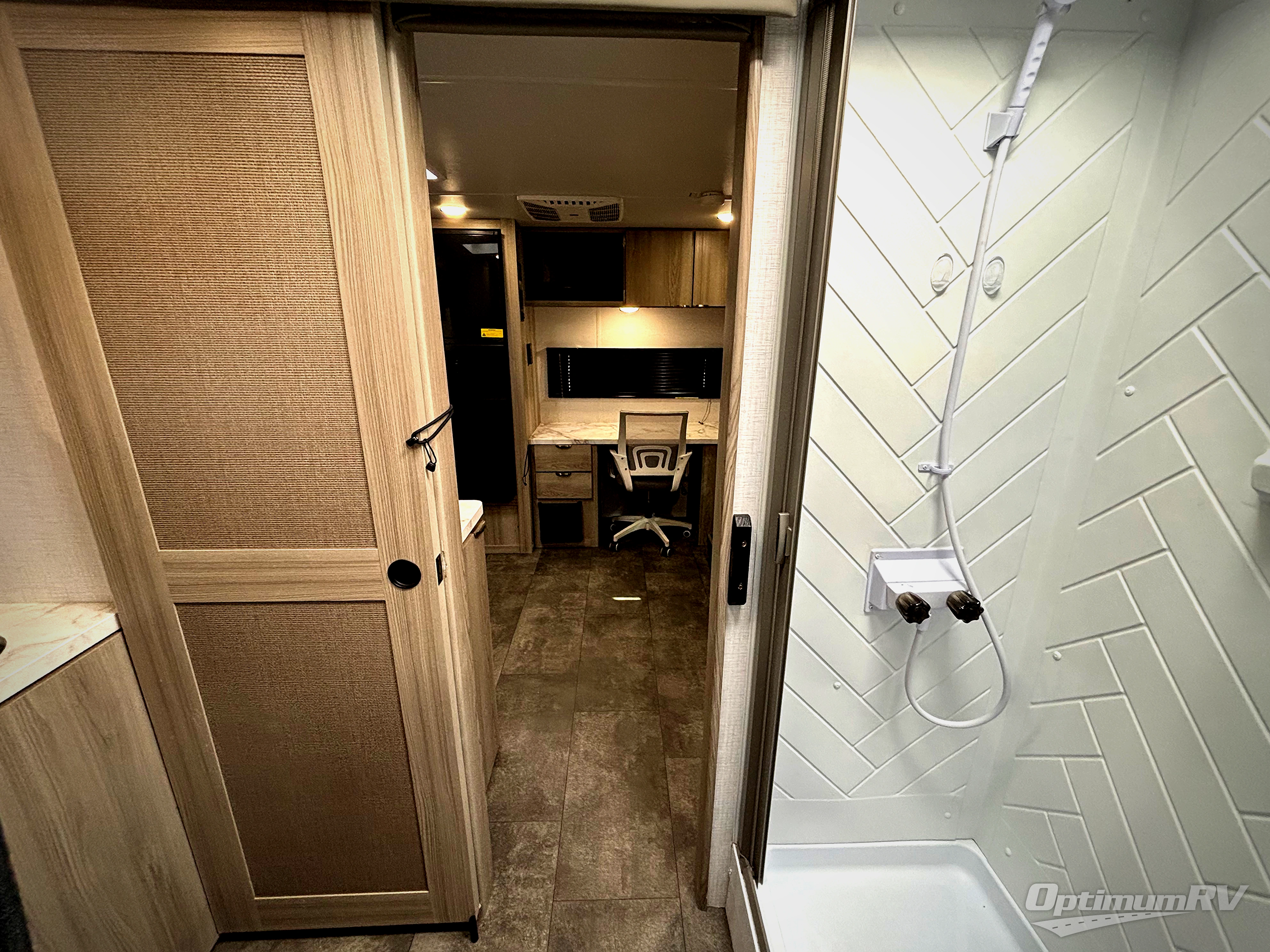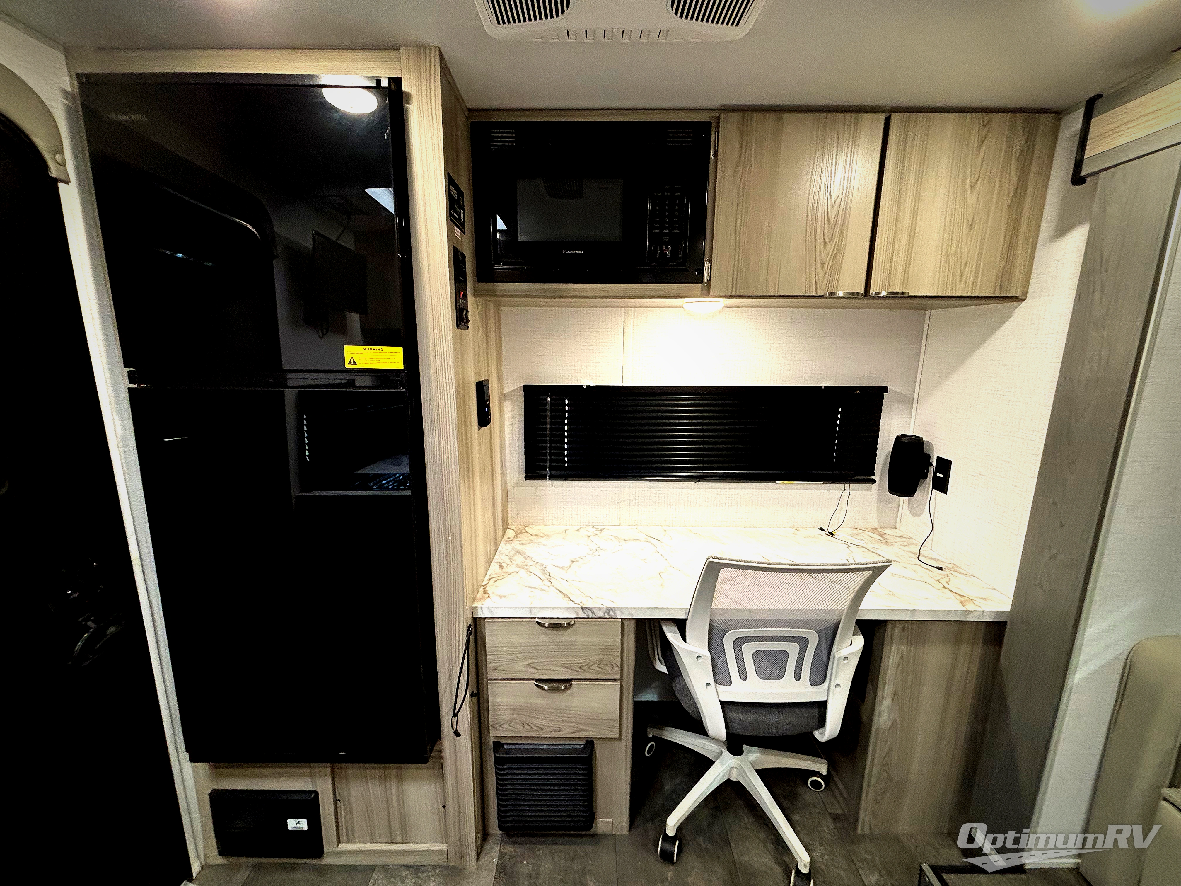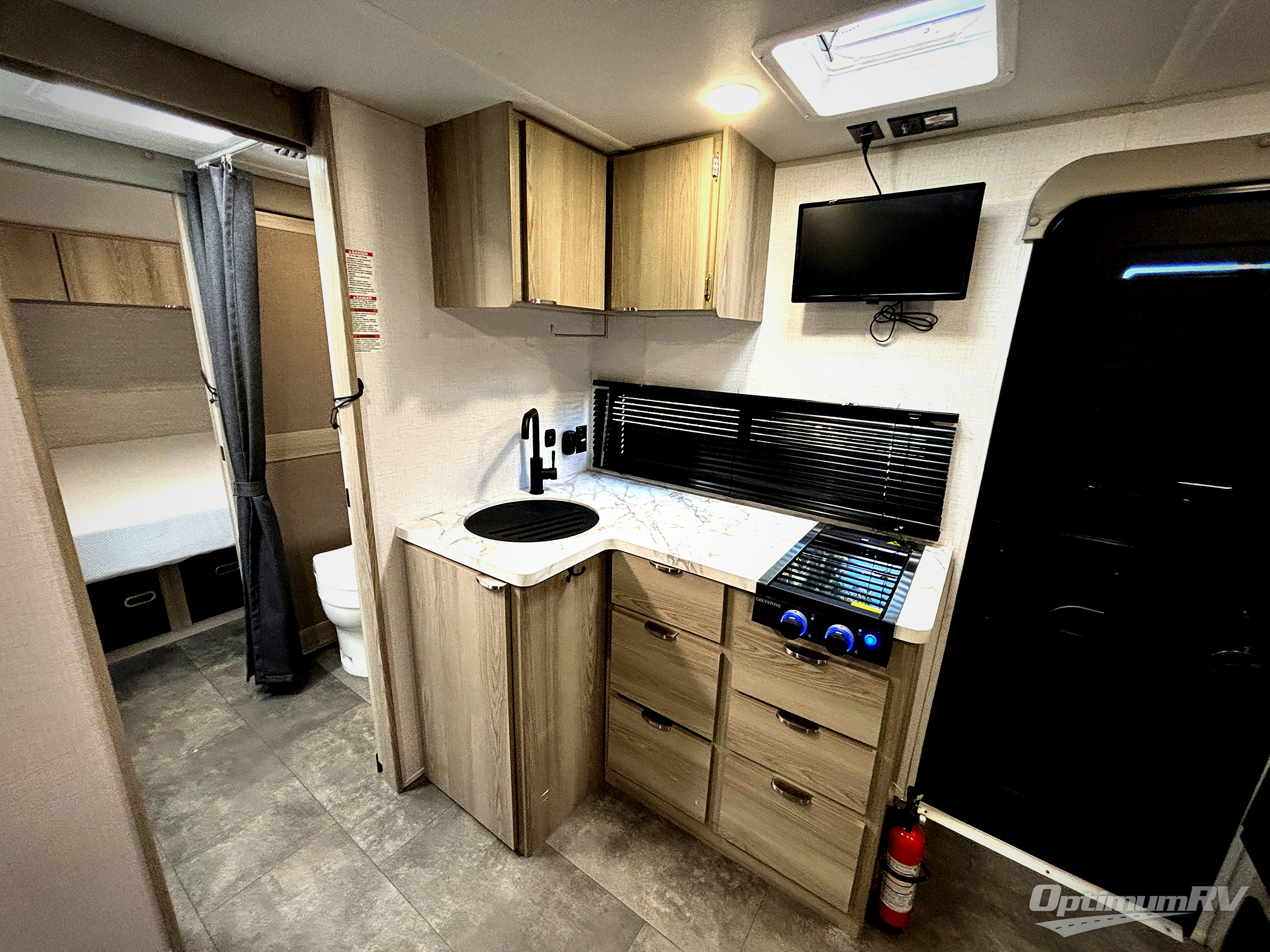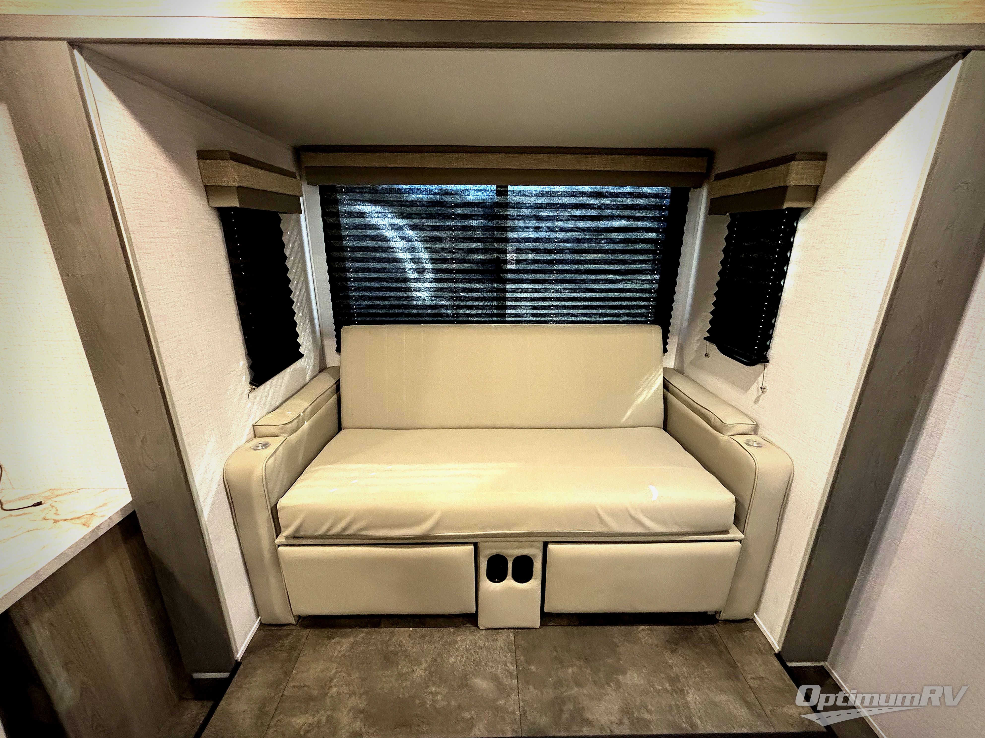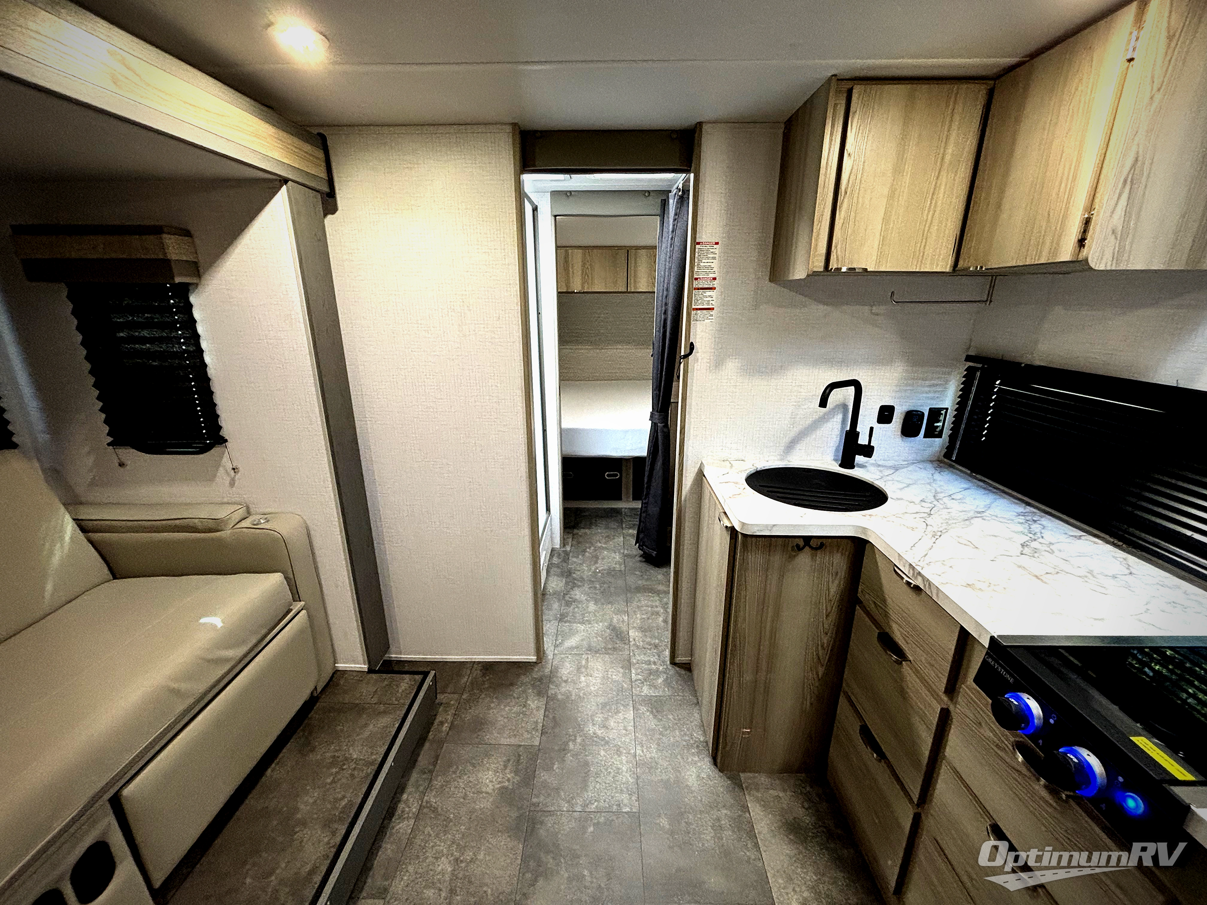 You're going to love every minute spent in this couple's trailer. The queen bed in the front private bedroom will provide a great night's rest, and there are dual wardrobes to easily get dressed in the morning. Head to the kitchen through the bath, then prepare eggs and bacon on the two burner cooktop. There is theater seating here to enjoy your coffee at each morning, or you may want to get some work done at the mobile workstation!