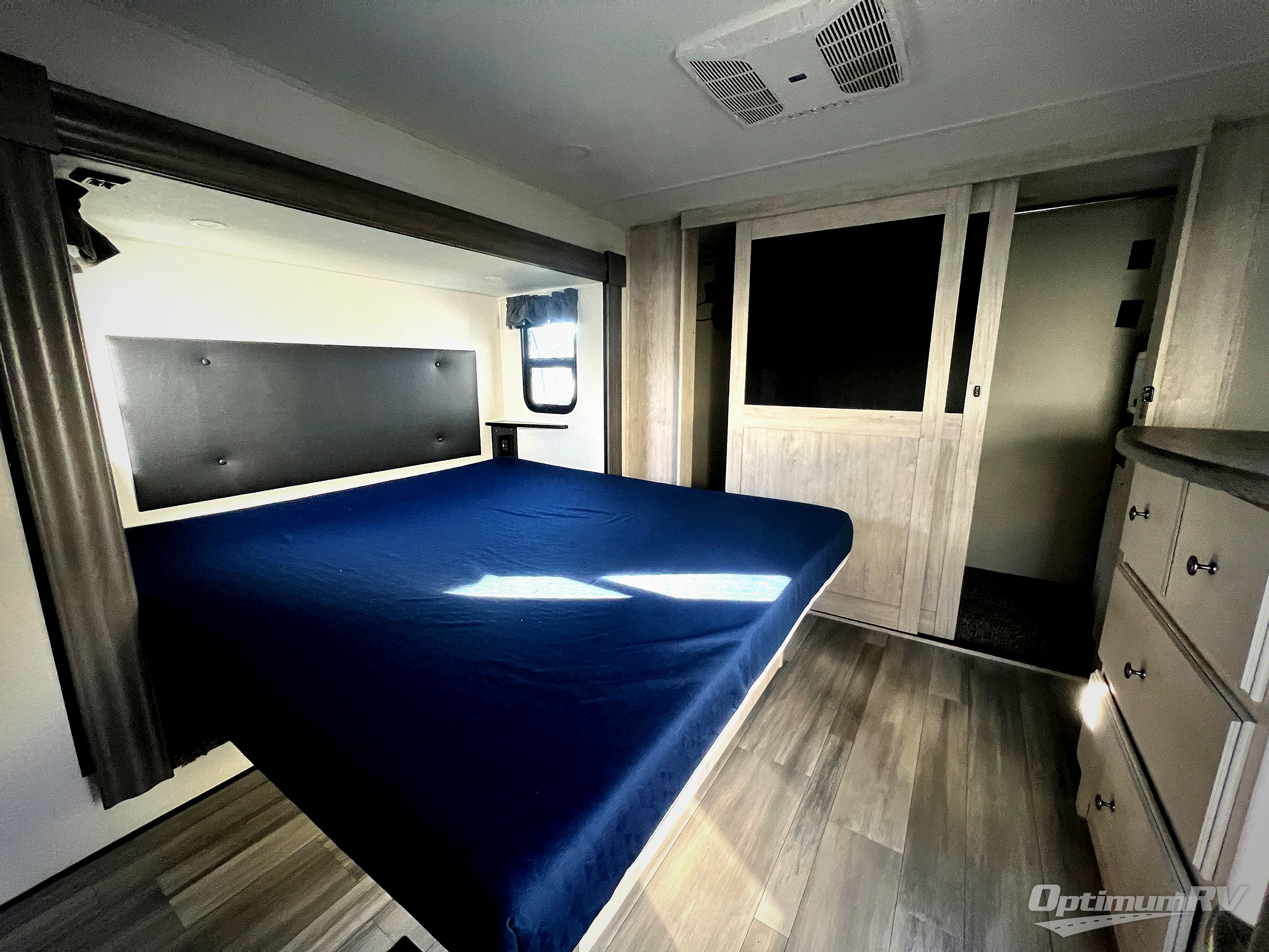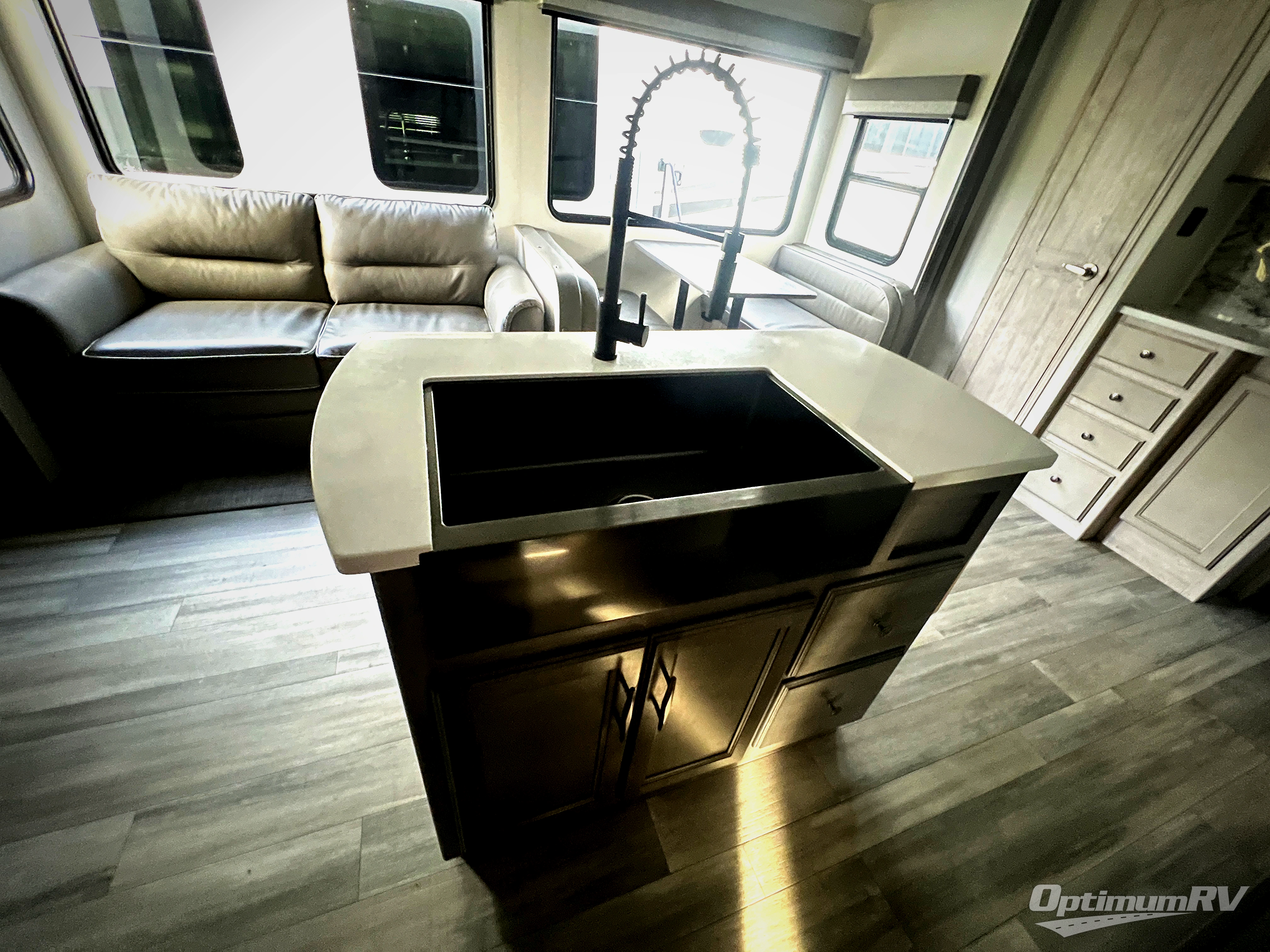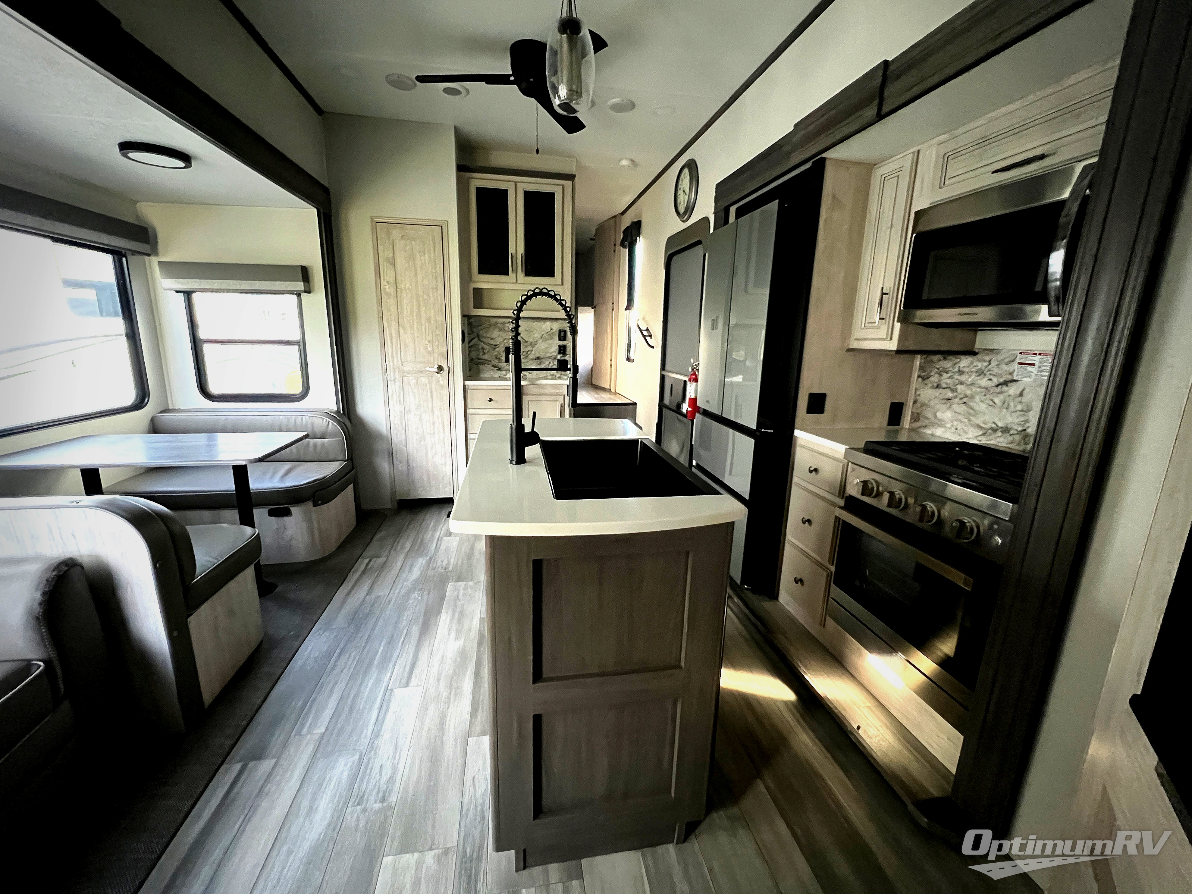 This fifth wheel is perfect for those whole like to camp with a whole group, whether it be with family or friends! There is a rear private suite with a lower RV queen bed and loft bed, a half bath, and your own private entrance. The front private bedroom includes a king bed slide out with a large front wardrobe, a dresser, and washer/dryer prep. And the spacious full bath is close by for easy nighttime use. Everyone can meet in the main living area that includes dual opposing slides, a tri-fold sofa and a booth dinette, plus a 50" TV for movie night. There is also a coffee bar here where you can set up your Keurig machine, a pantry for snacks, and a ceiling fan to keep the air moving. You will also love the exterior cooktop for breakfast outdoors, and the two power awnings with LED lights will provide shade during the day and ambience at night!