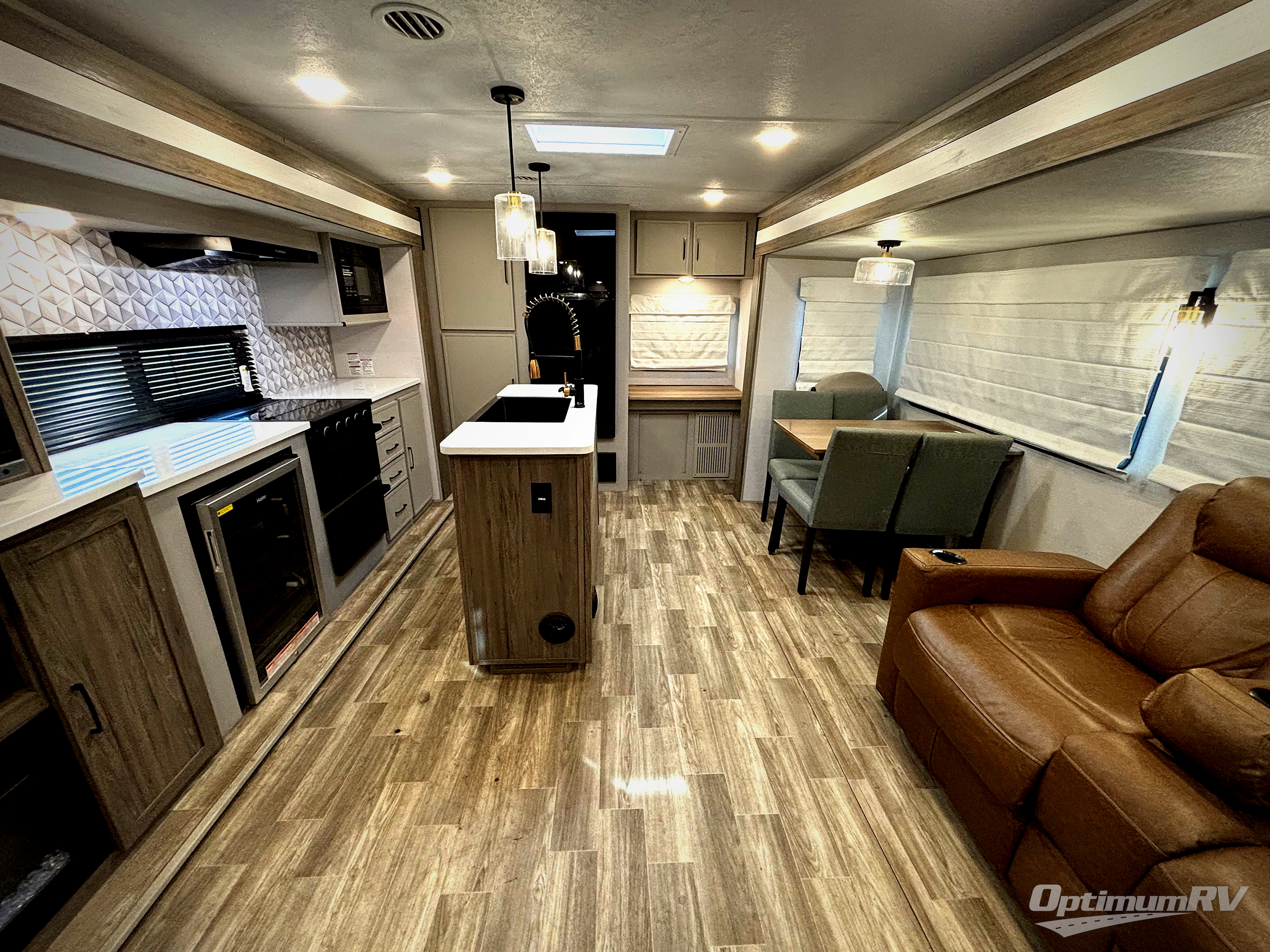 You won't believe all that this travel trailer has to offer! If you need to get some work done then you can utilize the flip-up desk next to the oversized refrigerator and large pantry. The kitchen island makes meal prepping easier, and the beverage cooler helps save space in your refrigerator for perishables. The kitchen skylight brings in natural lighting. Relax each night on either the tri-fold sofa or theater seating across from the entertainment center with a fireplace, or you can play some games at the booth dinette. As you enter the walk-through bathroom, you will notice the washer and dryer prep that will give you the ability to add these appliances. The front private bedroom has a queen bed slide with nightstands on either side with power to charge your electronics while you recharge. The exterior not only has multiple baggage doors and two awnings, but also an exterior hot/cold shower!