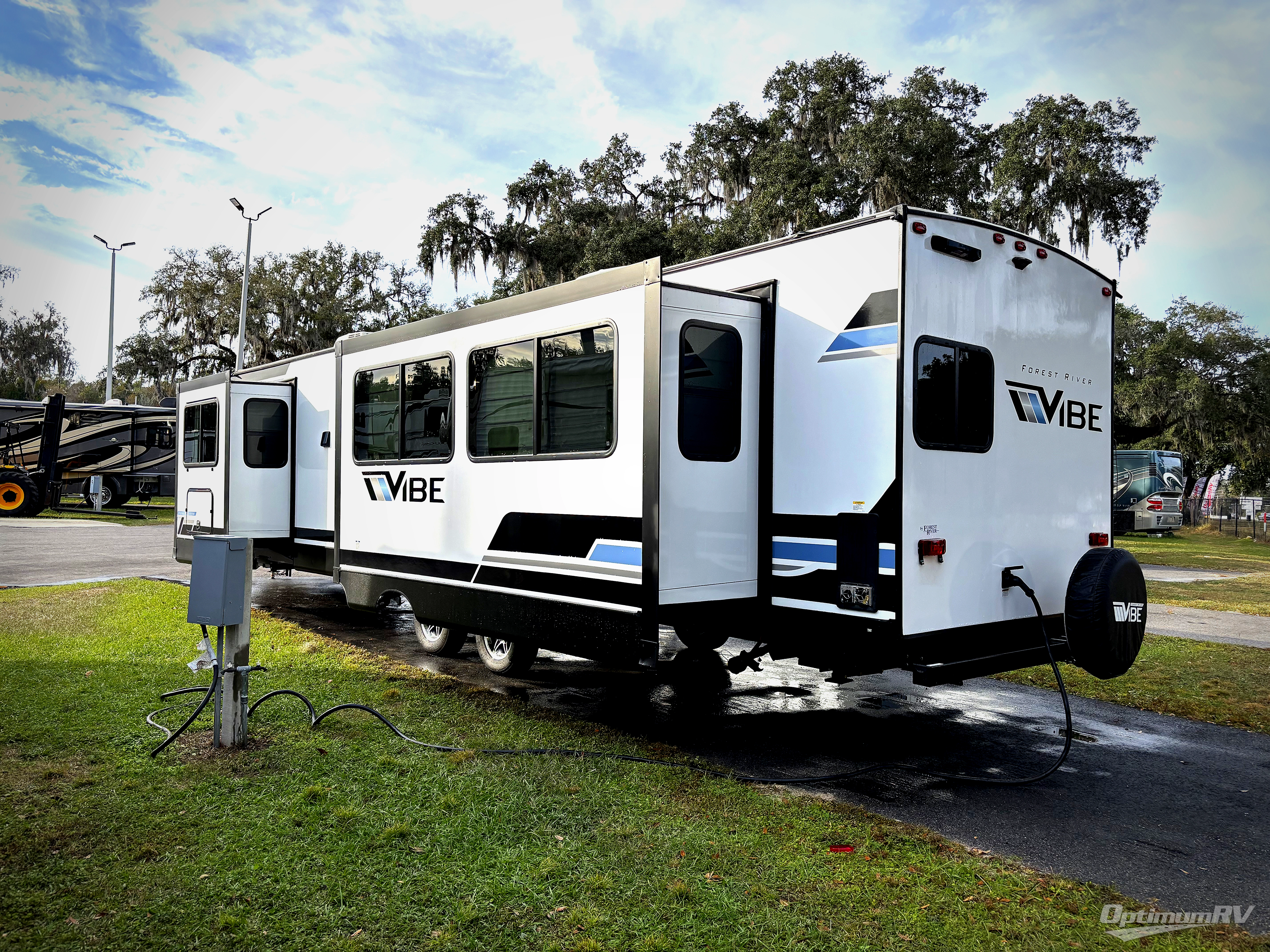 Each Vibe travel trailer by Forest River includes Hyper Lyte construction and a durable laminated "Aluma Frame" for years of use. You will also find an outside shower, a 200-watt roof mounted solar panel, and heated tank pads that will help extend your camping season. The Reserve Package has many at-home features you are sure to enjoy, like the decorative window treatments, solid surface countertops, new black chef's appliance package with an air fryer, and more! These models also include cable and satellite prep and a digital TV antenna with a booster so you can stay connected to the outside world if you choose. Make the easy choice and choose a Vibe travel trailer today!