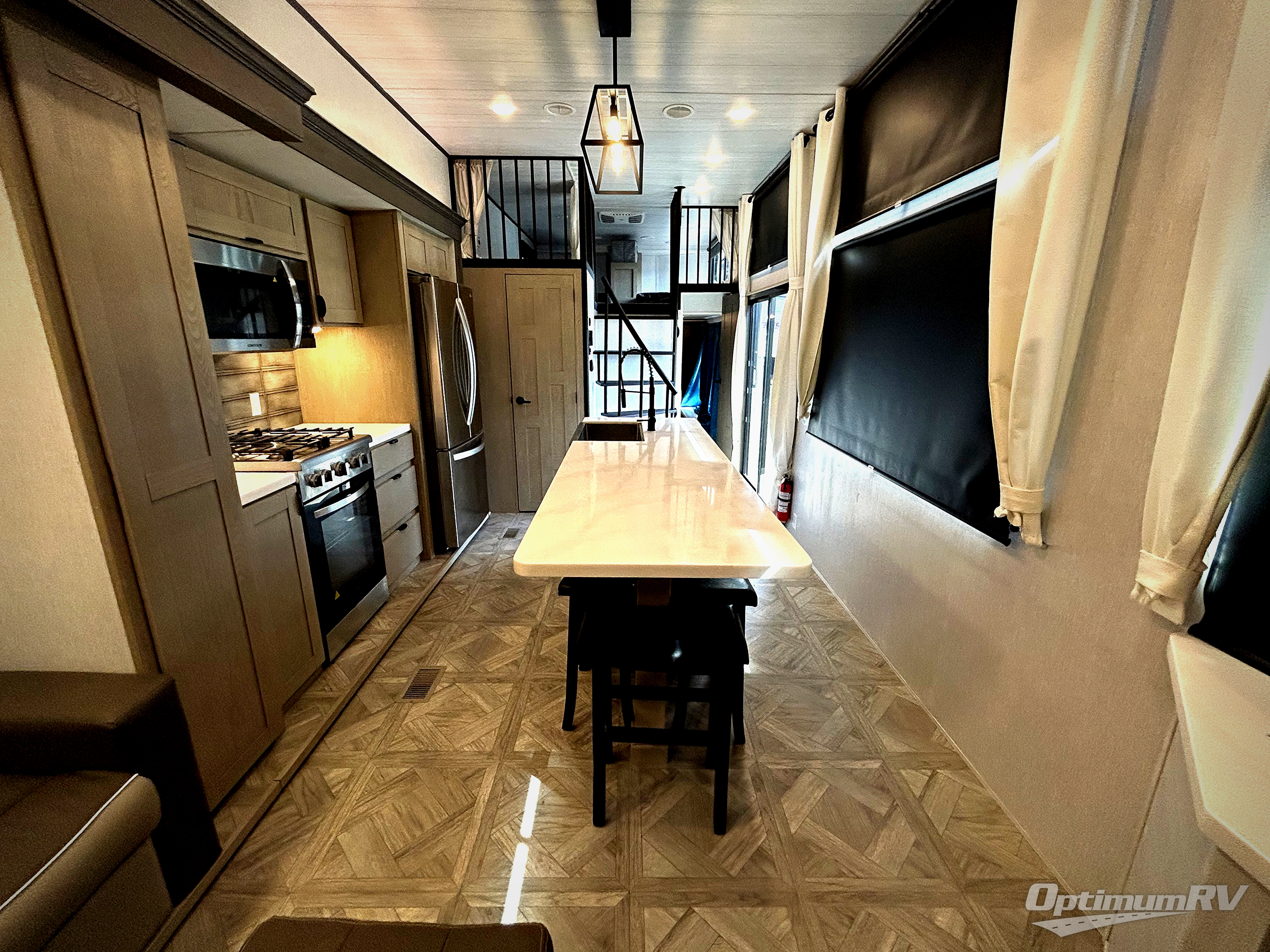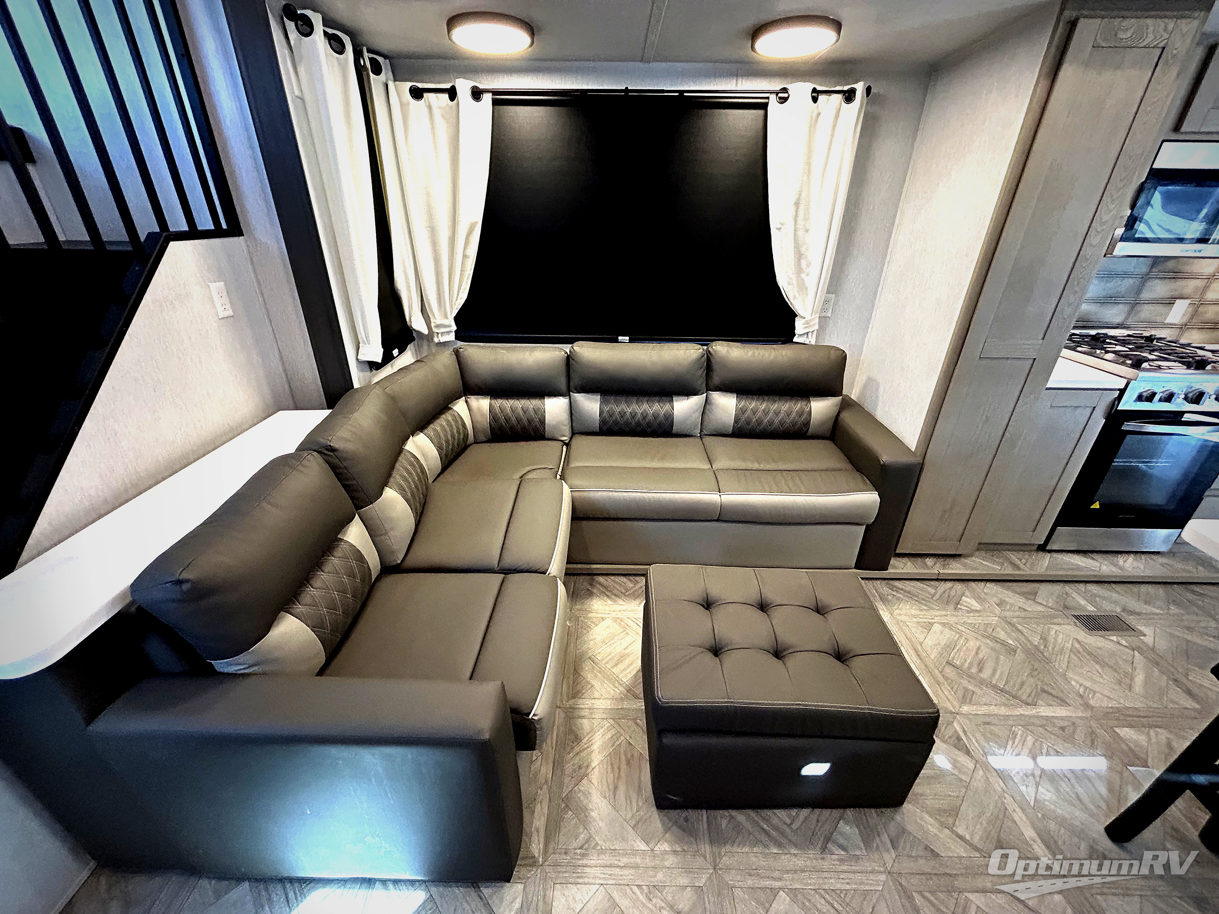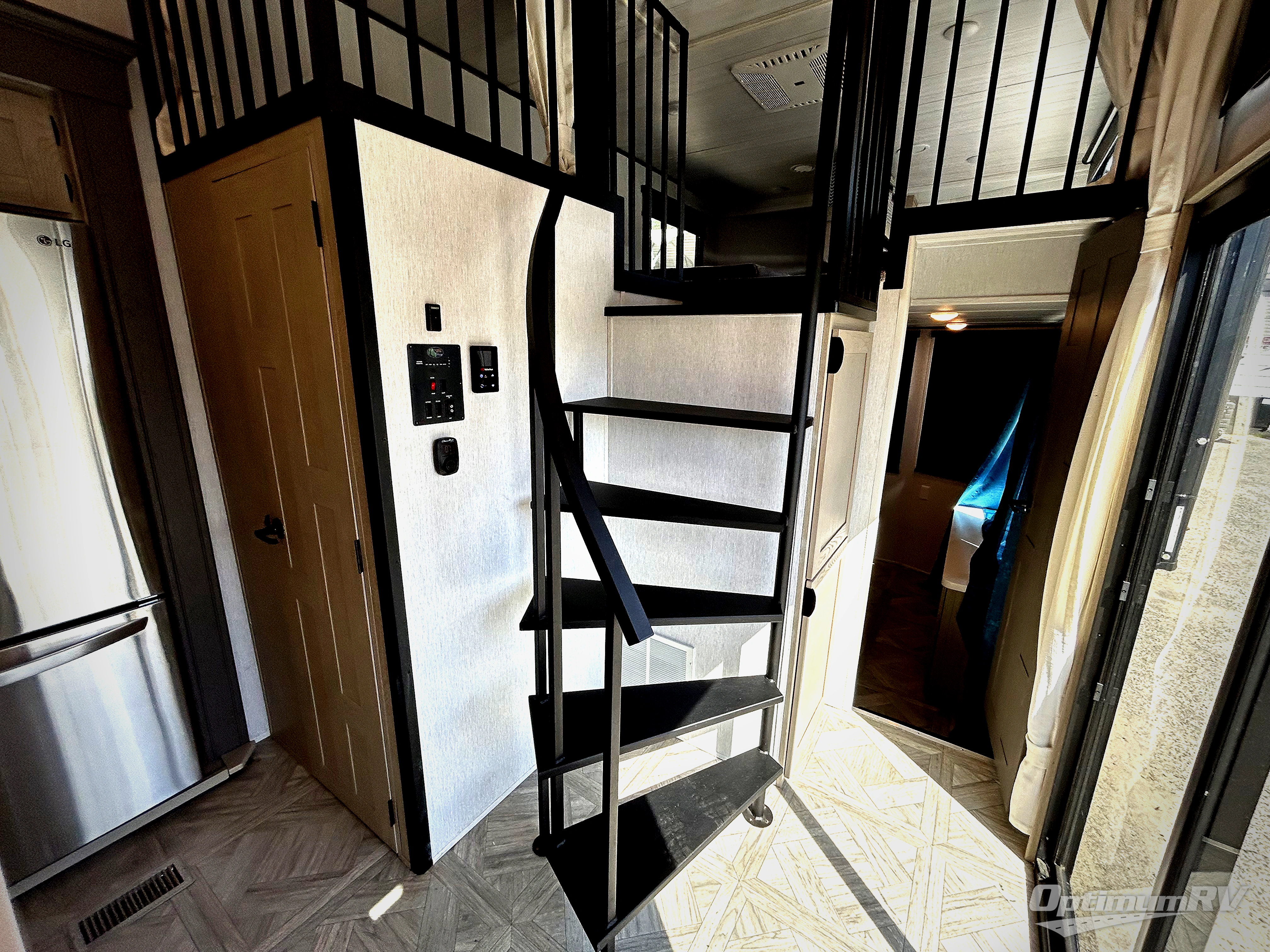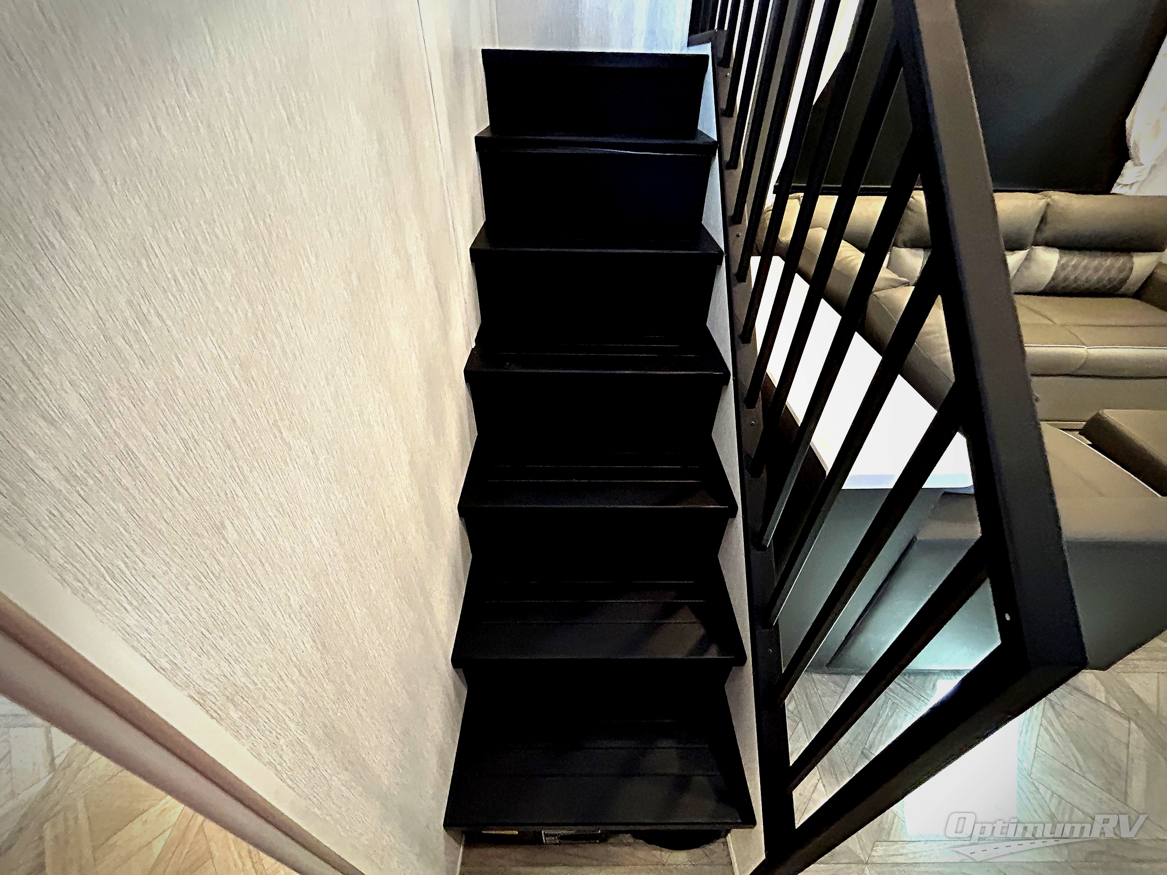 You will feel like you are home when you step inside! Not only will you be impressed with the super large slide in the main combined kitchen and living area, but check out the island with five counter height seats! The main entry closest to the front features a step up to a private bedroom featuring a custom king bed with Versa-Tilt within a slide, plus a fireplace, wardrobe, and drawers for your belongings. Just outside this door, a half bath around the corner and a spiral staircase to the front loft with two 42" x 74" bunk mats above. The kitchen is fully equipped for you to provide the best home cooked meals with a roll-out pantry, range and microwave, plus side-by-side refrigerator all part of the large slide that also houses an L-shaped sectional sofa with ottoman so everyone can have a seat! Opposite the sectional find an entertainment center with pop-up TV and fireplace. A second set of stairs leads up to the rear loft featuring a 62" x 74" Versa Queen mattress and dresser. Back down in the very back of the unit a large bathroom with walk-in shower, linen cabinet, toilet, and vanity with sink. There is also a space that has washer/dryer prep to add even more convenience. Outside, a 26' awning for outdoor living, and double entry doors to make it easy to move in and out.