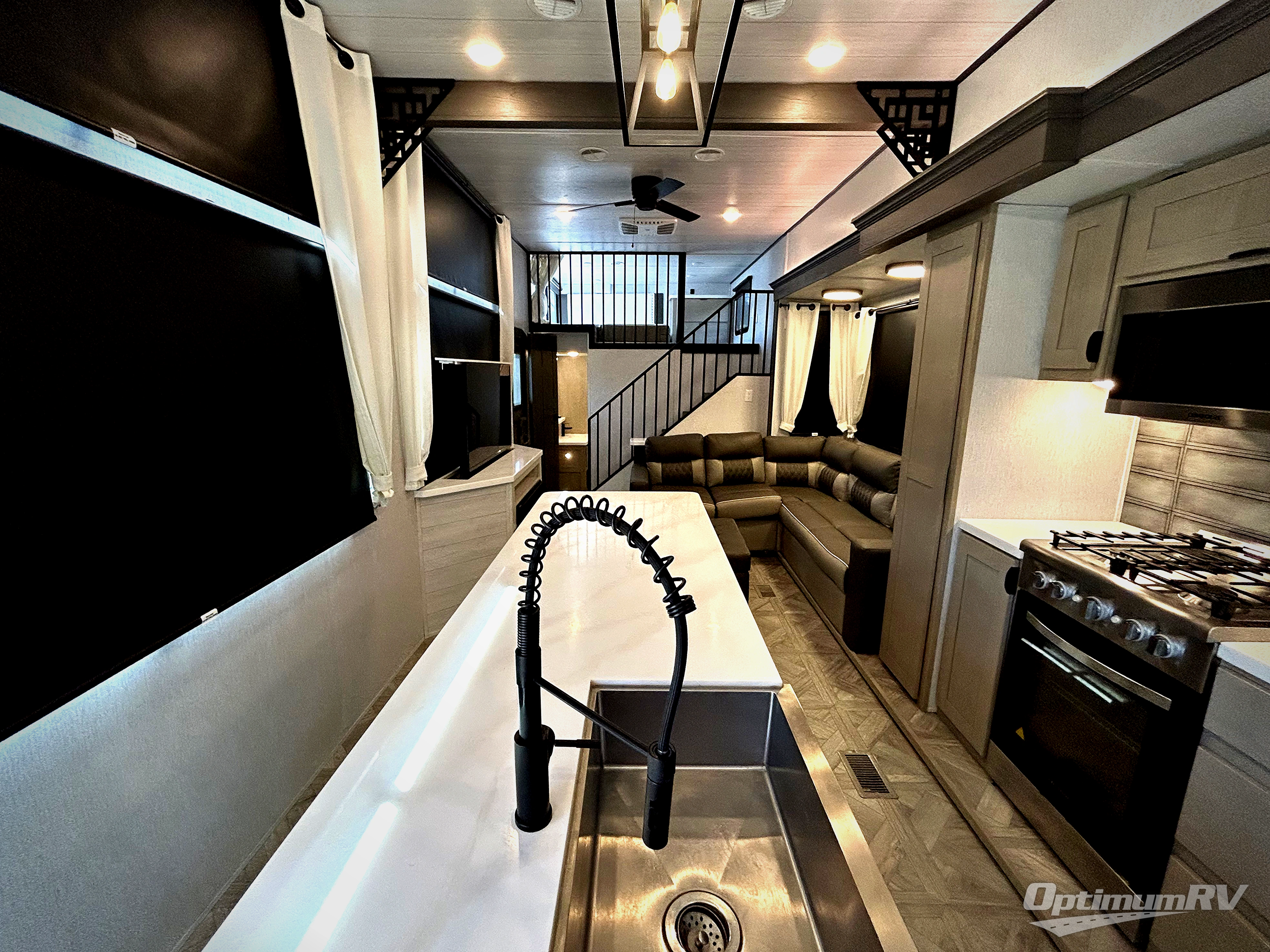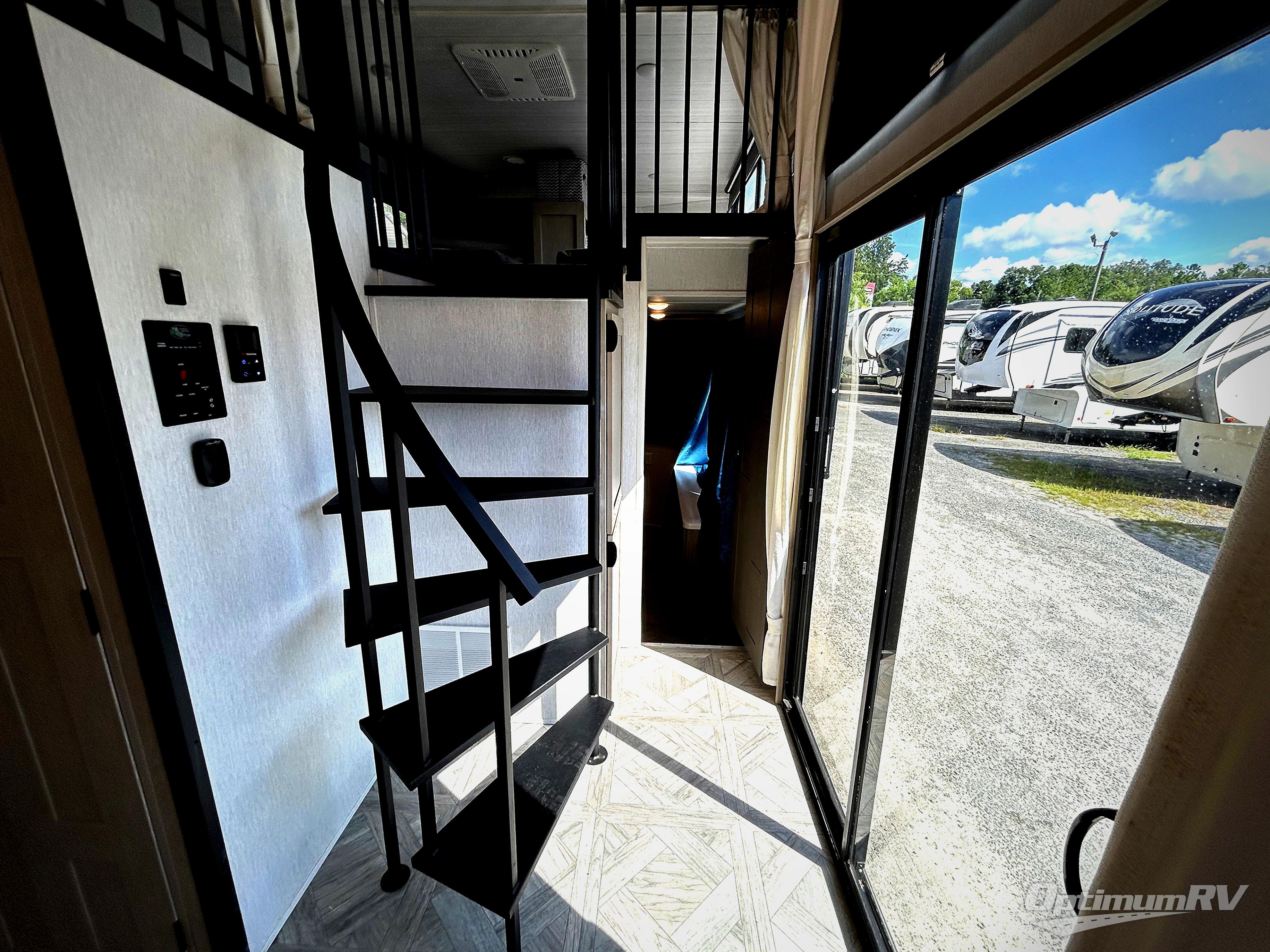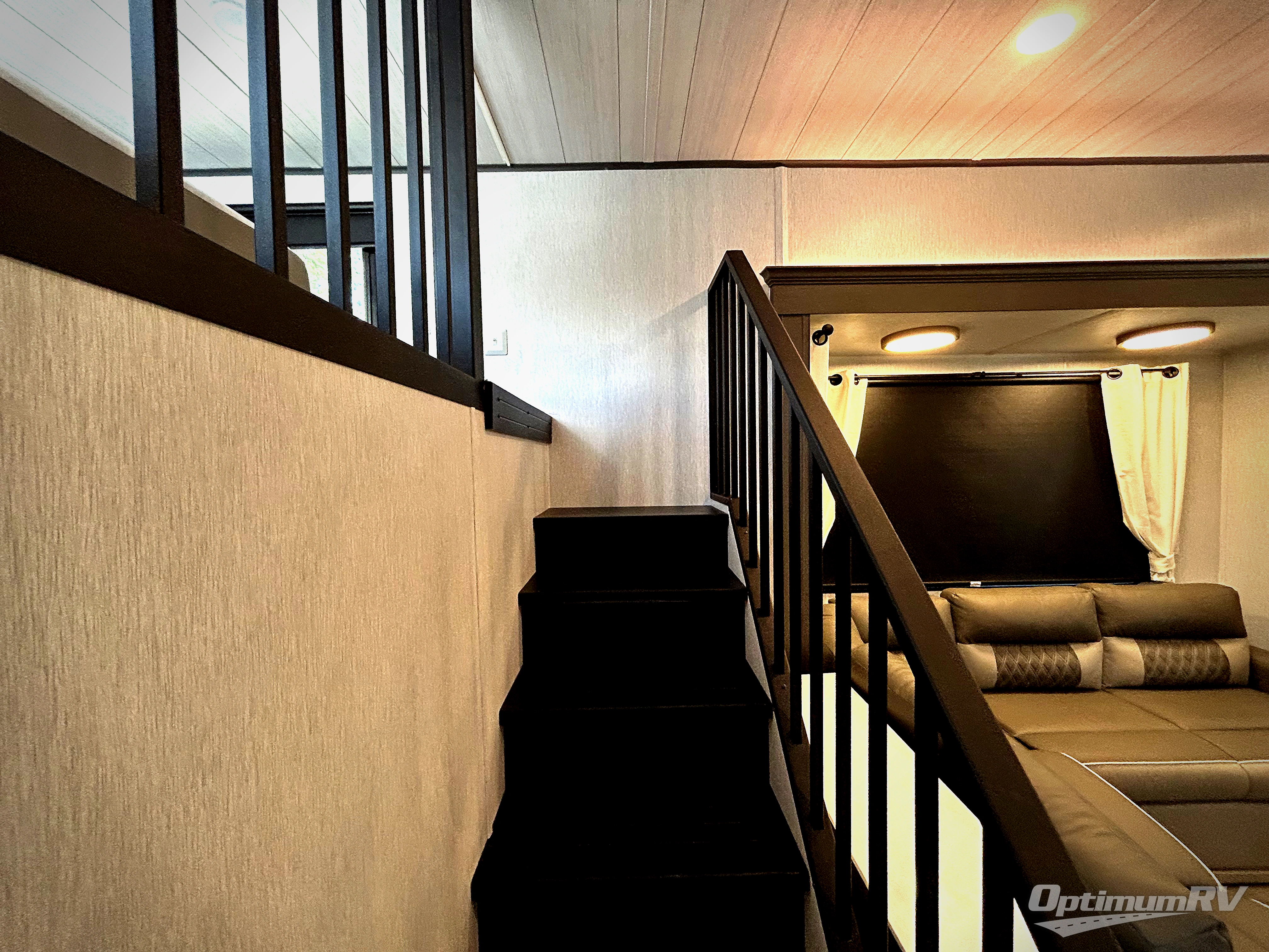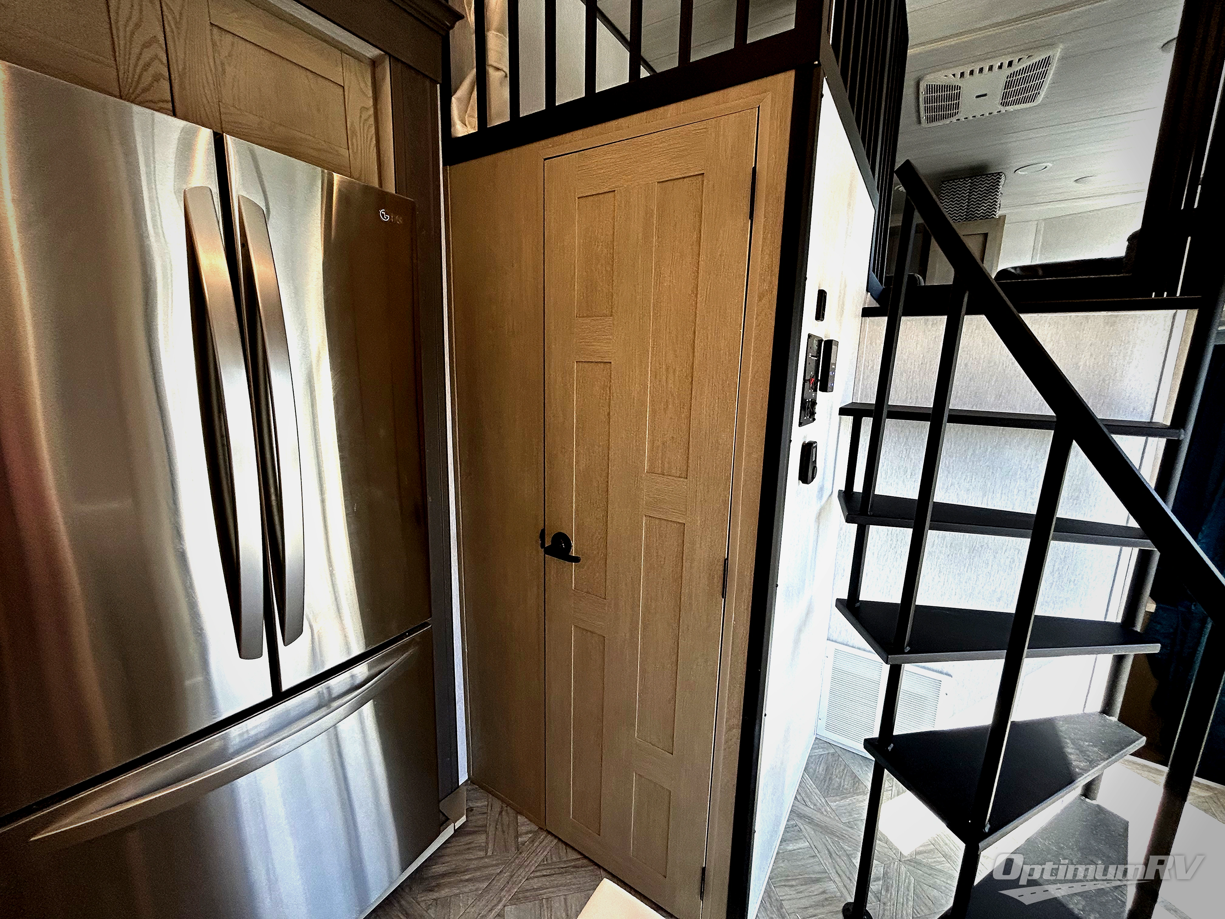 You will feel like you are home when you step inside! Not only will you be impressed with the super large slide in the main combined kitchen and living area, but check out the island with five counter height seats! The main entry closest to the front features a step up to a private bedroom featuring a custom king bed with Versa-Tilt within a slide, plus a fireplace, wardrobe, and drawers for your belongings. Just outside this door, a half bath around the corner and a spiral staircase to the front loft with two 42" x 74" bunk mats above. The kitchen is fully equipped for you to provide the best home cooked meals with a roll-out pantry, range and microwave, plus side-by-side refrigerator all part of the large slide that also houses an L-shaped sectional sofa with ottoman so everyone can have a seat! Opposite the sectional find an entertainment center with pop-up TV and fireplace. A second set of stairs leads up to the rear loft featuring a 62" x 74" Versa Queen mattress and dresser. Back down in the very back of the unit a large bathroom with walk-in shower, linen cabinet, toilet, and vanity with sink. There is also a space that has washer/dryer prep to add even more convenience. Outside, a 26' awning for outdoor living, and double entry doors to make it easy to move in and out.