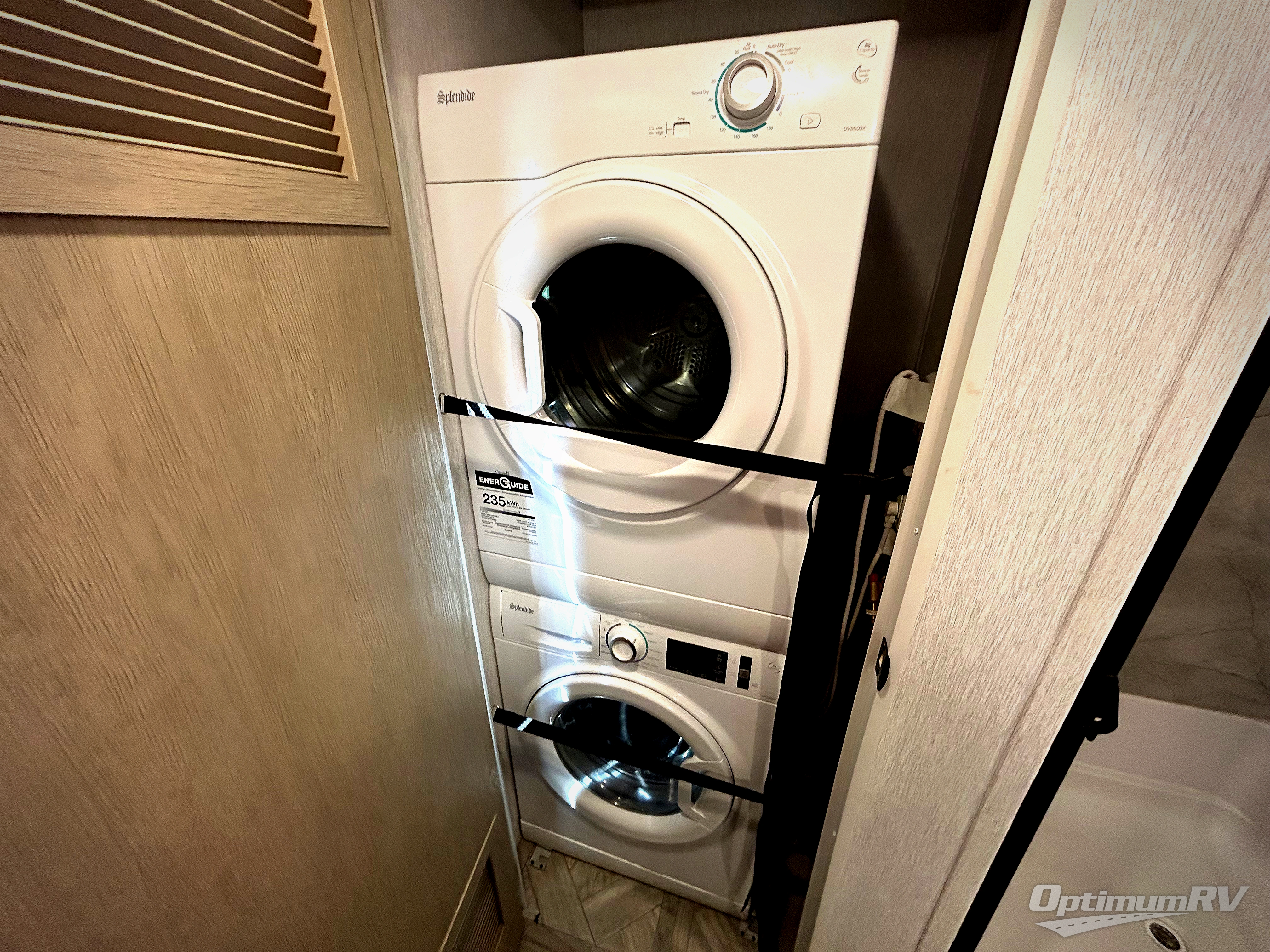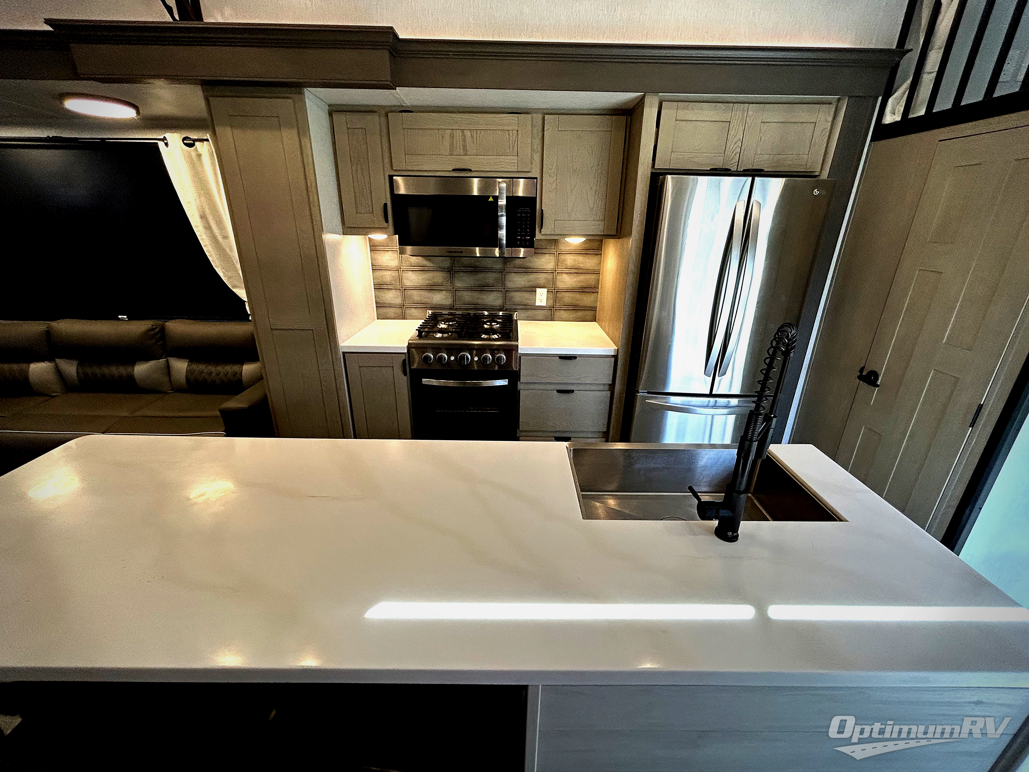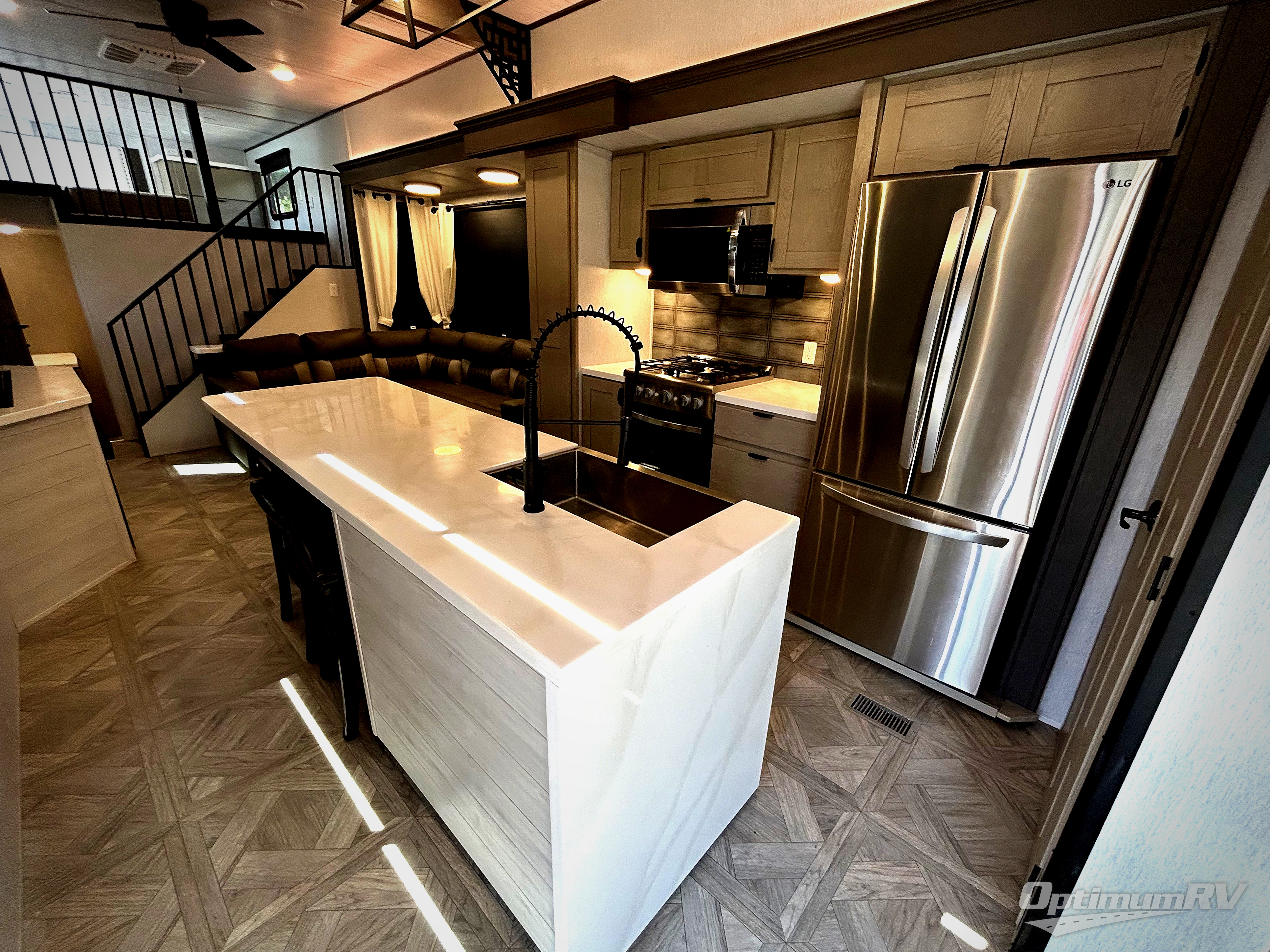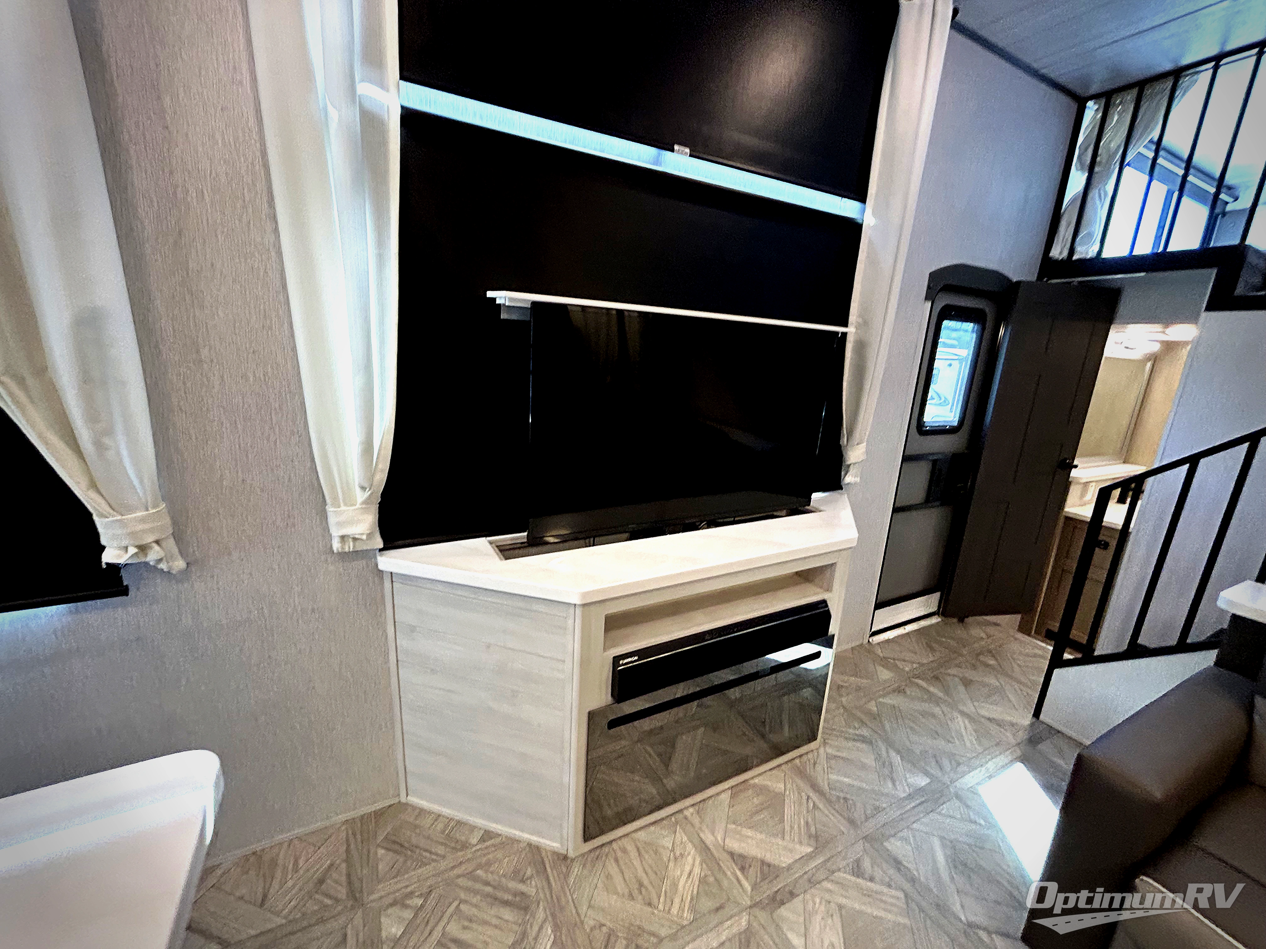 You will feel like you are home when you step inside! Not only will you be impressed with the super large slide in the main combined kitchen and living area, but check out the island with five counter height seats! The main entry closest to the front features a step up to a private bedroom featuring a custom king bed with Versa-Tilt within a slide, plus a fireplace, wardrobe, and drawers for your belongings. Just outside this door, a half bath around the corner and a spiral staircase to the front loft with two 42" x 74" bunk mats above. The kitchen is fully equipped for you to provide the best home cooked meals with a roll-out pantry, range and microwave, plus side-by-side refrigerator all part of the large slide that also houses an L-shaped sectional sofa with ottoman so everyone can have a seat! Opposite the sectional find an entertainment center with pop-up TV and fireplace. A second set of stairs leads up to the rear loft featuring a 62" x 74" Versa Queen mattress and dresser. Back down in the very back of the unit a large bathroom with walk-in shower, linen cabinet, toilet, and vanity with sink. There is also a space that has washer/dryer prep to add even more convenience. Outside, a 26' awning for outdoor living, and double entry doors to make it easy to move in and out.