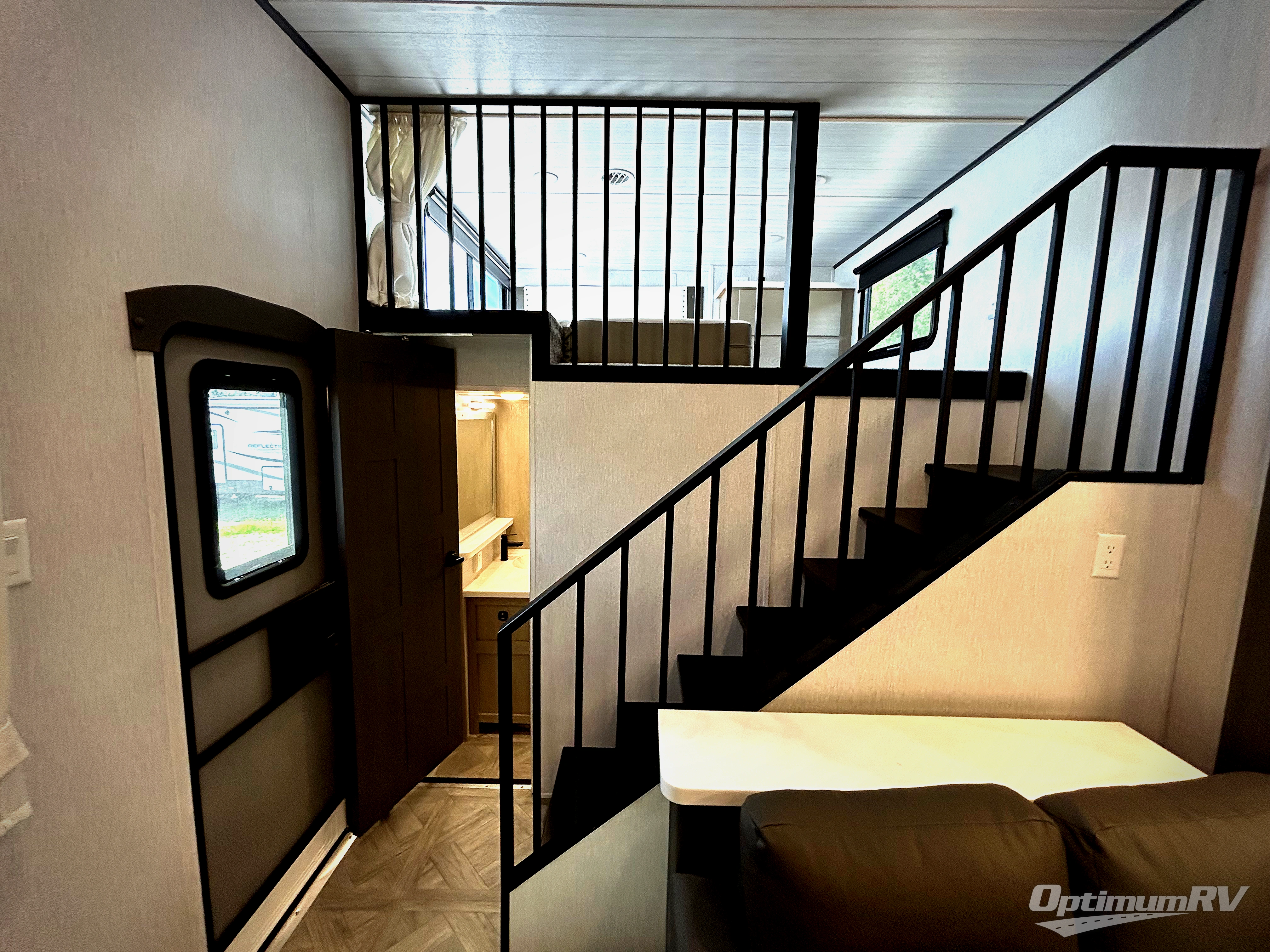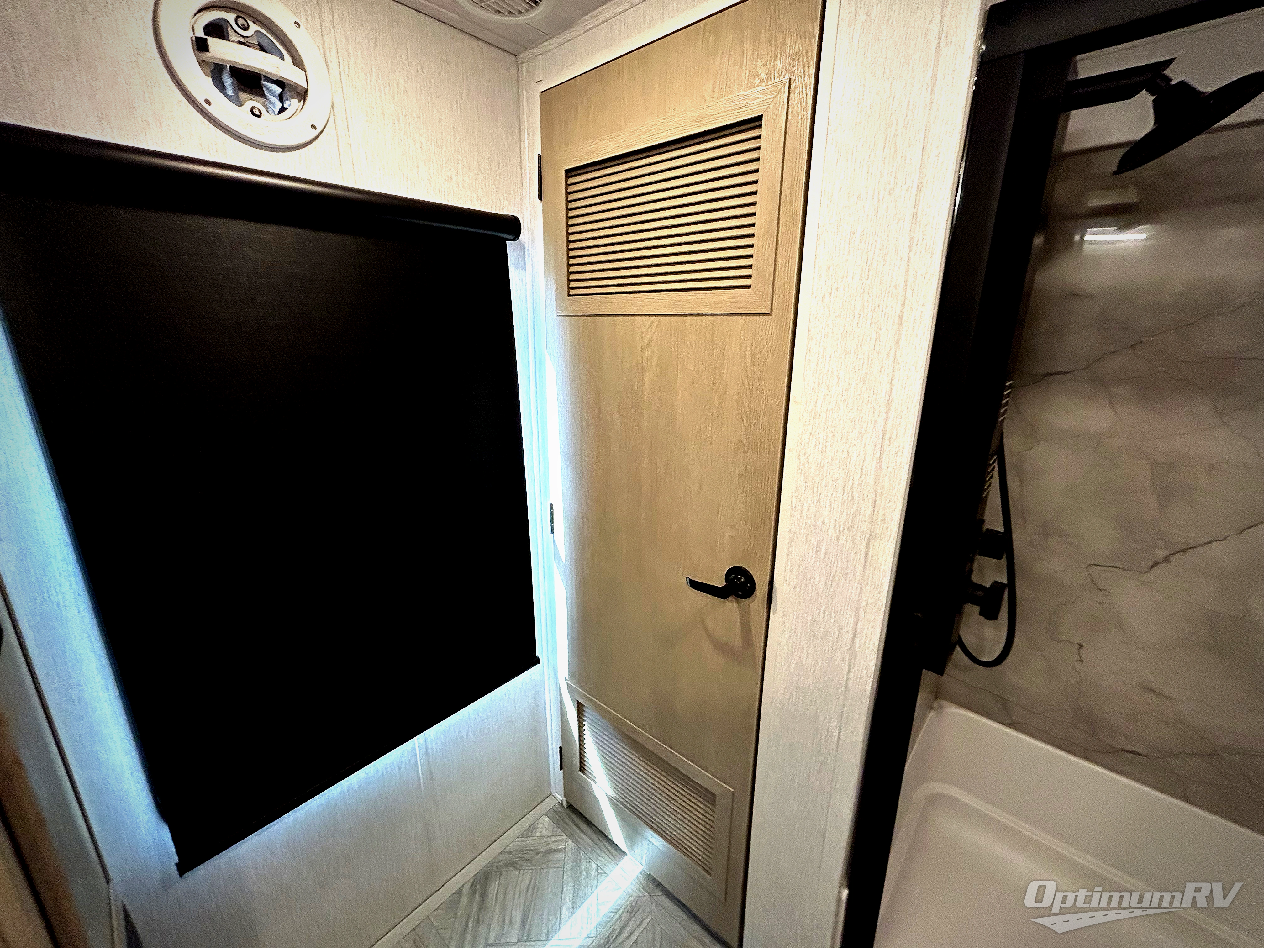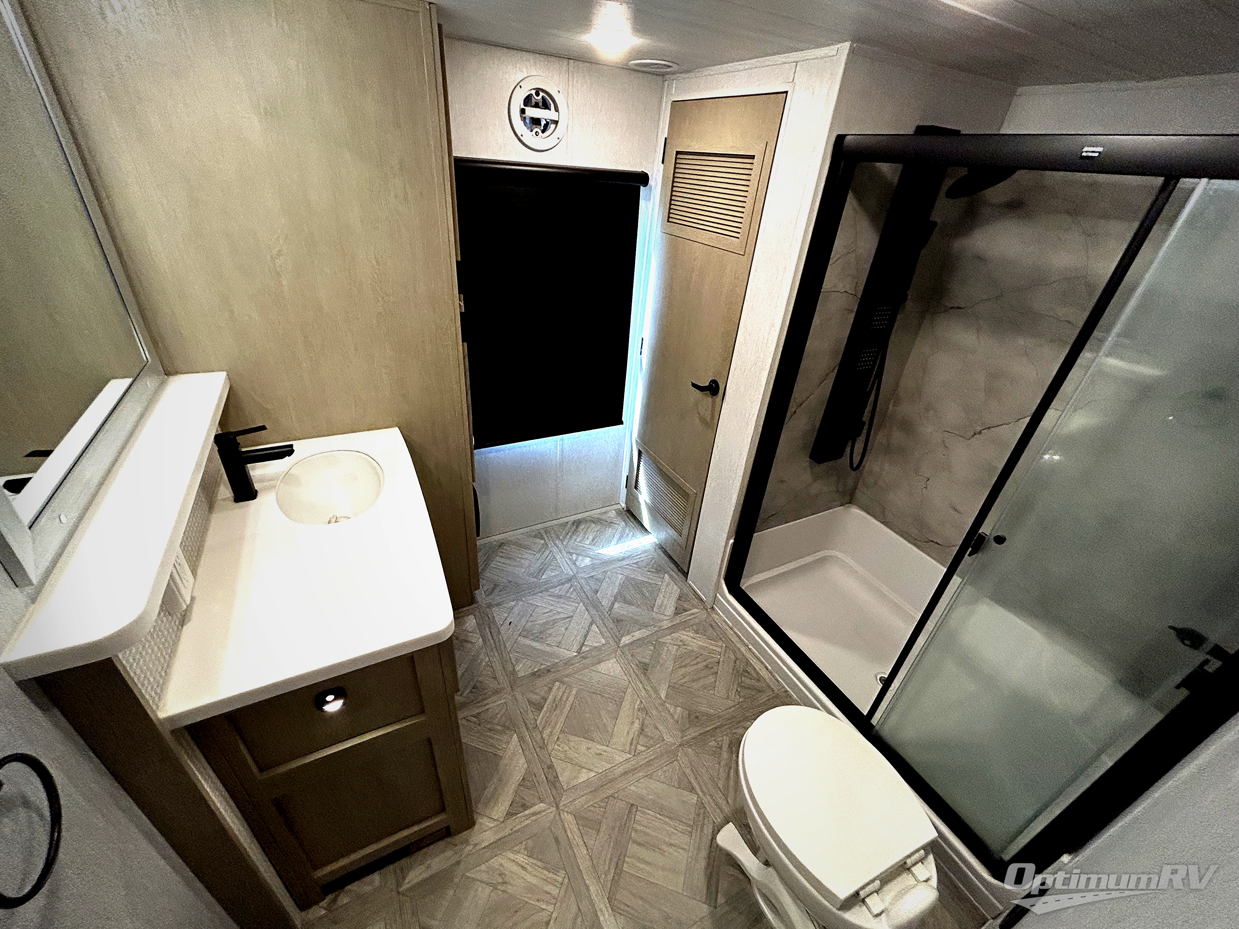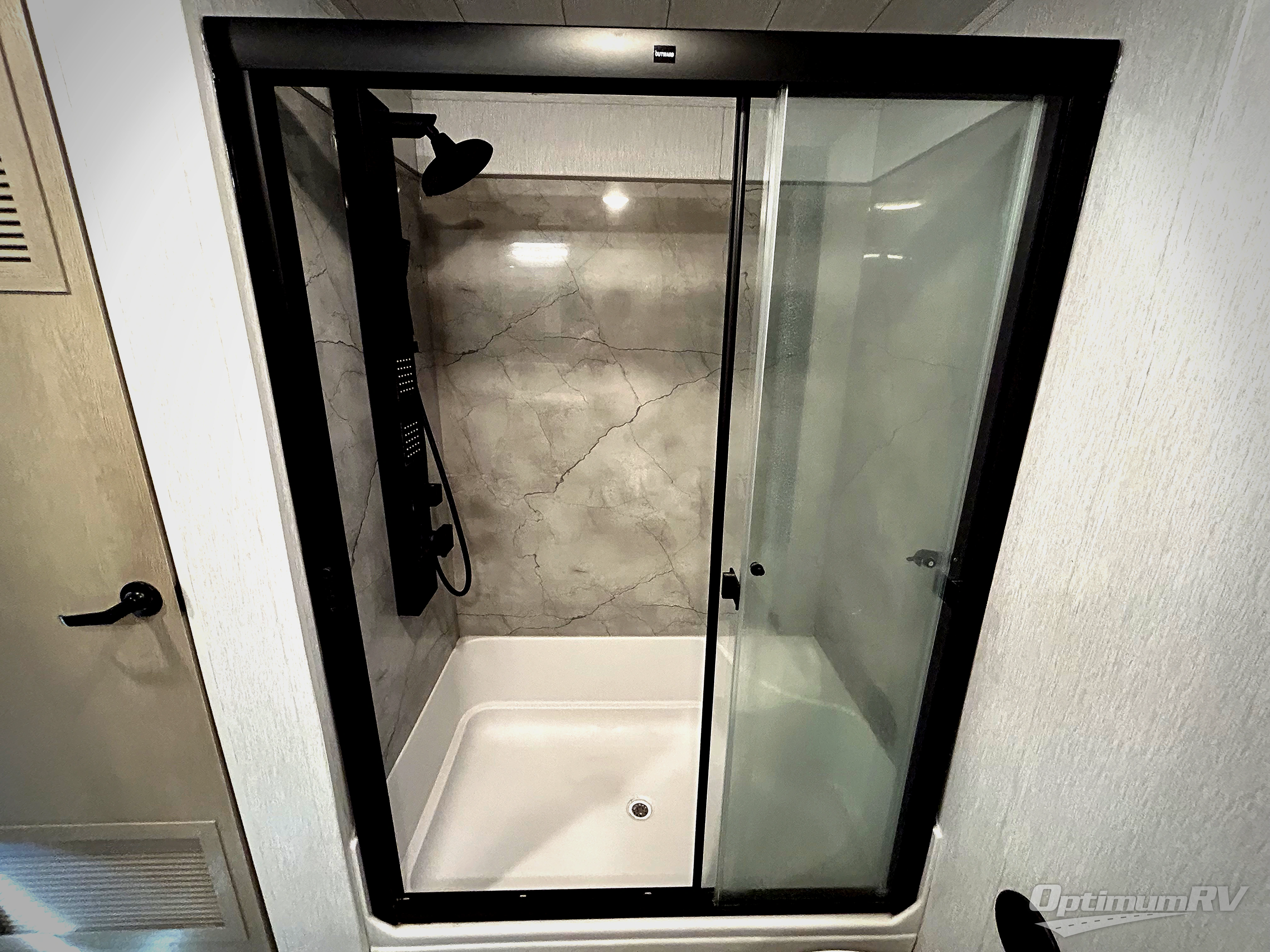 You will feel like you are home when you step inside! Not only will you be impressed with the super large slide in the main combined kitchen and living area, but check out the island with five counter height seats! The main entry closest to the front features a step up to a private bedroom featuring a custom king bed with Versa-Tilt within a slide, plus a fireplace, wardrobe, and drawers for your belongings. Just outside this door, a half bath around the corner and a spiral staircase to the front loft with two 42" x 74" bunk mats above. The kitchen is fully equipped for you to provide the best home cooked meals with a roll-out pantry, range and microwave, plus side-by-side refrigerator all part of the large slide that also houses an L-shaped sectional sofa with ottoman so everyone can have a seat! Opposite the sectional find an entertainment center with pop-up TV and fireplace. A second set of stairs leads up to the rear loft featuring a 62" x 74" Versa Queen mattress and dresser. Back down in the very back of the unit a large bathroom with walk-in shower, linen cabinet, toilet, and vanity with sink. There is also a space that has washer/dryer prep to add even more convenience. Outside, a 26' awning for outdoor living, and double entry doors to make it easy to move in and out.