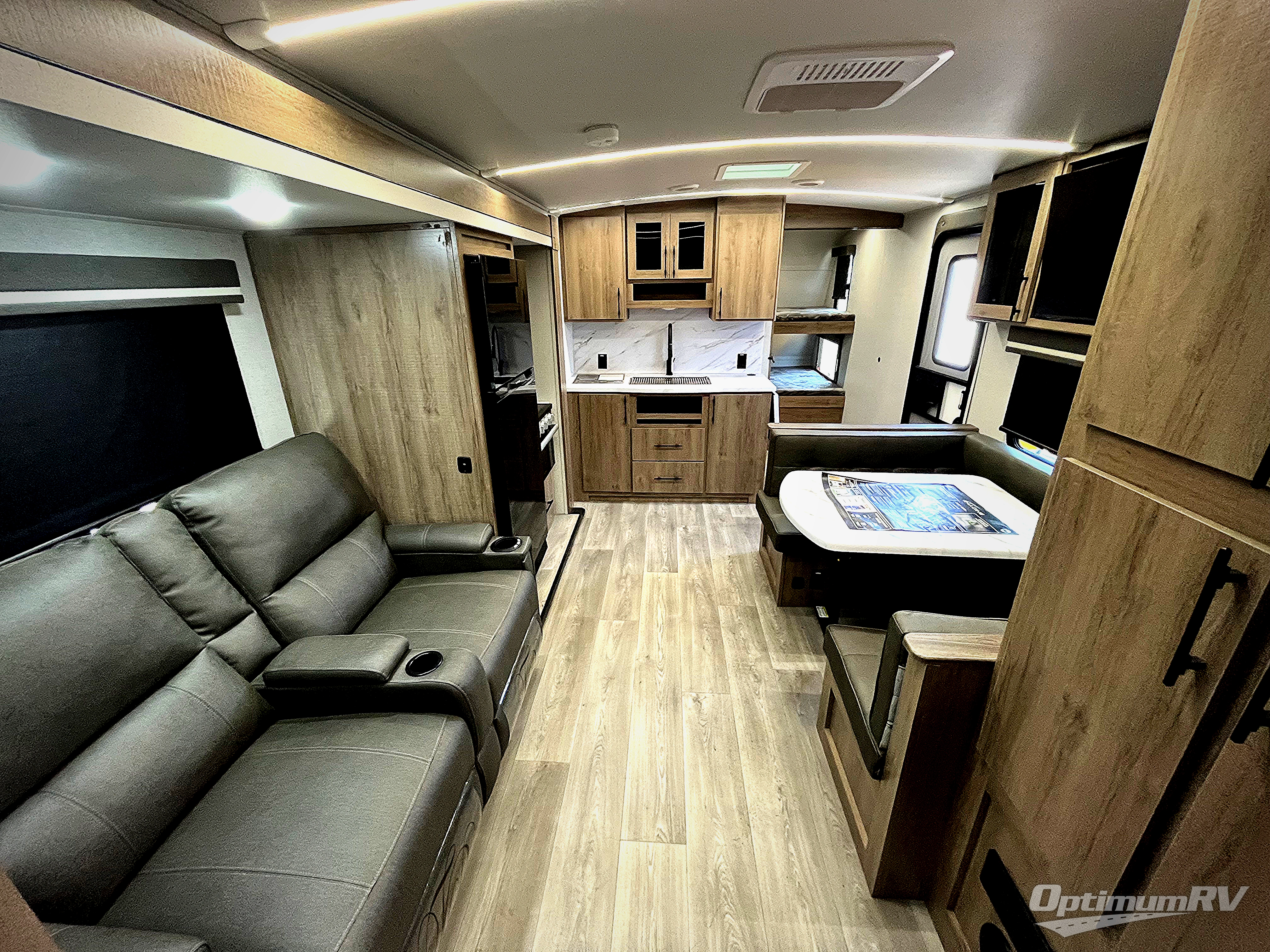 You will love this family bunkhouse trailer with dual entry/exit doors with one door leading directly into your rear private bedroom featuring a slide out queen bed, desk, and storage! A walk-through bath is also nearby for convenience and offers plenty of space being stretched across the width of the trailer. The second entry, closest to the front, leads directly into your spacious combined kitchen and living area. Here you will enjoy counter prep space for cooking, a three burner range and oven, plus overhead storage and drawers for all of your necessities. Your refrigerator is within the large slide that also houses theater seating for relaxing, or you could choose the optional tri-fold sofa if you are used to having overnight guests. A large pantry for all of your dry goods and snacks is next to the u-shaped dinette which can seat all occupants easily. In front, a private bunkhouse with a 40" x 76" top bunk and 53" x 76" bottom bunk easily sleeping three. On the outside, a spray port to rinse off feet or your furry pal, LP quick connect, and a 21' awning to provide added living space to enjoy outdoors!