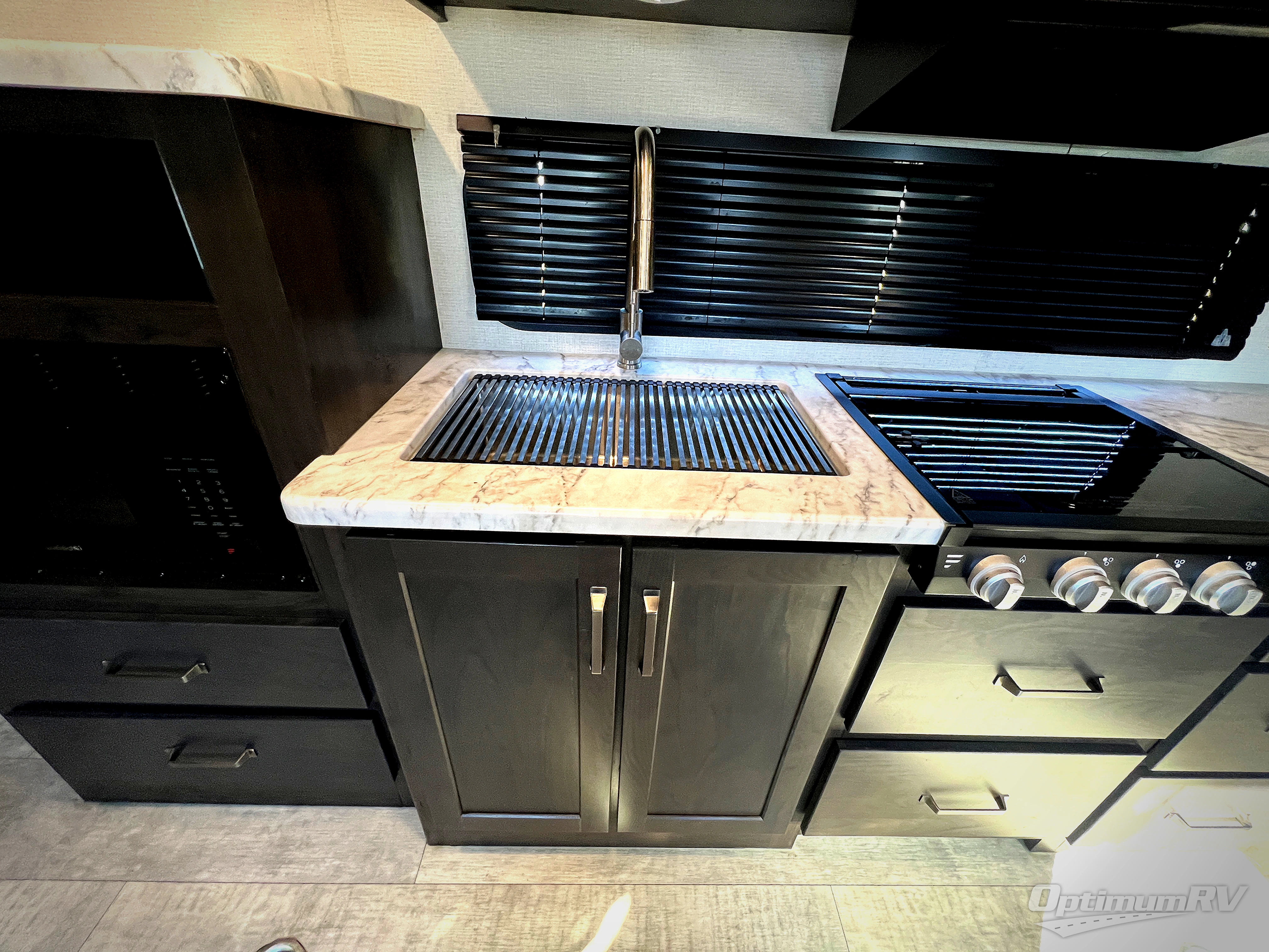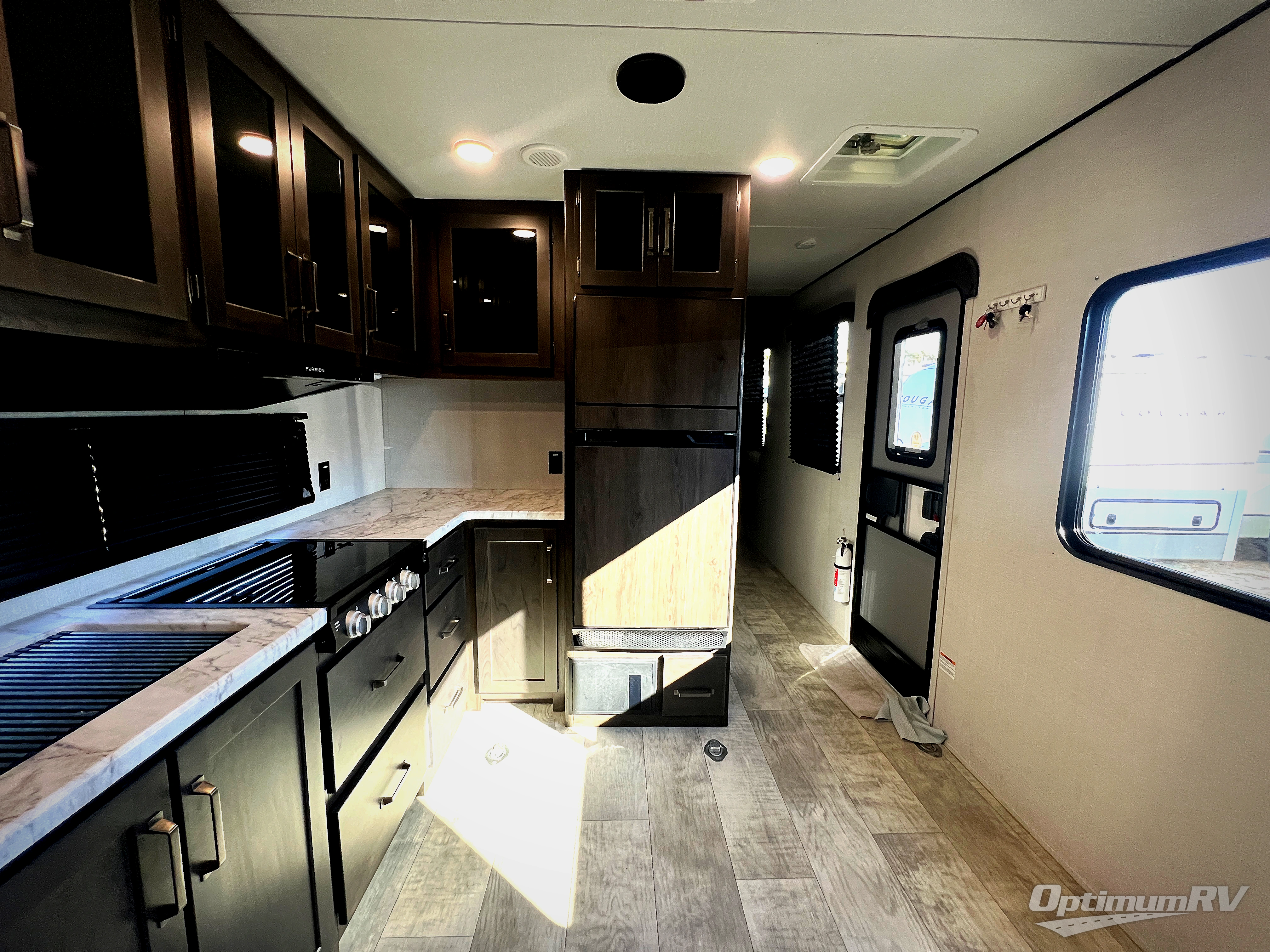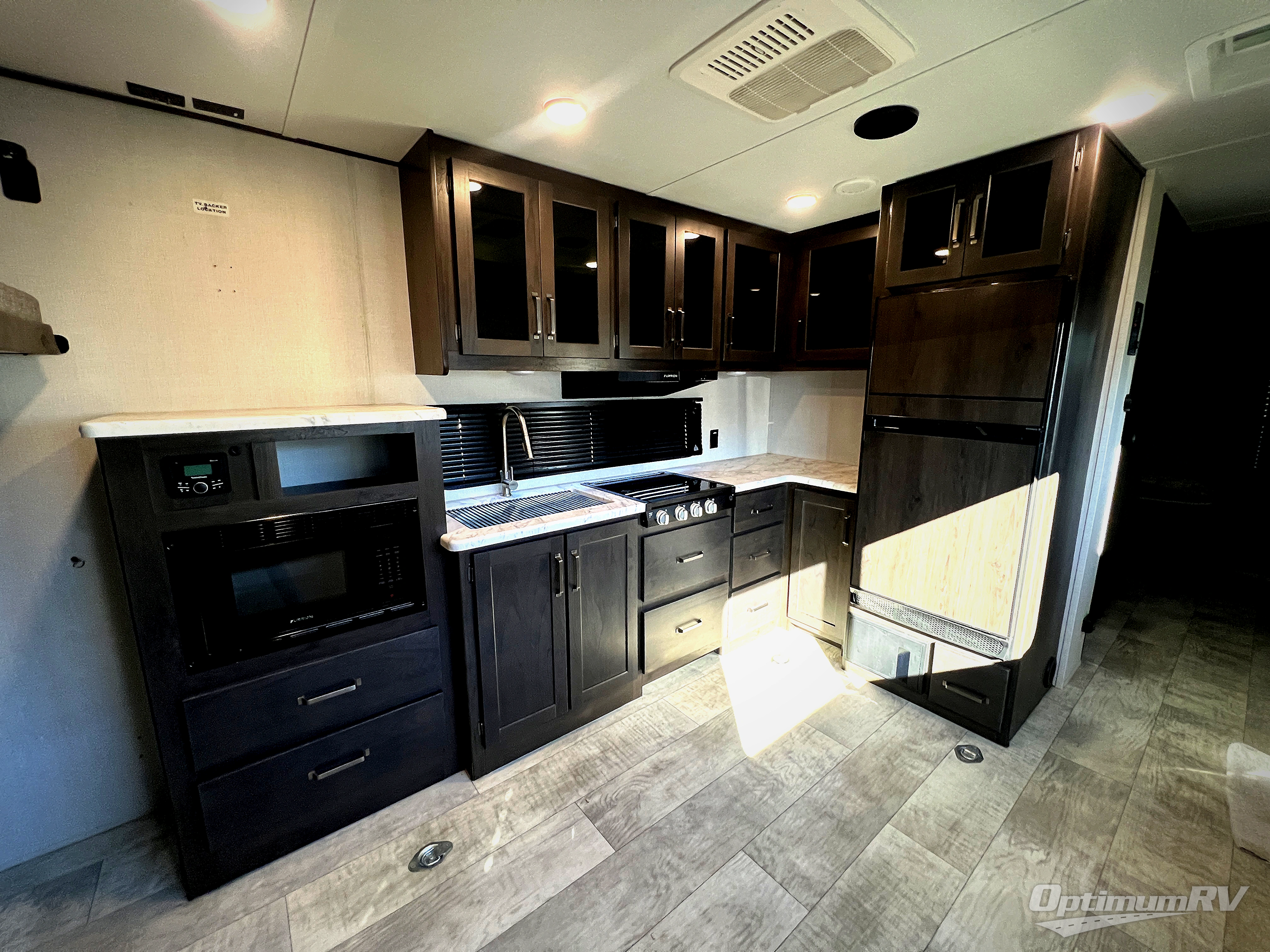 You will love this Momentum MAV toy hauler travel trailer! The front bedroom features a queen bed, and there is plenty of room to walk around. The sliding solid bedroom door helps with space. Overhead storage and a pair of nightstands are convenient storage, plus there is a wardrobe with both drawers and space to hang items. The kitchen offers a microwave, stainless steel sink, and an 8 cu. ft. 12V refrigerator. In the garage, you'll find rollover sofas with a table and a top bed for guests to sleep on. The ramp door/patio will provide additional living space once your toys are unloaded, and the pull down screen will keep bugs out!