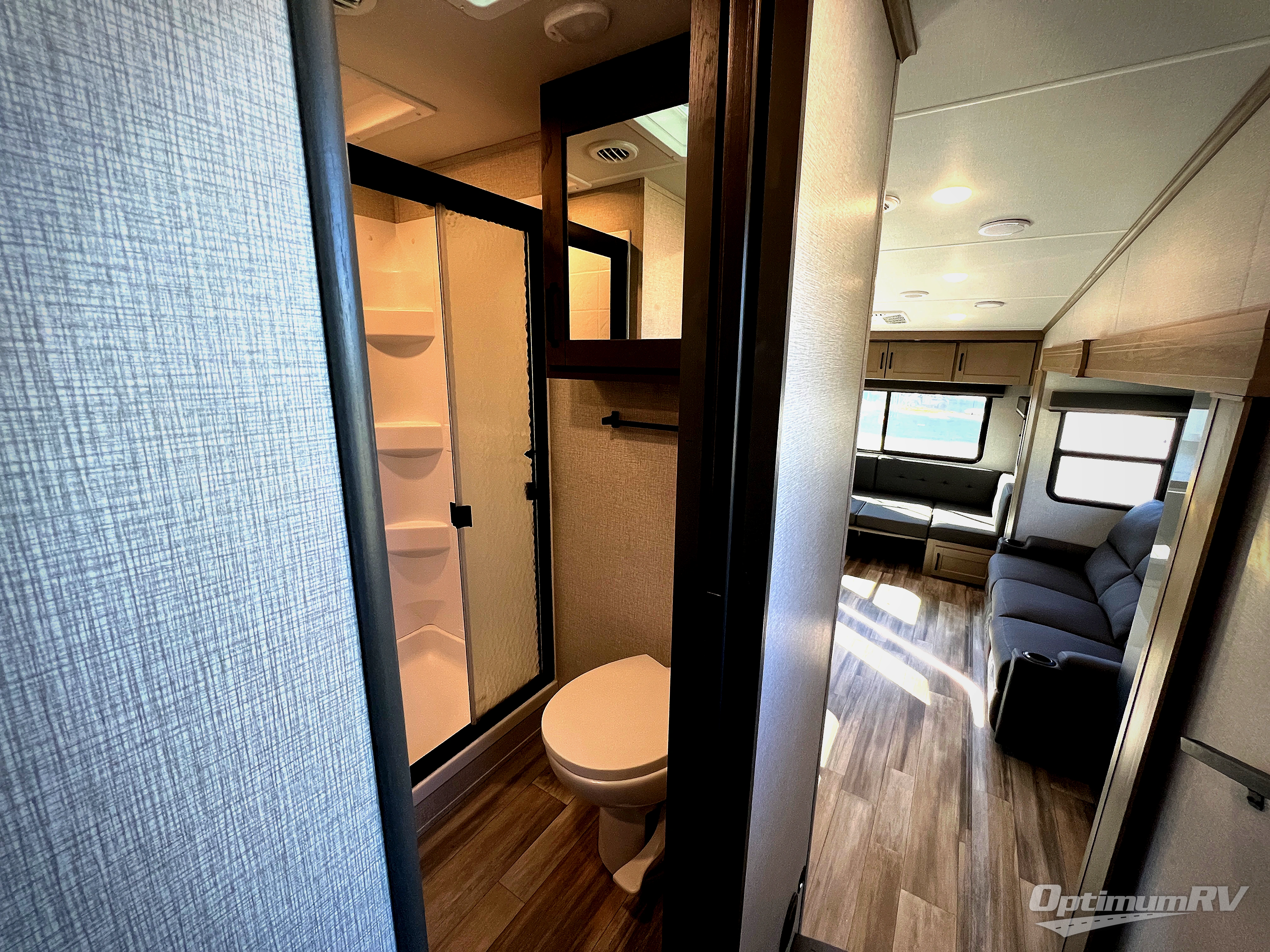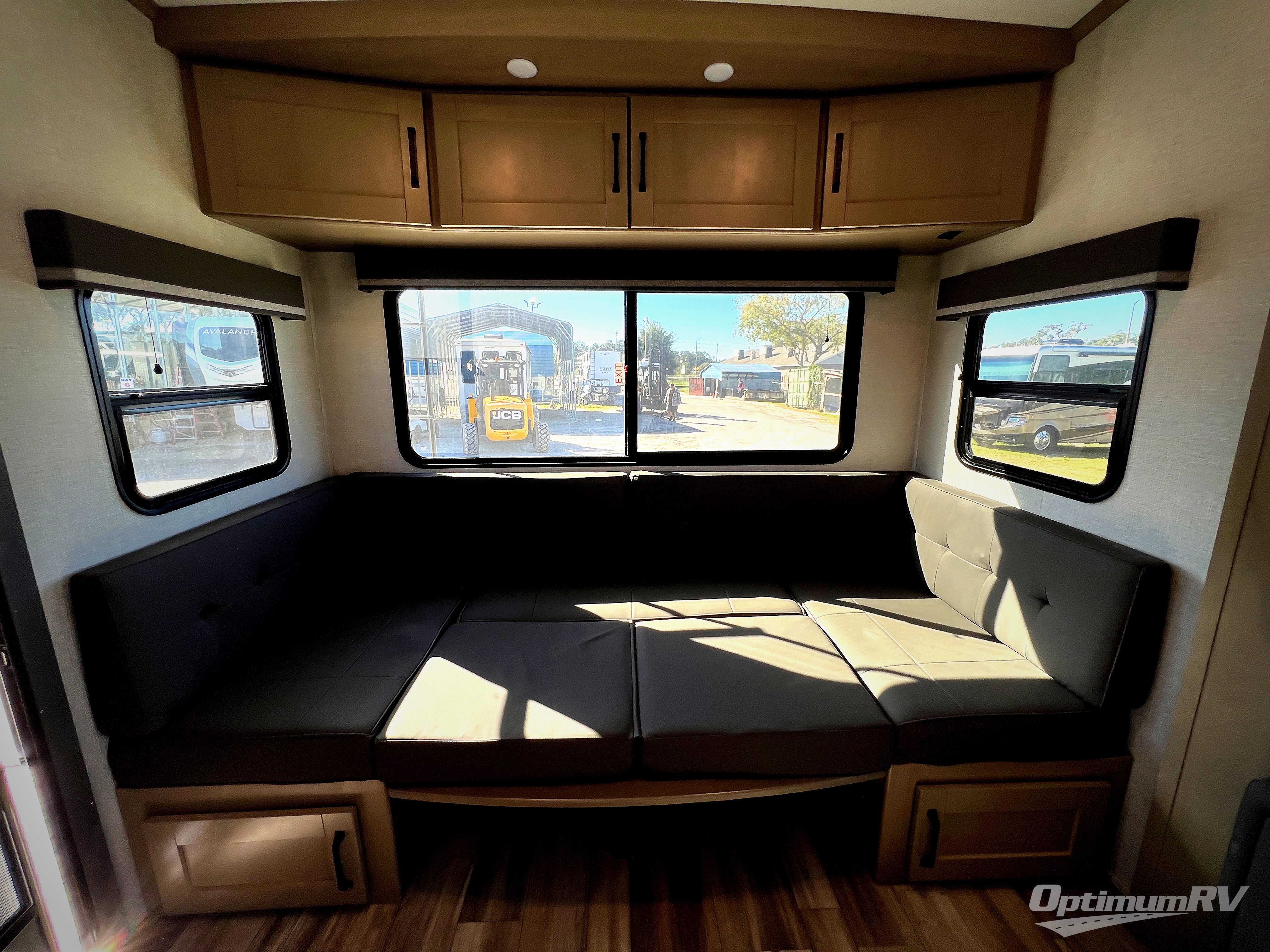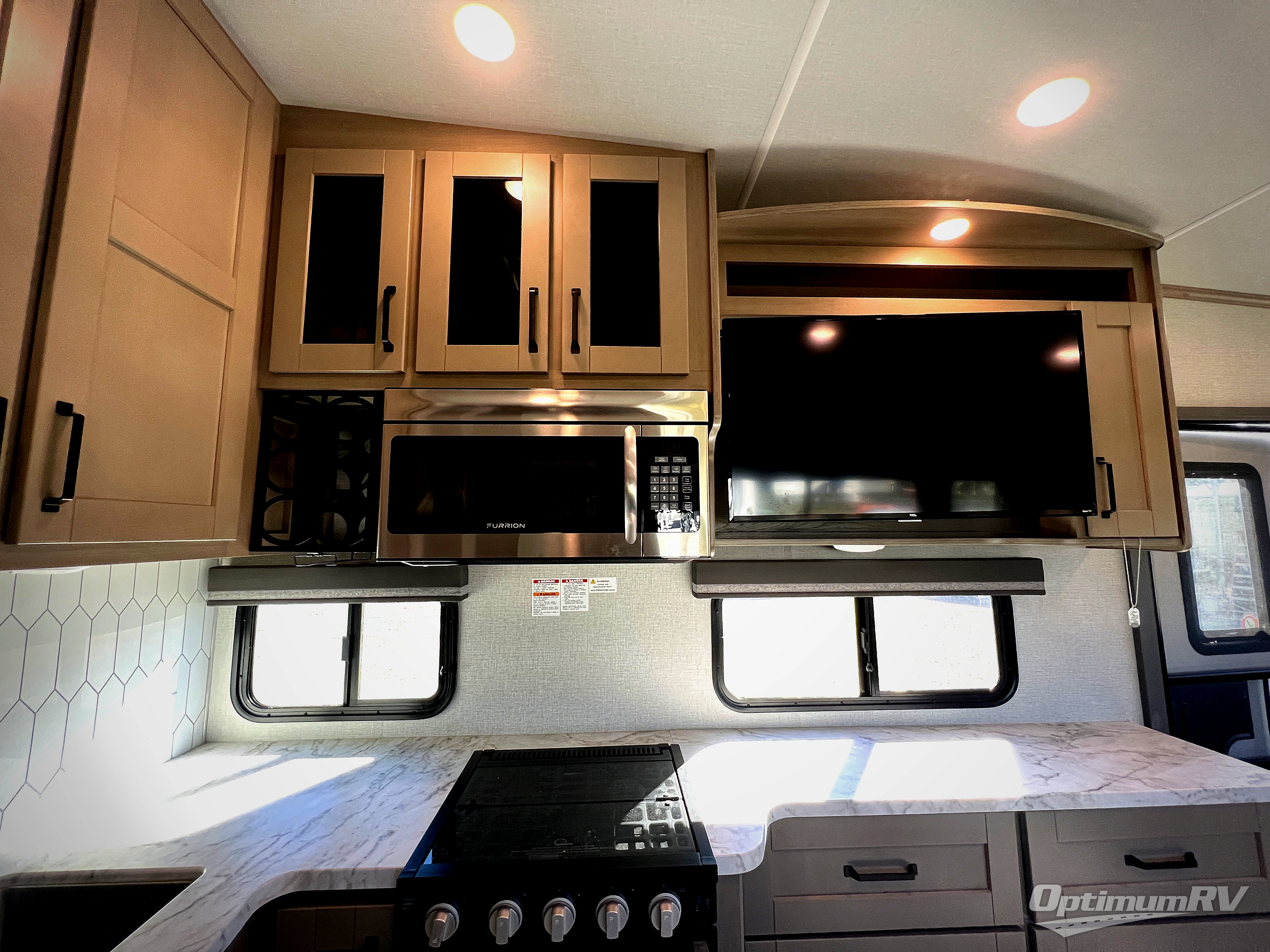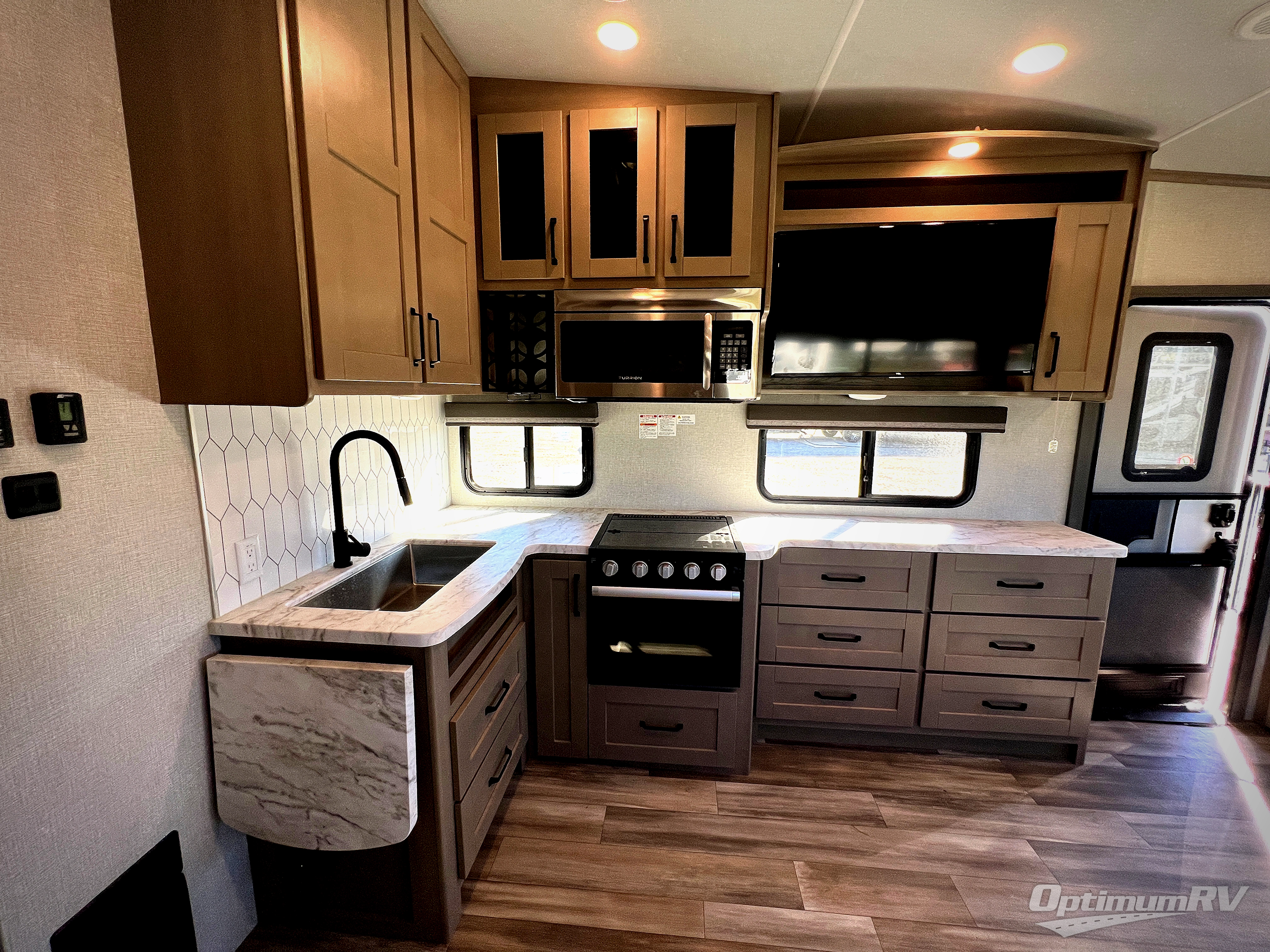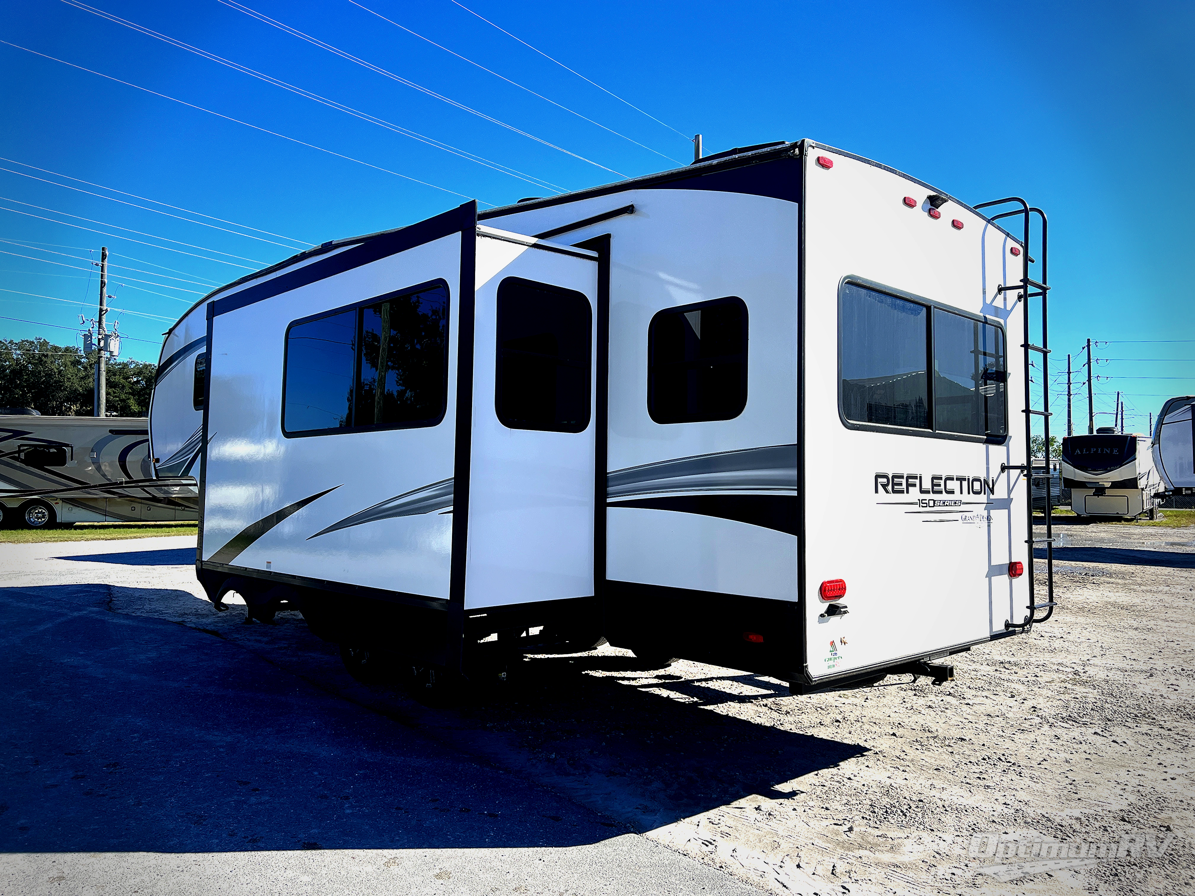With any Reflection 150 Series fifth wheel by Grand Design, there is more available payload capacity and a broader range of half-ton trucks capable of towing this fifth wheel, and no slider hitch is needed thanks to the 90-degree turning radius which makes them short bed friendly and easier to tow. The mandatory Ultimate Power package provides a "One-Touch" automatic leveling system and a detachable power cord with LED light for easy setup, plus motion sensor pass-through lighting and entry lighting, and the Tire Linc TPMS will help you stay safe on the road. The interior offers residential luxury from the cabinetry and premium congoleum flooring, plus the booth dinette to the residential-style window treatment. Make your refined decision today!