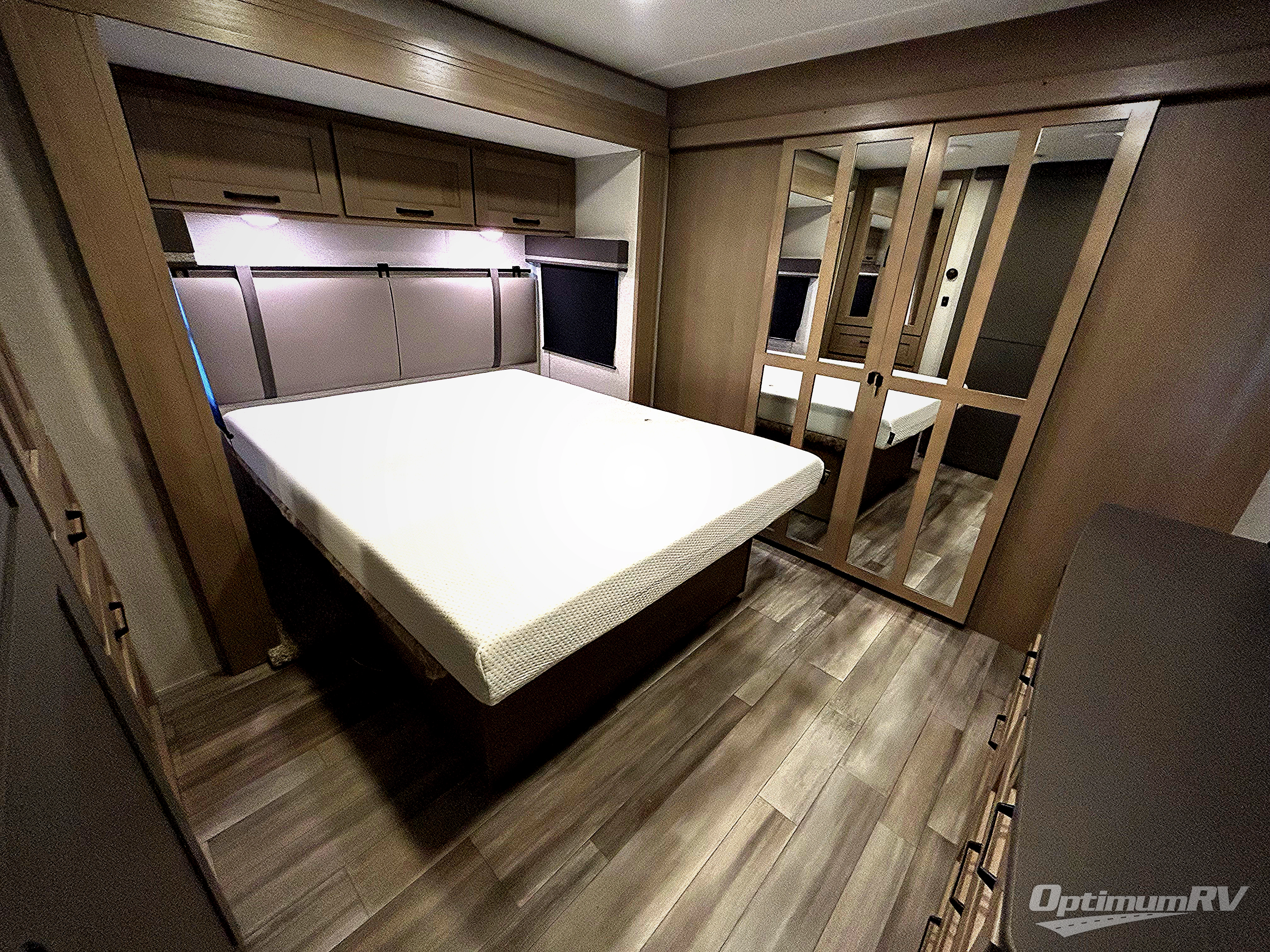 The chef of the group will love the gourmet kitchen including the 16 cu. ft. refrigerator that will hold lots of cold ingredients, beverages and leftovers, the center island when preparing and serving meals, and the hutch with overhead cabinets to display and store dishes and such. This area also includes two slide outs for more floor space and furniture to relax on including theater seating with cupholders for your drinks, a booth dinette to dine at and work from or choose a free standing dinette option, and a rear tri-fold sofa that offers sleeping space for two at night. There is a 40" LED HDTV with fireplace below to enjoy while inside, plus there are two awnings outdoors to relax under. When you are ready to call it a night, get cleaned up in the full bathroom, and retire to your front bedroom with a slide out queen bed or choose a king option, a front full-wall wardrobe with washer/dryer prep, a dresser and an additional wardrobe with drawers.