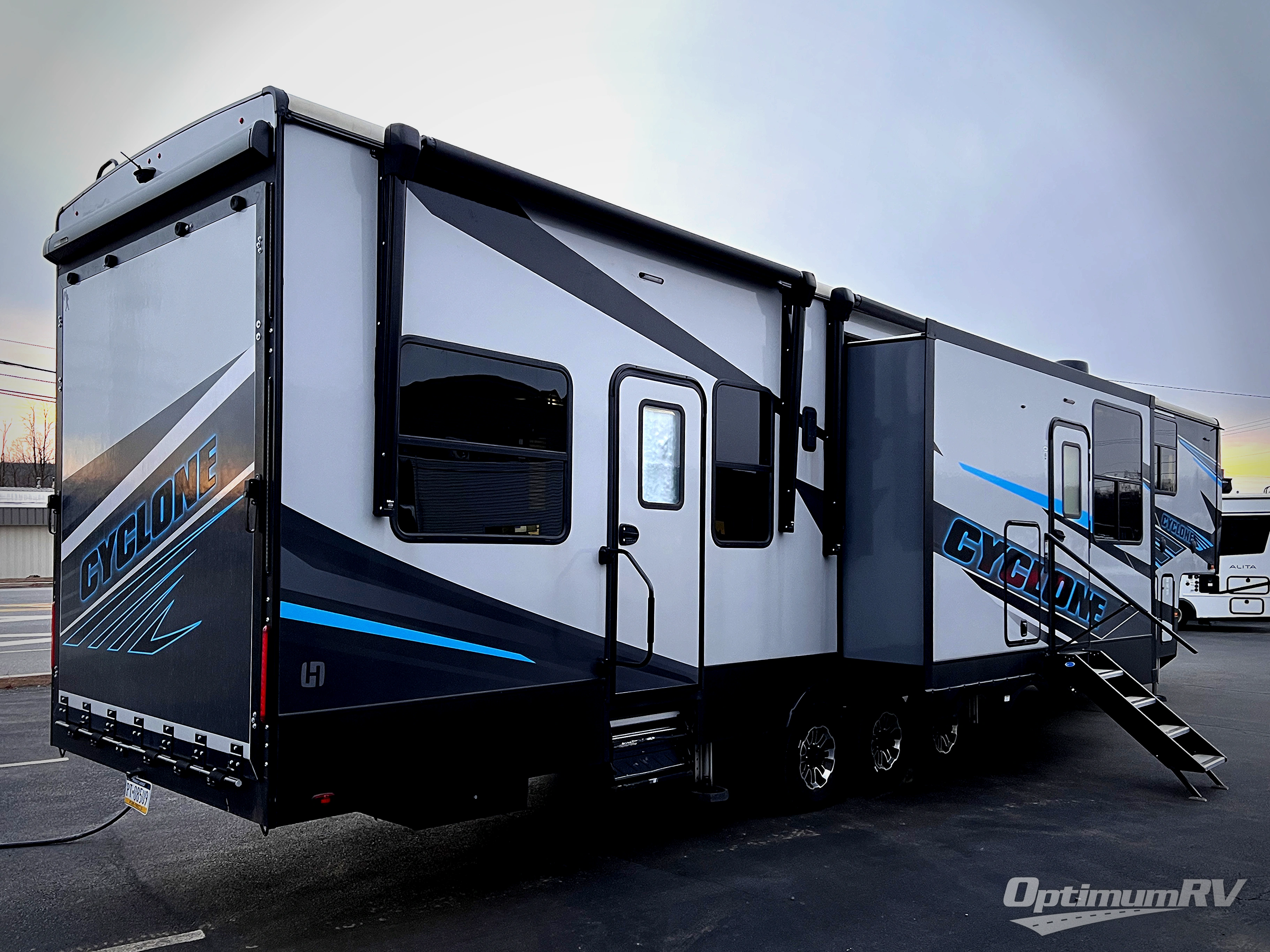 Satisfy your wanderlust with a Heartland Cyclone fifth wheel toy hauler! You won't have to sacrifice any luxury either with indulgent features like the king bedroom suite with an exclusive East to West bed tilt system with 30% more floor space, Stor-Mor three-sided access to the basement with 30% more storage capacity, and Step Caddy folding patio step for better stability as you enter or exit the patio. The industry first Grill and Go 25" residential pull out 3 burner griddle combo comes on models with an exterior kitchen for an easier cooking experience. Full height shaker cabinetry provides 25% more storage space so you can bring more camping necessities with you. If you like to dry camp longer then you will appreciate the industry's largest 150 gallons fresh water tanks. Come find the perfect model for you today!