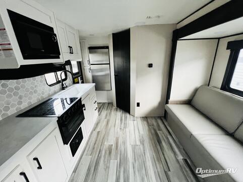 This is the perfect couple's trailer for room for an overnight guest on the jack-knife sofa. You'll appreciate a table in front of the sofa where you can enjoy eating together, and the slide out provides more space to move about. This model includes a front bedroom with a privacy curtain and dual wardrobes to store your clothes for the week, plus there is a full bath towards the back of the unit to stay clean each day. Snacks and paper goods can go in the entryway pantry, and camp gear can be kept in the outdoor storage!