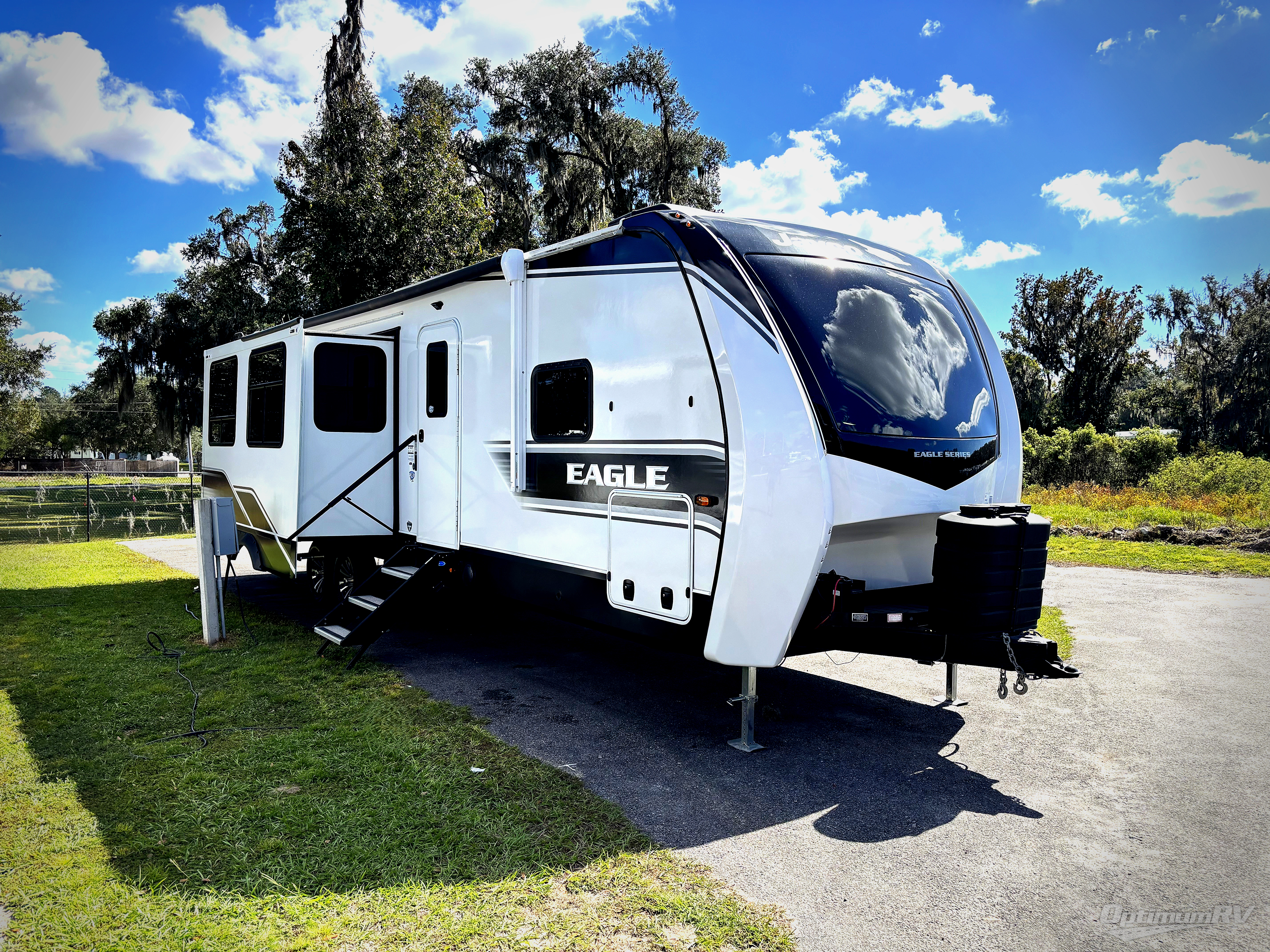 With any Eagle fifth wheel or travel trailer by Jayco you will appreciate durable construction materials, like the Magnum Truss Roof and the Stronghold VBL laminated walls. The JAYCOMMAND Smart RV system puts you in control of your RV's functions, and the 5 Star Handling Package will provide smooth towing from home to camp. Each model features Climate Shield zero-degree tested weather protection and the industry-exclusive HELIX cooling system that will keep you comfortable year around. Some of the exterior conveniences you are sure to love are the pass-through storage with Slam-Latch baggage doors and an automotive style front cap with max turn radius. The Eagle fifth wheels and travel trailers are designed to make you feel at home with solid hardwood slide fascia, residential vinyl flooring, a bathroom skylight, and plenty of storage for all your belongings.