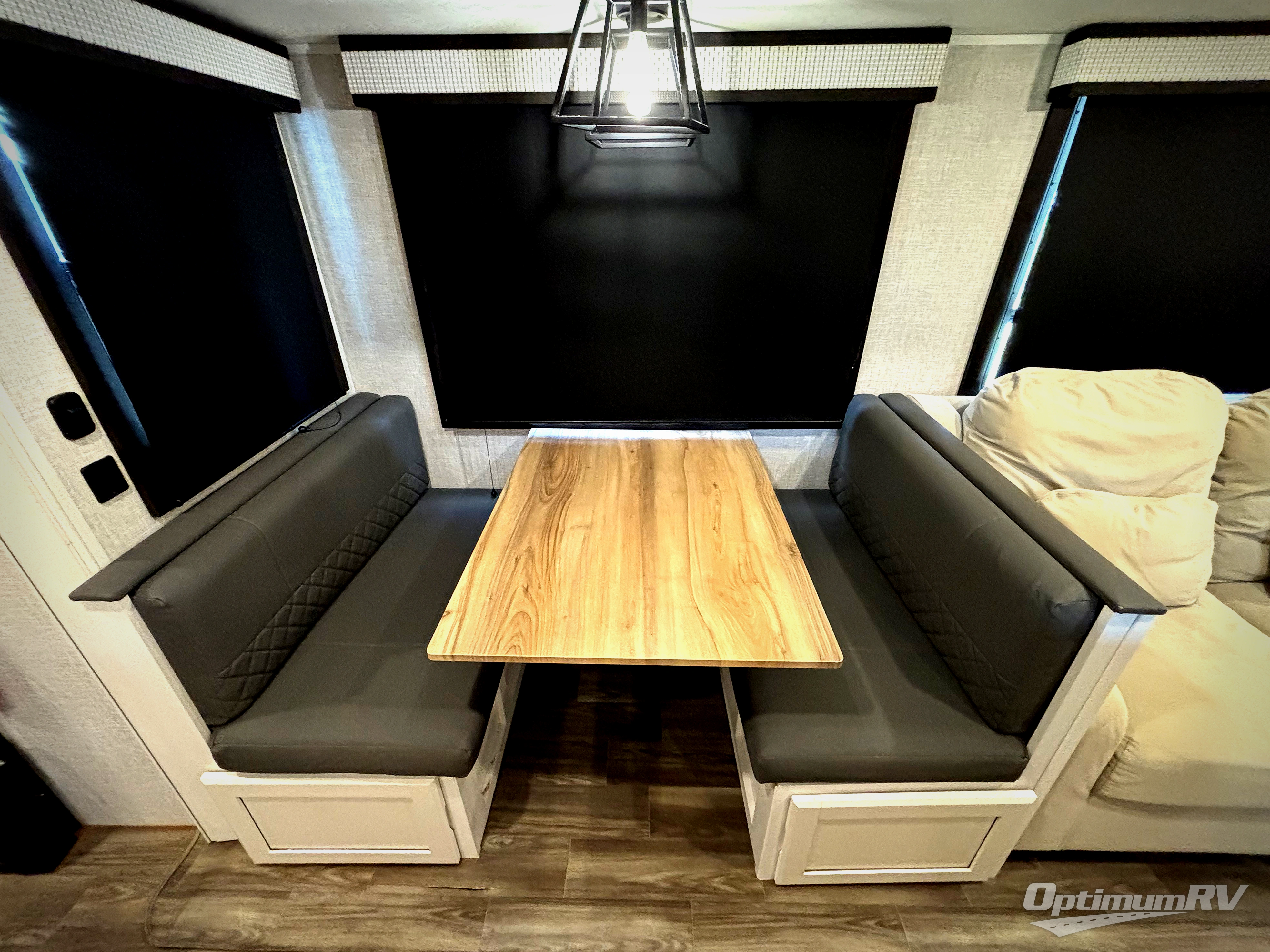 This travel trailer is perfect for your larger group or family! There is a rear private bunkhouse with two bunks, a tri-fold sofa, plus a slide out for more space. You will have the front private bedroom all to yourselves with a queen bed, and any other guests can sleep on the tri-fold sofa and booth dinette! There is also a wardrobe/linen closet with washer and dryer prep if you plan to add a washer and dyer for convenience. The chef can prepare their best meals with the kitchen island and will enjoy having two hutches to store the essentials. They could even cook at the outside kitchen to breathe in some fresh air and enjoy the beautiful scenery!