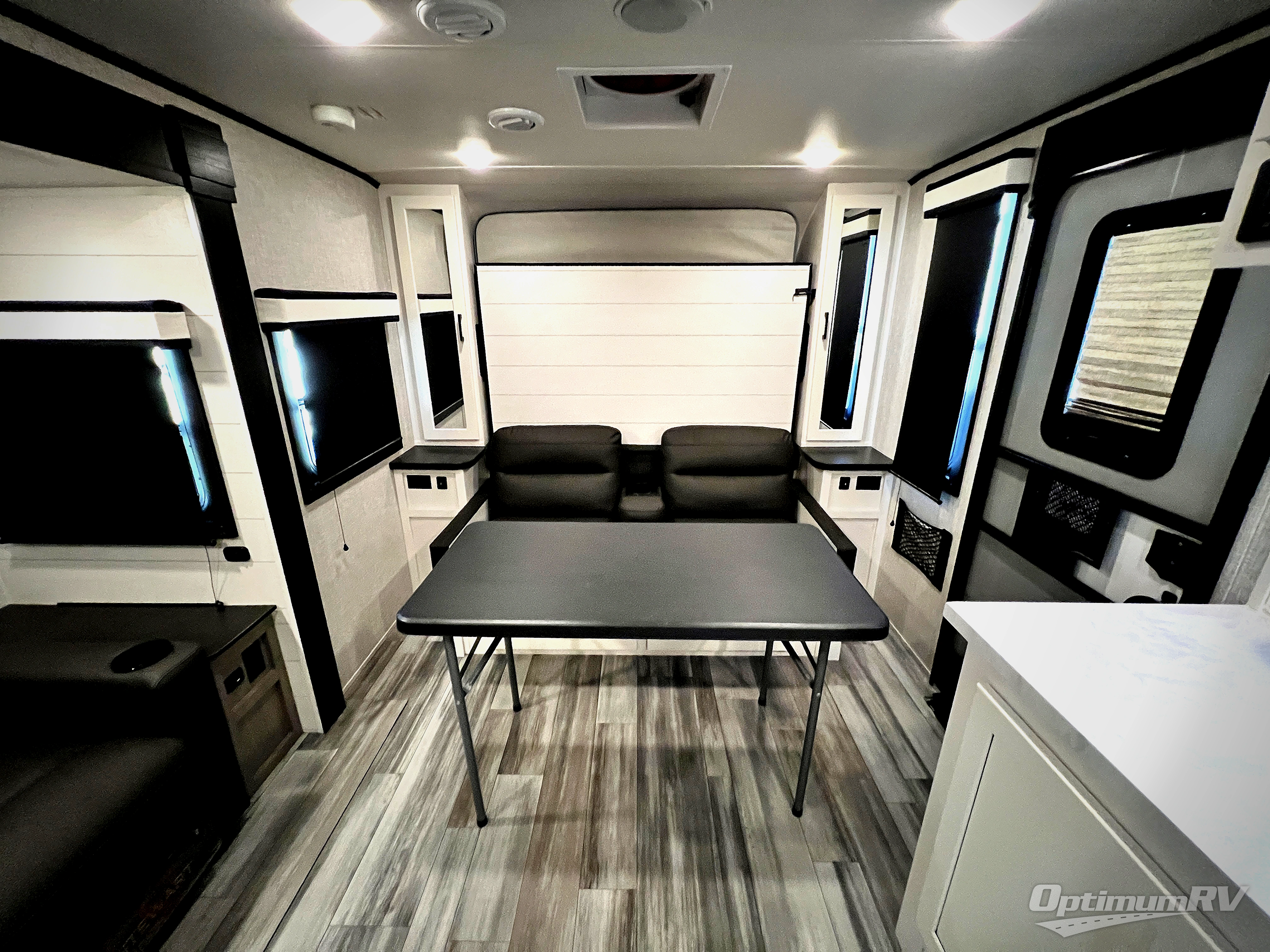This travel trailer offers a lot of possibilities! During the day, relax in the spacious front living area with a jackknife sofa plus a pair of theater seats, both positioned for a great view of the entertainment center. A fully equipped kitchen with dual sinks, microwave, and three-burner range makes meals easy, and the theater seats have swing-out trays for you to dine. At night, pull down the 60" x 75" Murphy bed for a great night's sleep! wardrobes on either side of the bed provide plenty of storage for your clothing. The rear corner bath is convenient and private, and offers a linen closet plus a medicine cabinet for additional storage capability. Outside you will be sheltered from the sun beneath the 15' awning, and there is an exterior griddle for pancakes in the morning!