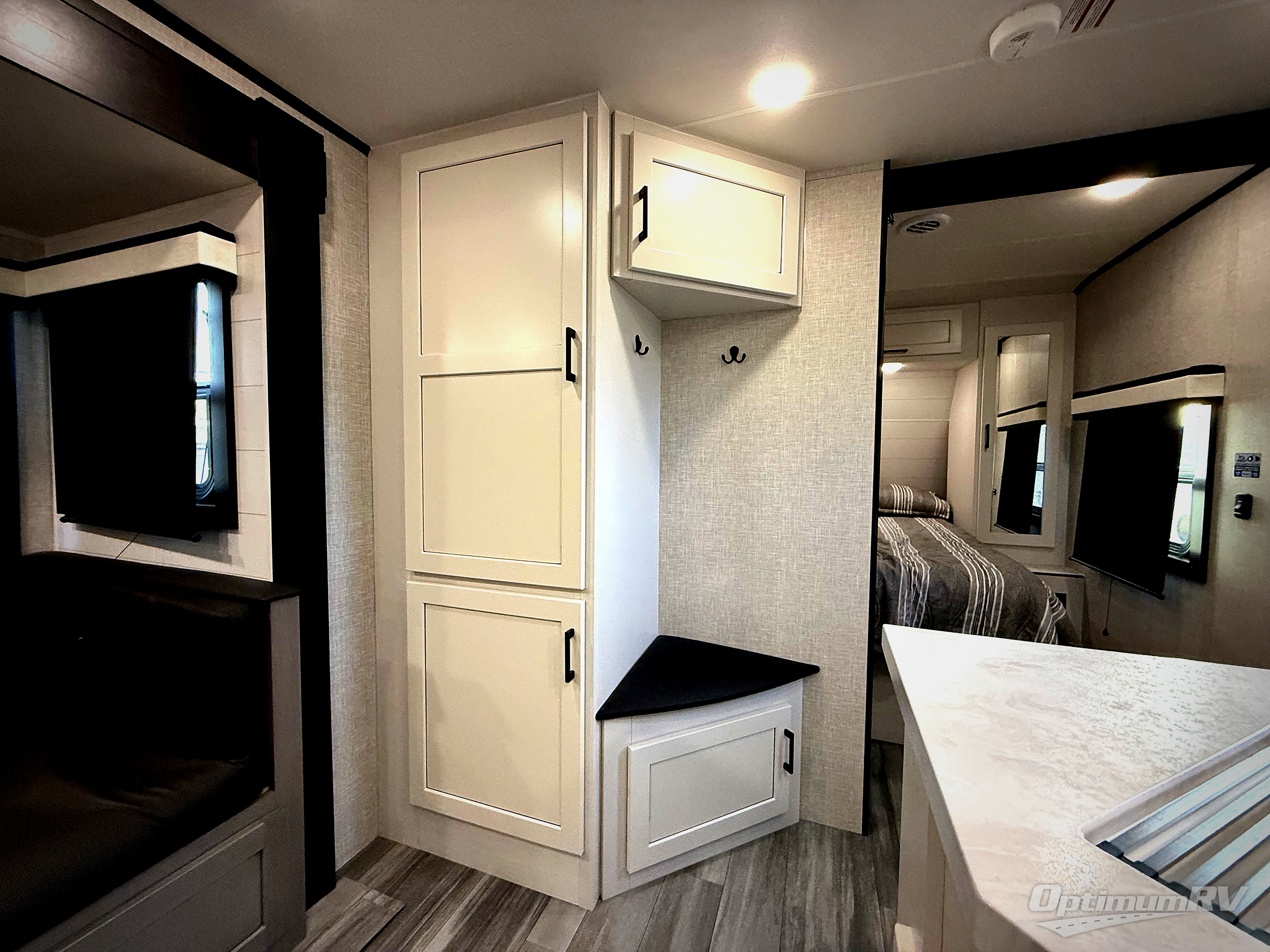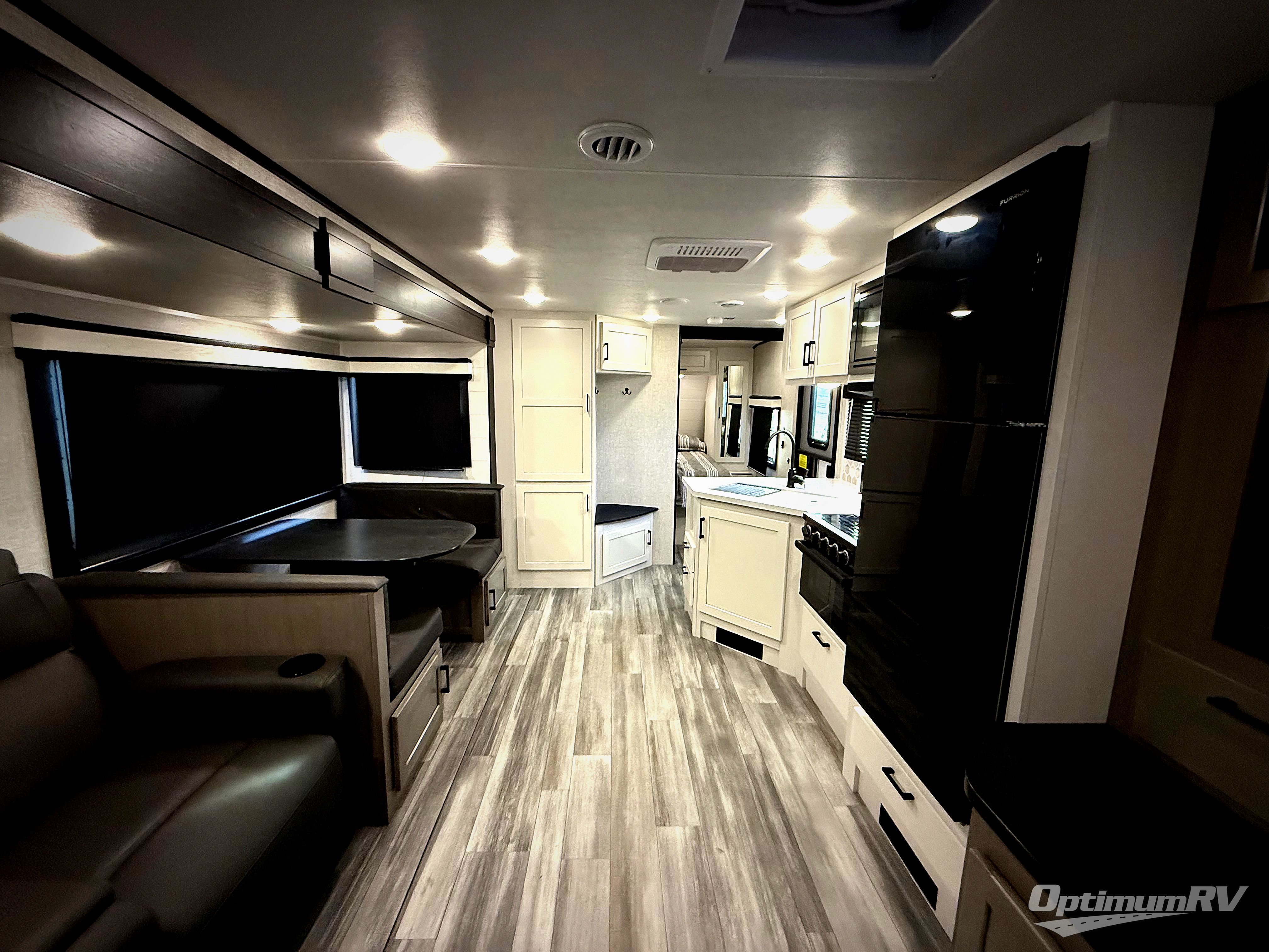 Get out and experience new campgrounds with this spacious trailer that offers a slide out jack knife sofa and booth dinette giving you dining, relaxing and sleeping space as well as more interior floor space to move from the front to the back. And having the second exterior entry/exit to the full bathroom is convenient for all. The cook will love the choice of making meals inside with full amenities or on the outside kitchen when relaxing under the 21' power awning with LED lights. And the front bedroom gives you a queen bed, dual wardrobes and windows for great views when inside.