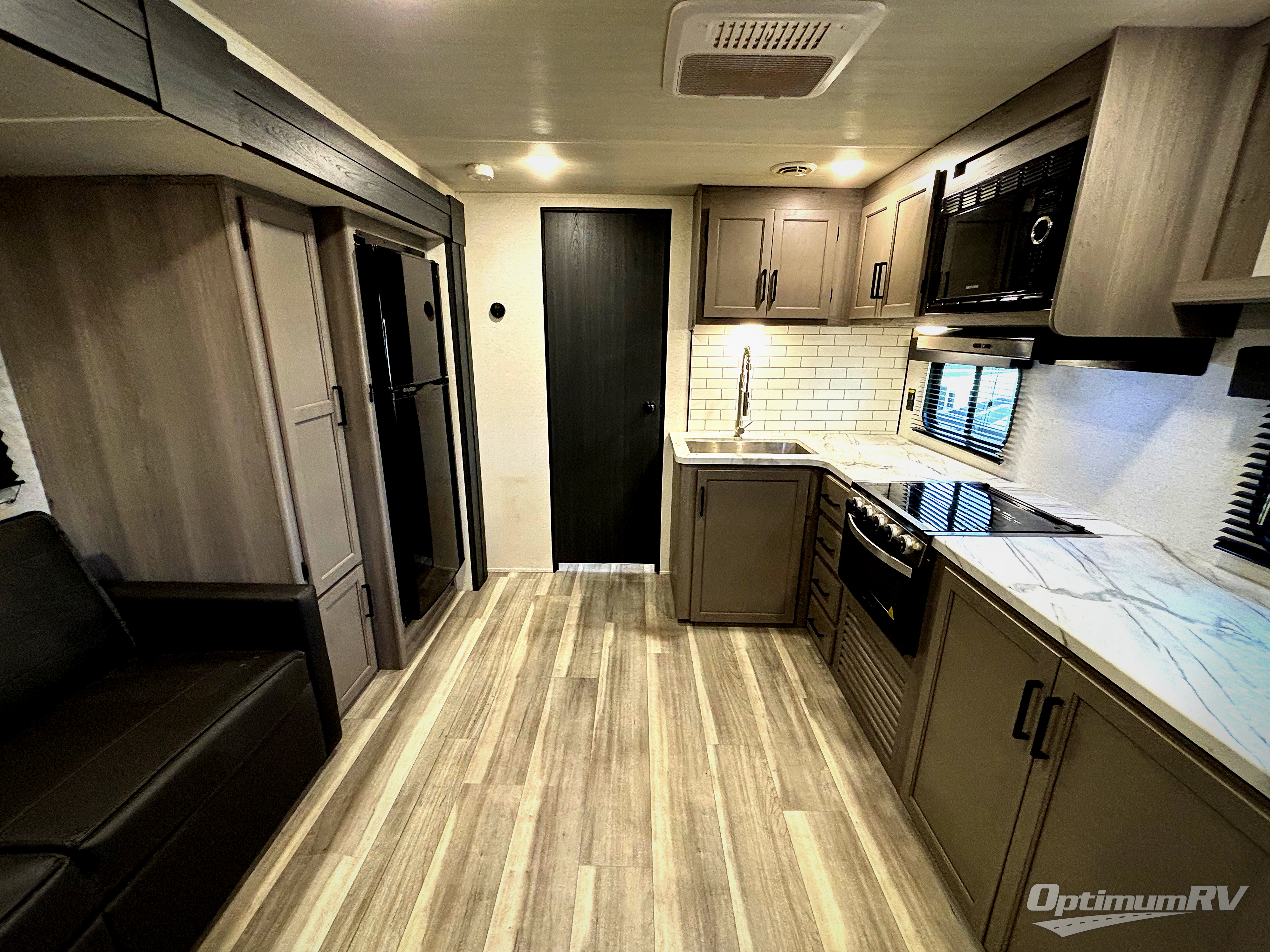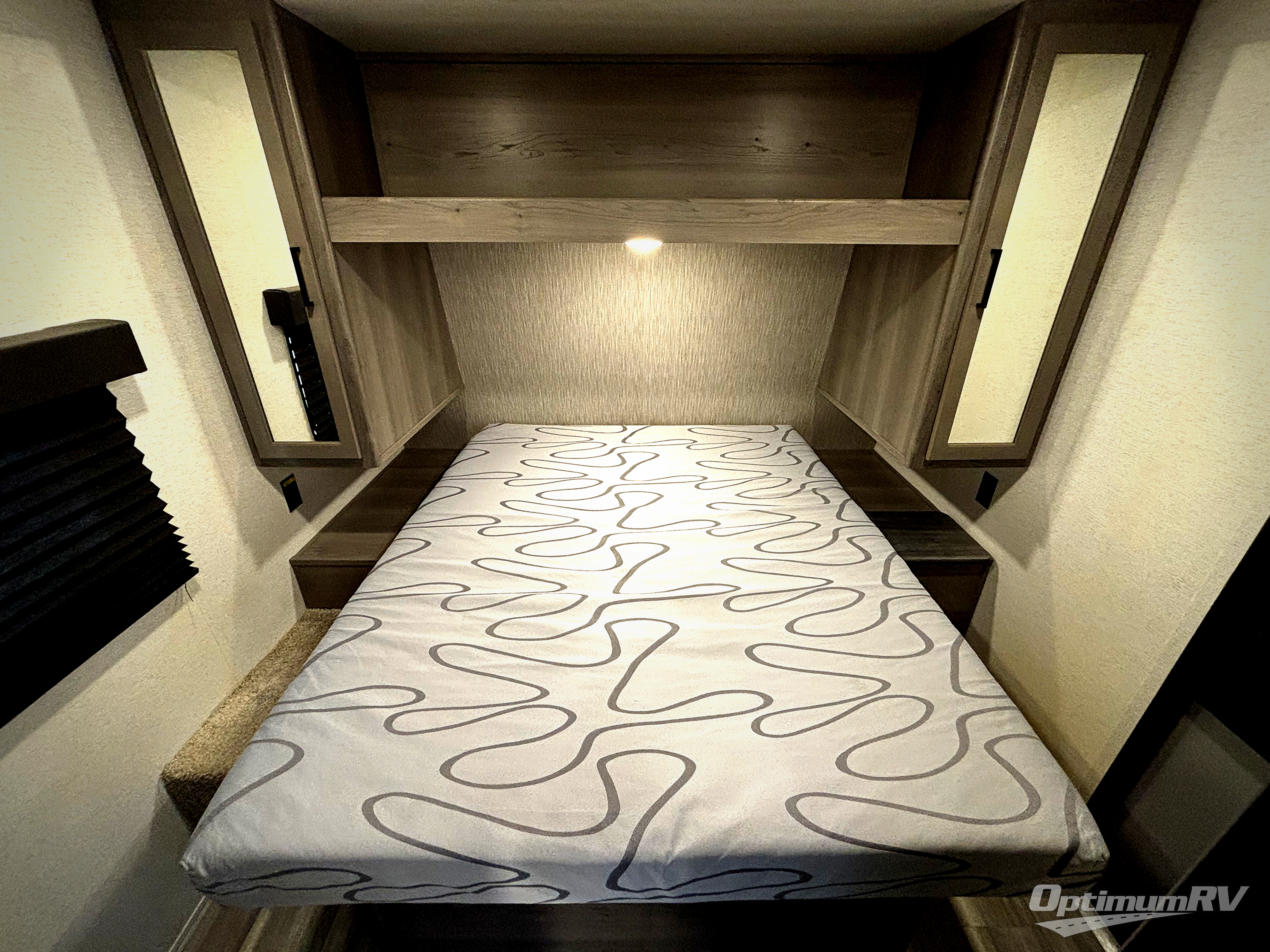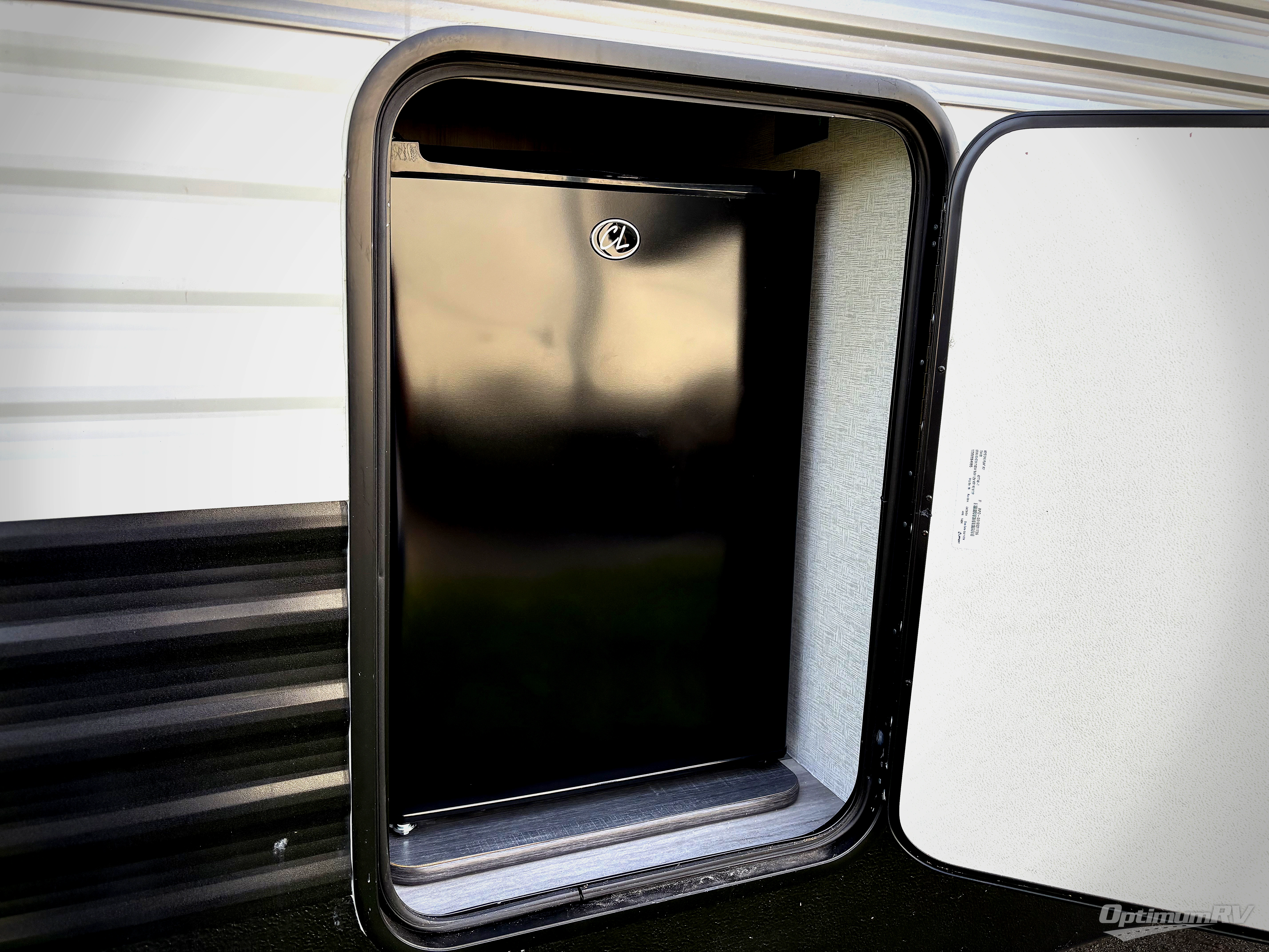 Enjoy every camping trip in this spacious dual entry travel trailer for six. You will love the rear U-dinette and the standard sofa within the large slide out, and there is TV prep in the living area if you plan to bring along your television. You could also choose the optional tri-fold sofa or optional theater seating if you need more seating or sleeping space. Home cooked meals can be whipped up in a hurry on the three burner range, and there is plenty of counter space to cut up fresh veggies. The walk-through bath is convenient for everyone to access, and here you'll find a spacious shower and a linen closet for clean towels. Head to the master bedroom where you'll be met with a queen bed, dual nightstands and closets, a laundry chute, plus your own exterior entry door; how convenient. The exterior even has an outdoor refrigerator for cold drinks under the awning!