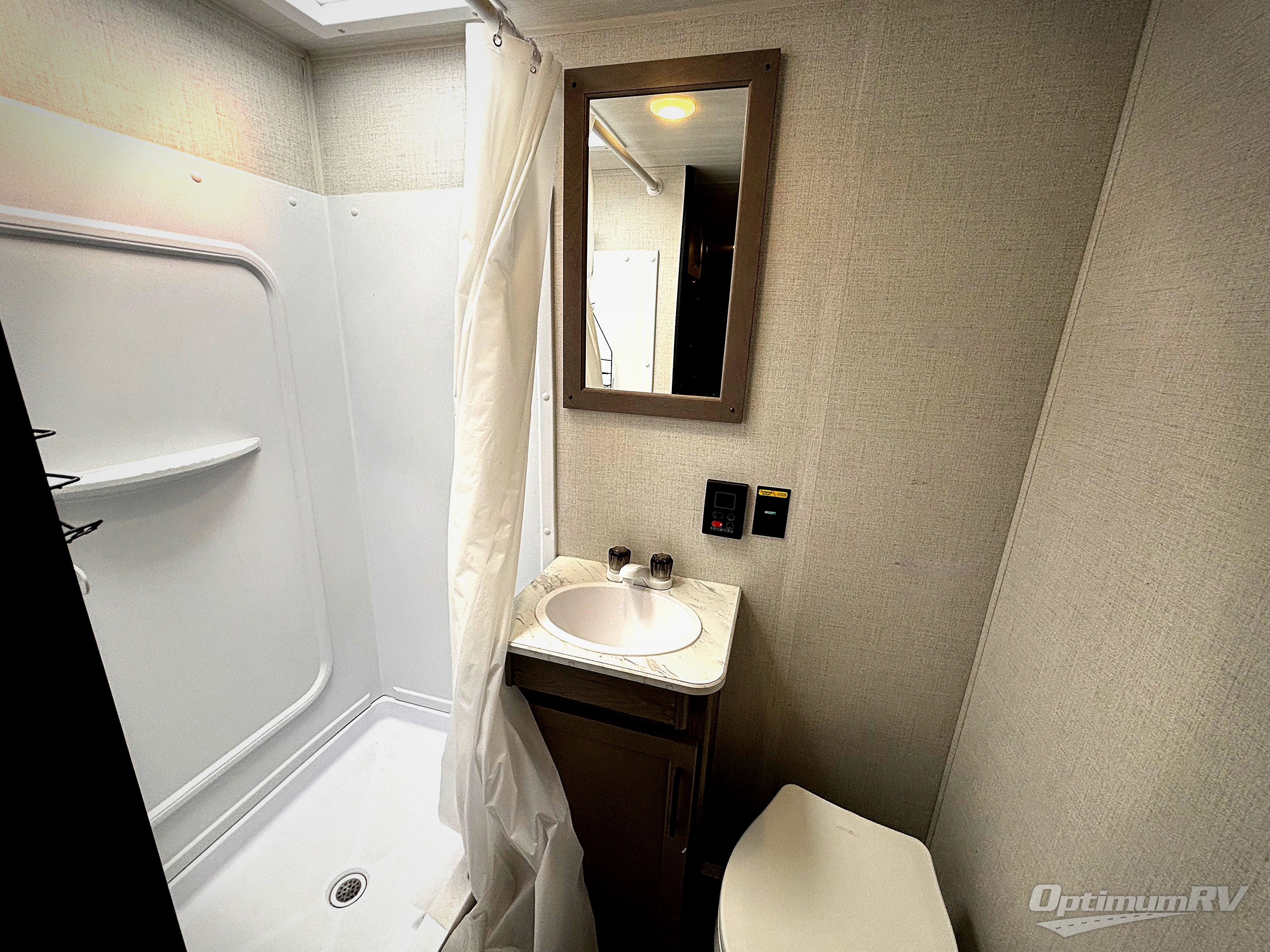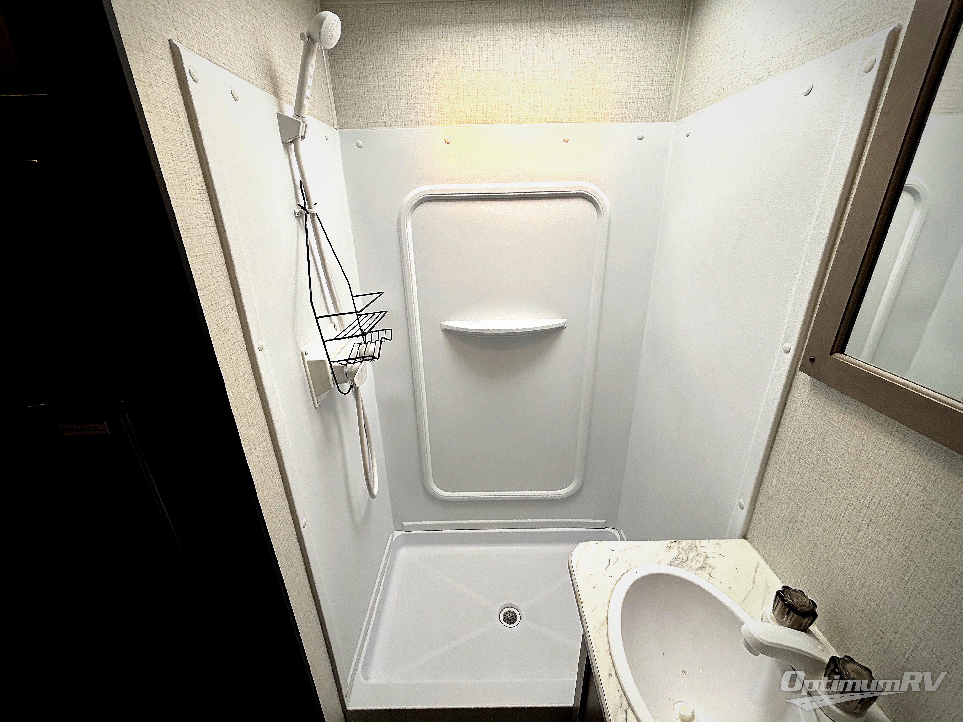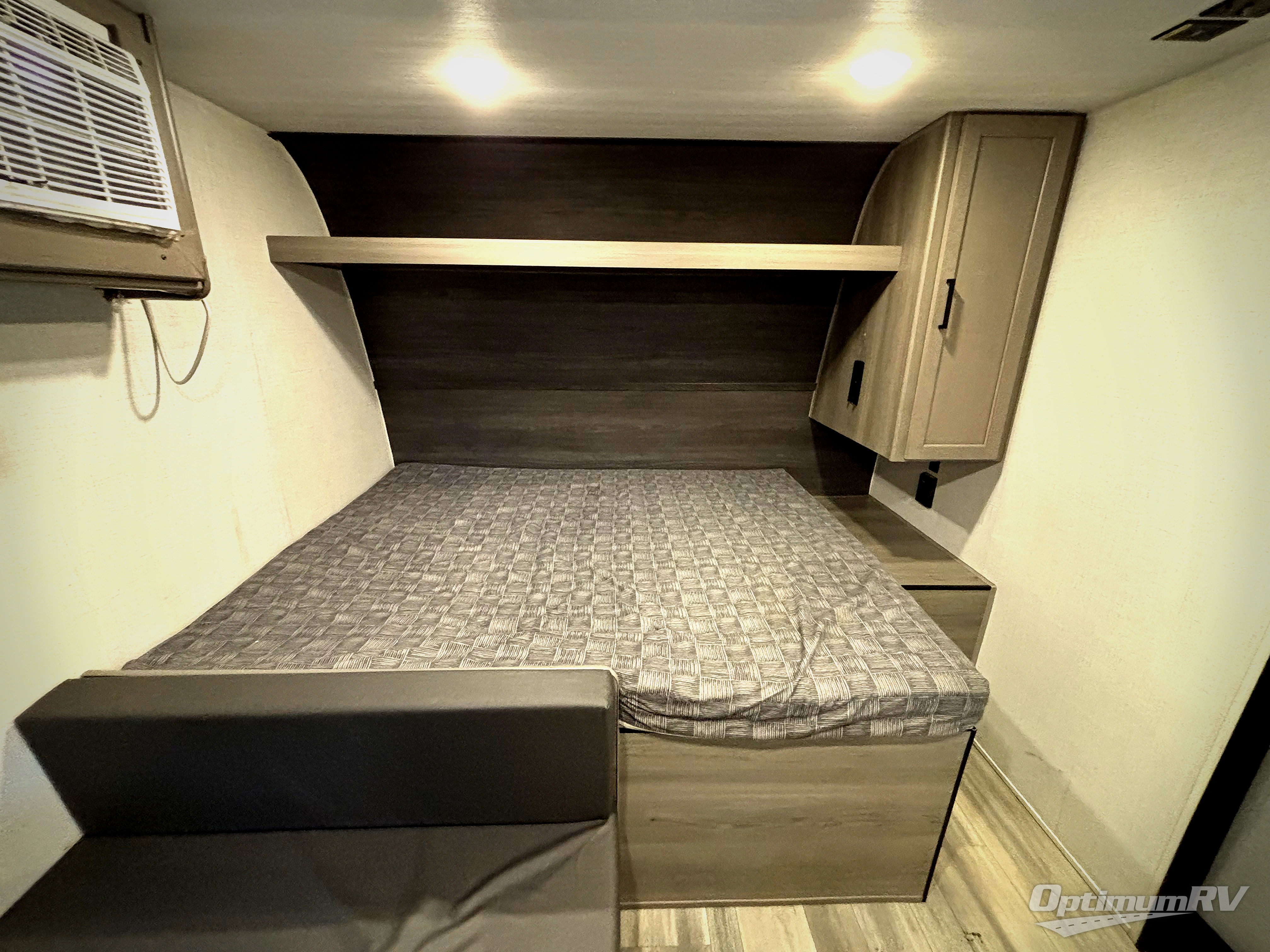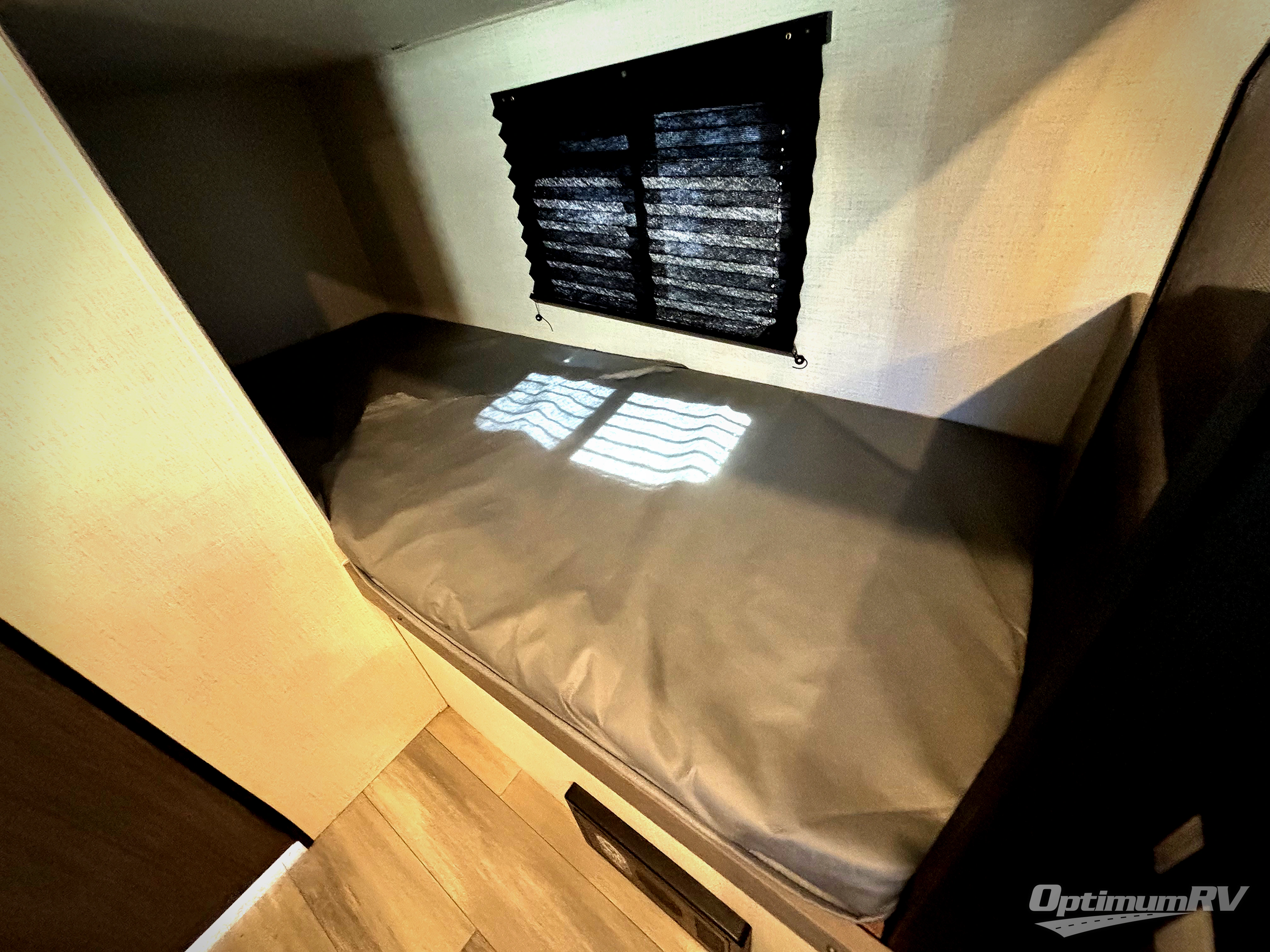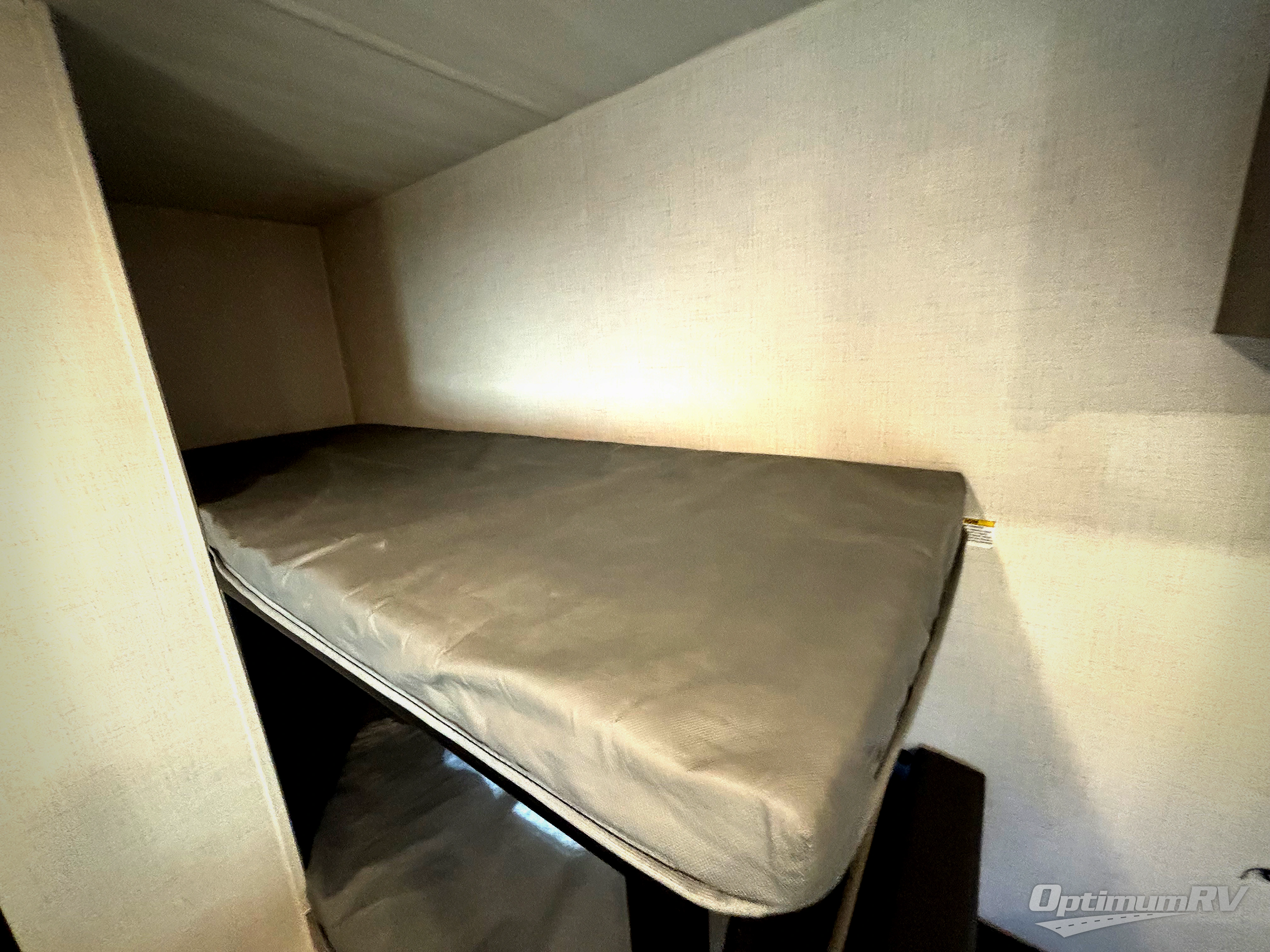 This trailer will fit perfectly for a group of five or less thanks to all the sleeping space! The owners will have a queen-size bed, and others can choose between the rear corner bunk beds or the booth dinette once set up for bedtime. There is a full bathroom for convenience when changing and getting cleaned up, a galley kitchen with a two burner cooktop plus a 3.3 cu. ft. refrigerator for the cold items. And you can stow your larger camping items in the exterior pass-through compartment.