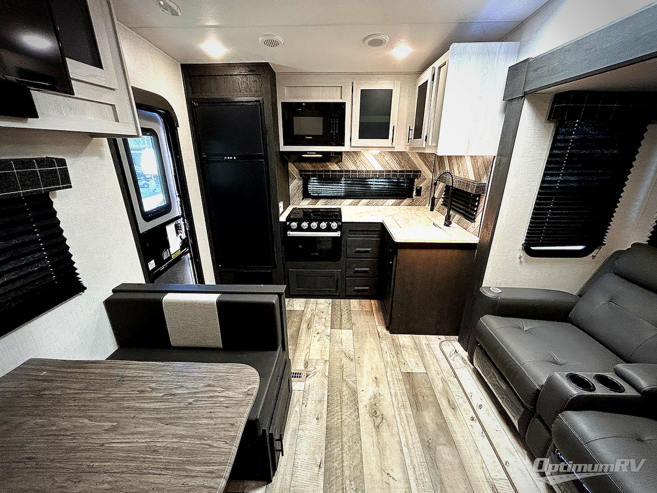 Four to five people can comfortably camp in this fifth wheel! It features a front queen bed with wardrobes on either side to keep your clothes looking their best. There is a radius shower and sink, with a private toilet across the hall. This room can also be shut off from the rest of the RV to make one big master suite! Prepare your best meals in the rear kitchen with the three burner cooktop and enjoy them at the 42" booth dinette. The hide-a-bed sofa slide not only provides a comfortable place to relax during the day, but also a comfortable sleeping space at night, or you can choose the optional theater seating!
